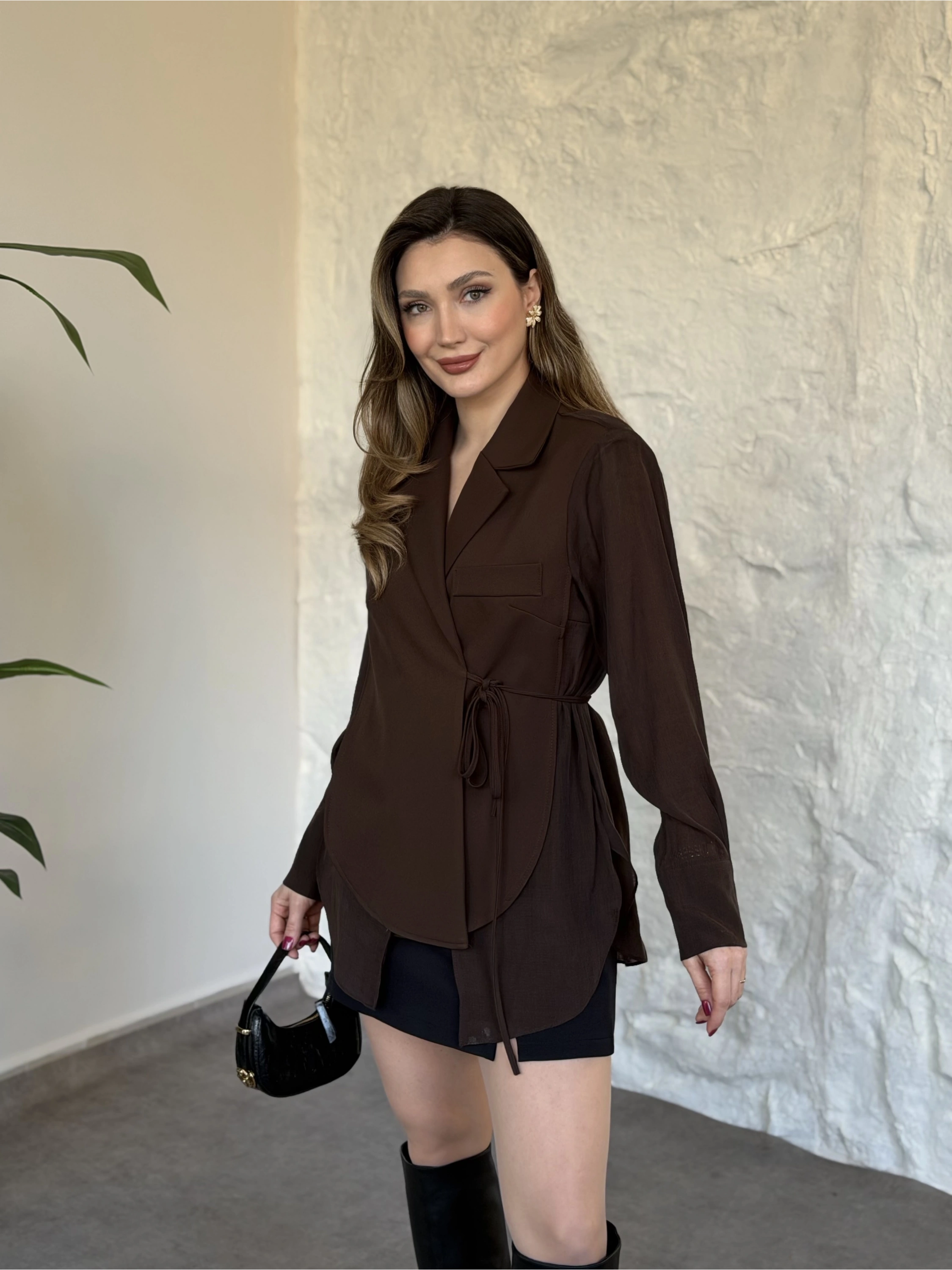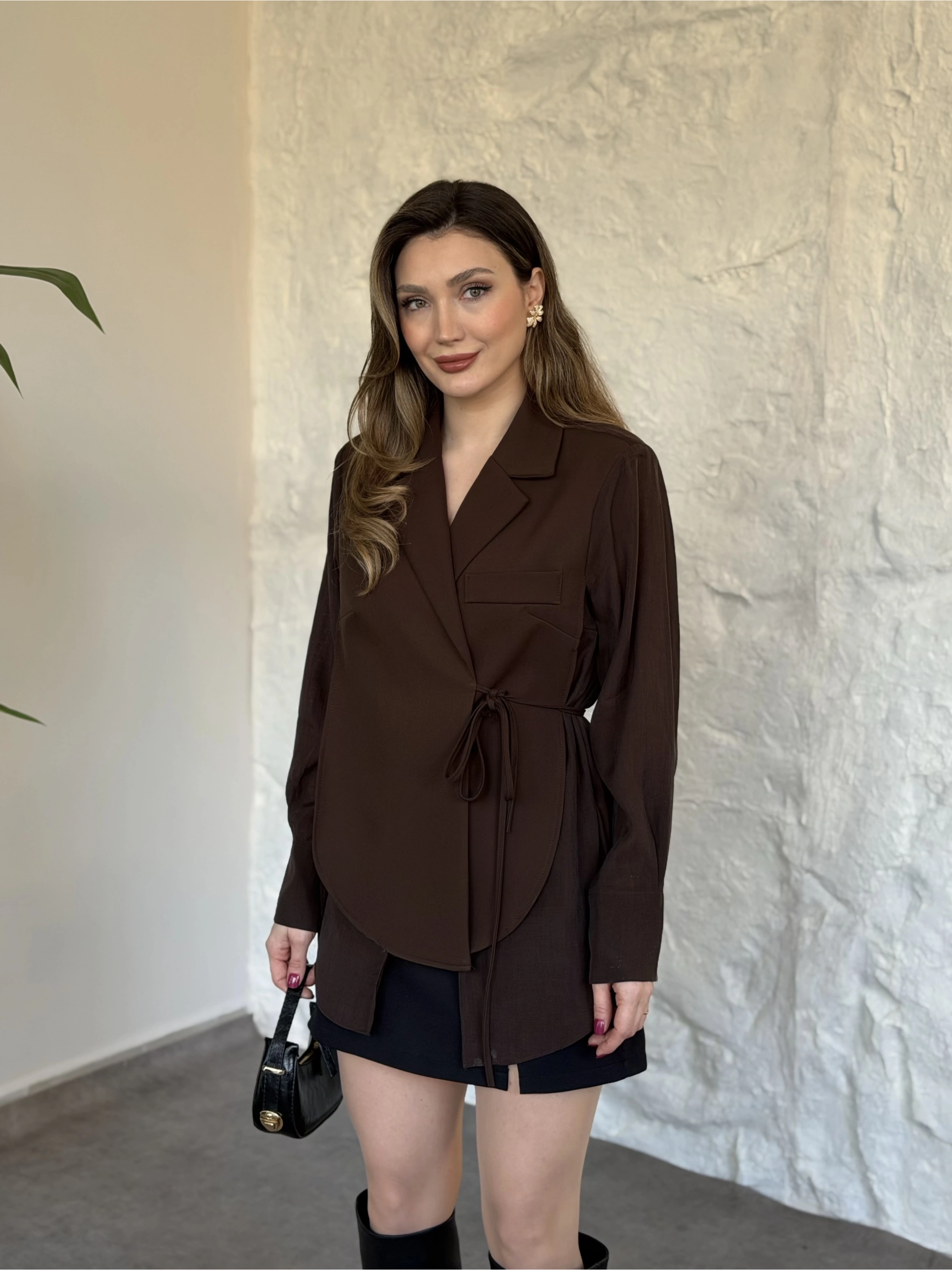 Düğmesiz geniş kemerli blazer ceket kahve