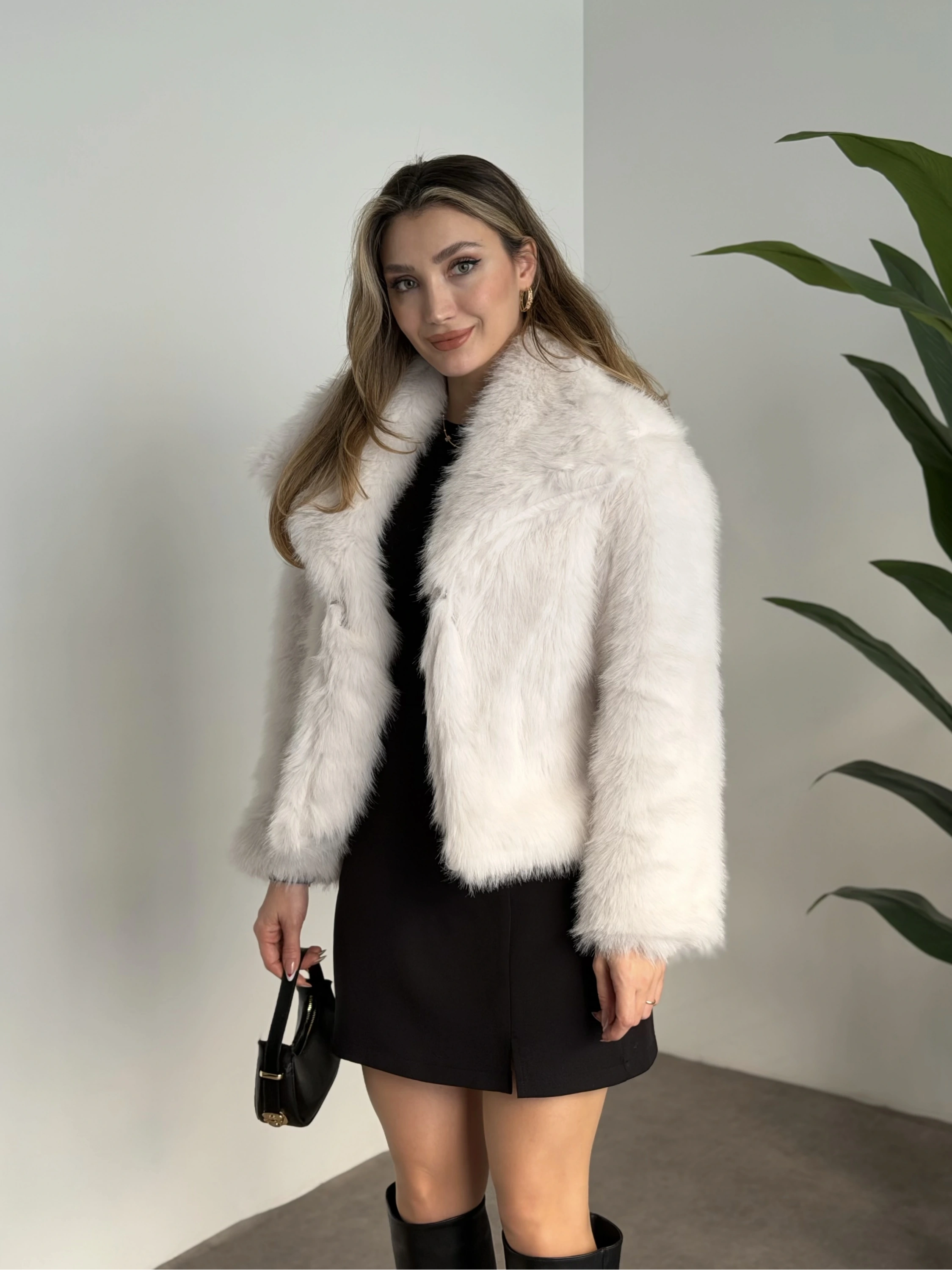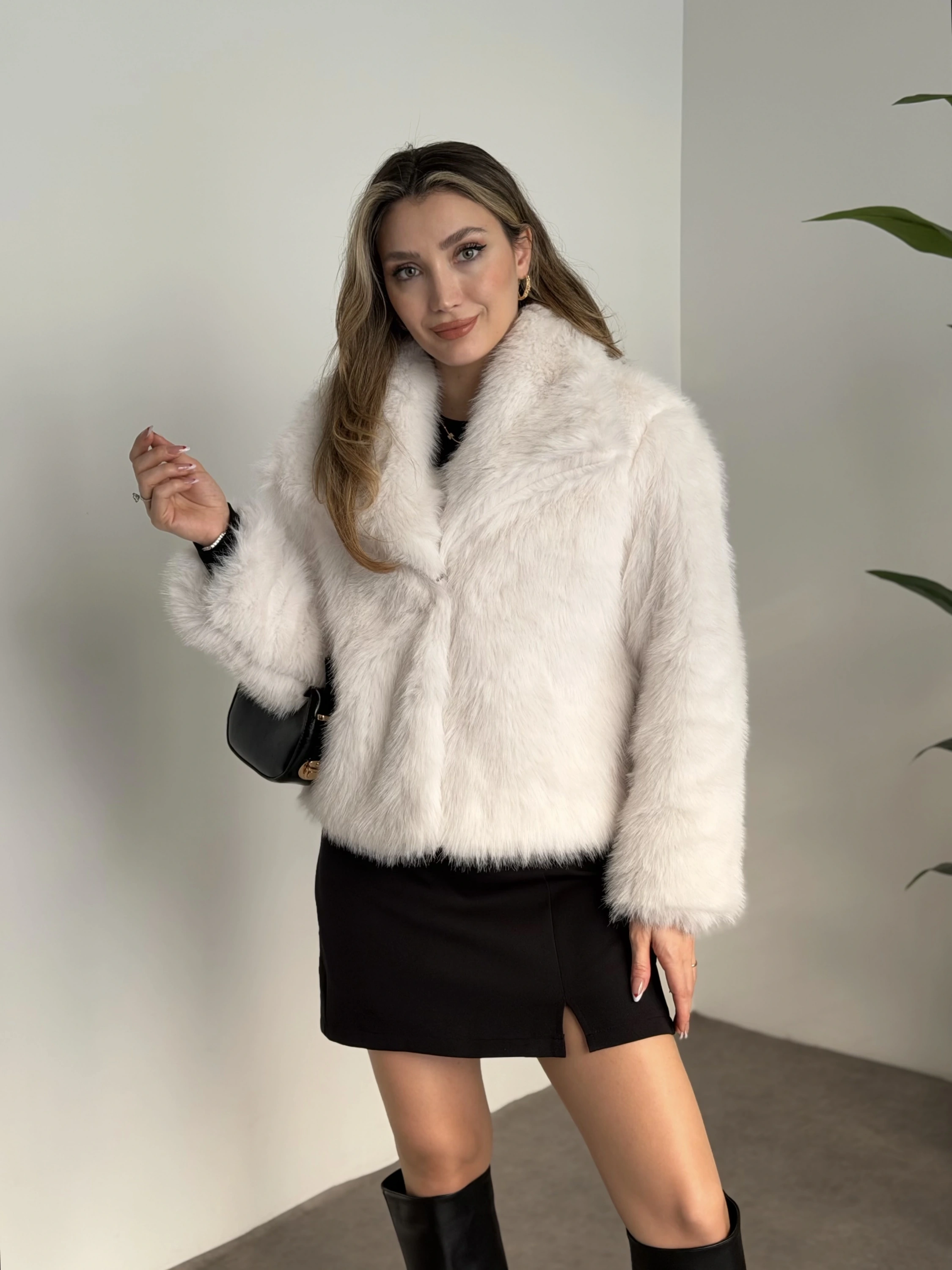 Kruvaze yaka astarlı kürklü mont beyaz