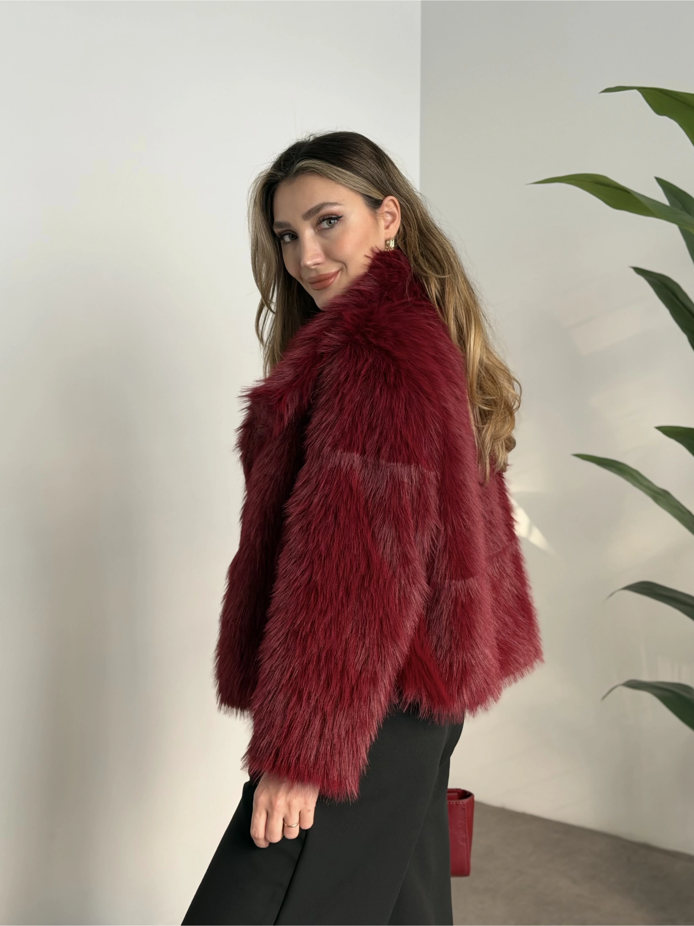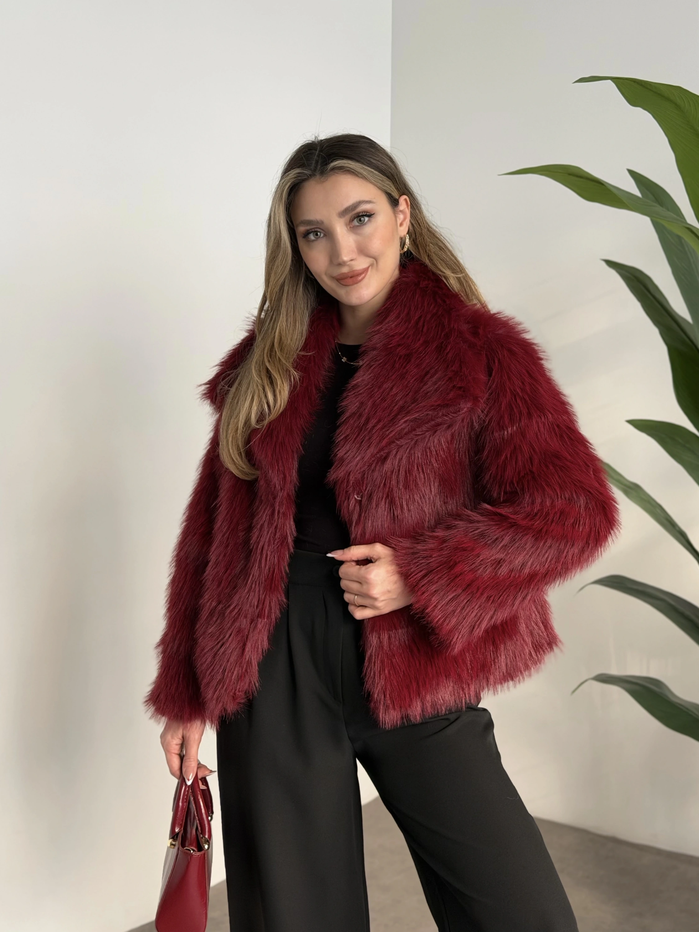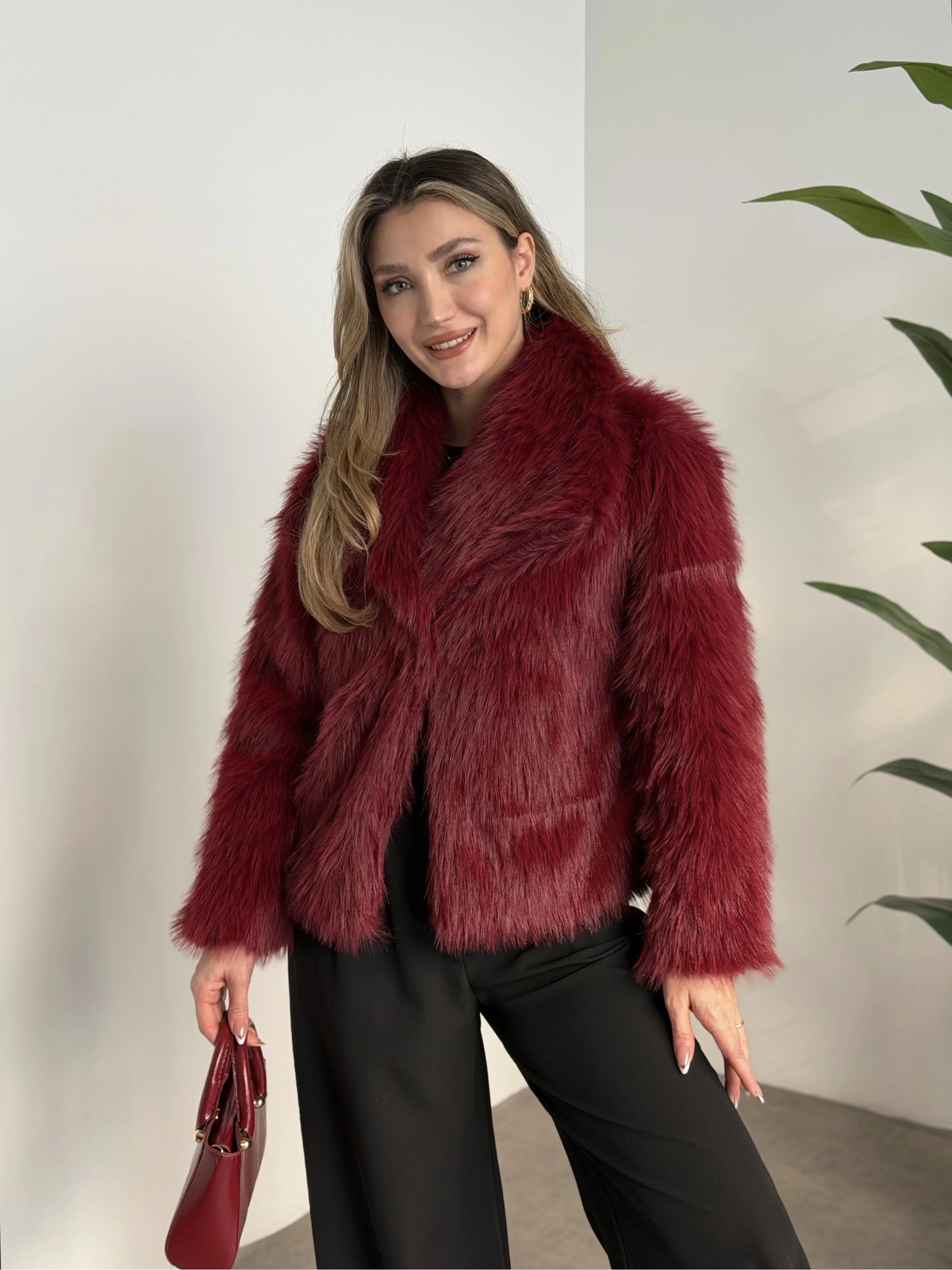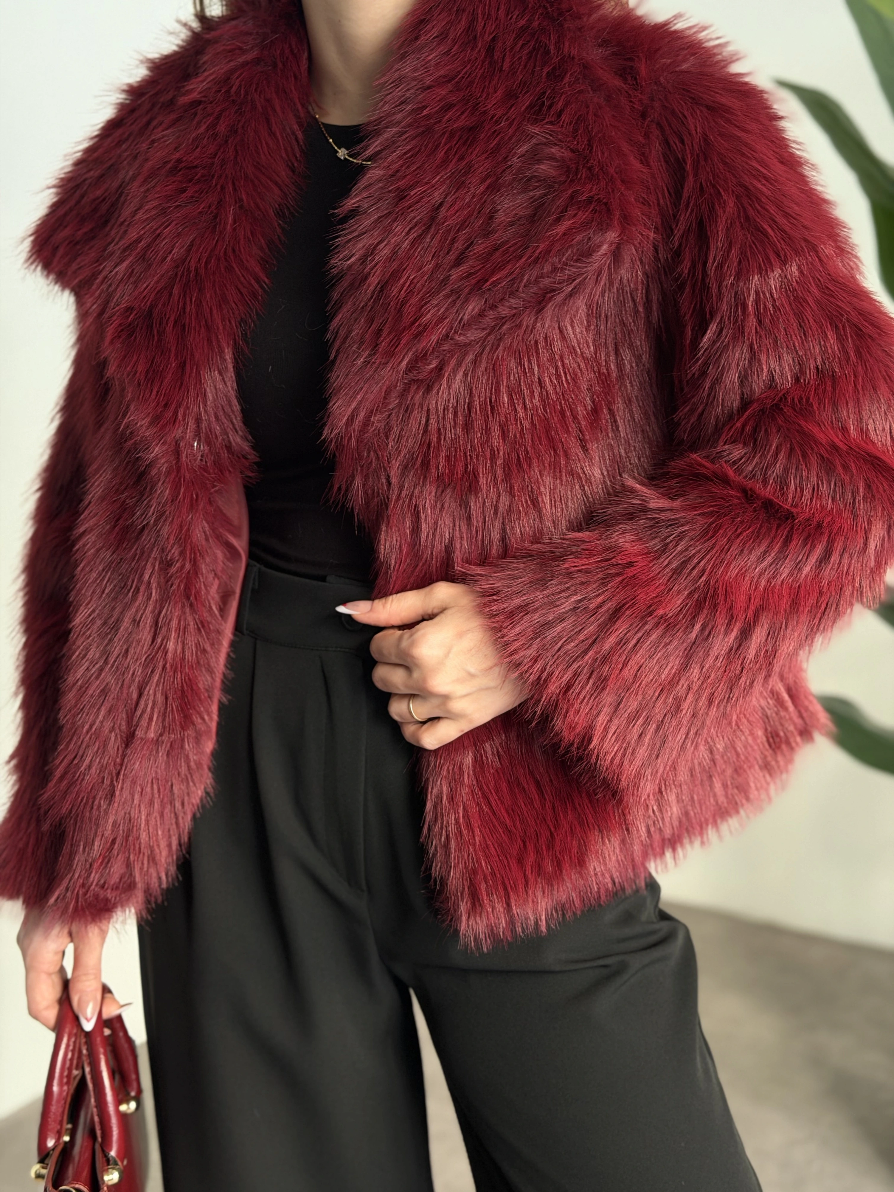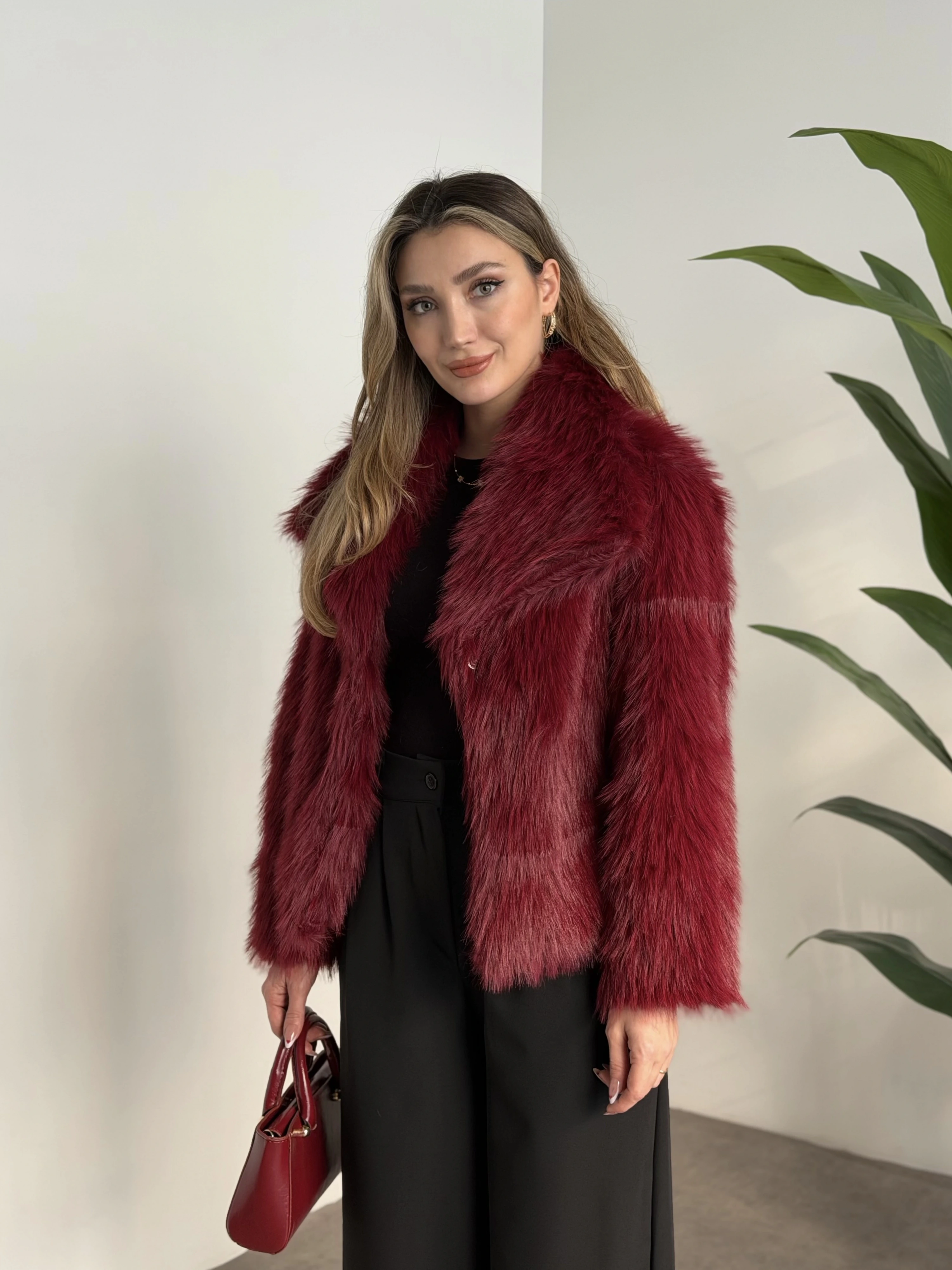 Kruvaze yaka astarlı kürklü mont bordo