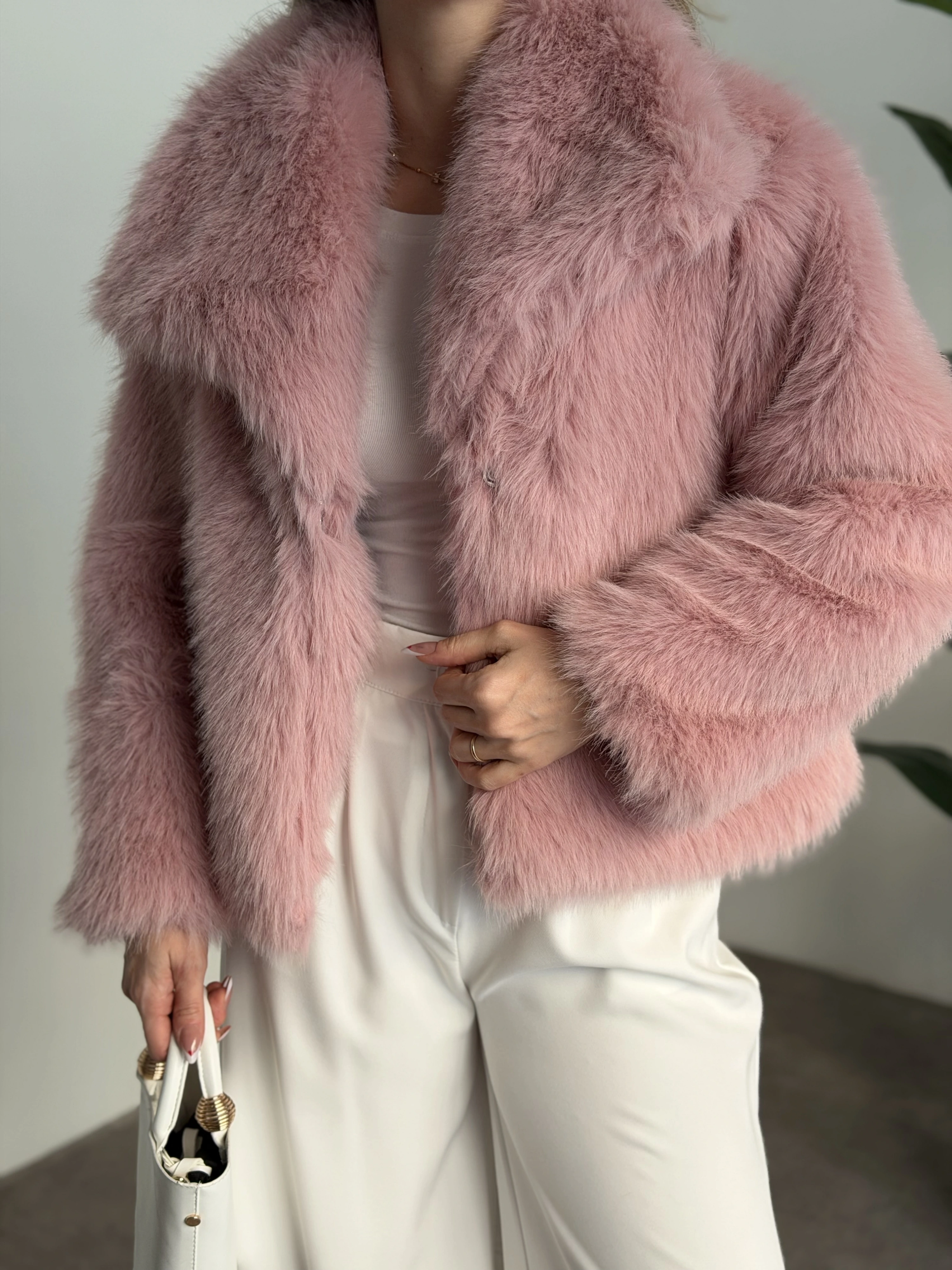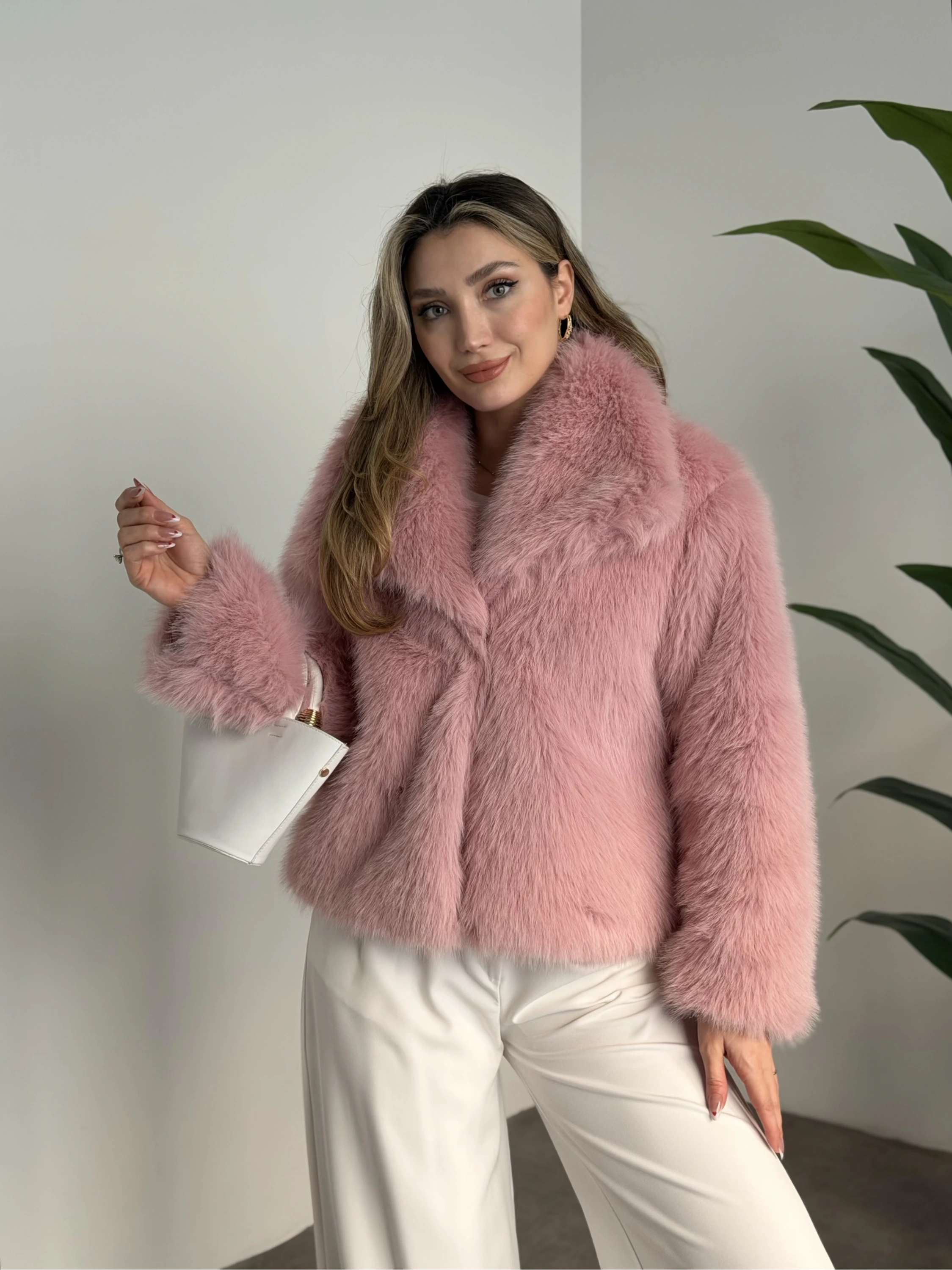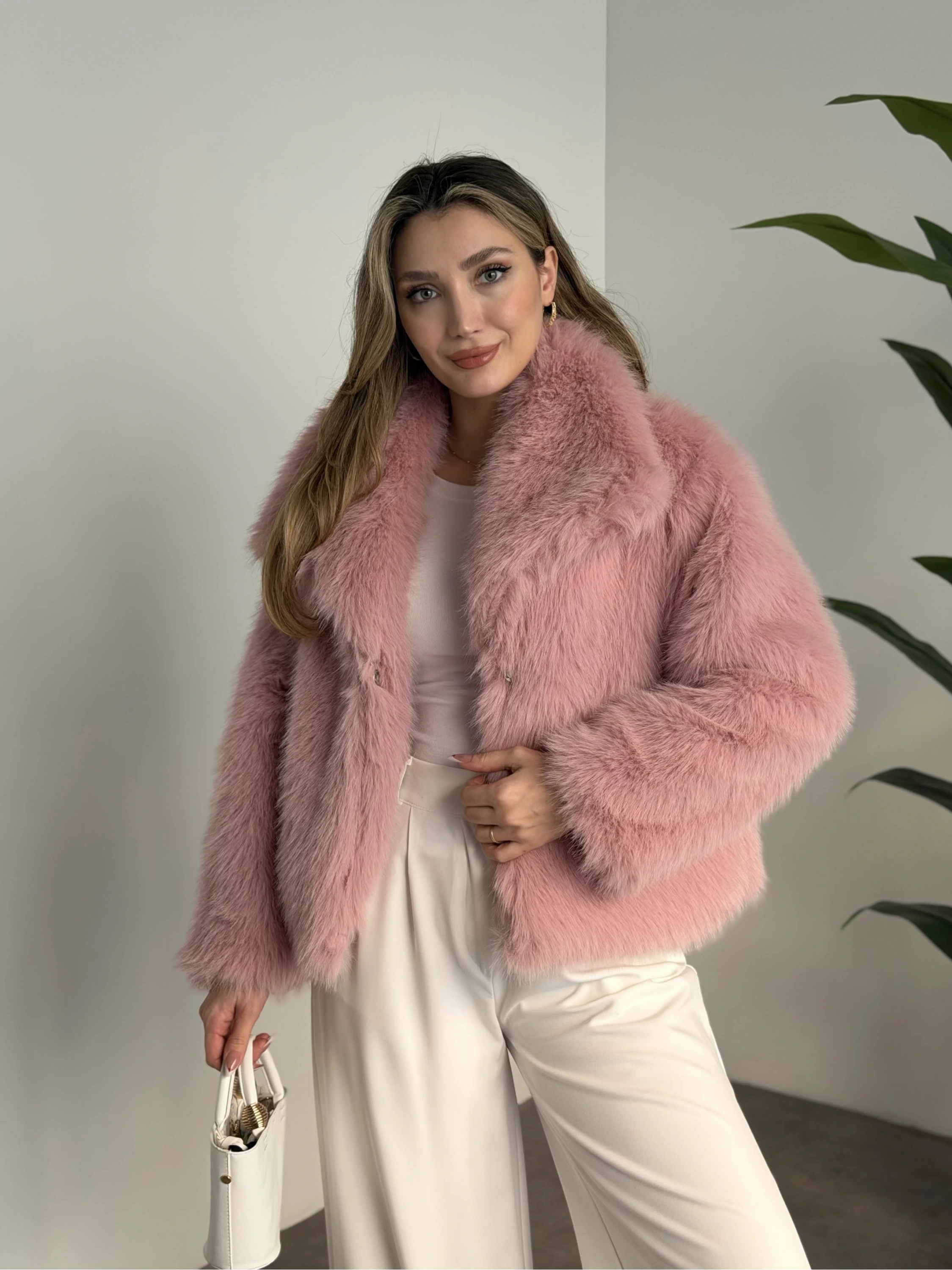Kruvaze yaka astarlı kürklü mont pembe