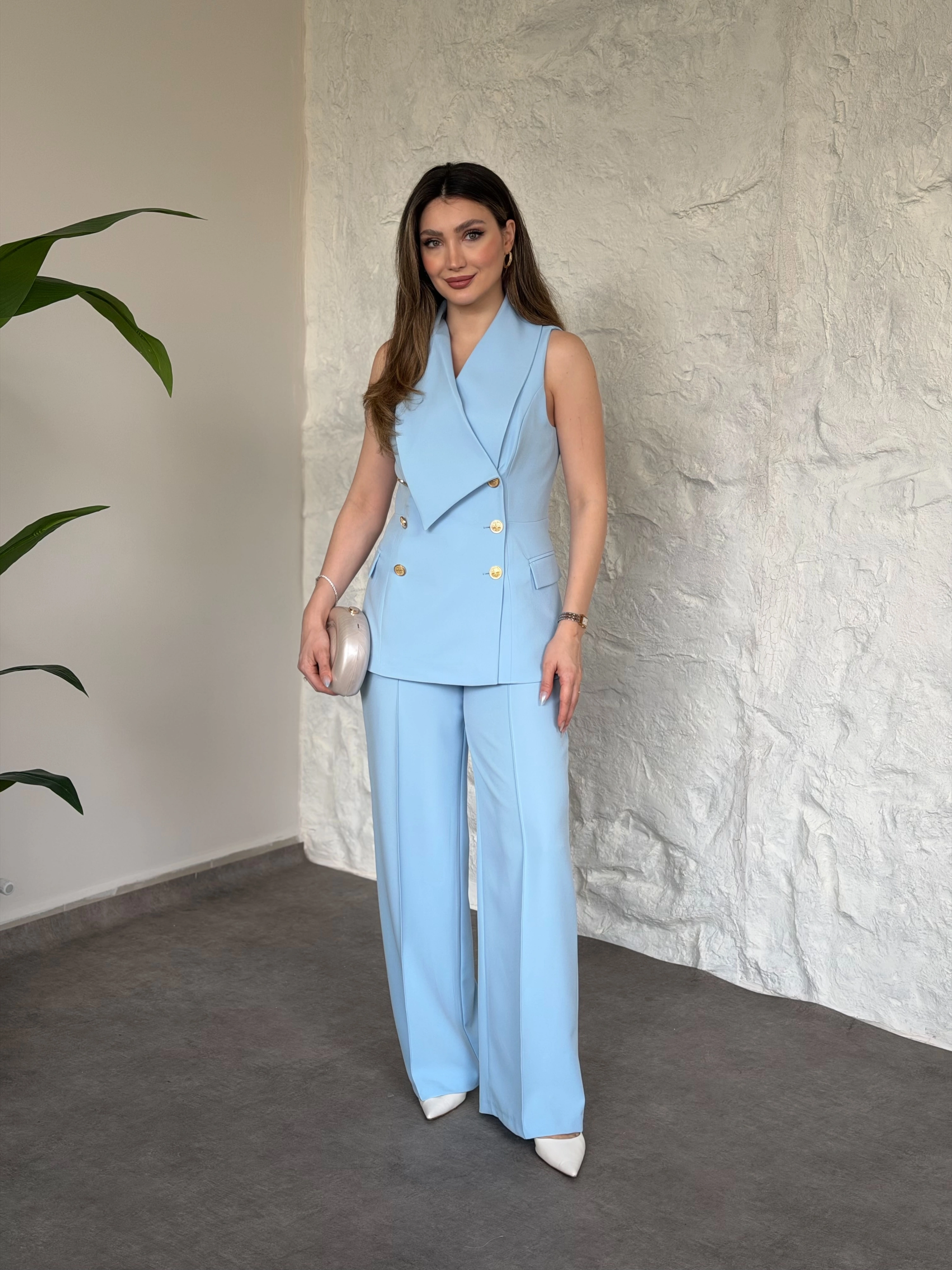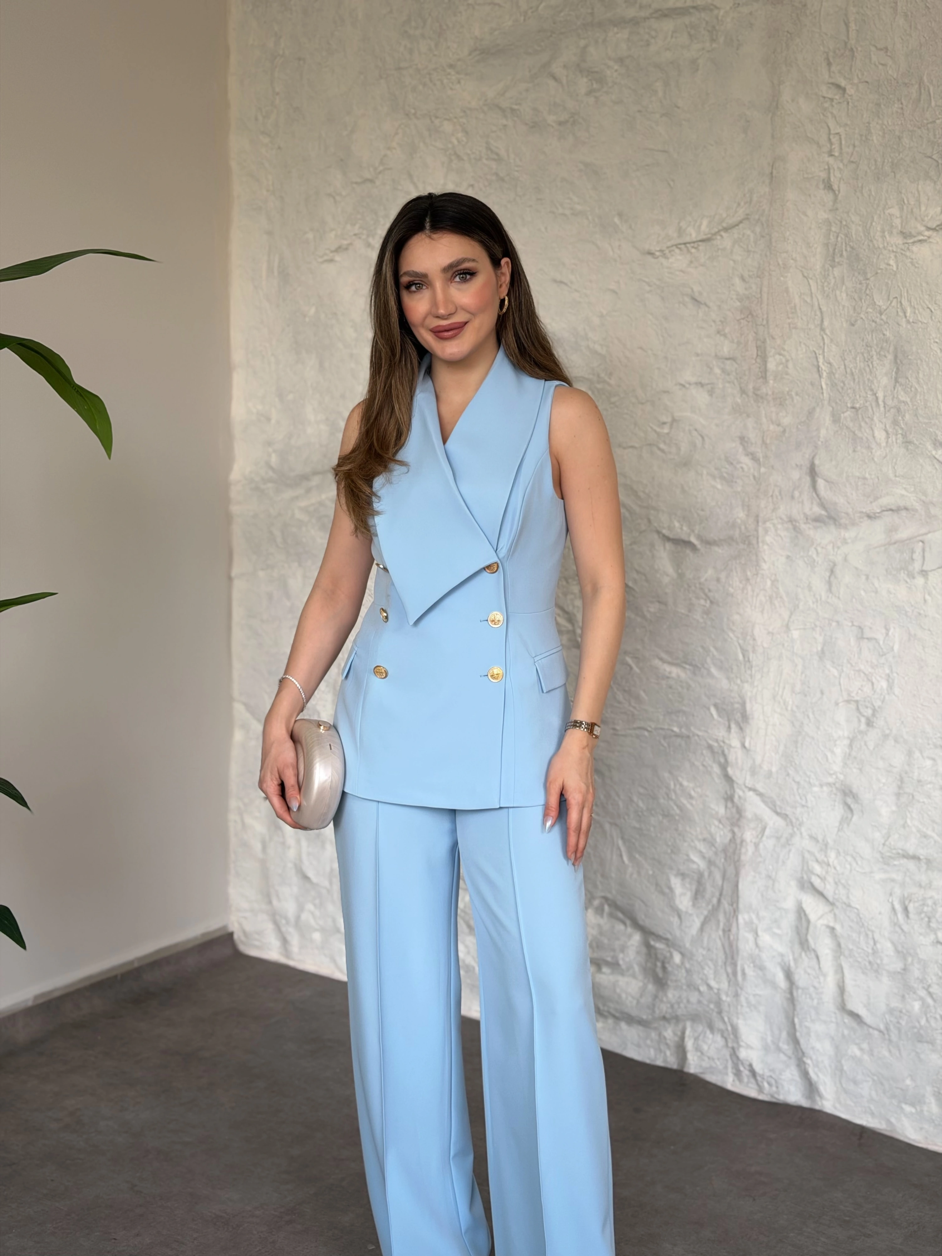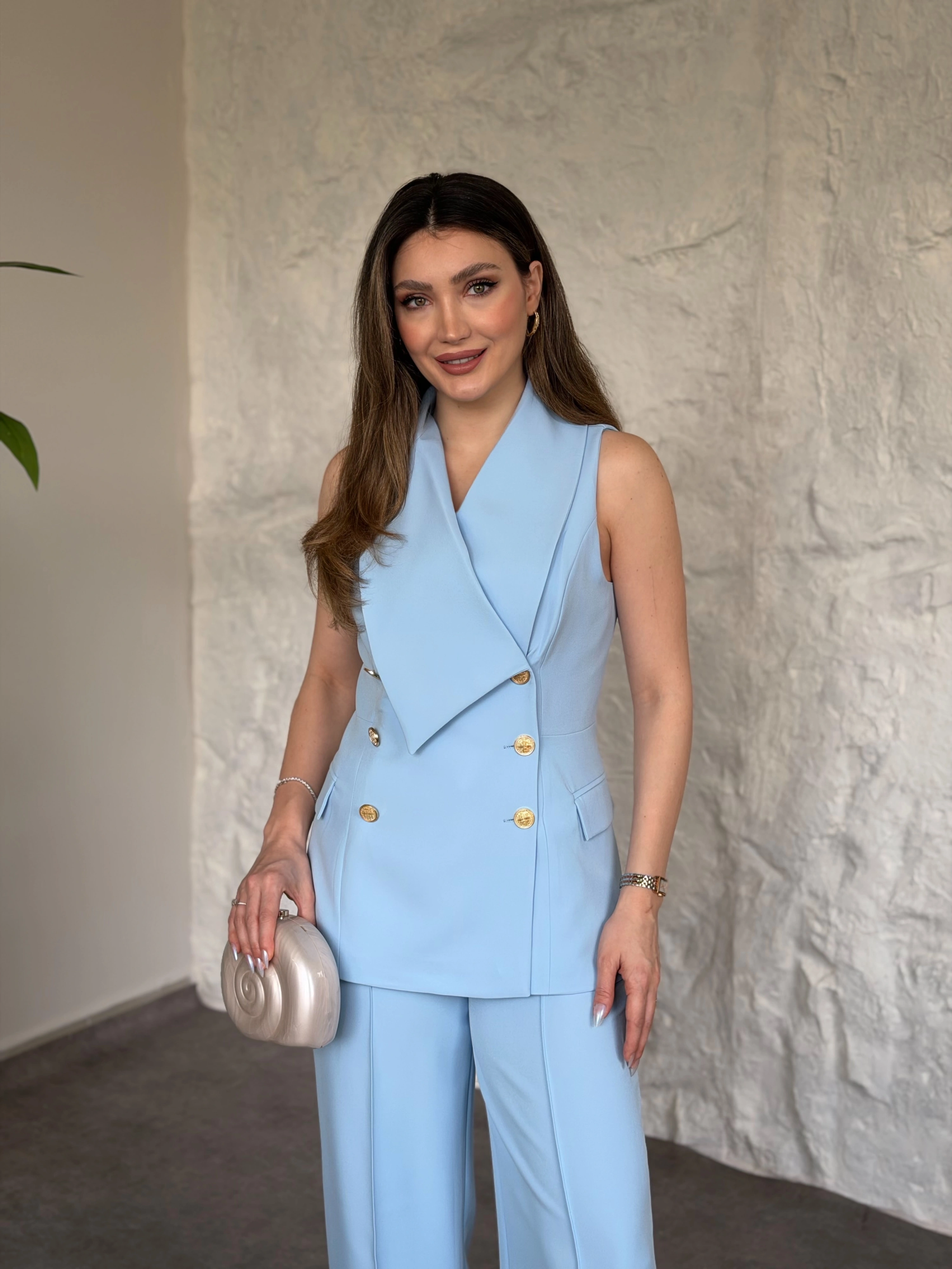 Kruvaze yaka gold düğmeli takım bebek mavisi