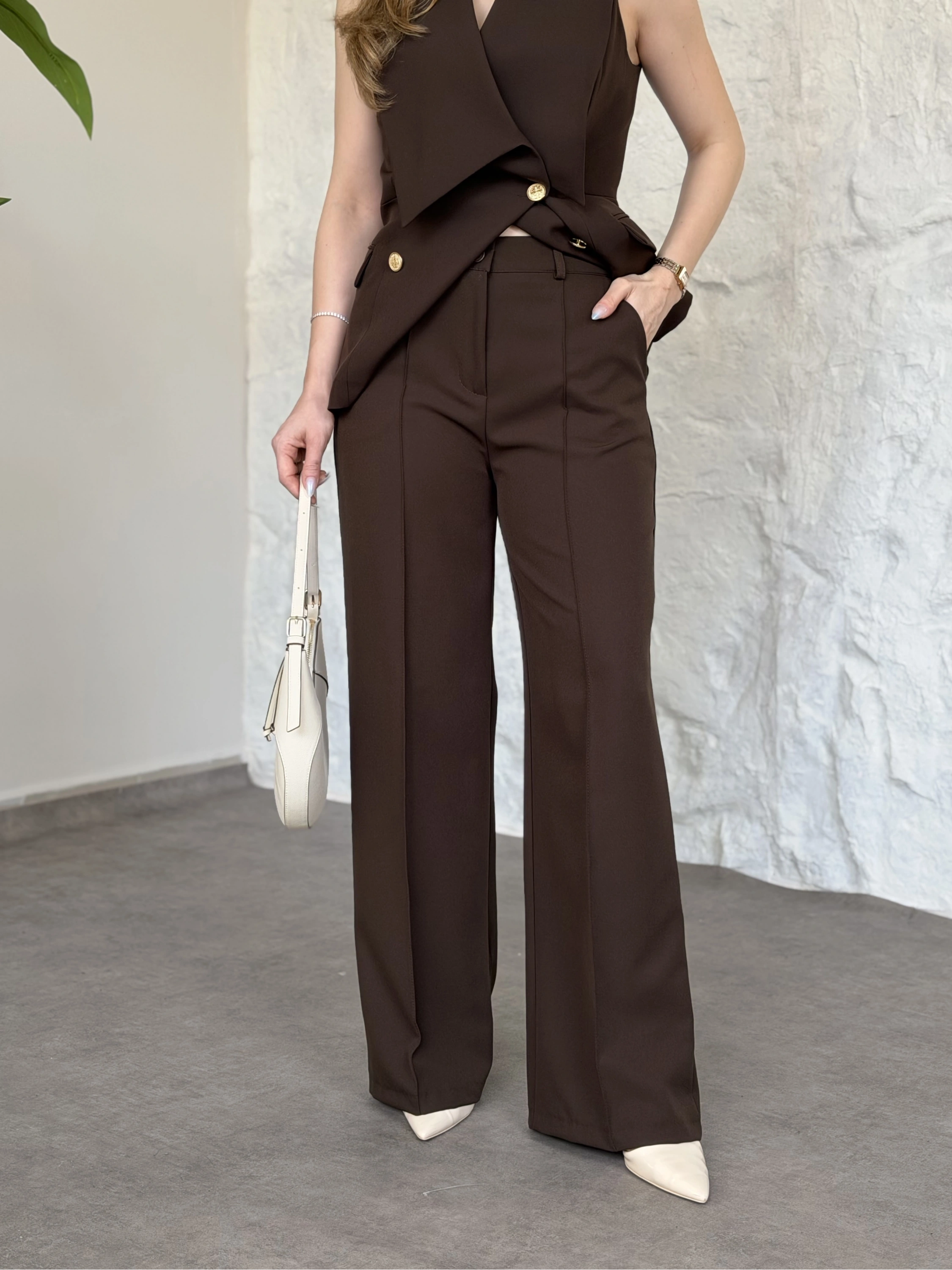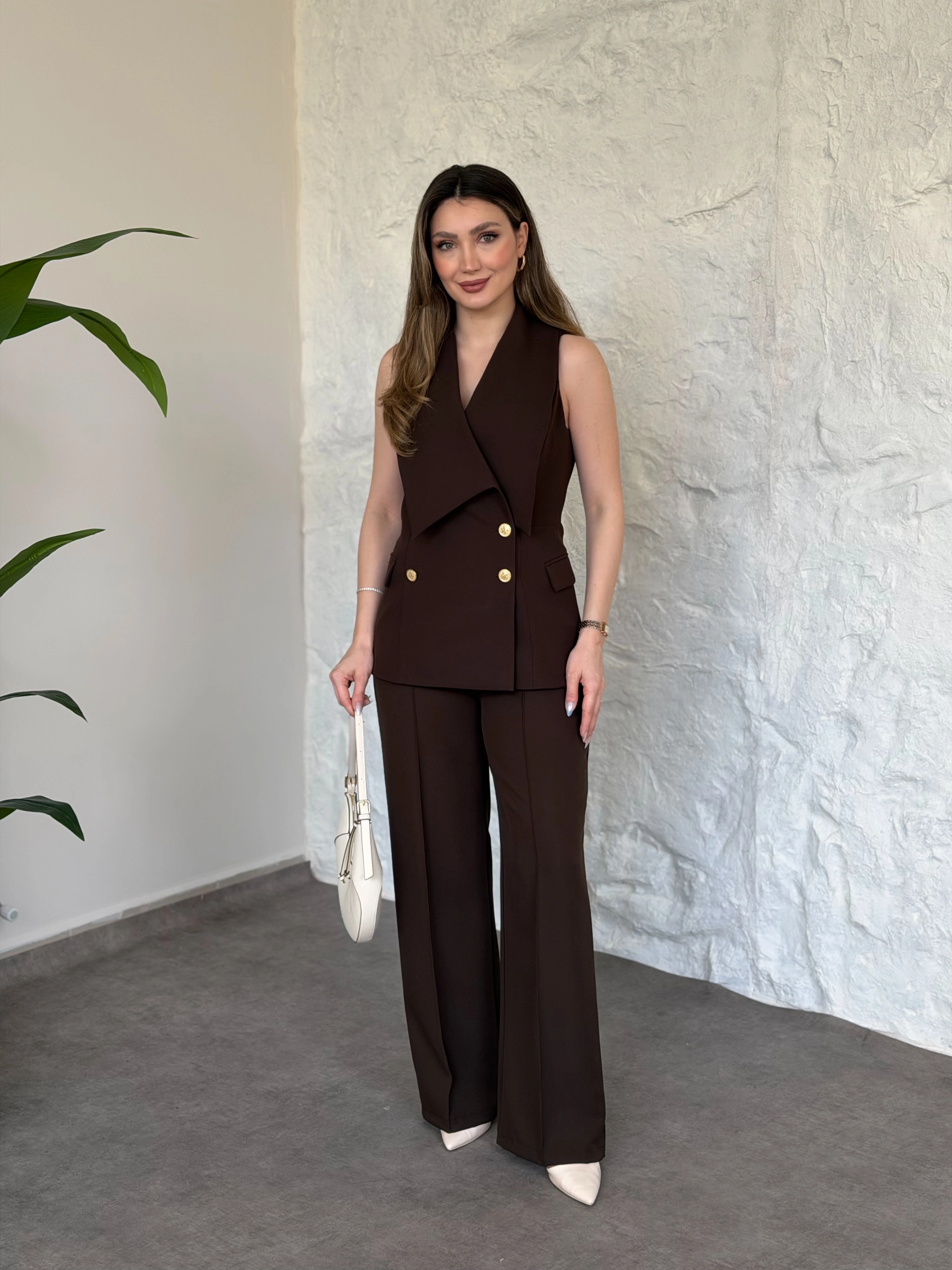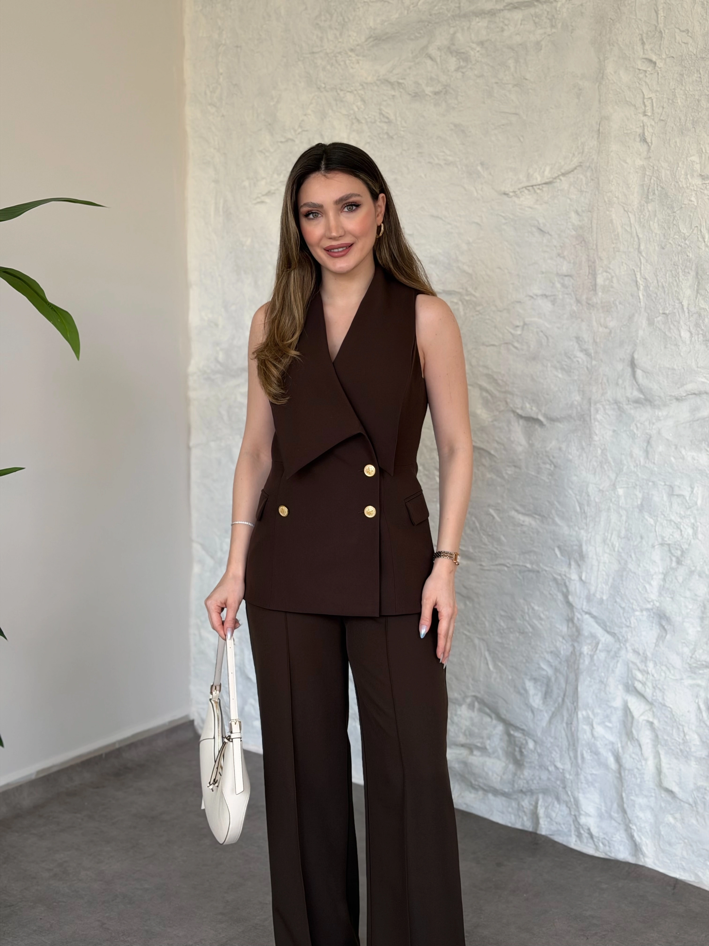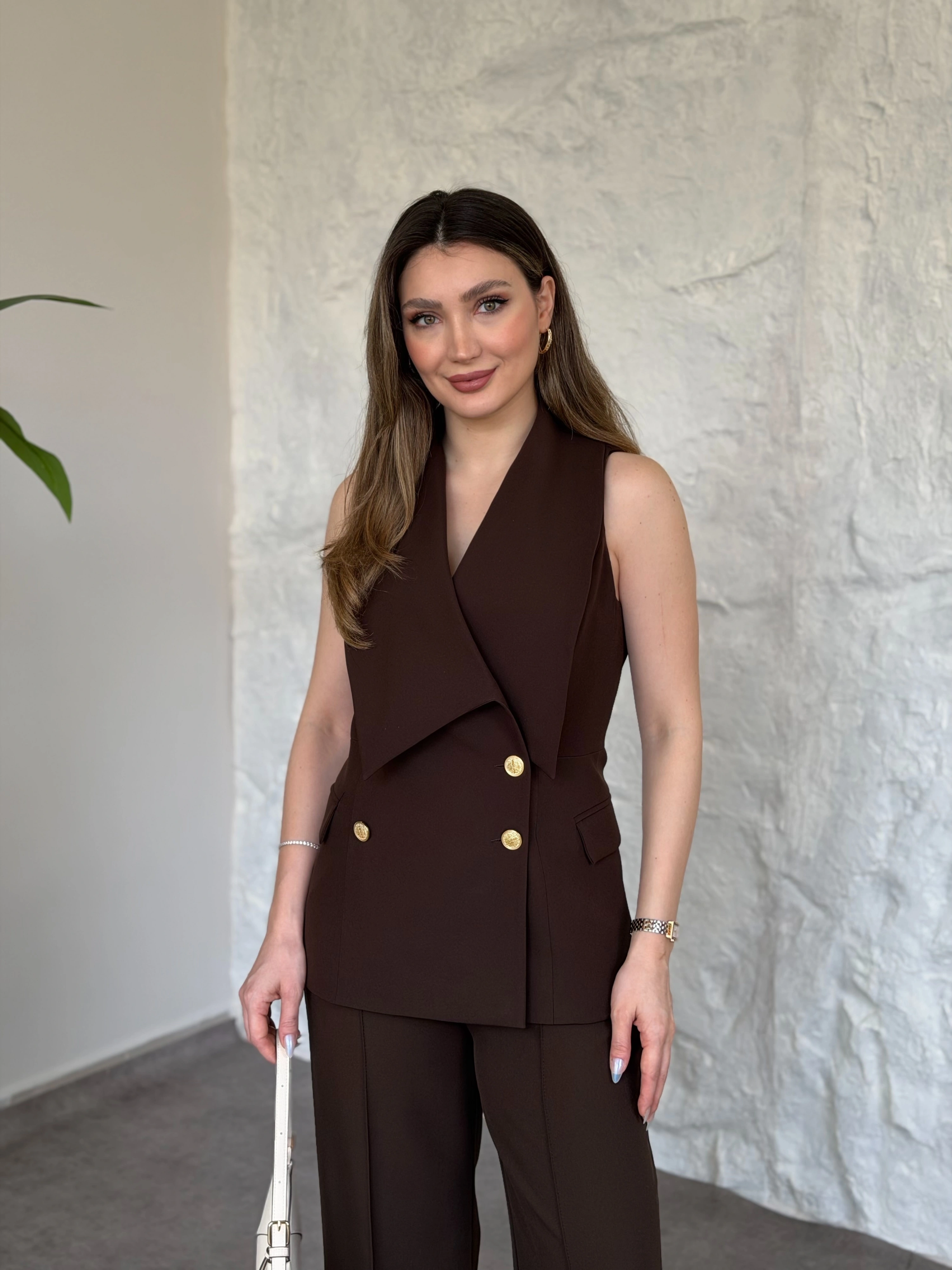 Düğme detaylı yelekli takım kahve