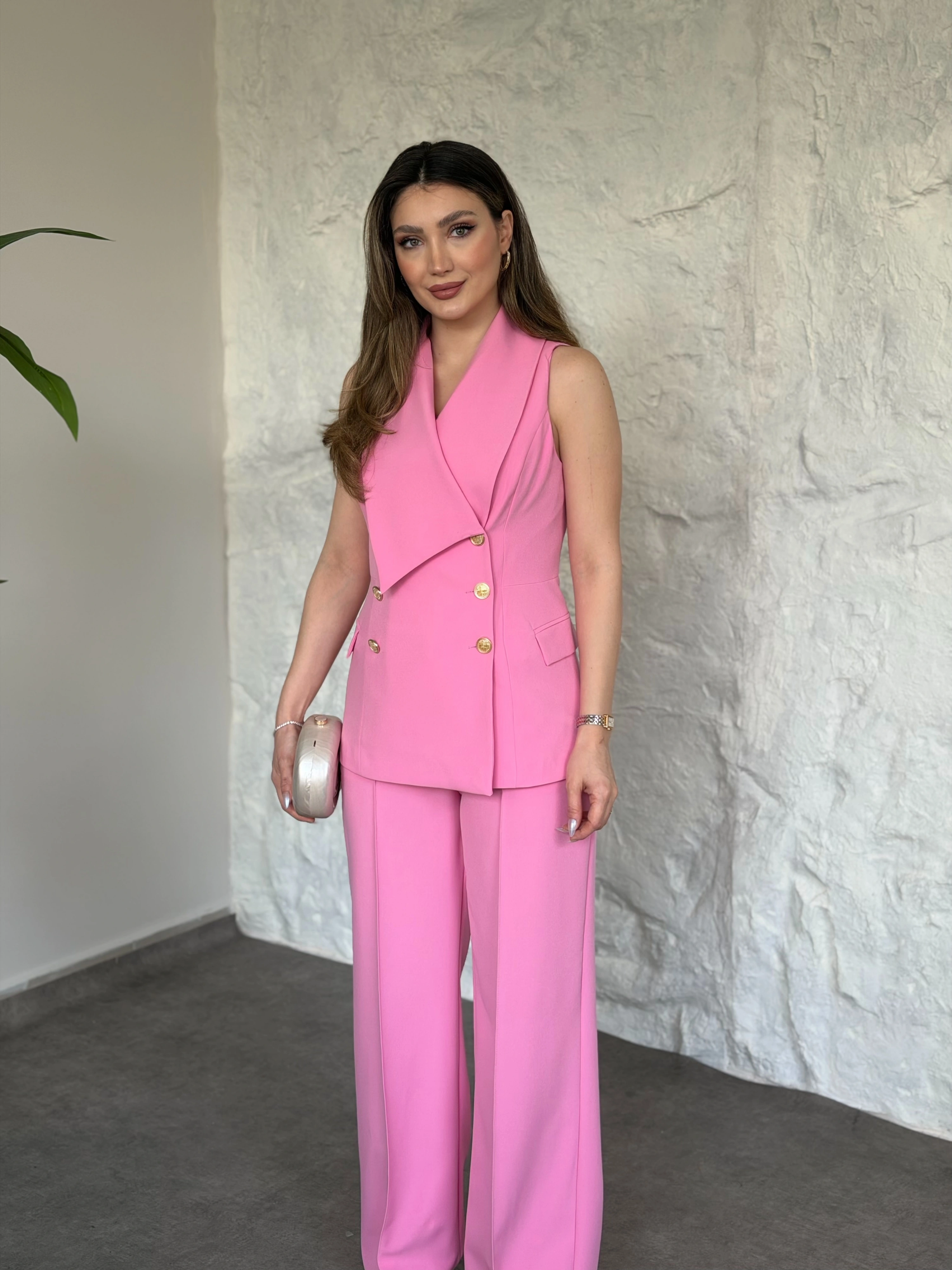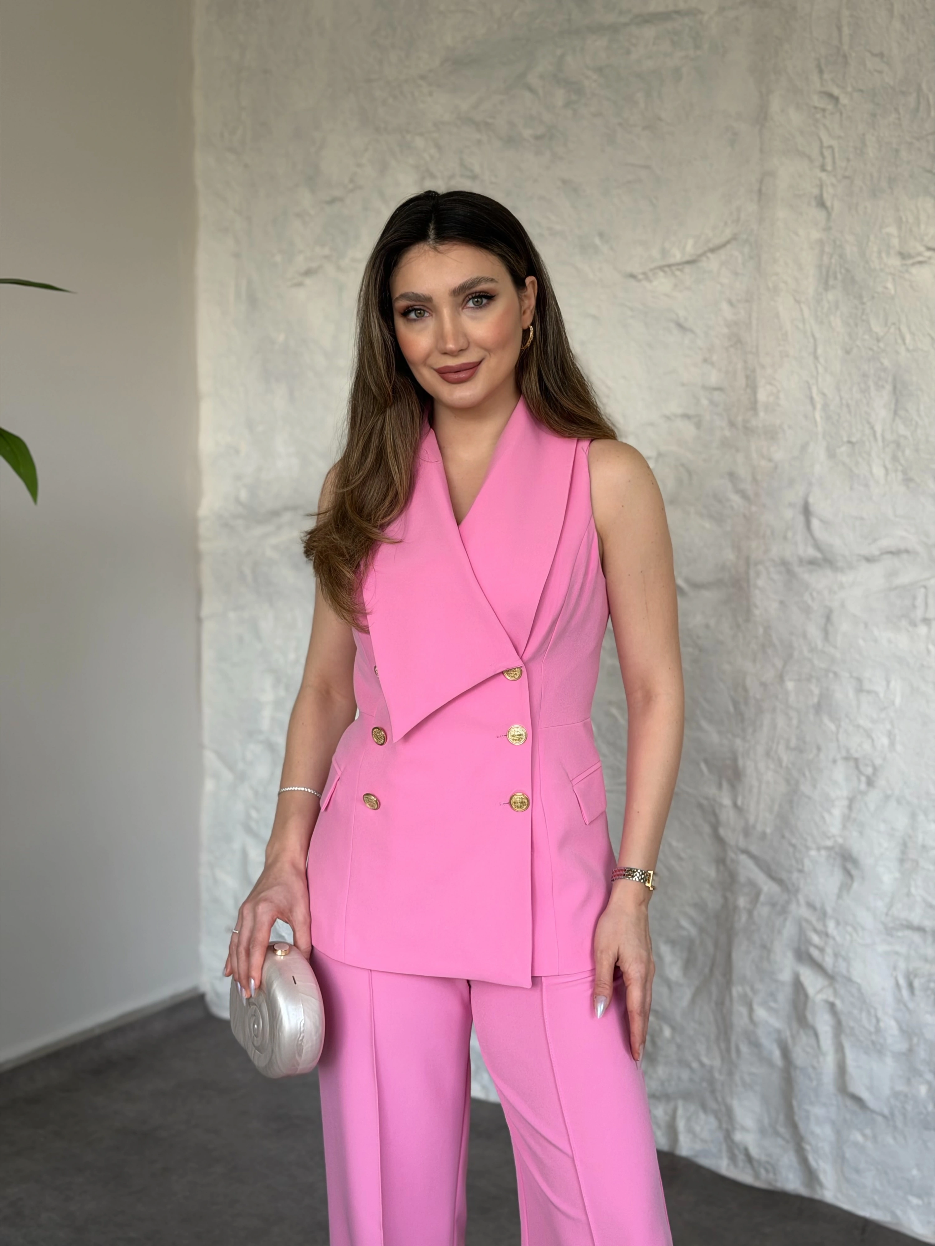 Sıfır kol belden bağlamalı kumaş takım siyah