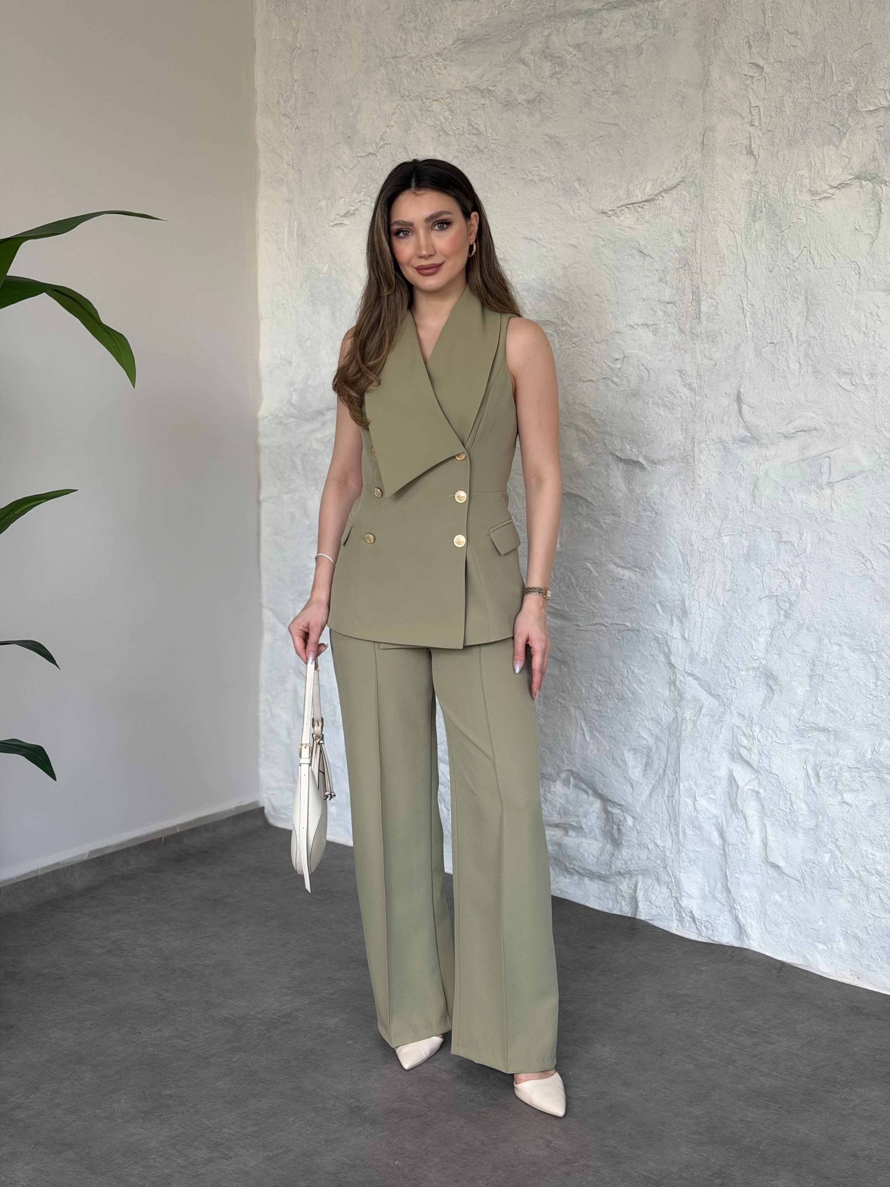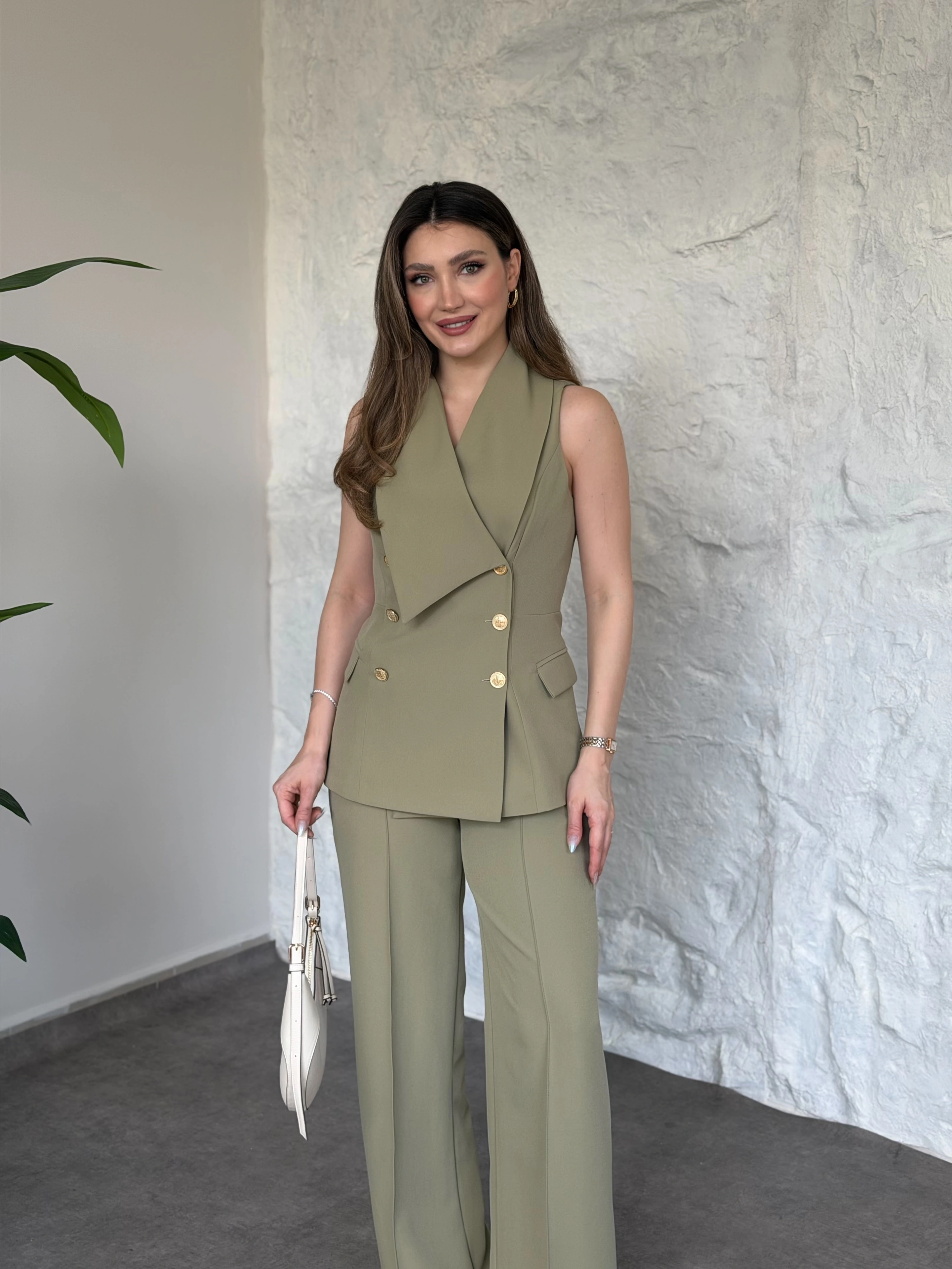 Düğme detaylı yelekli takım kahve