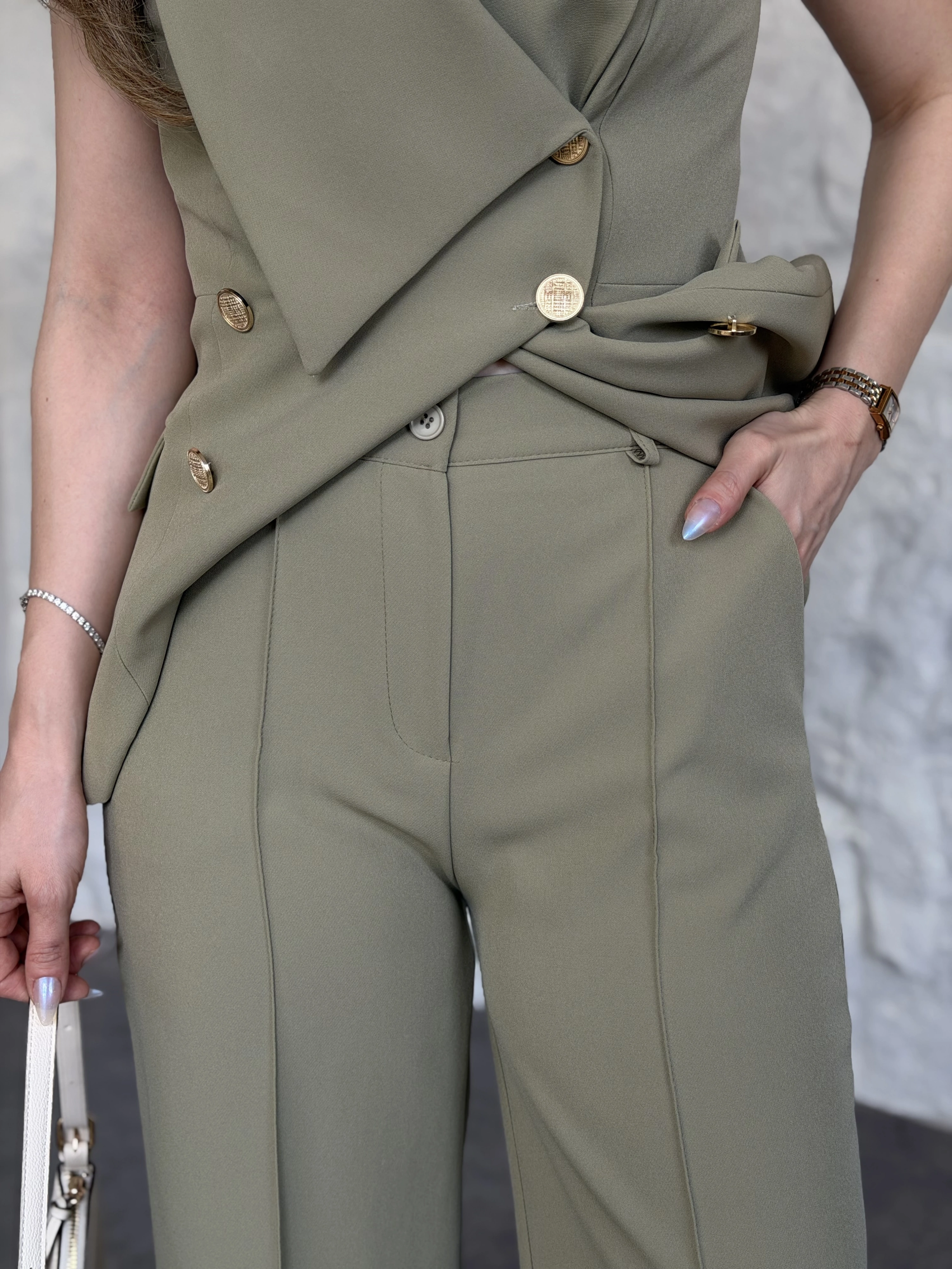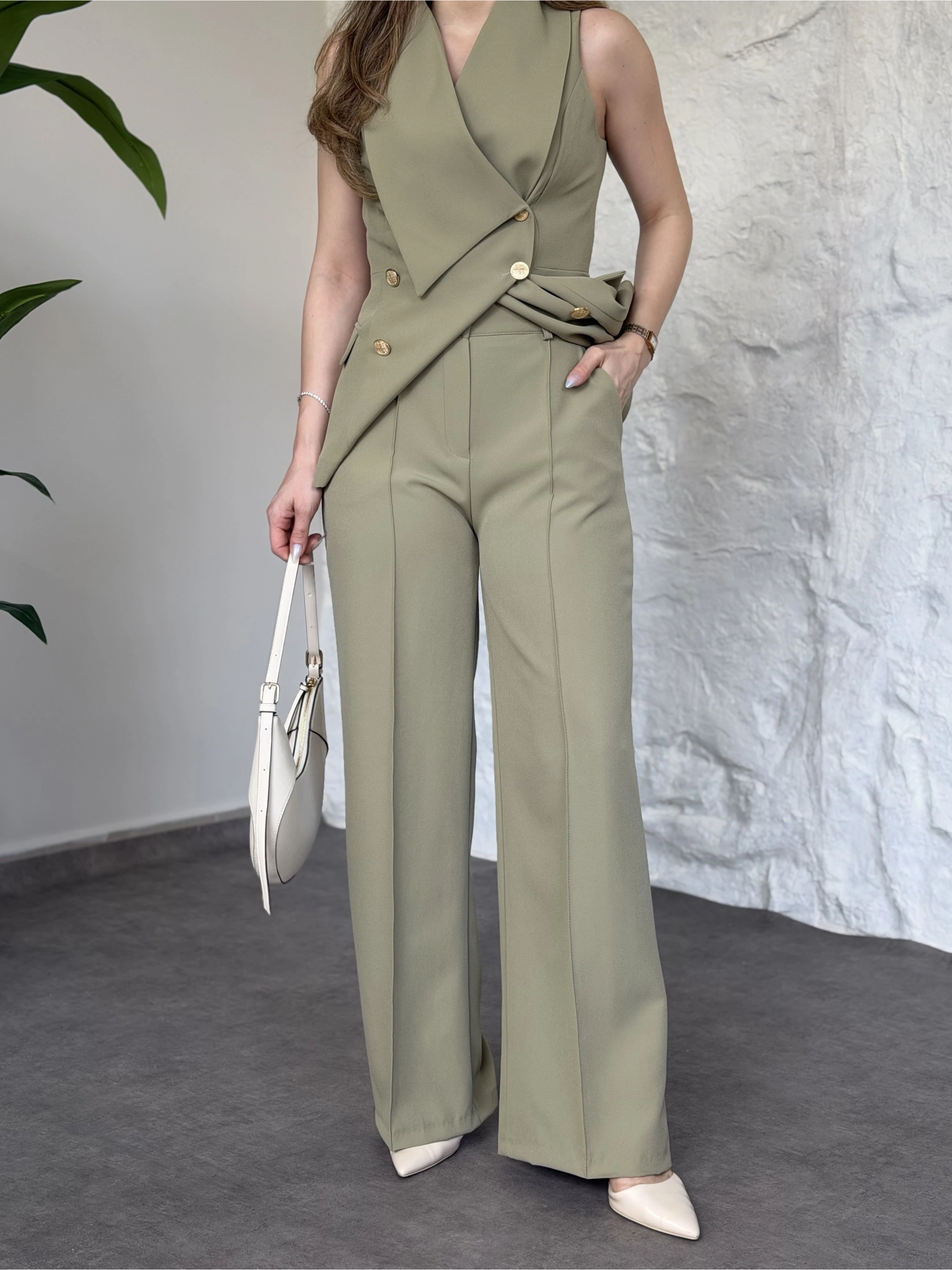 Gold düğmeli belden oturtmalı takım yeşil