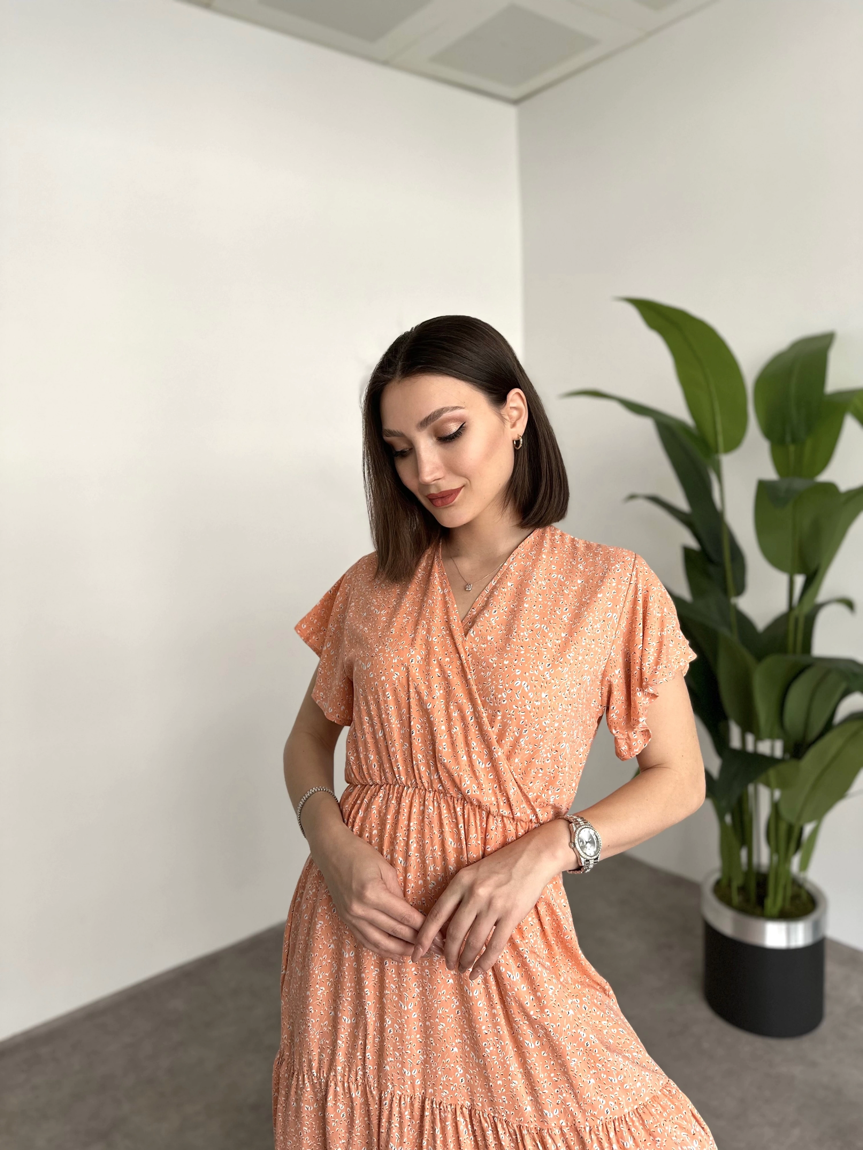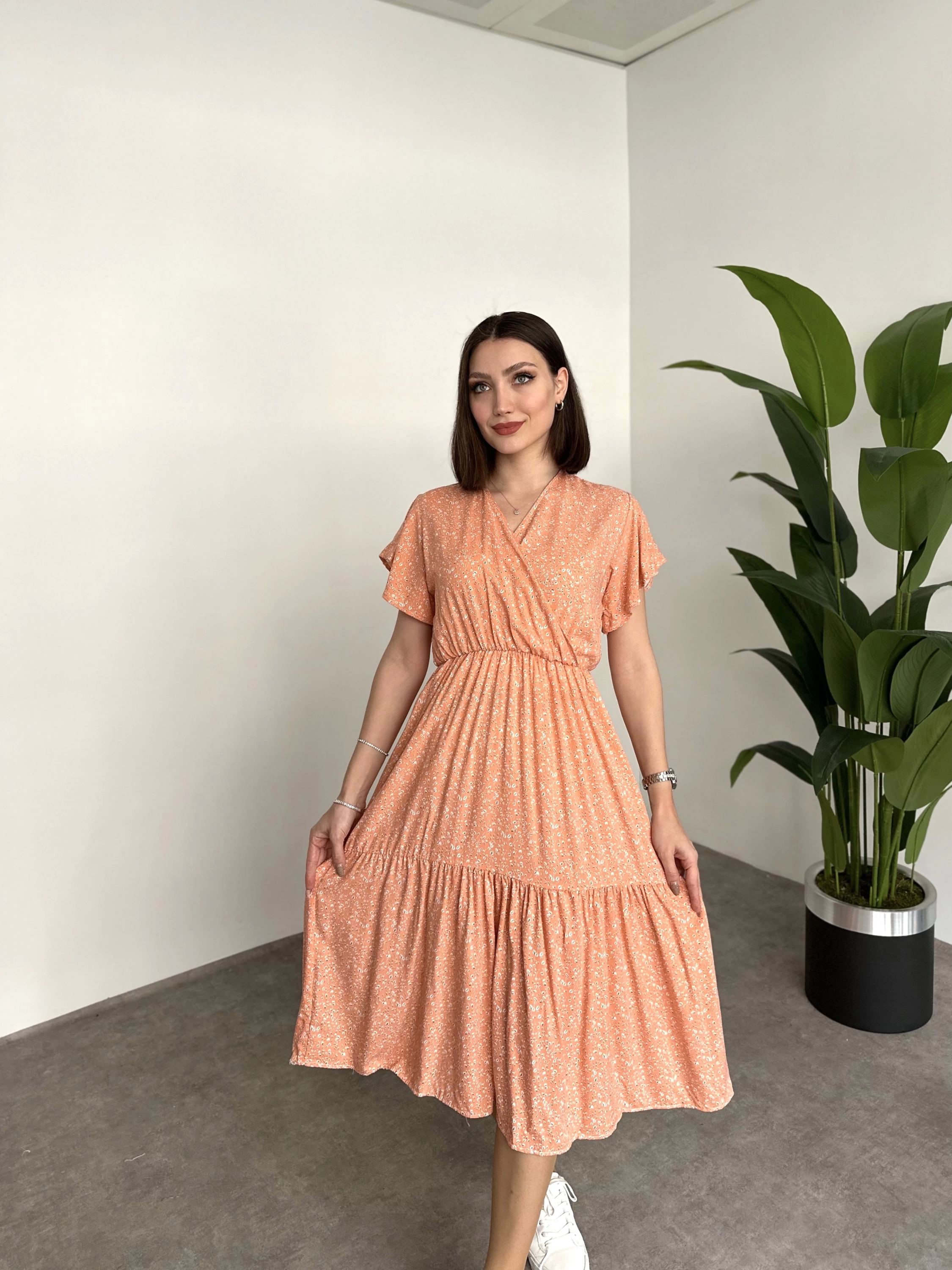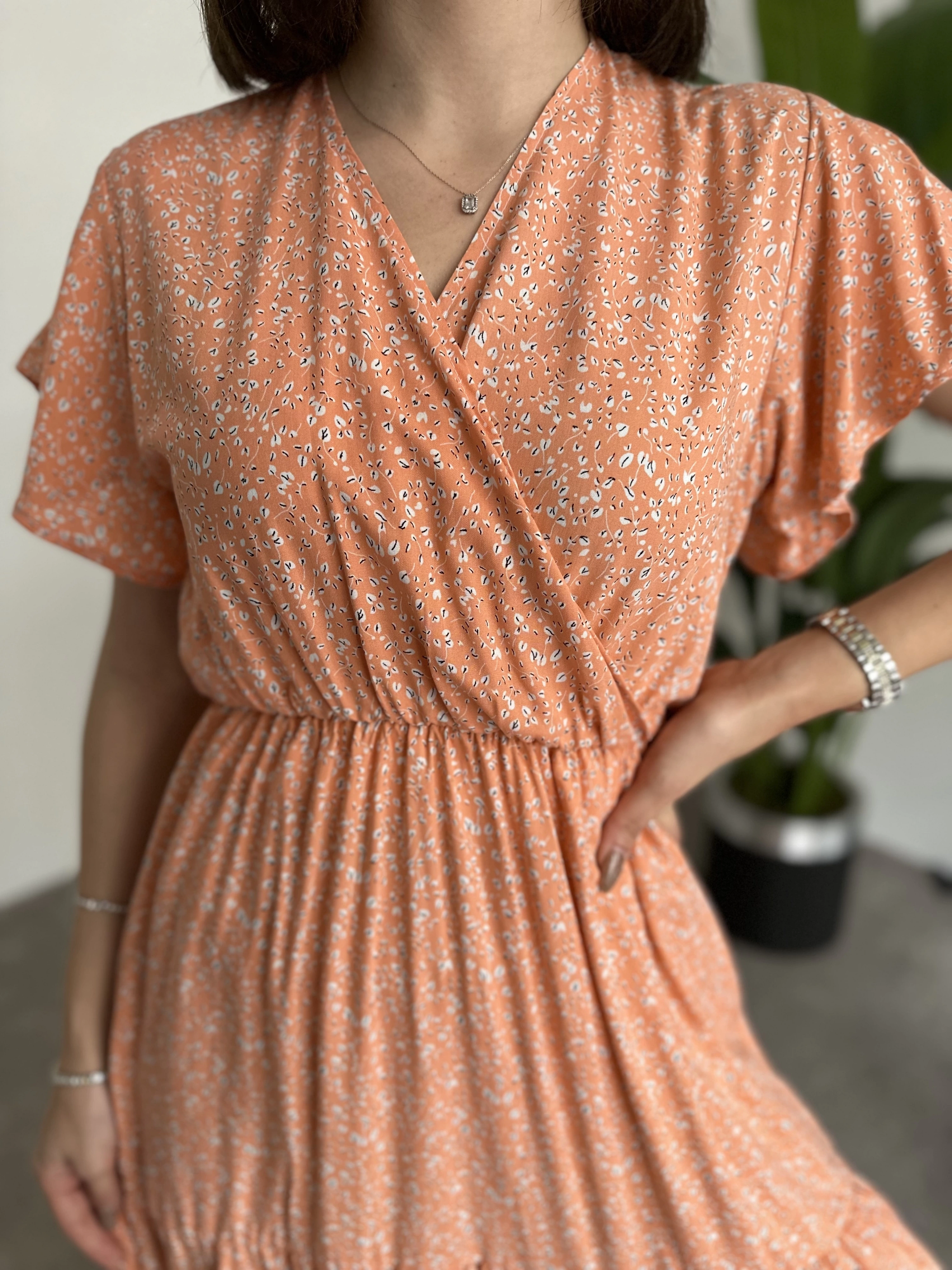 Kruvaze yaka viskon elbise Pudra Beyaz Küçük Çiçekli