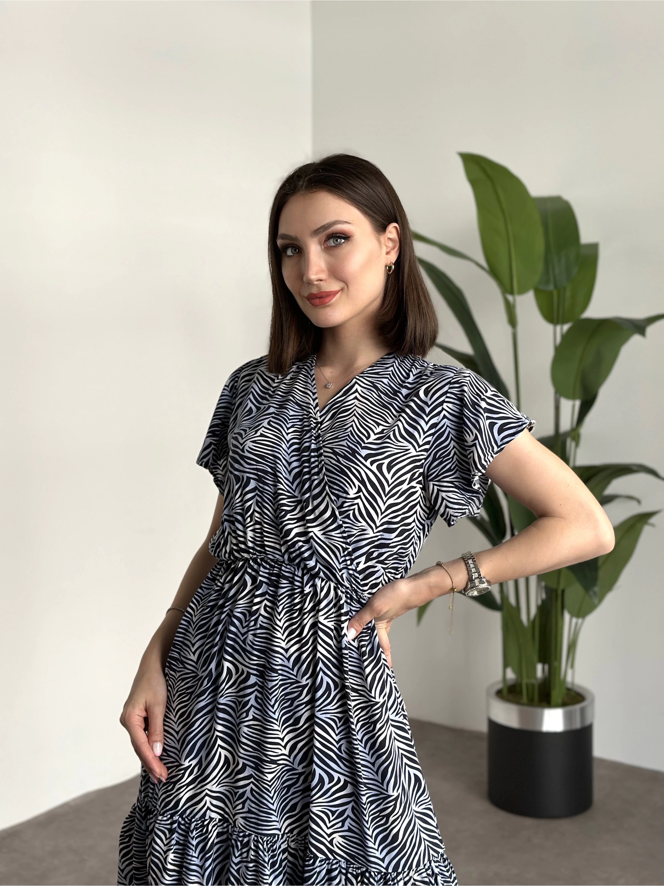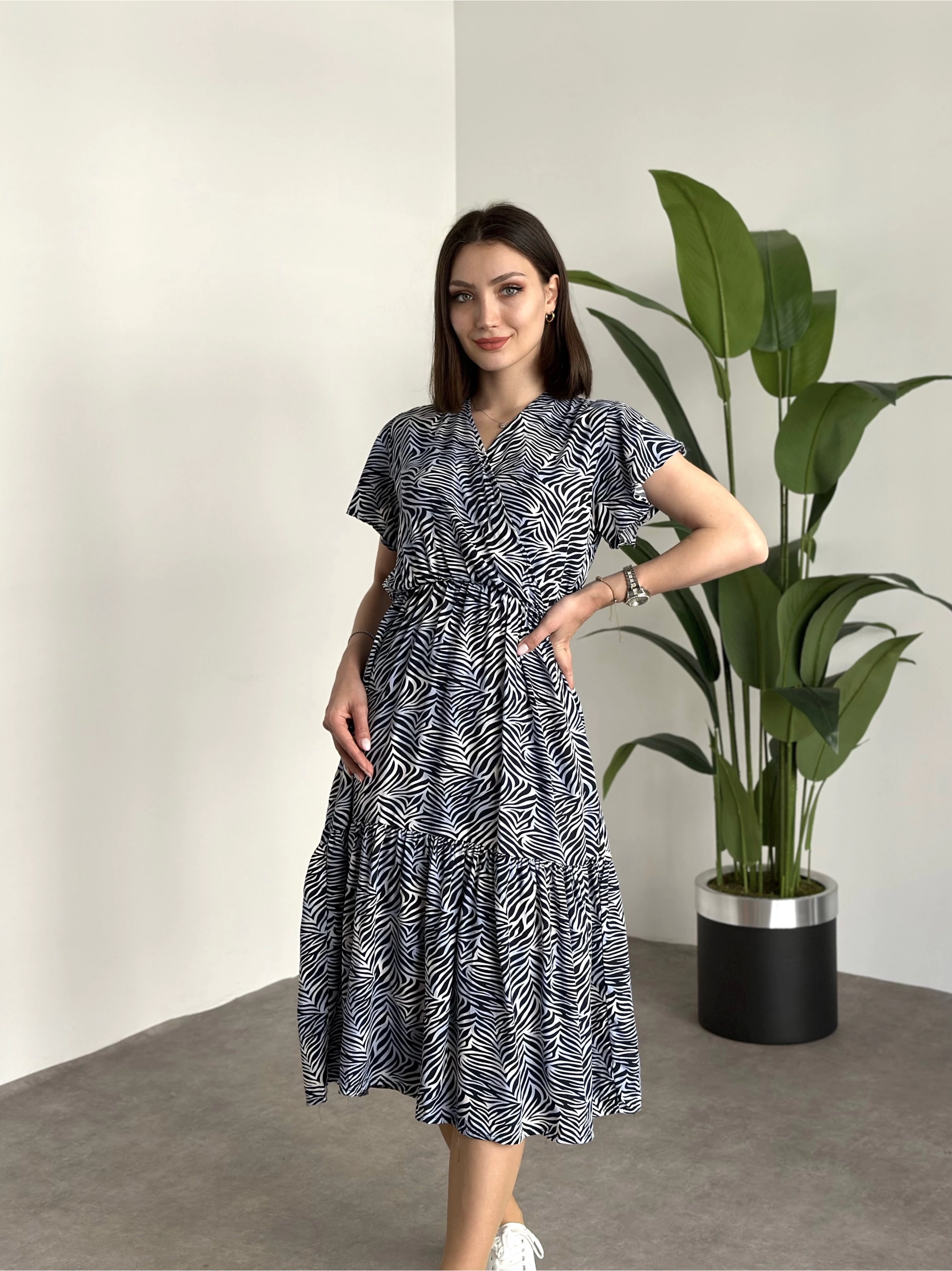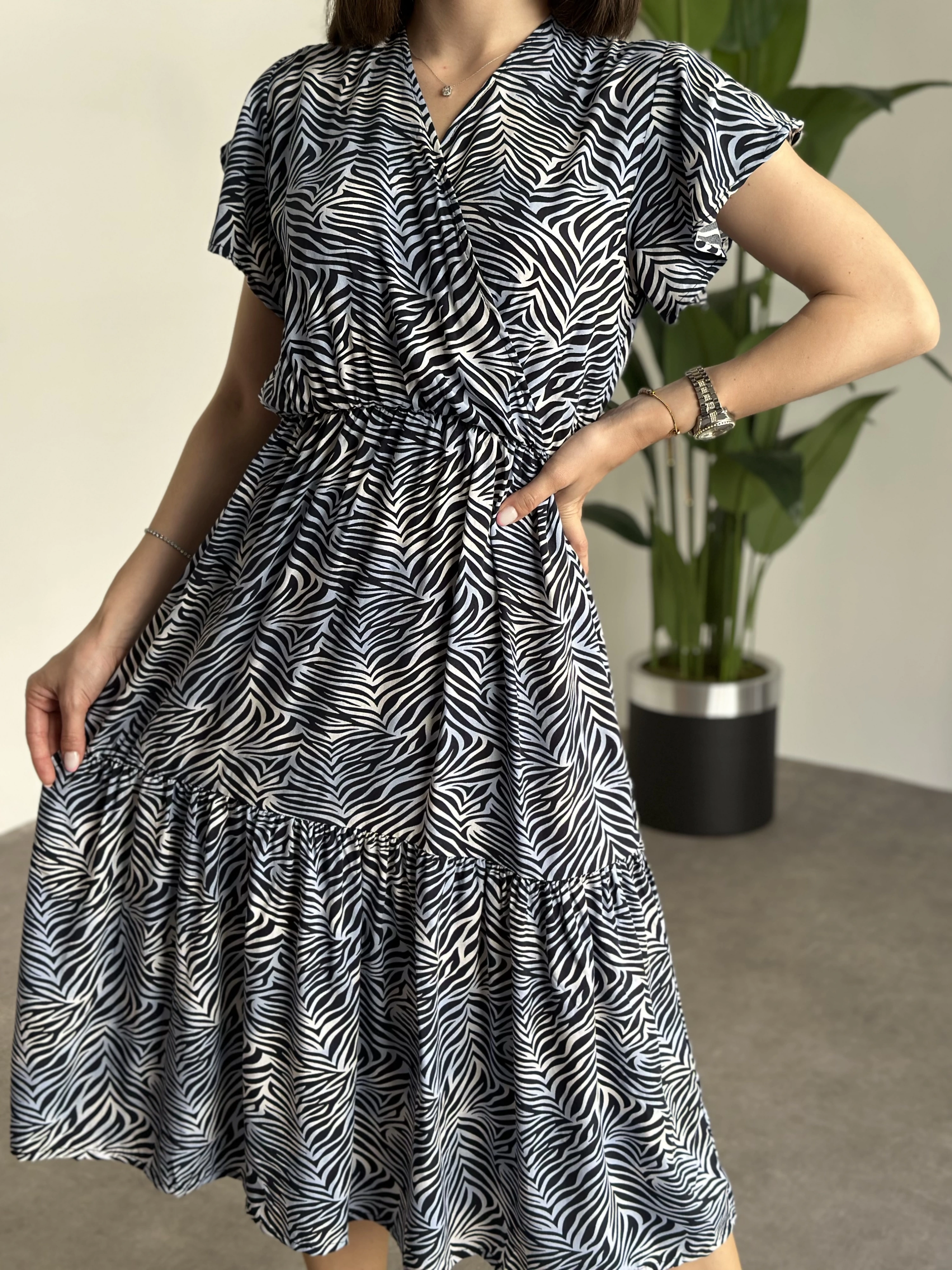 Kruvaze yaka viskon elbise Lacivert Beyaz Zebra Desenli