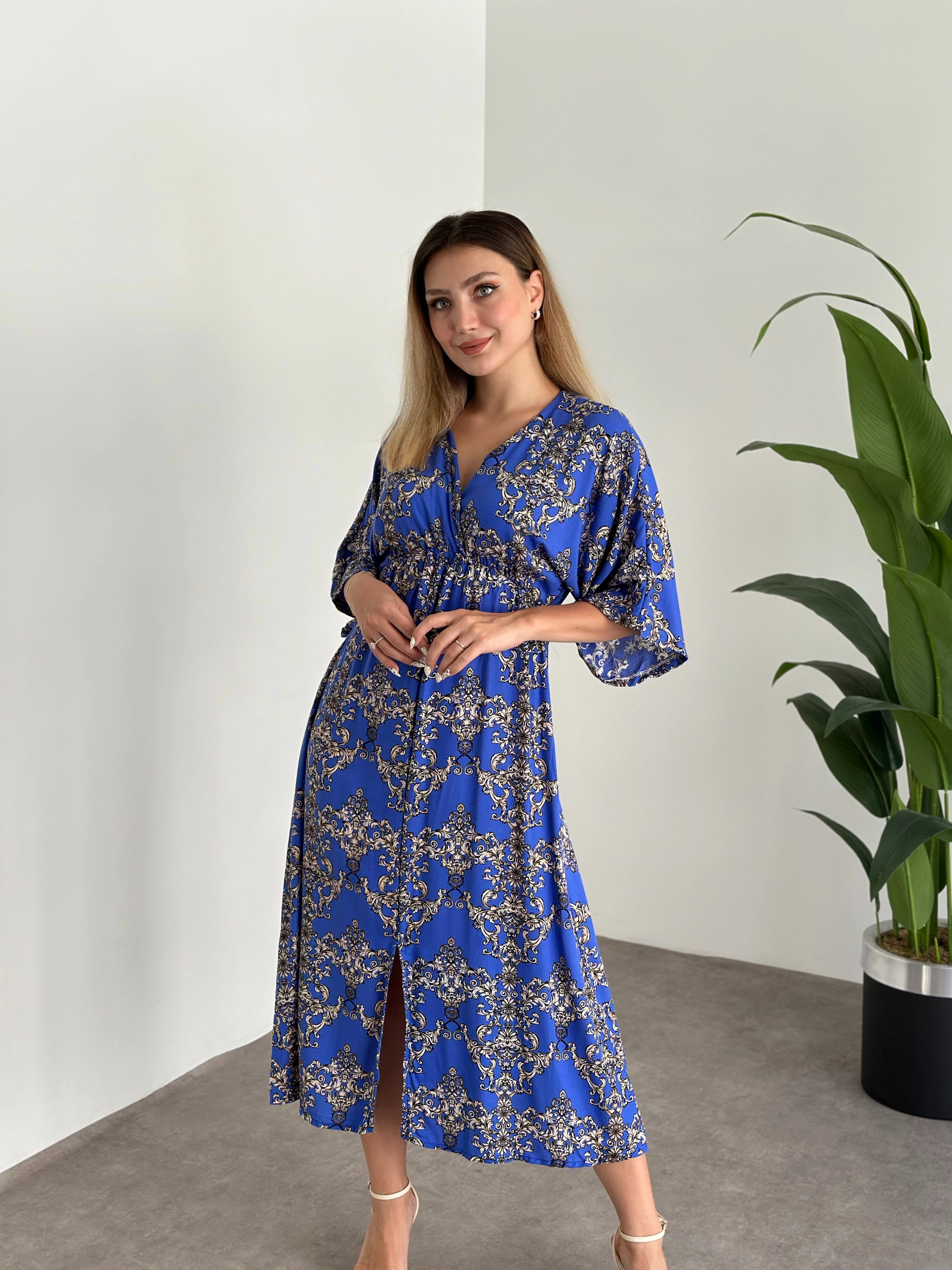 Kruvaze Yaka Yarasa Kol Yırtmaçlı Lastikli Elbise Koyu Mavi