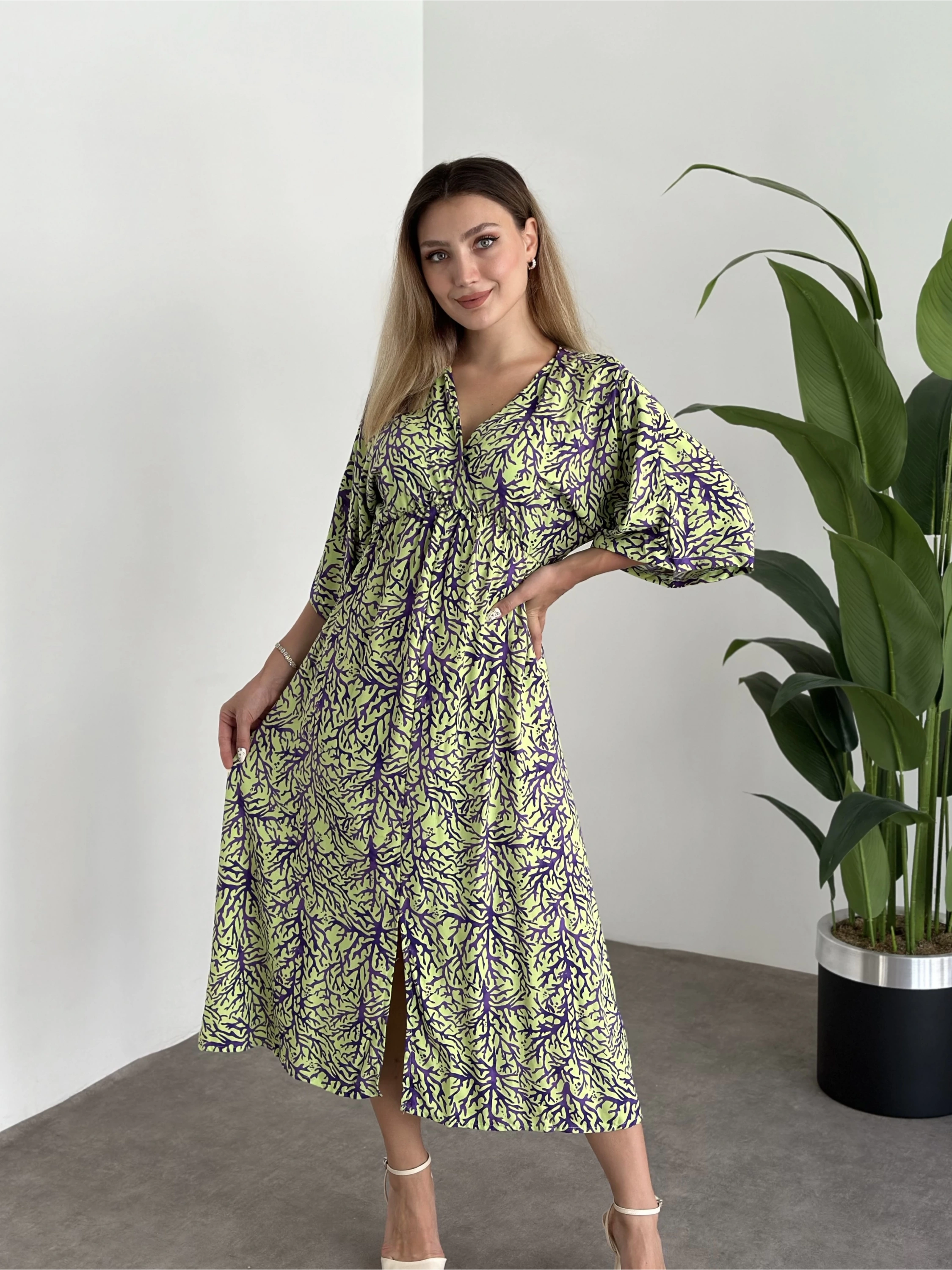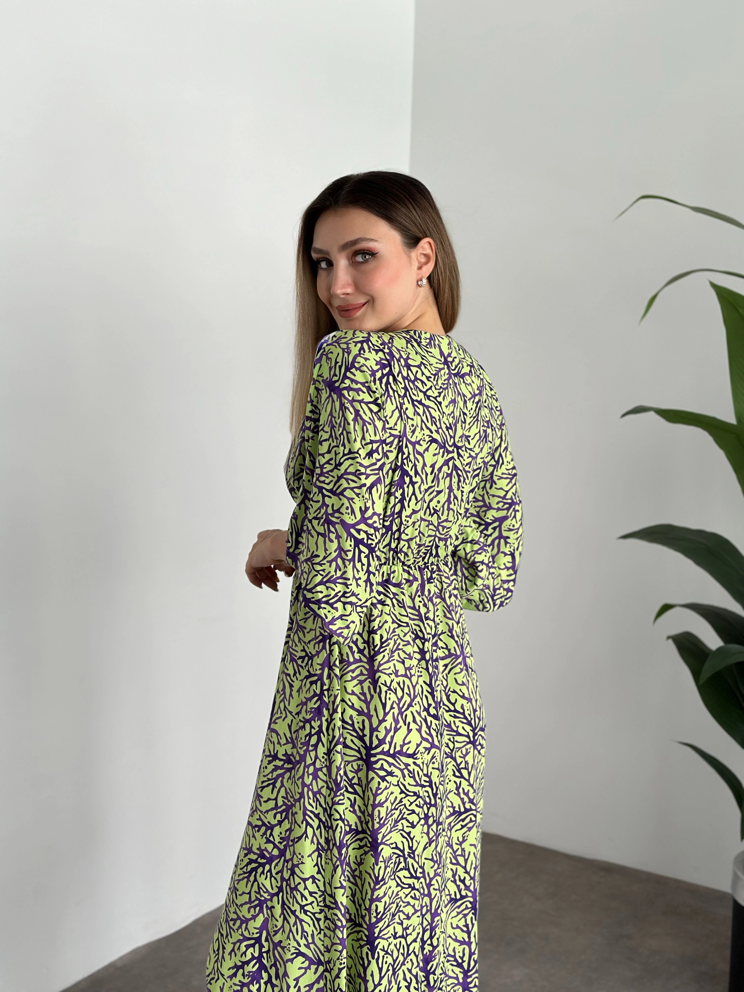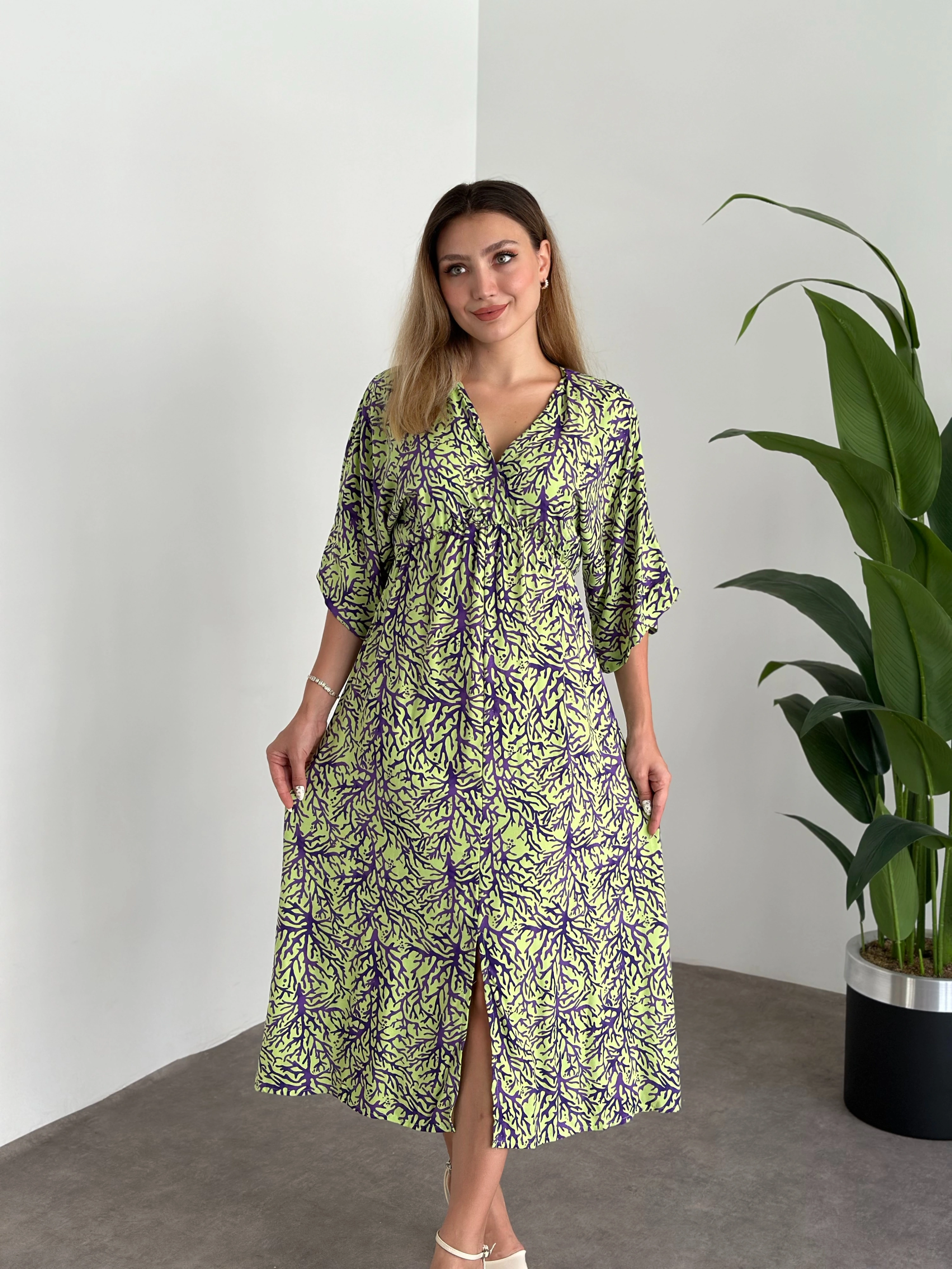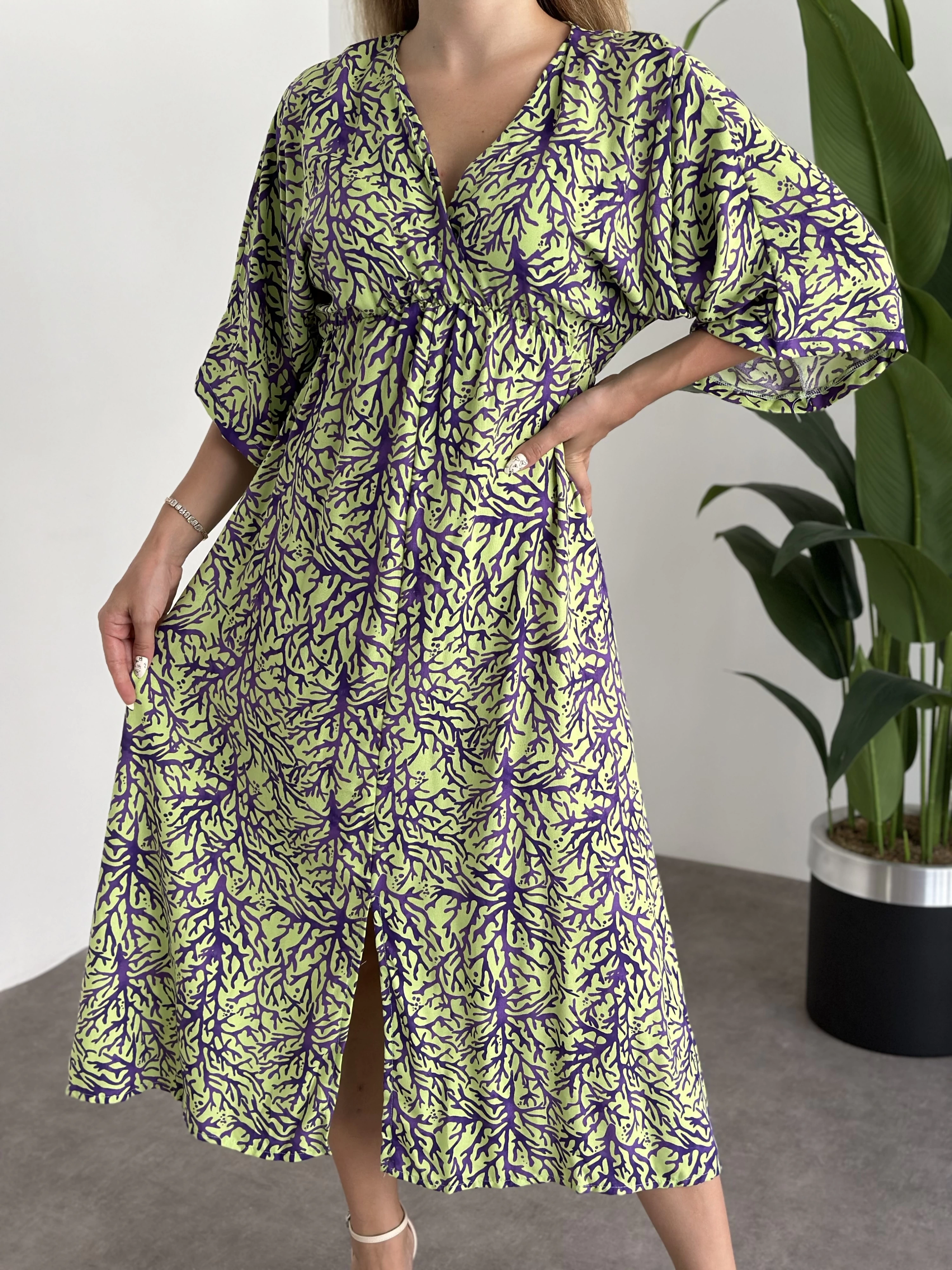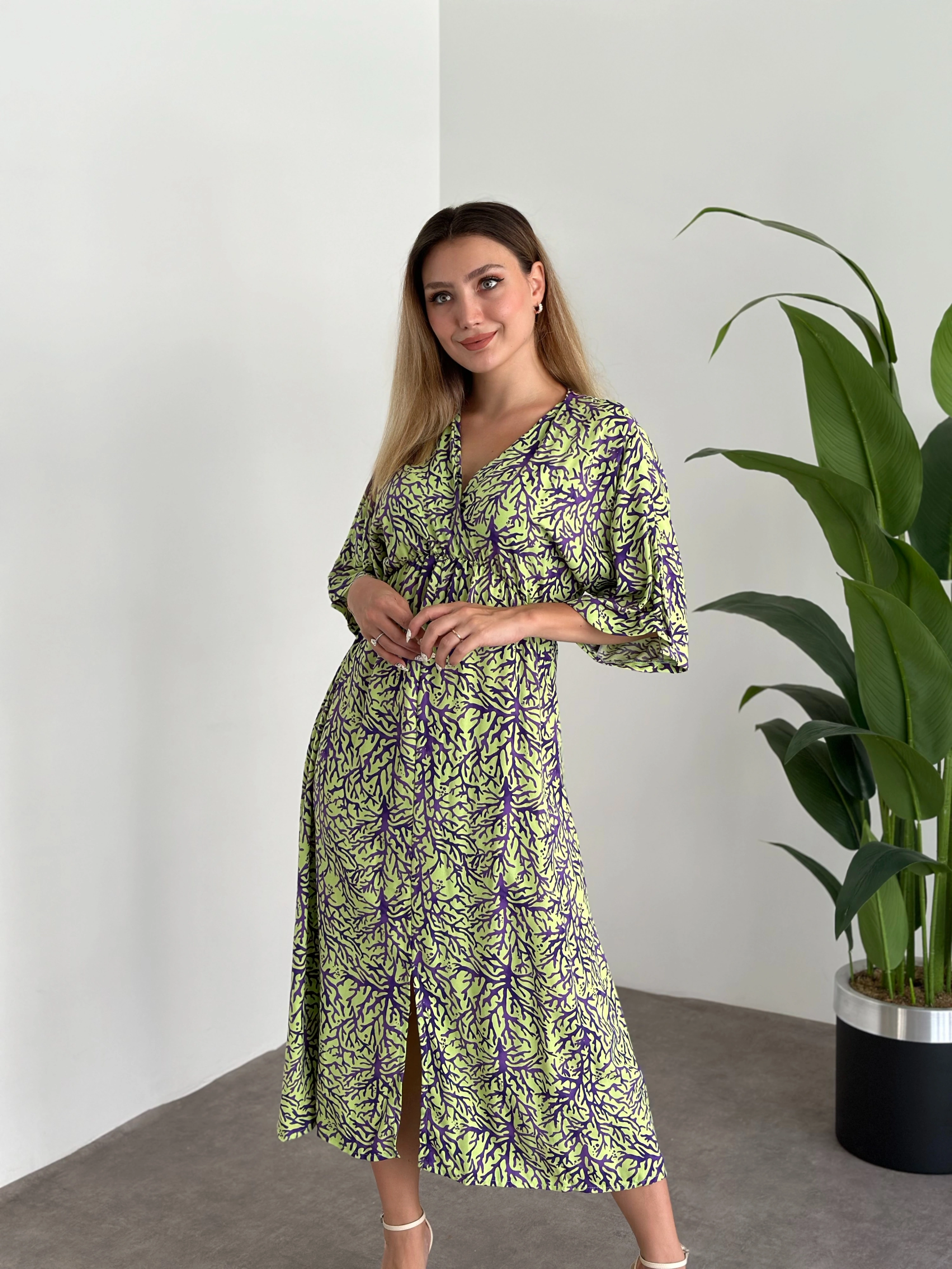 Kruvaze Yaka Yarasa Kol Yırtmaçlı Lastikli Elbise Yeşil Mor