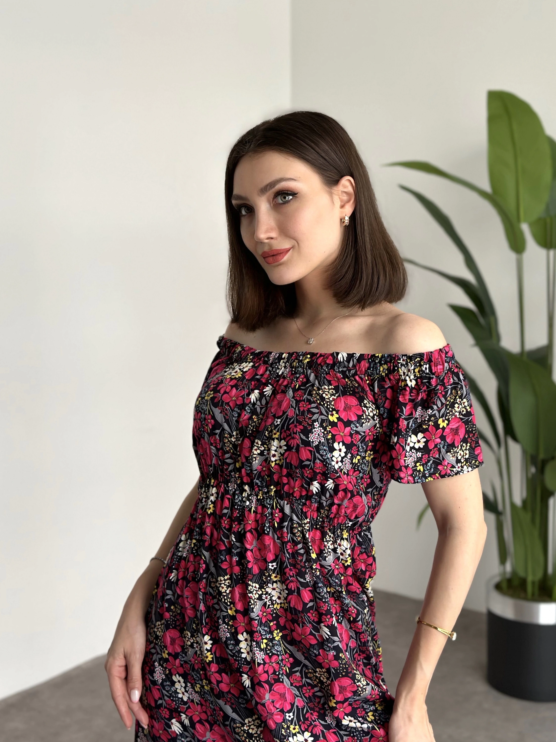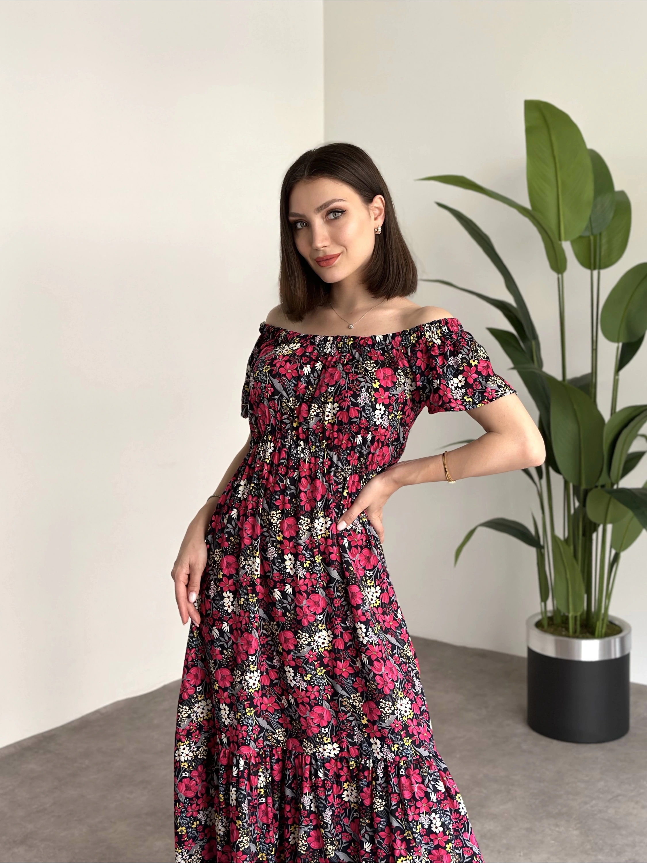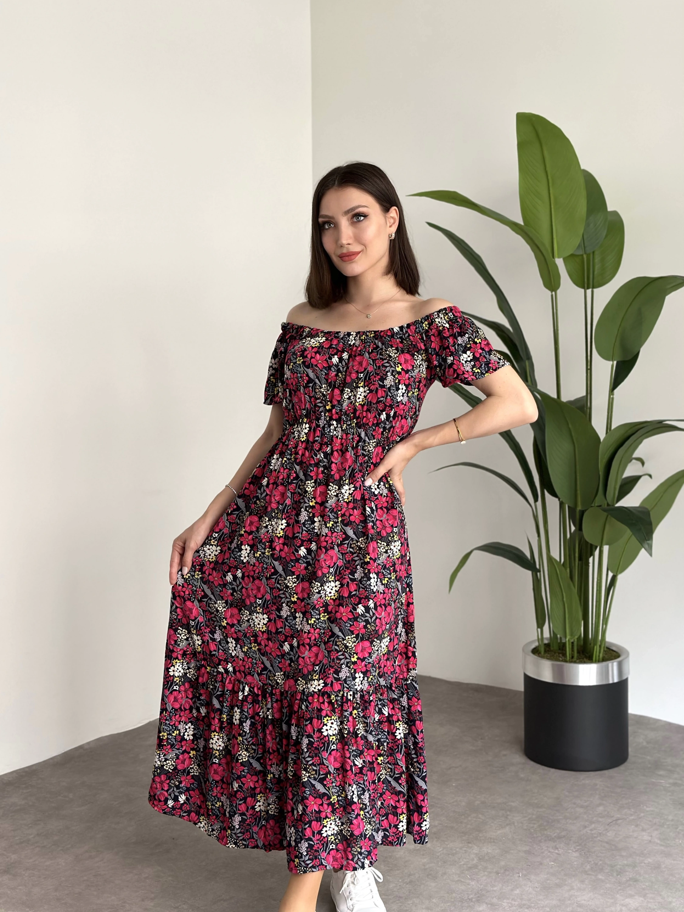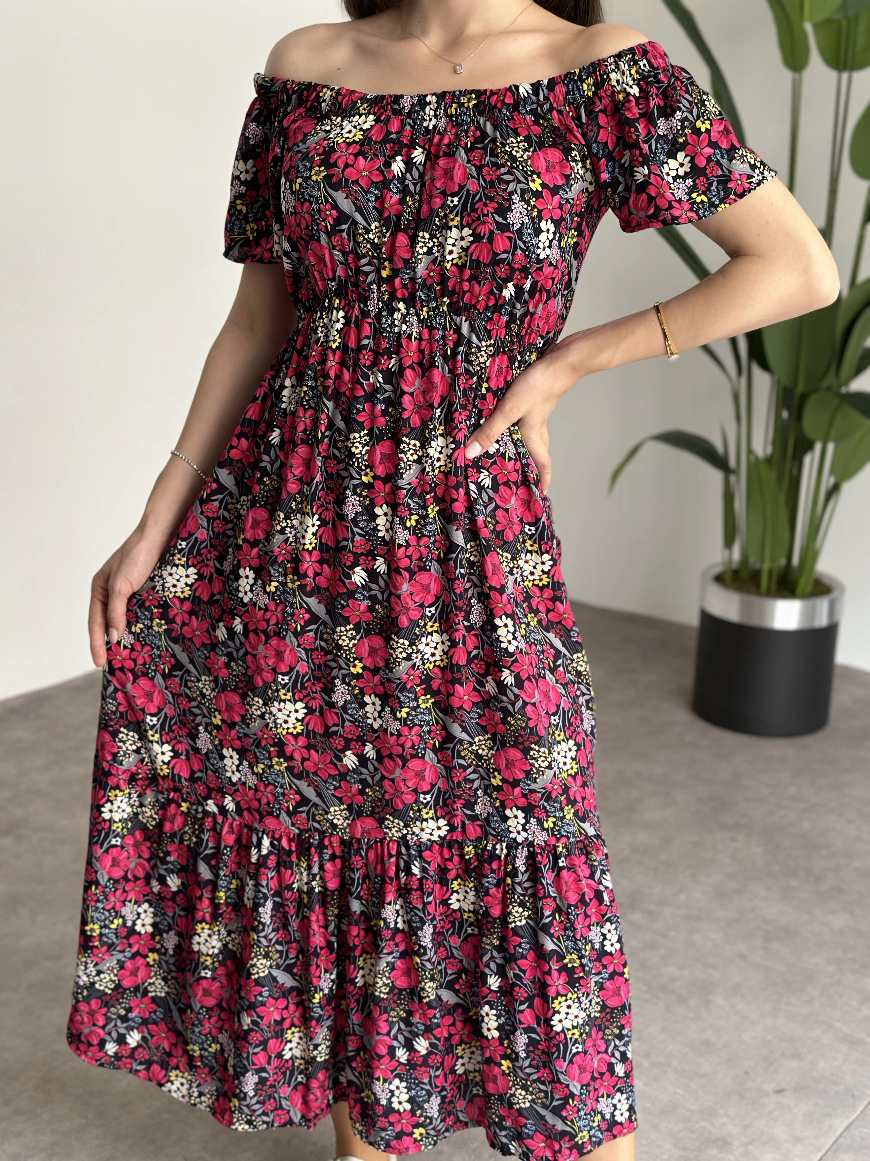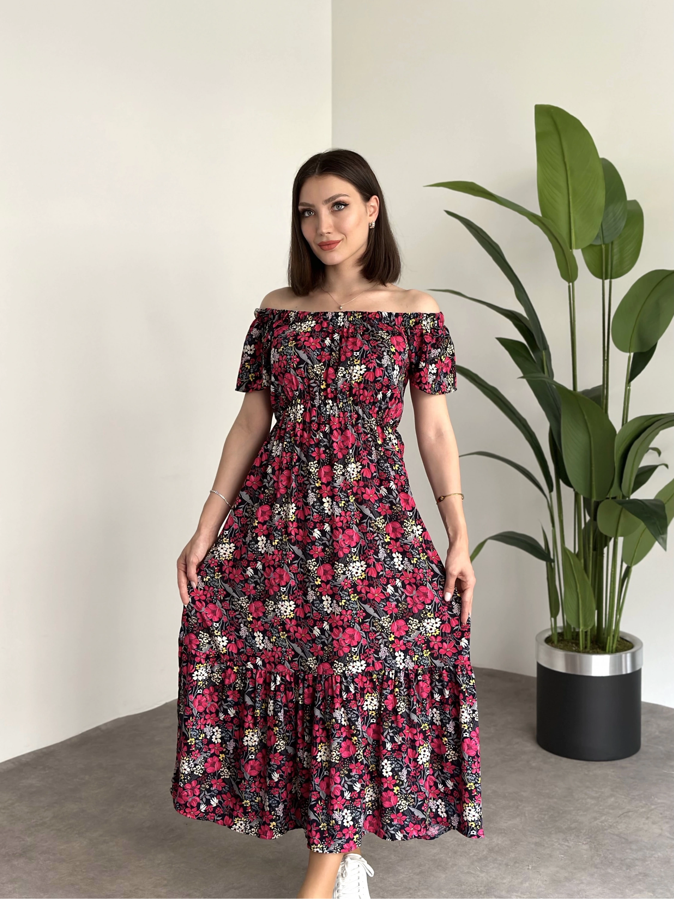 Madonna yaka viskon elbise Siyah Pembe Çiçekli