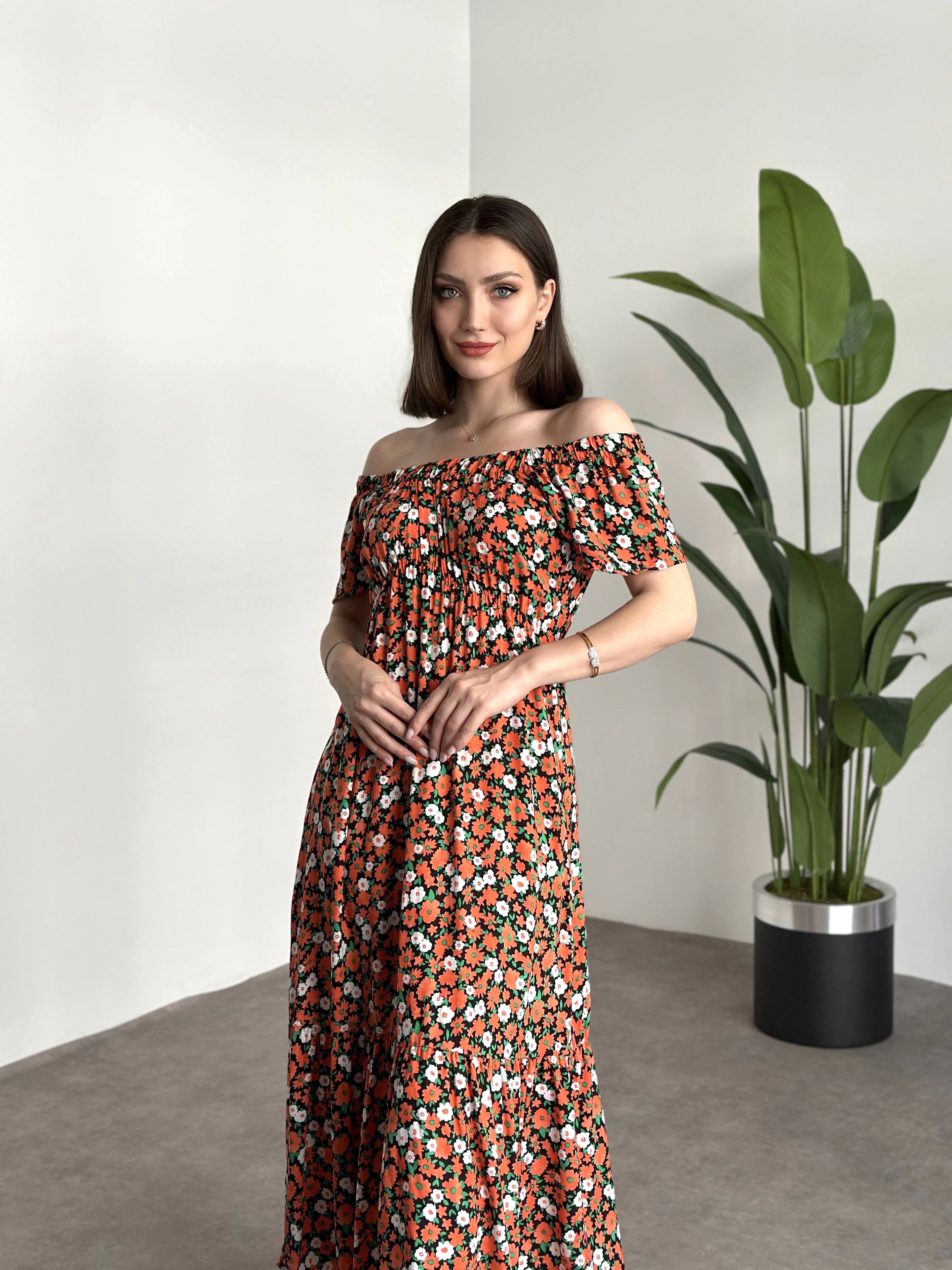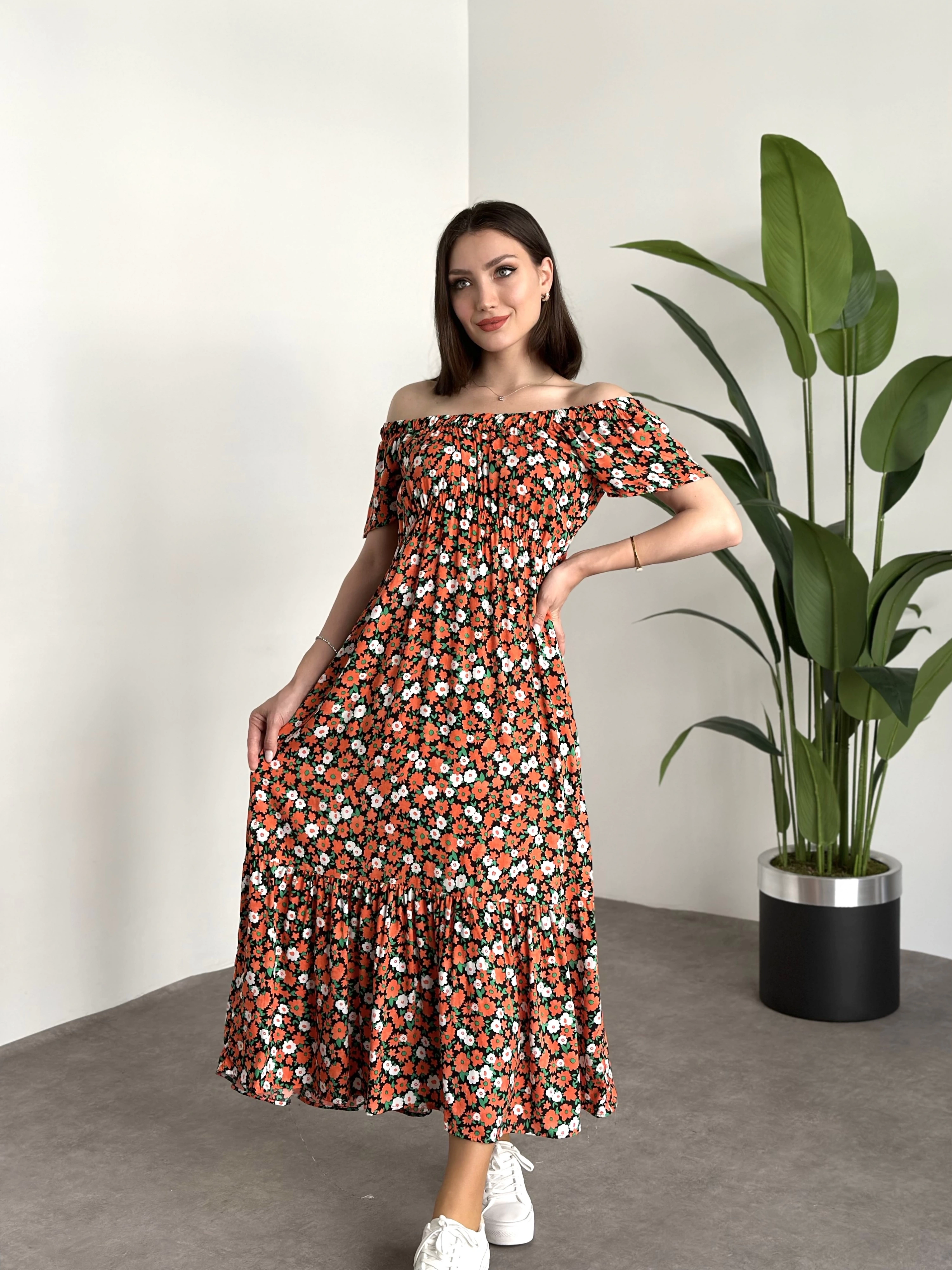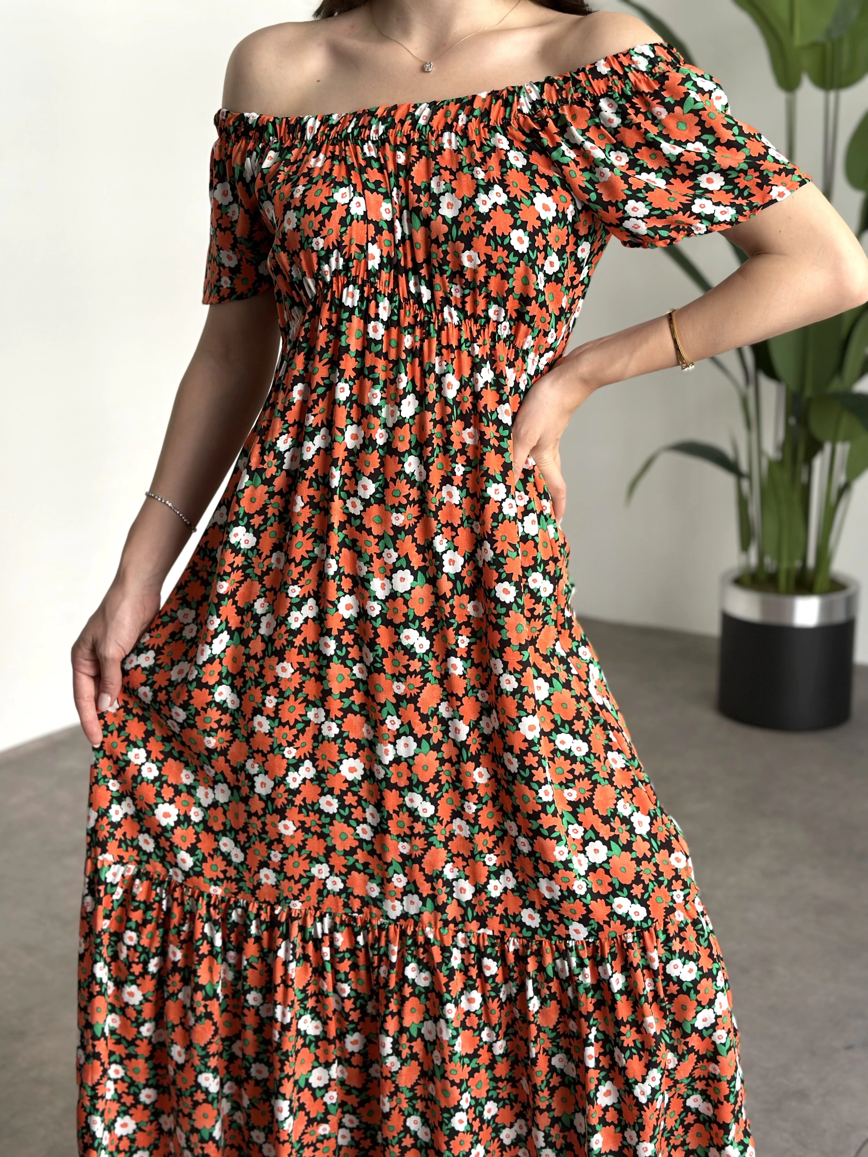 Madonna yaka viskon elbise Turuncu Beyaz Çiçekli