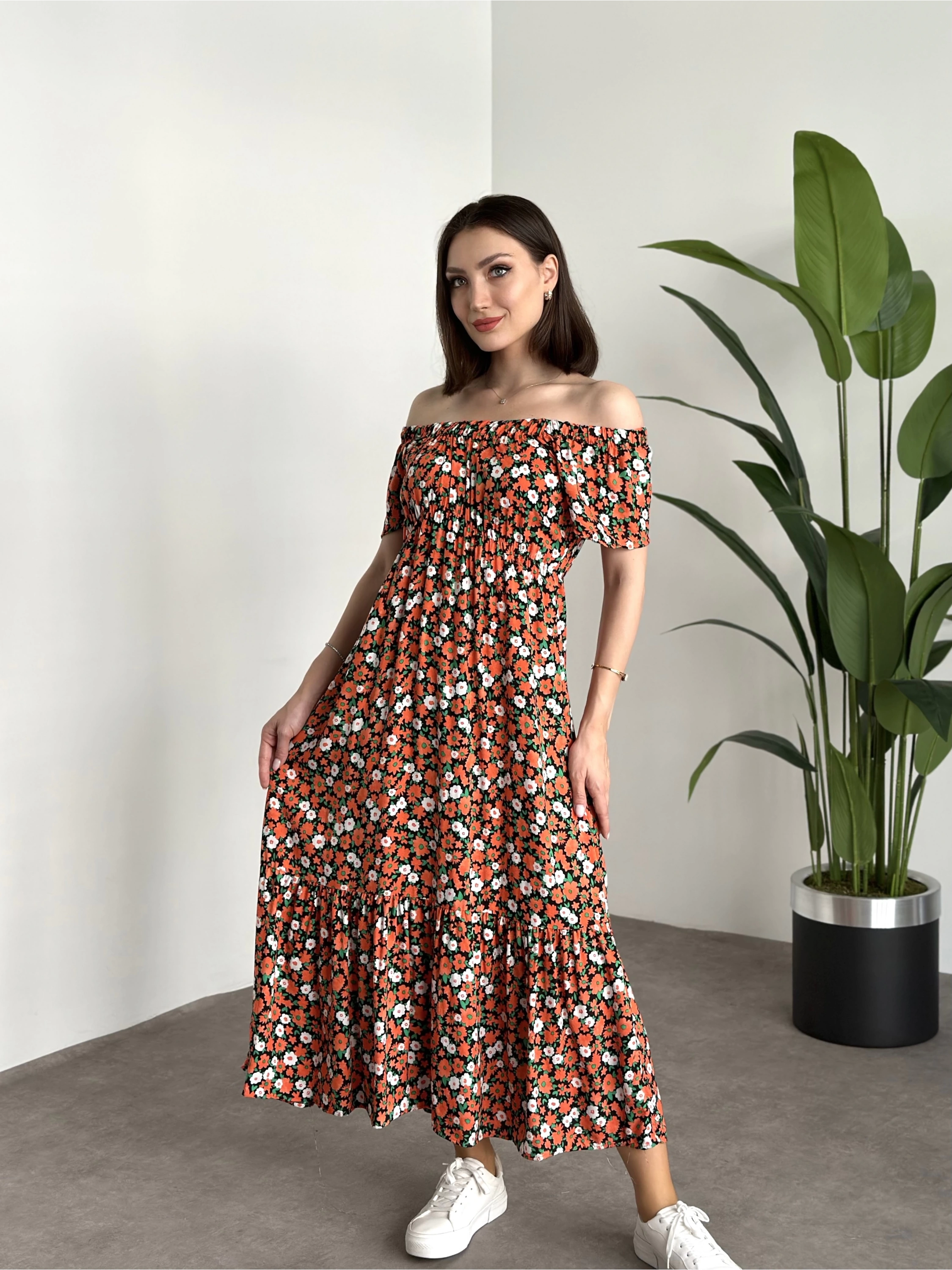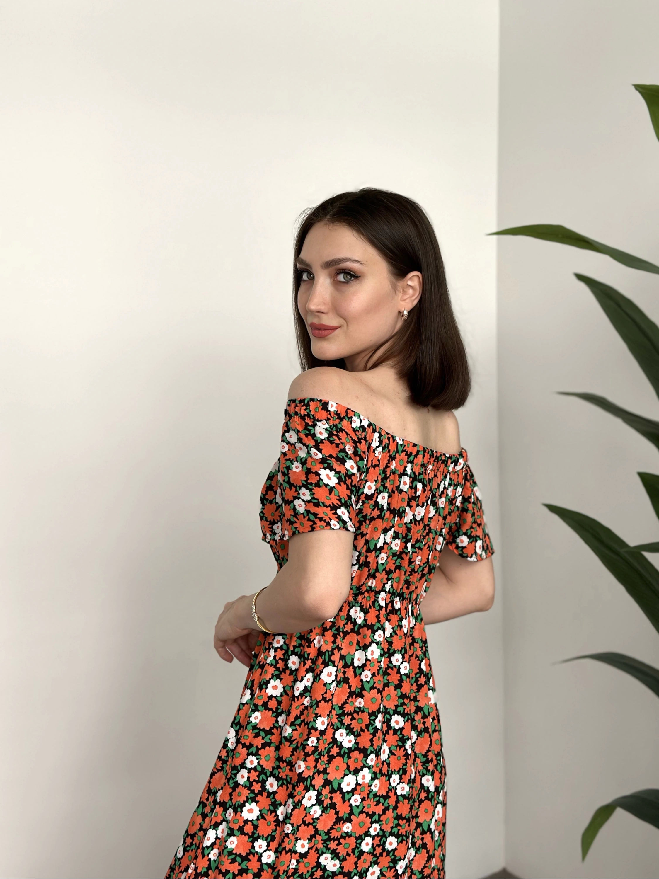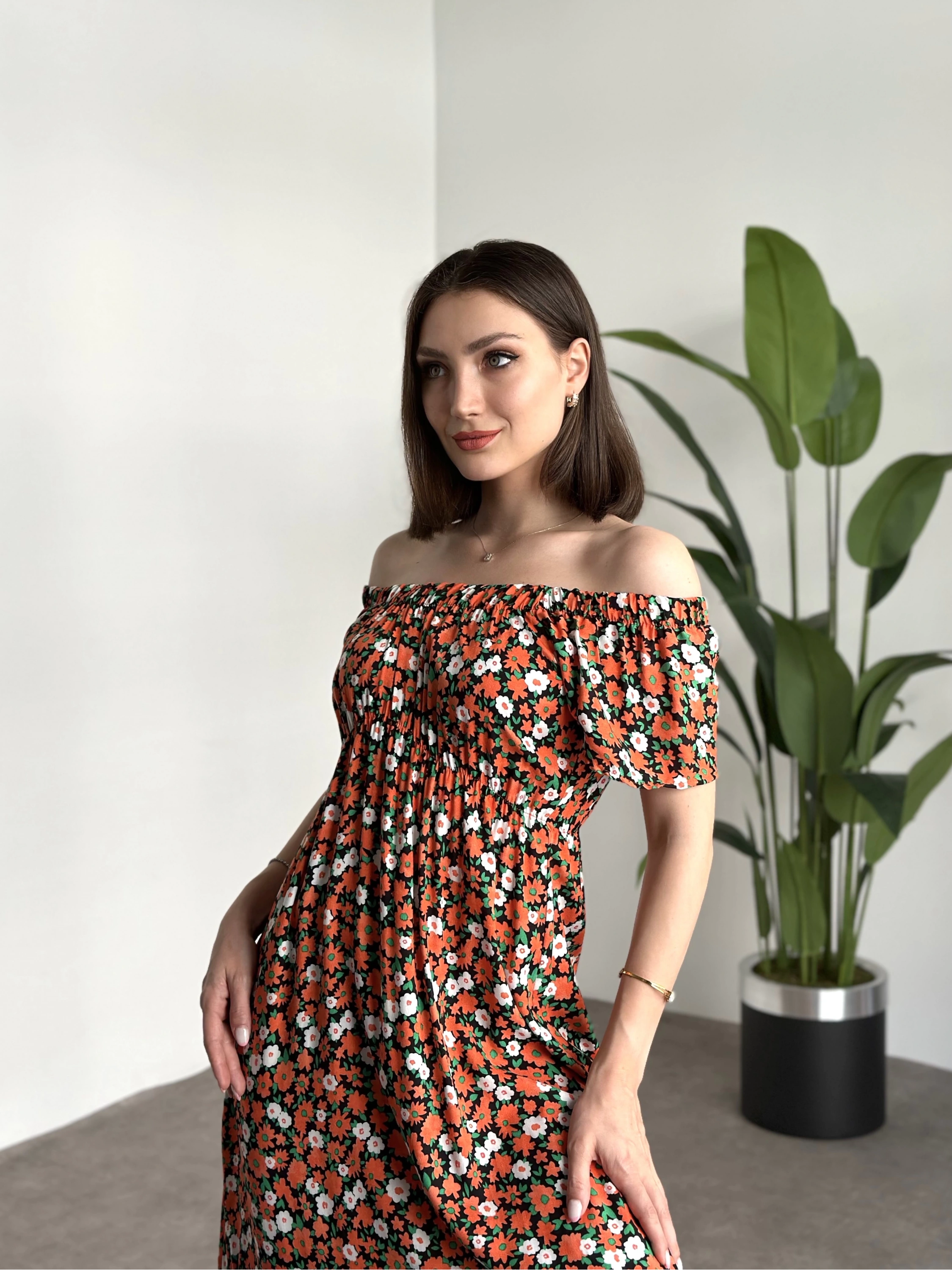 Madonna yaka viskon elbise Turuncu Beyaz Çiçekli