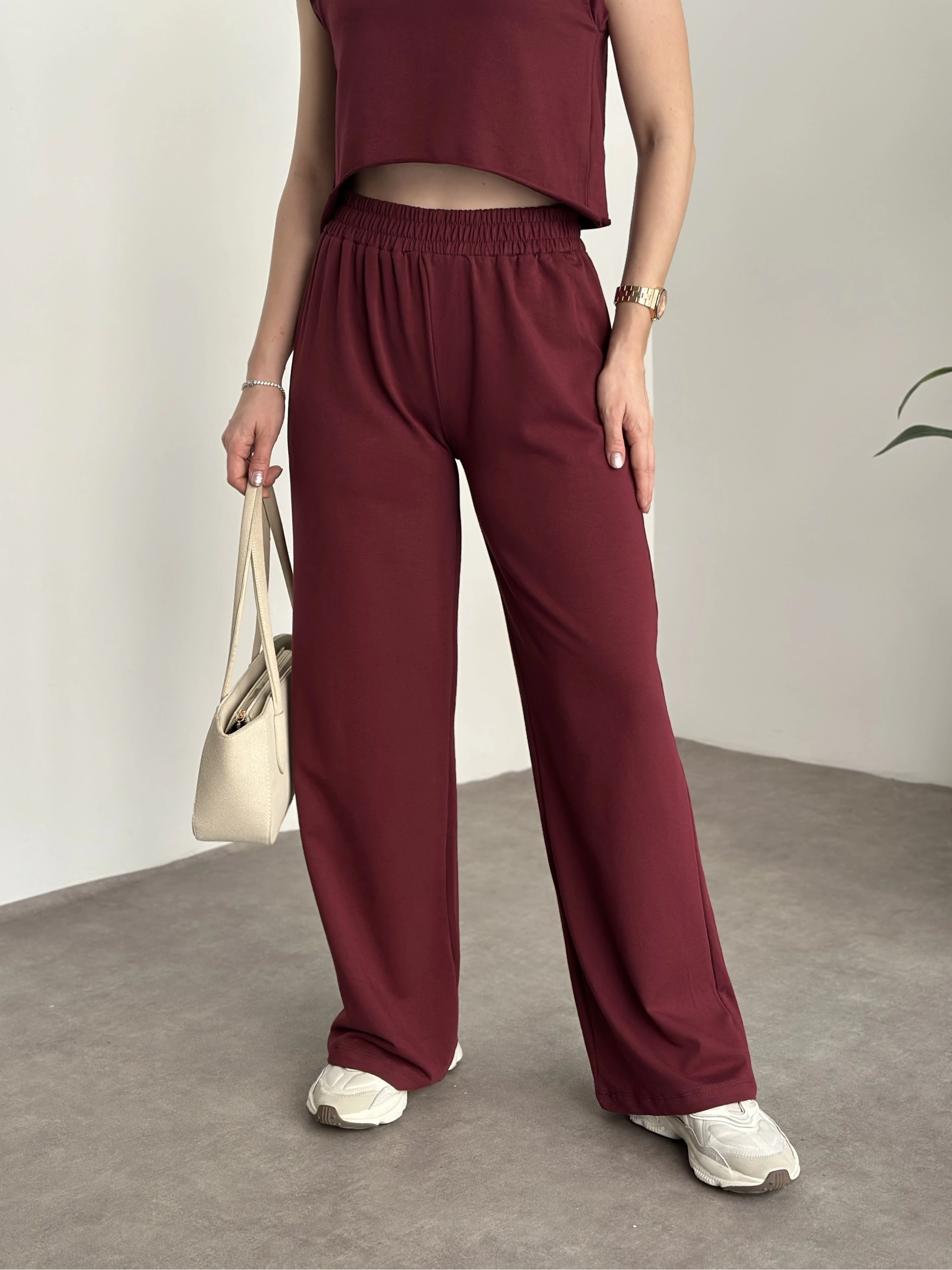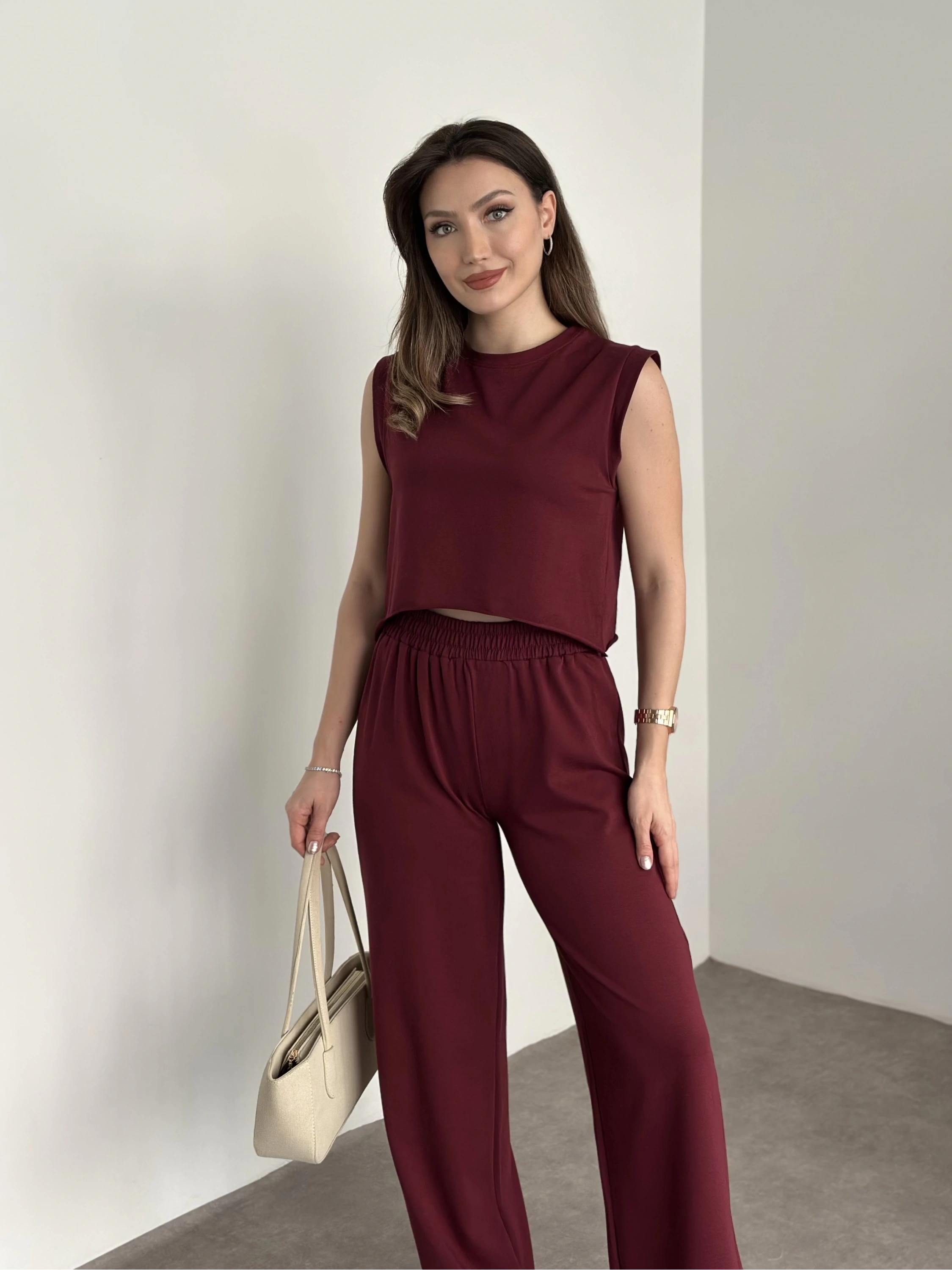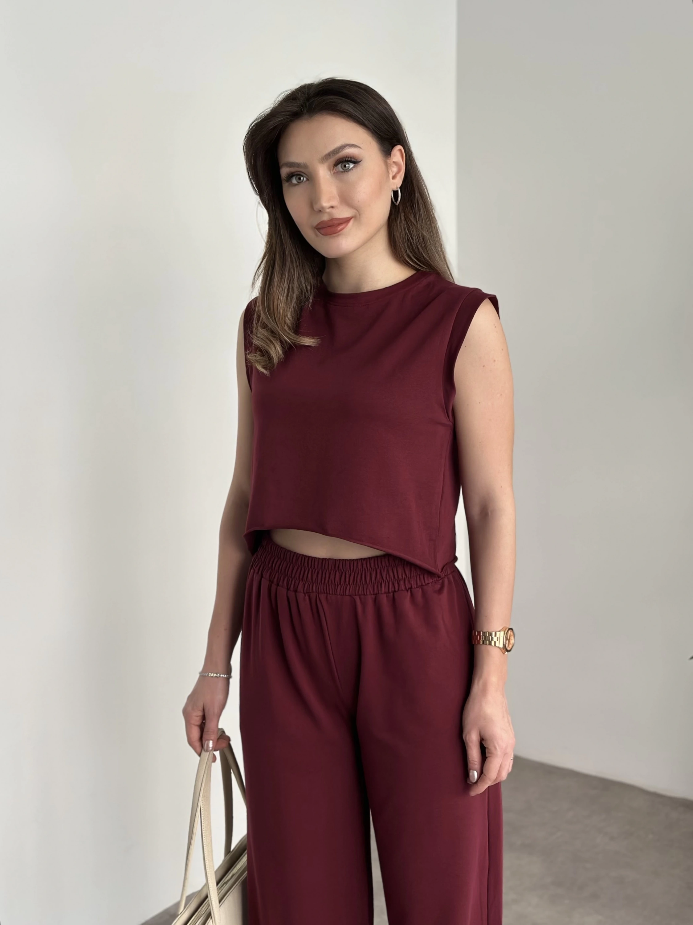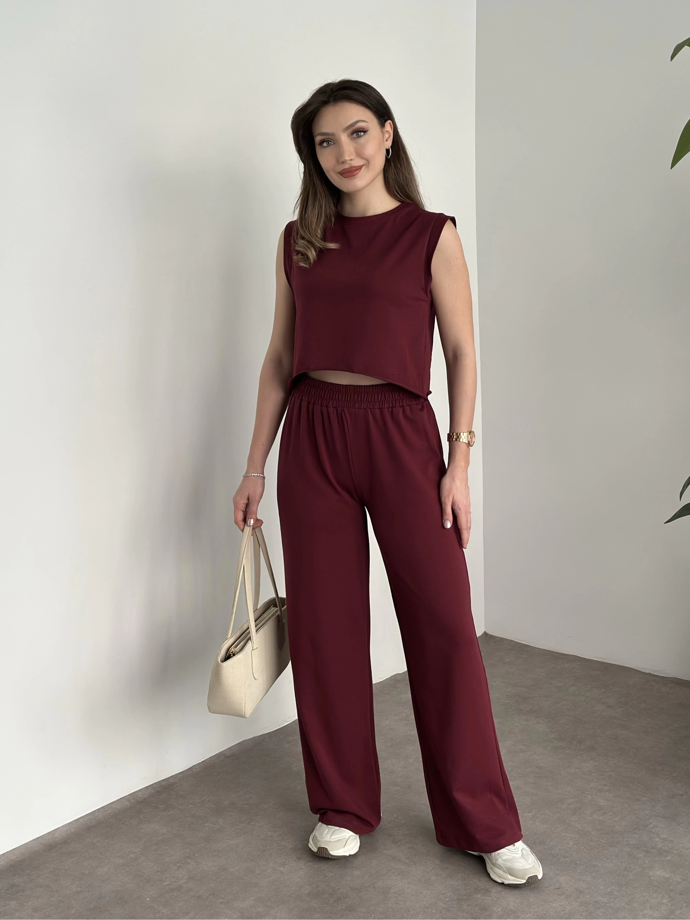 Marka etiketli sıfır kol eşofman takımı bordo