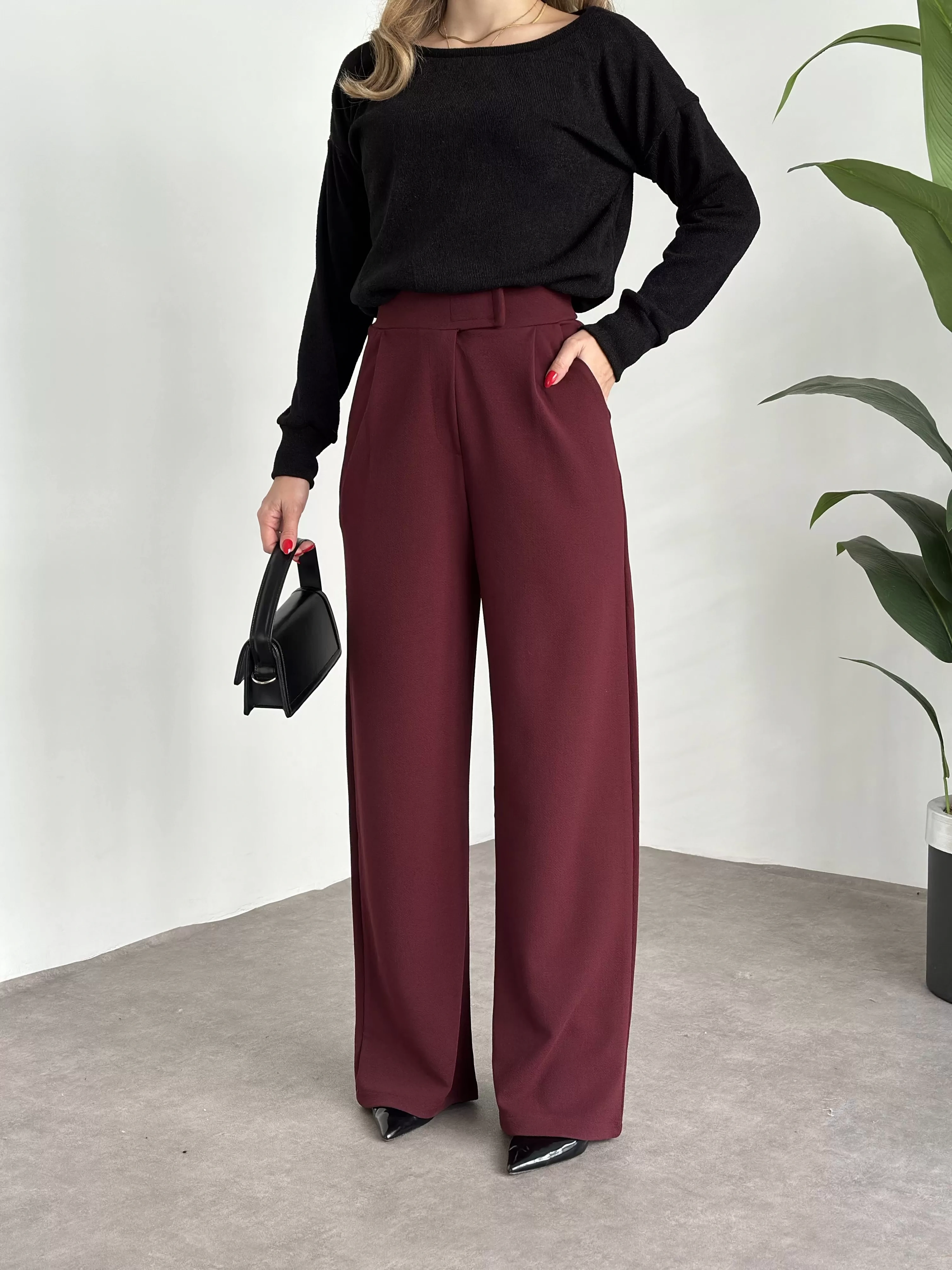 Meşhur Beli Cırt Cırtlı Bol Paça Pantolon bordo