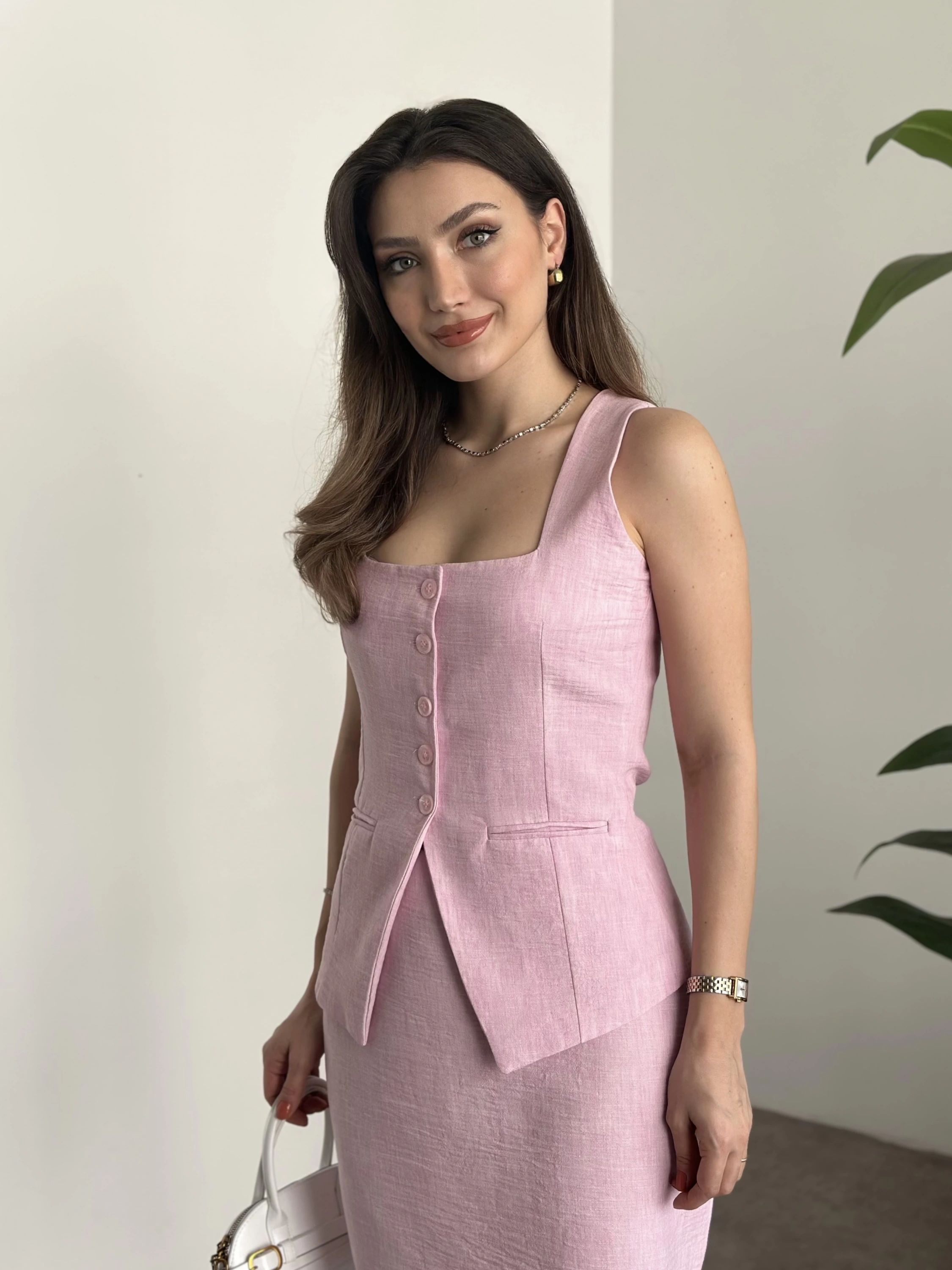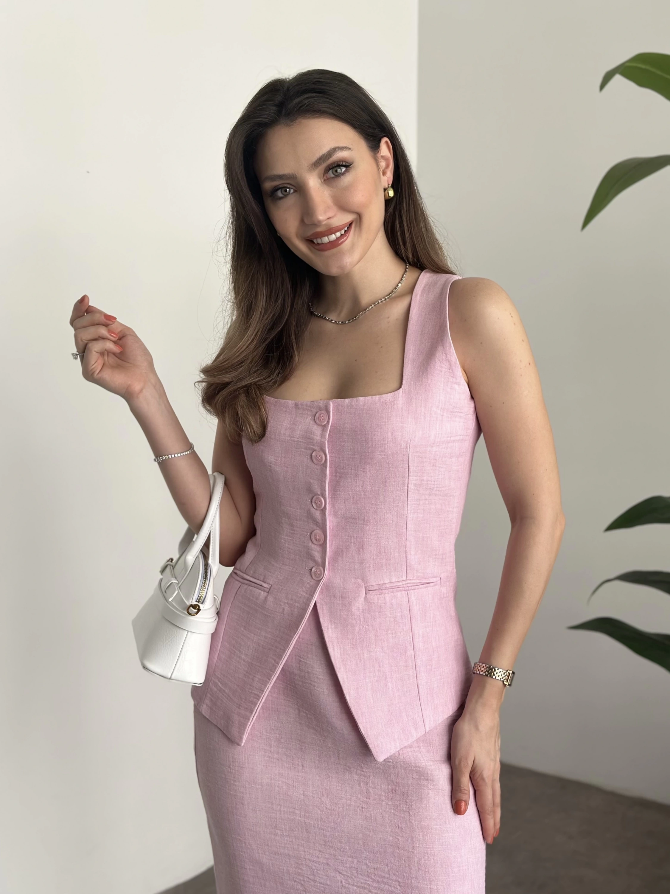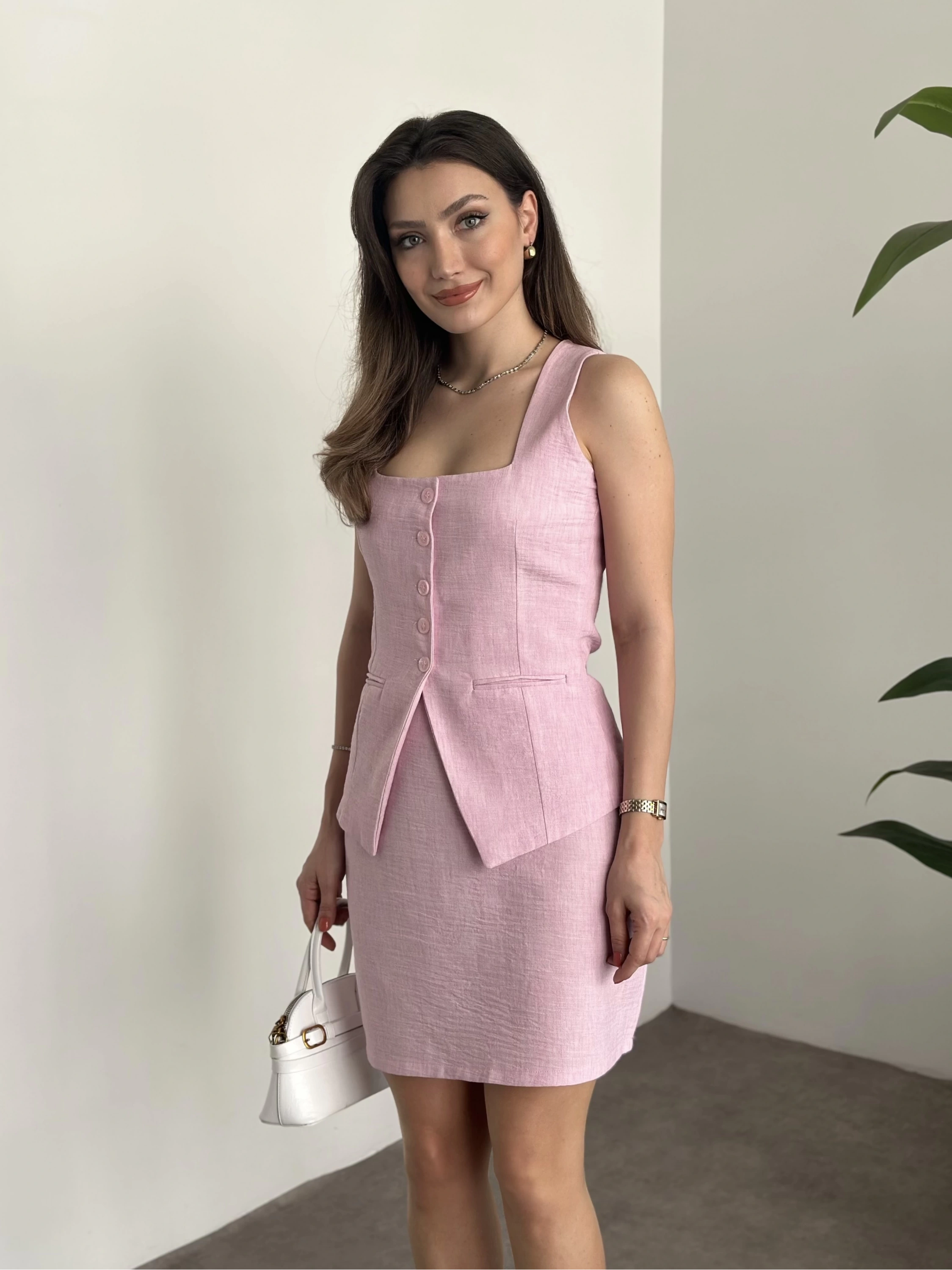 Mini etekli keten takım pembe