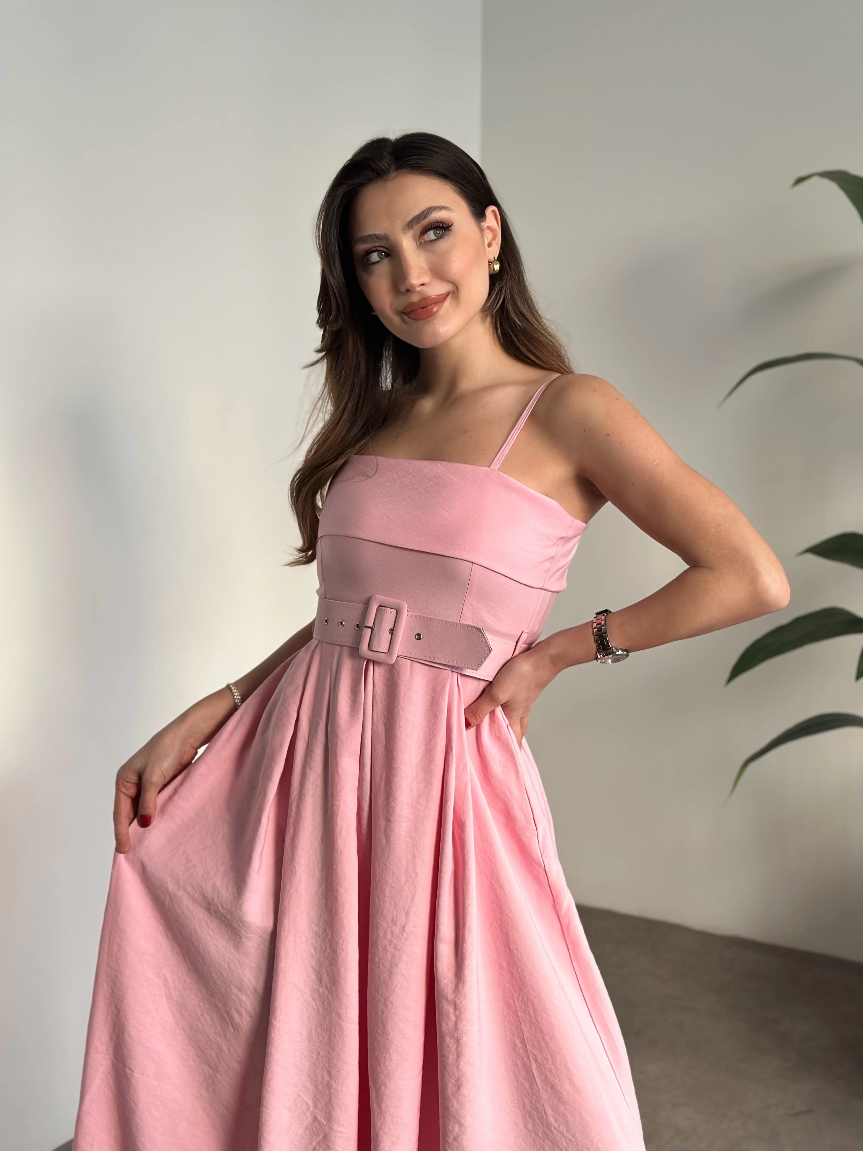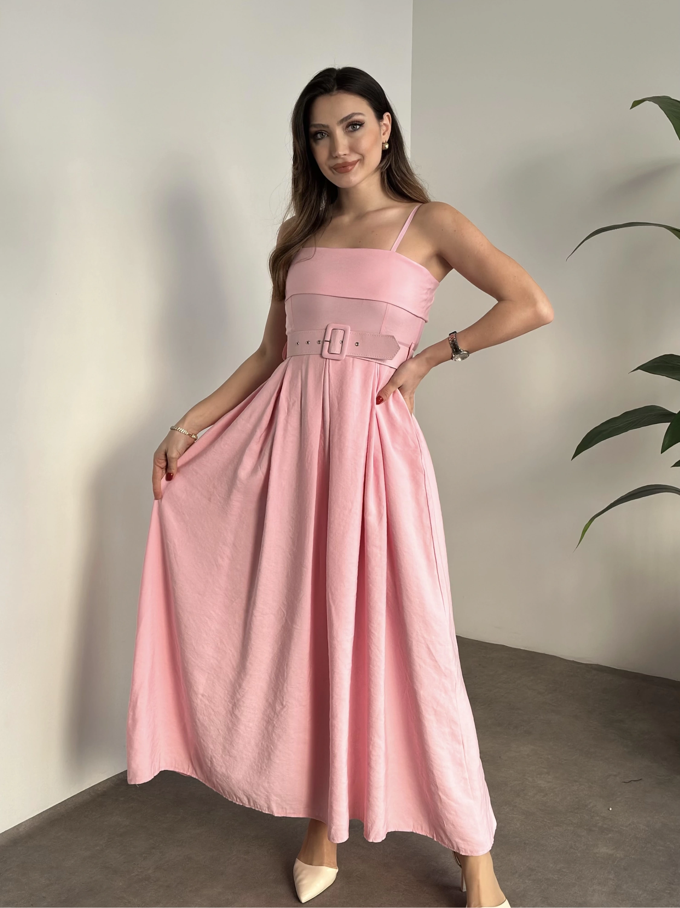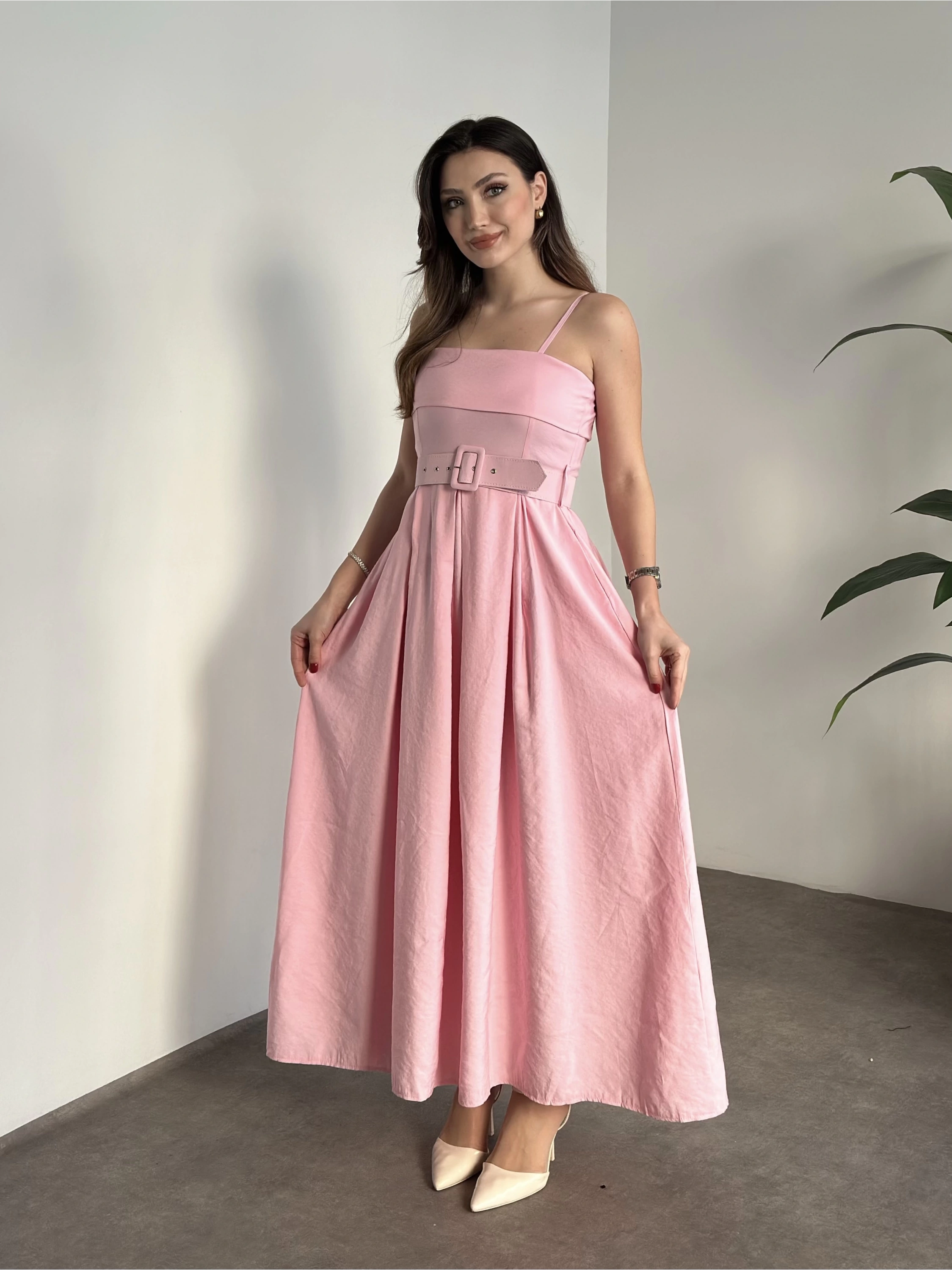Mng marka etiketli belden kemerli uzun elbise pembe