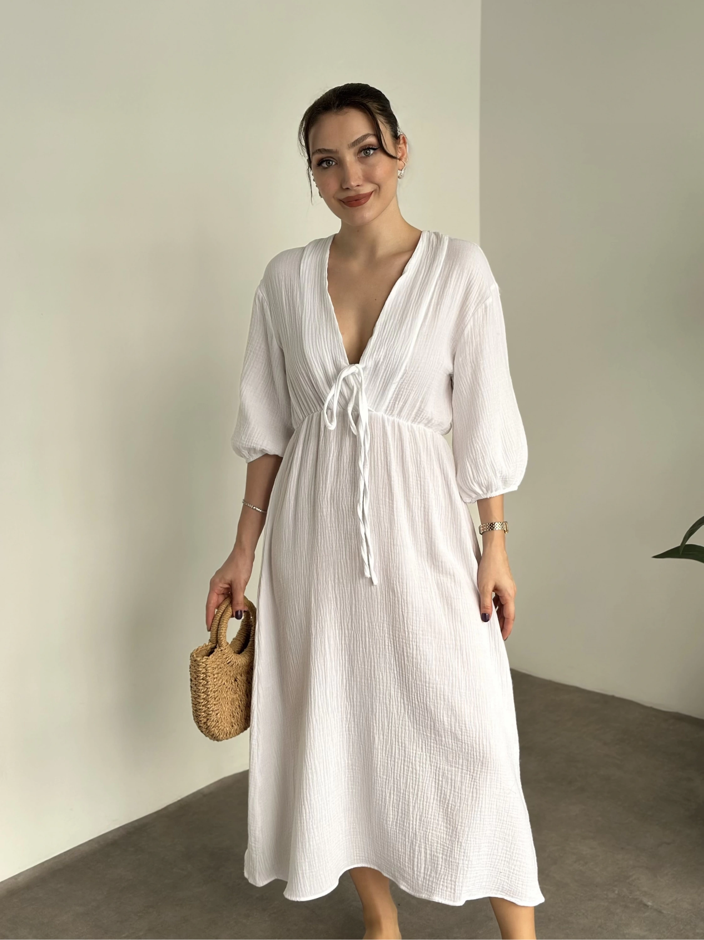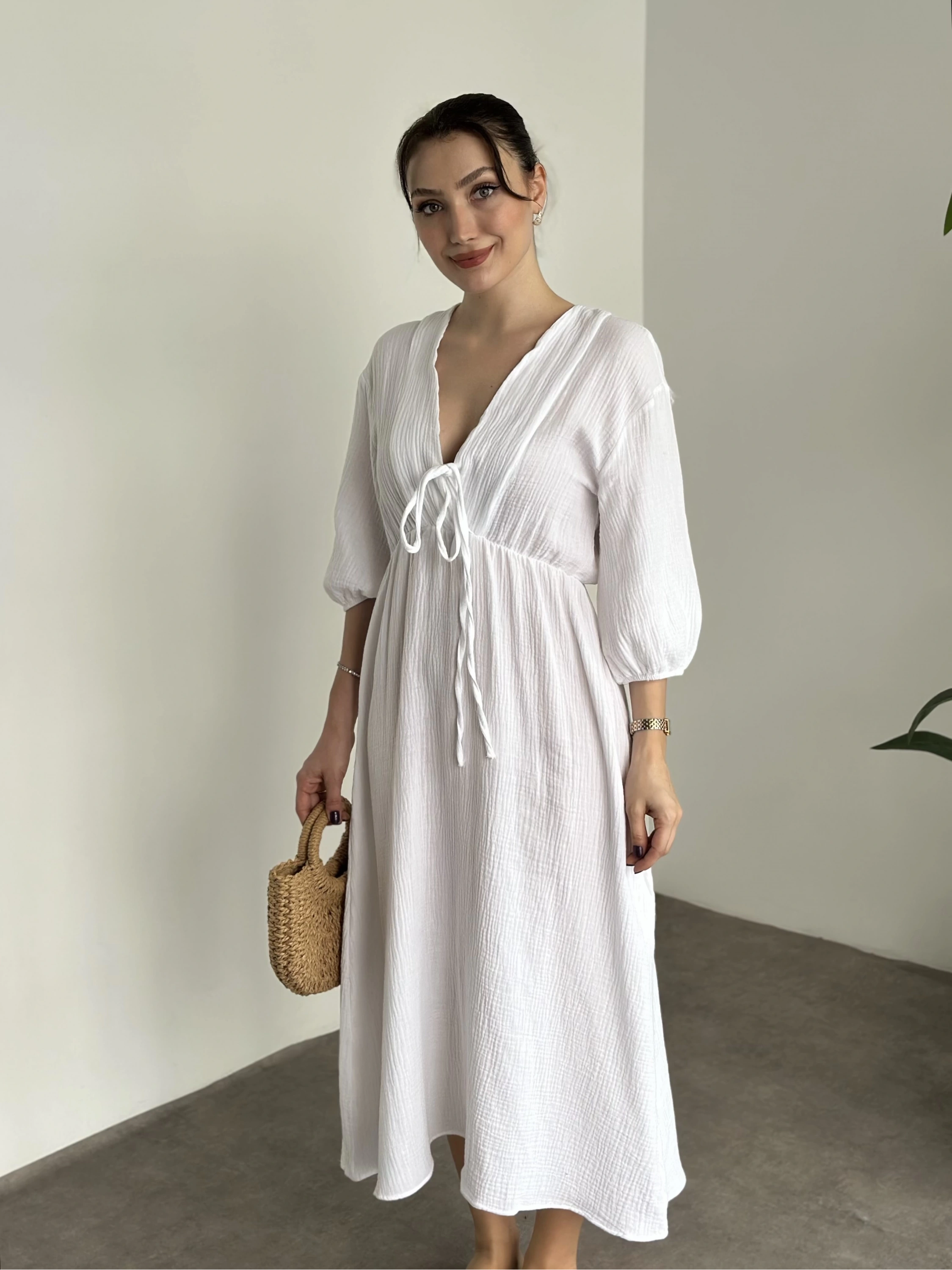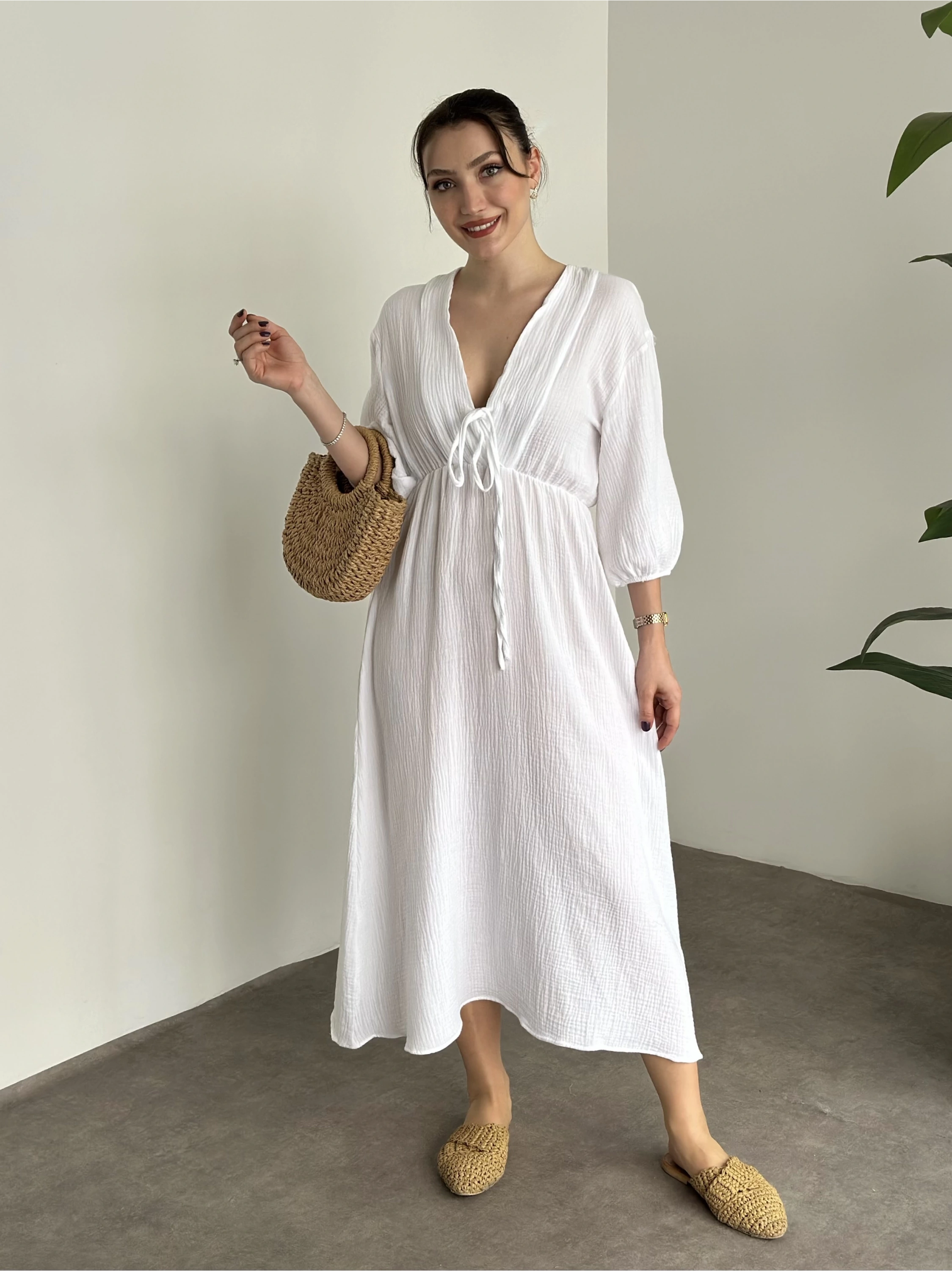 Müslim kumaş önden bağlamalı bol kesim elbise beyaz