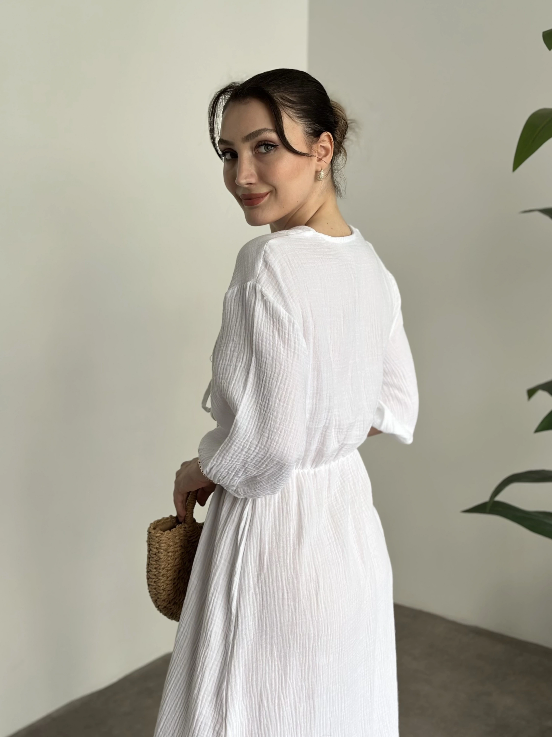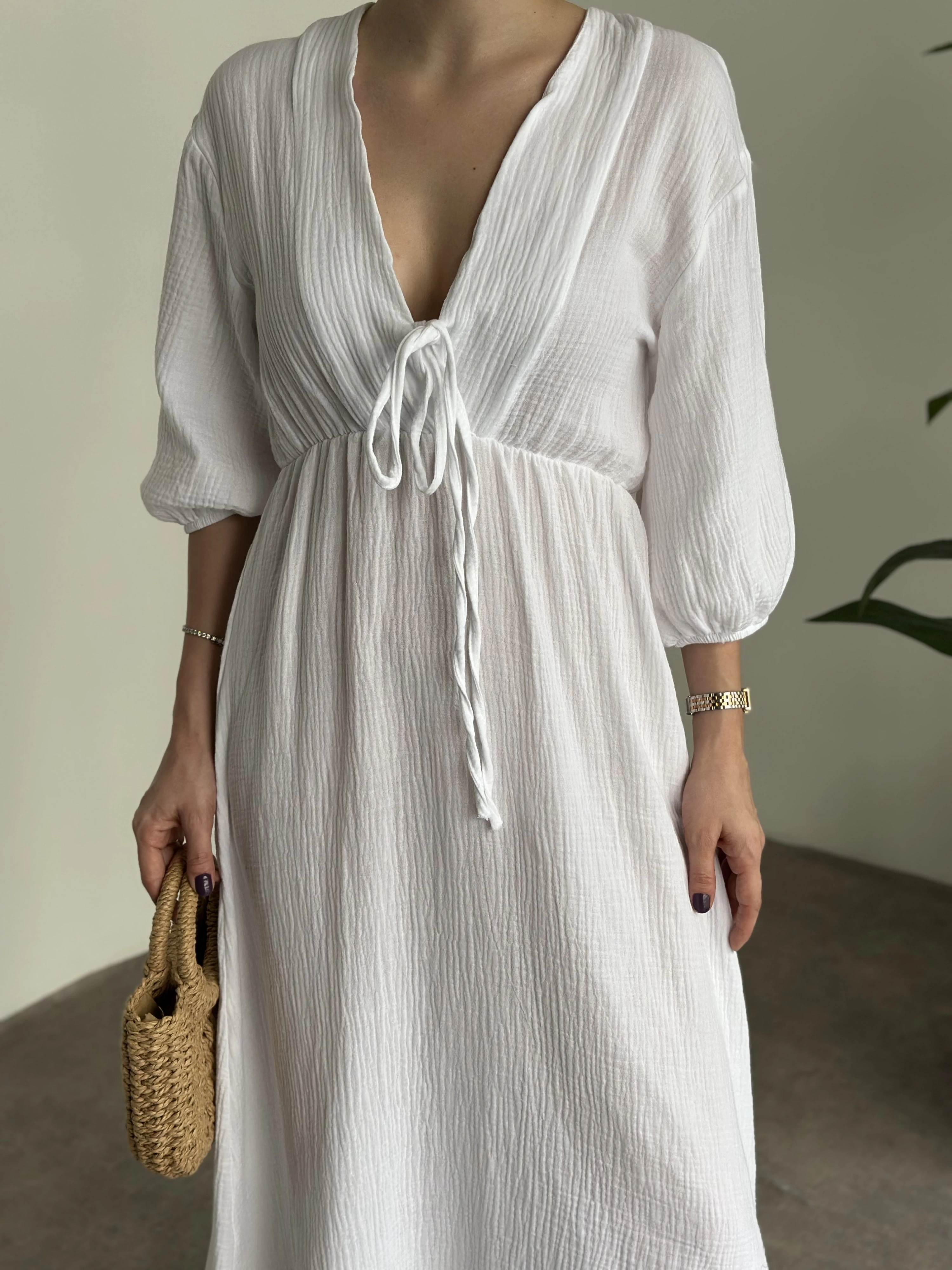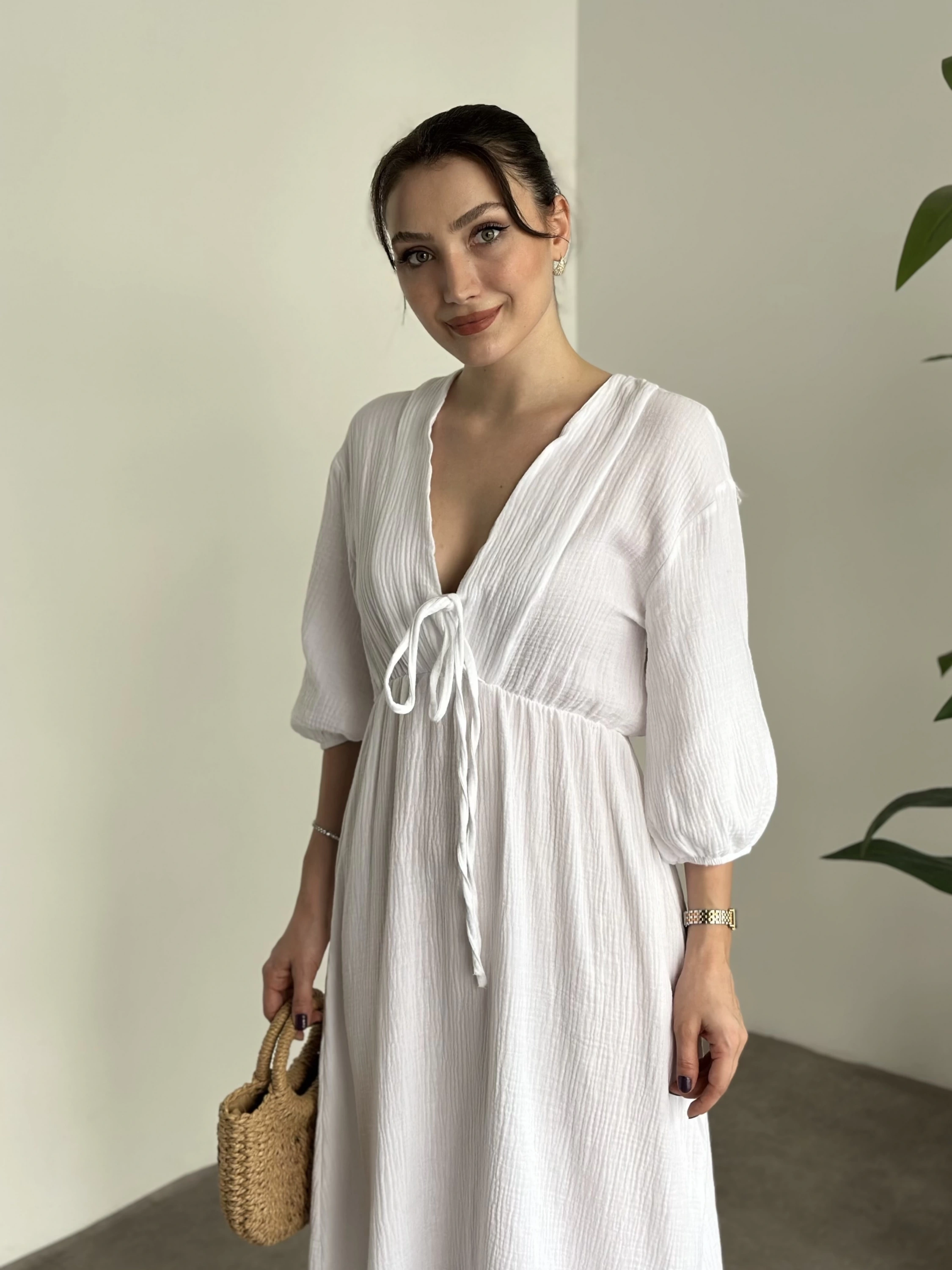 Müslim kumaş önden bağlamalı bol kesim elbise beyaz