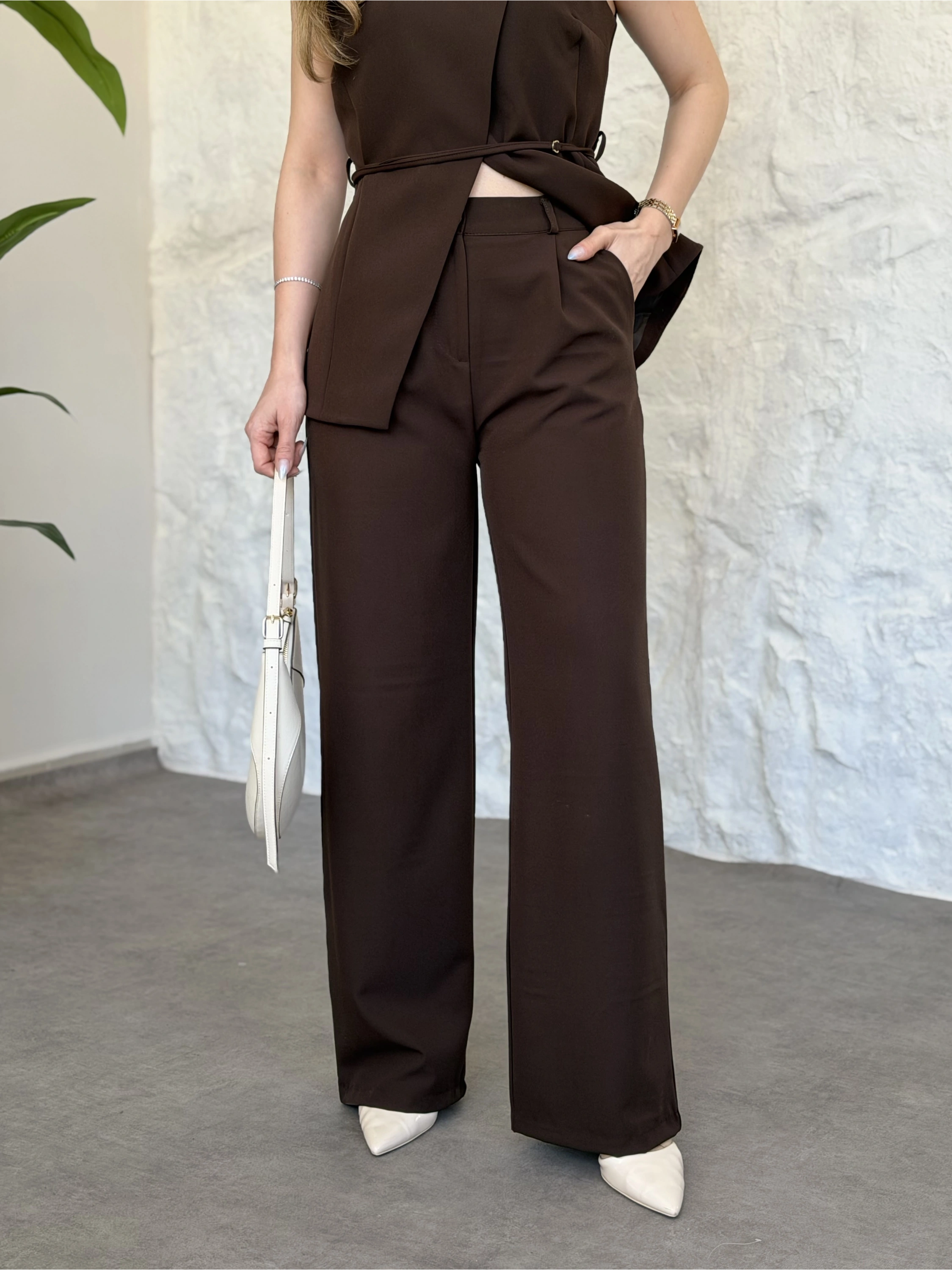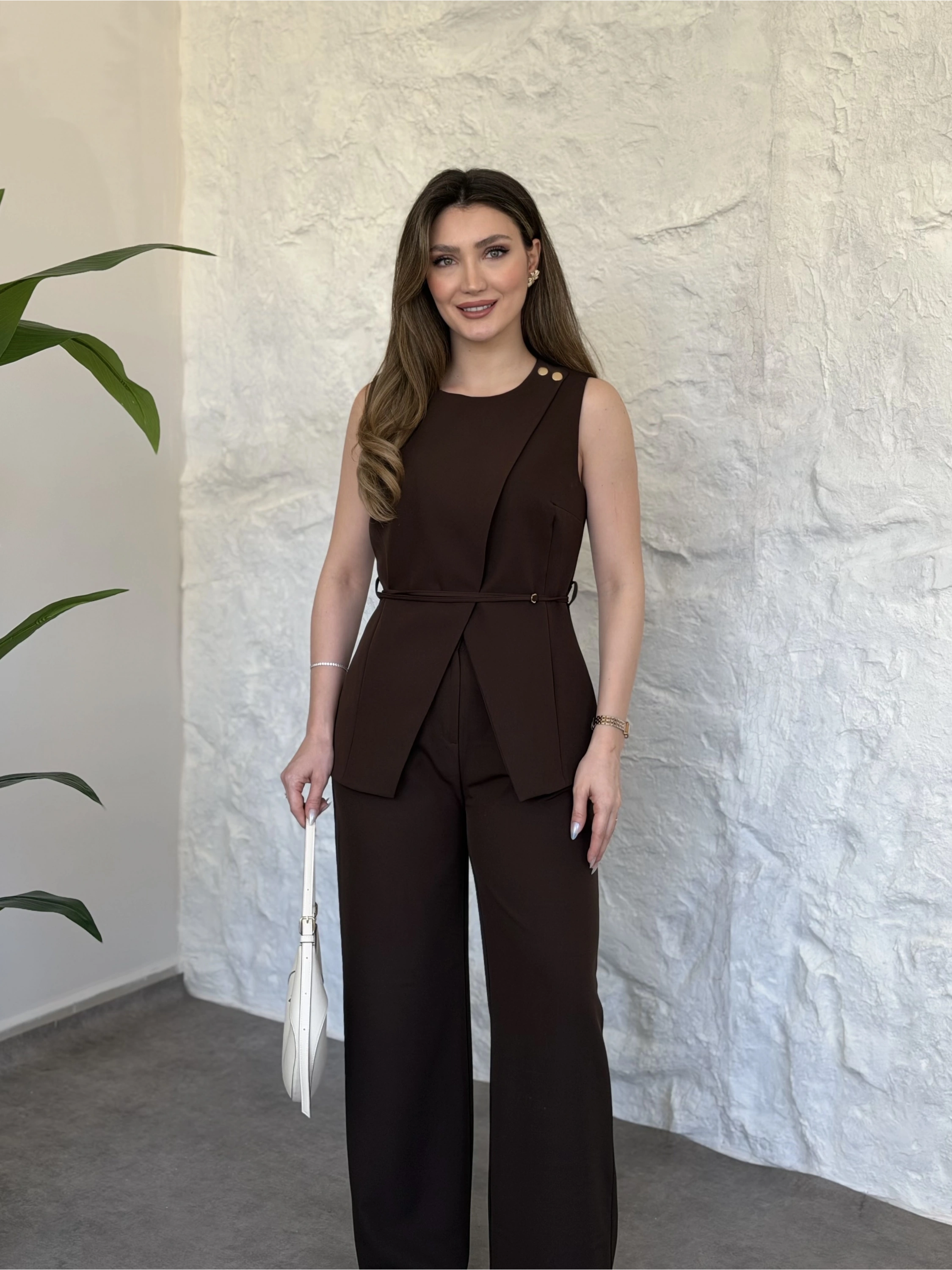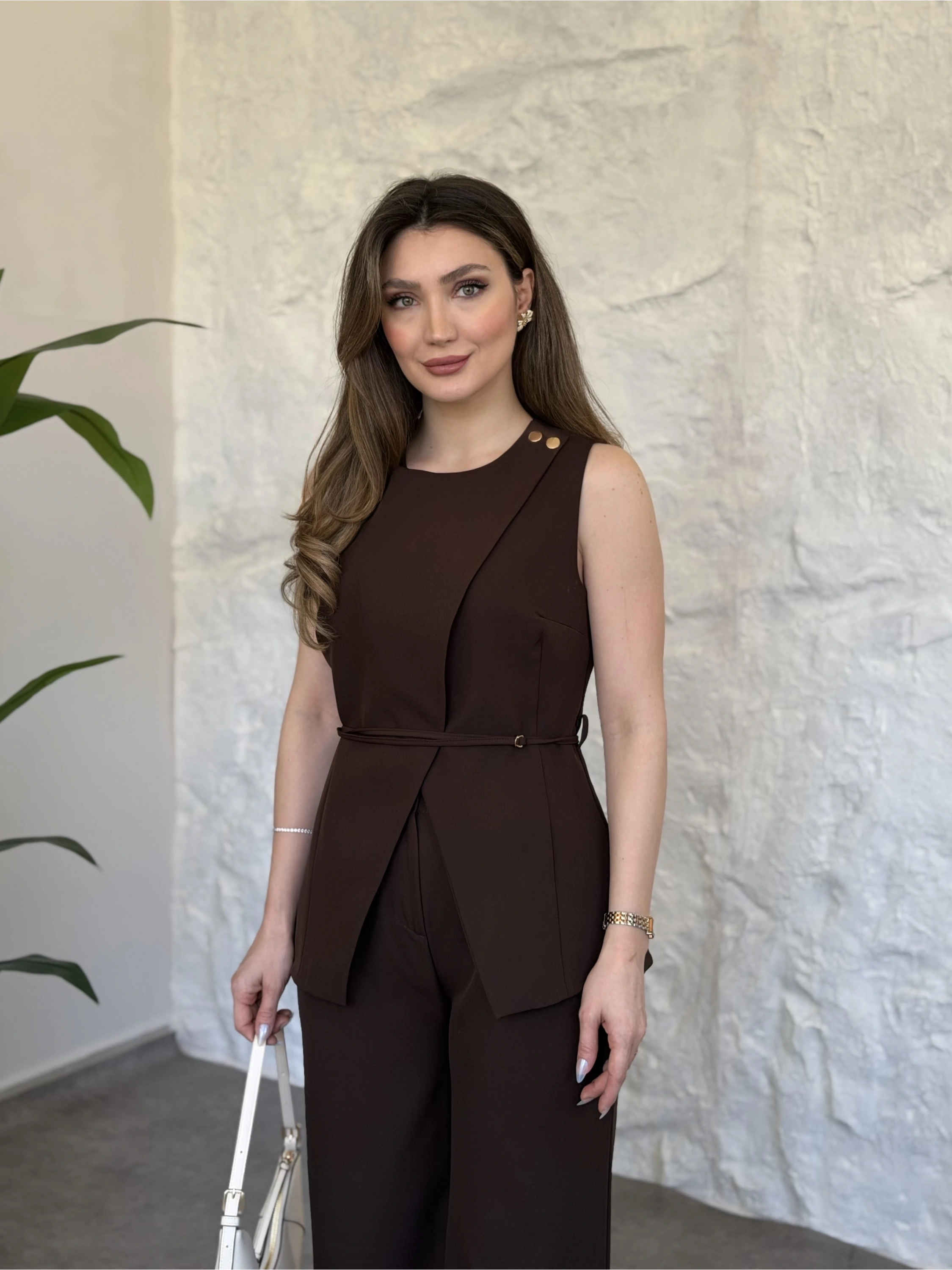 Sıfır kol belden bağlamalı kumaş takım siyah