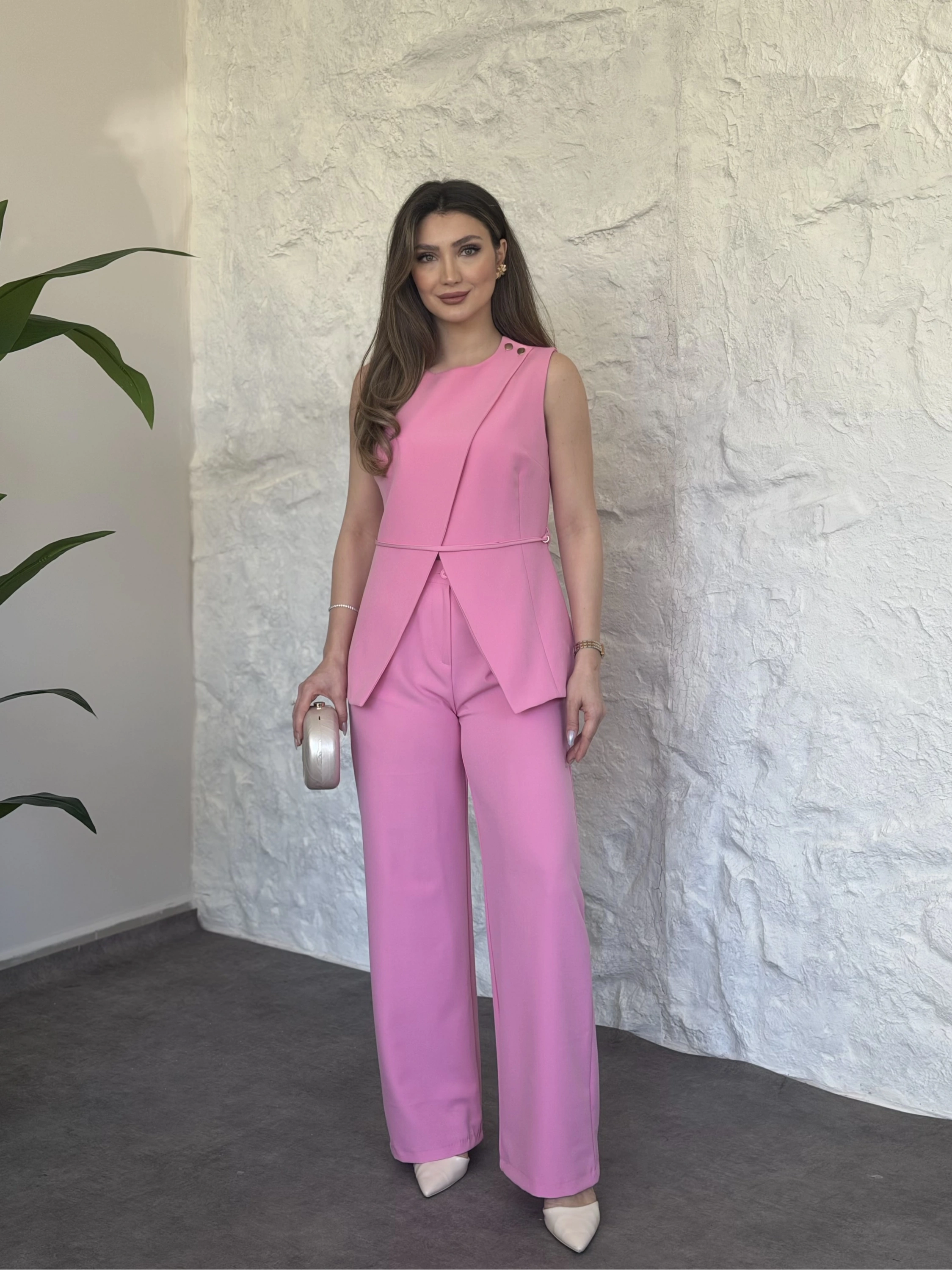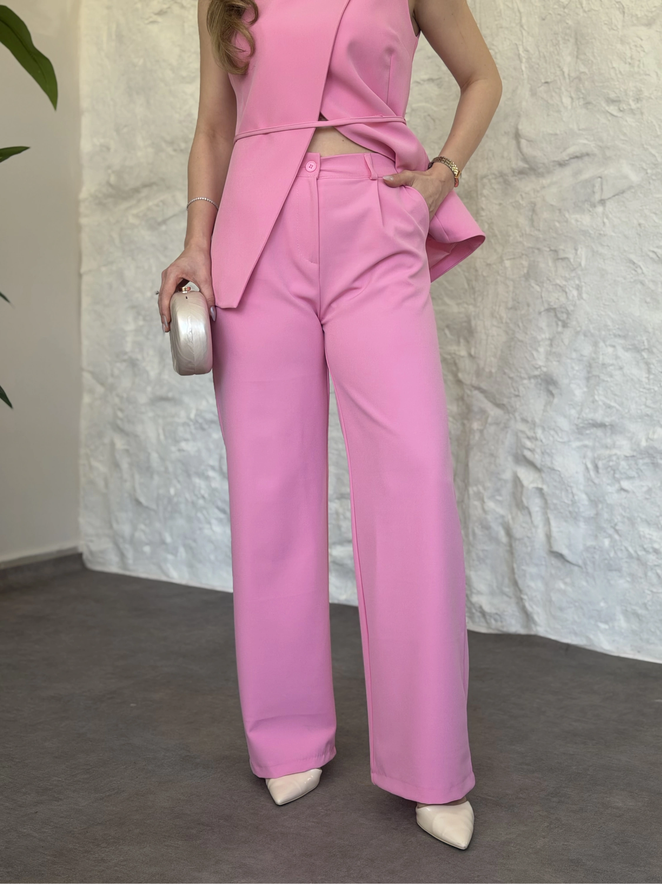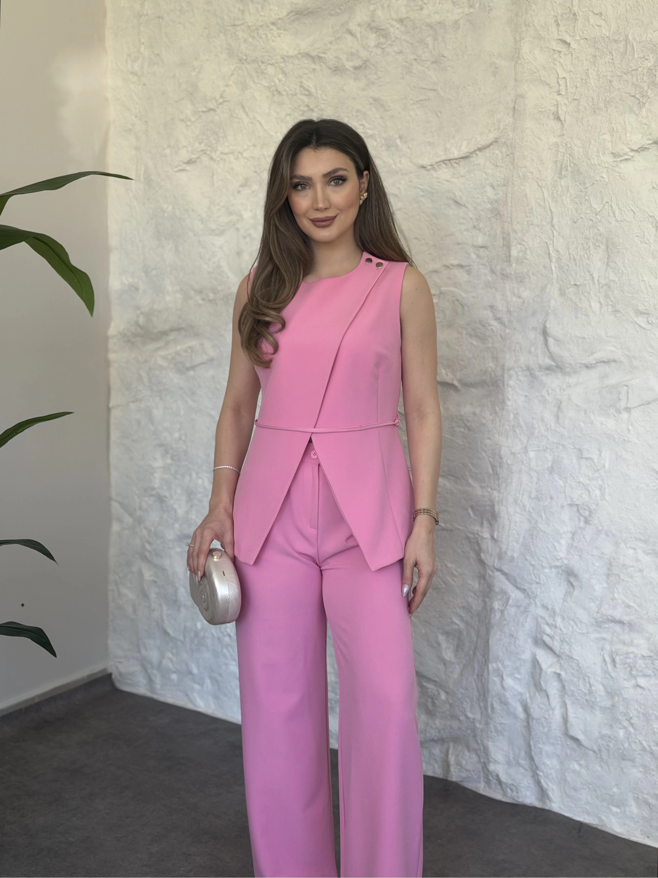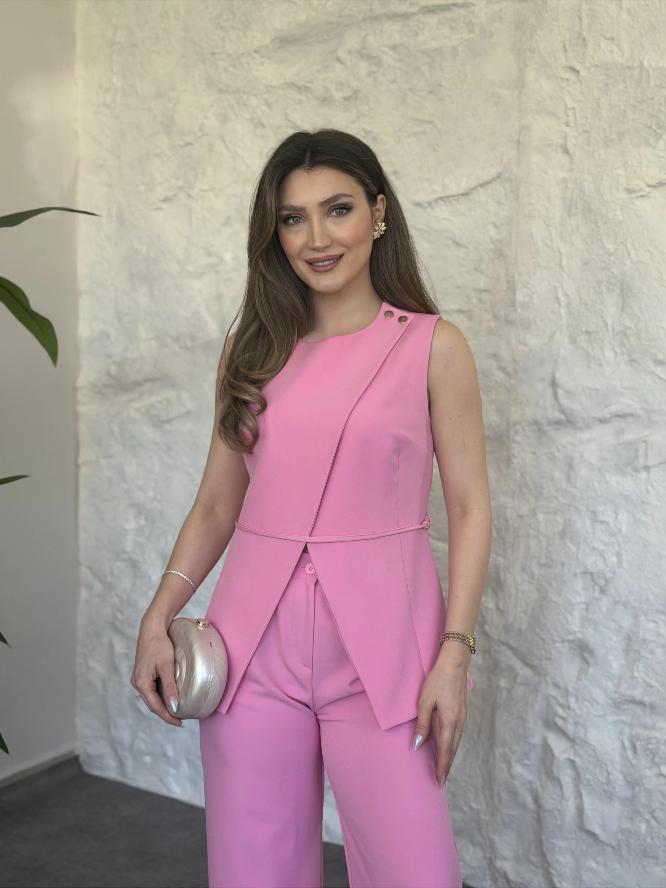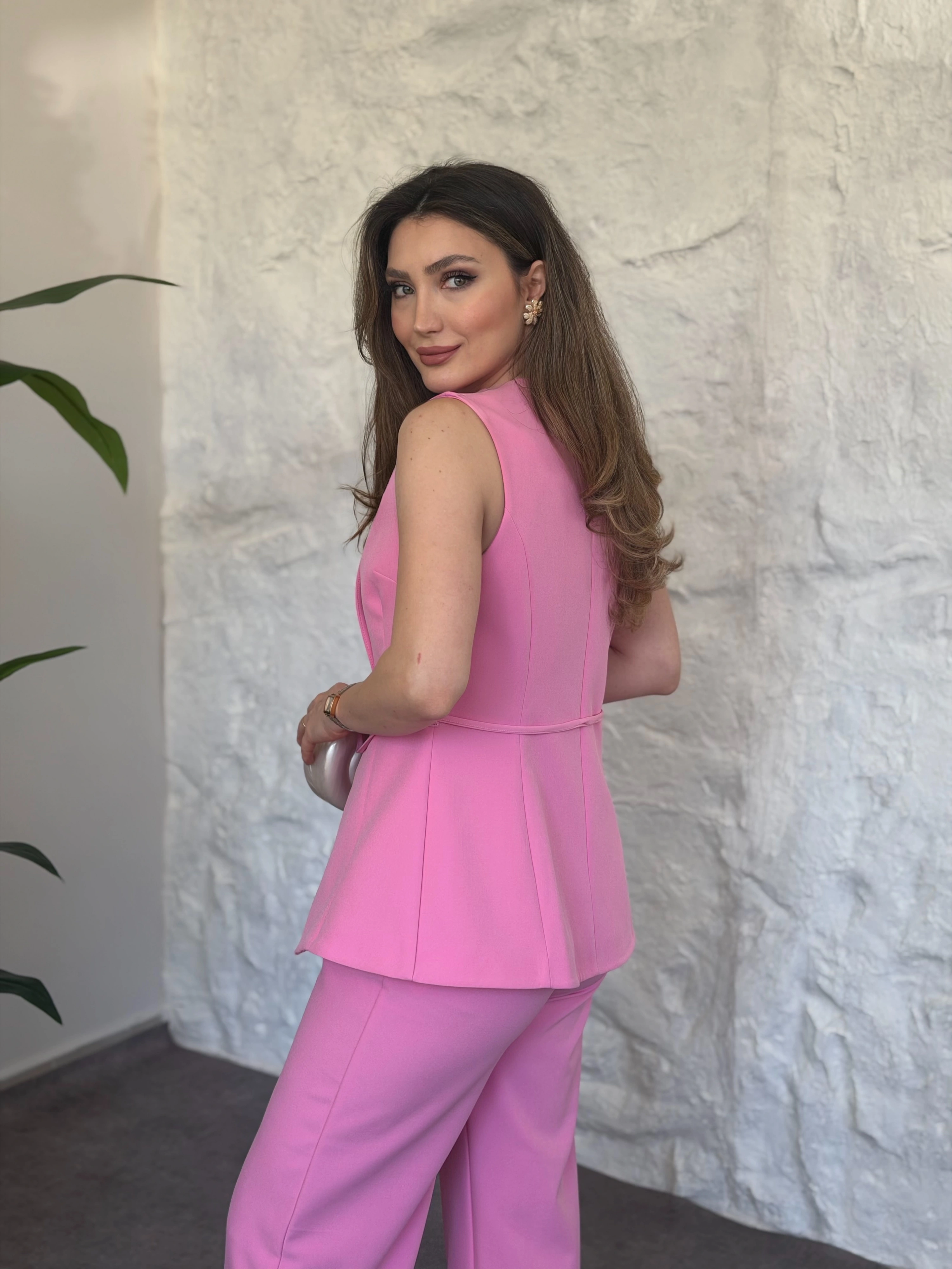 Sıfır kol belden bağlamalı kumaş takım siyah