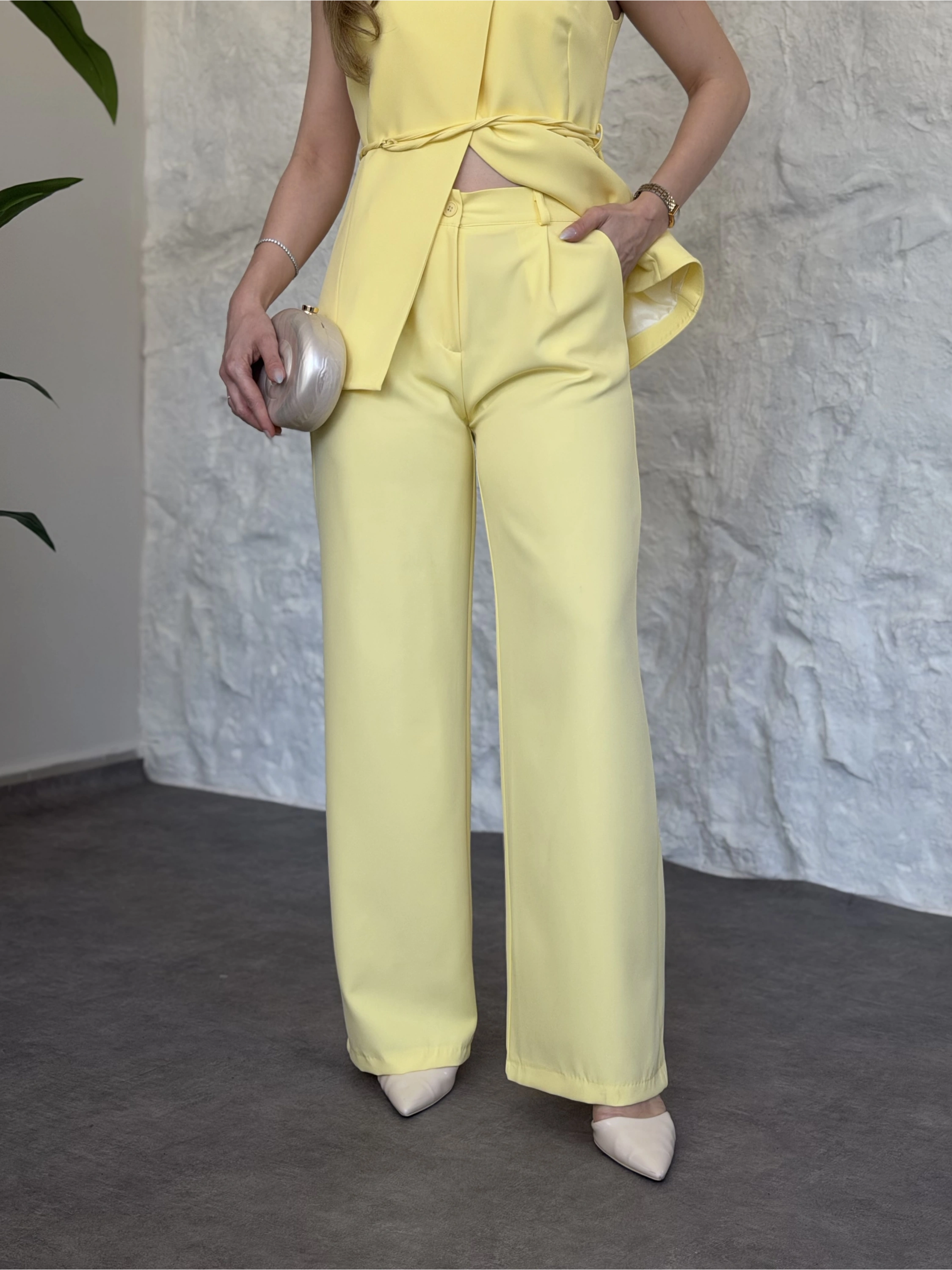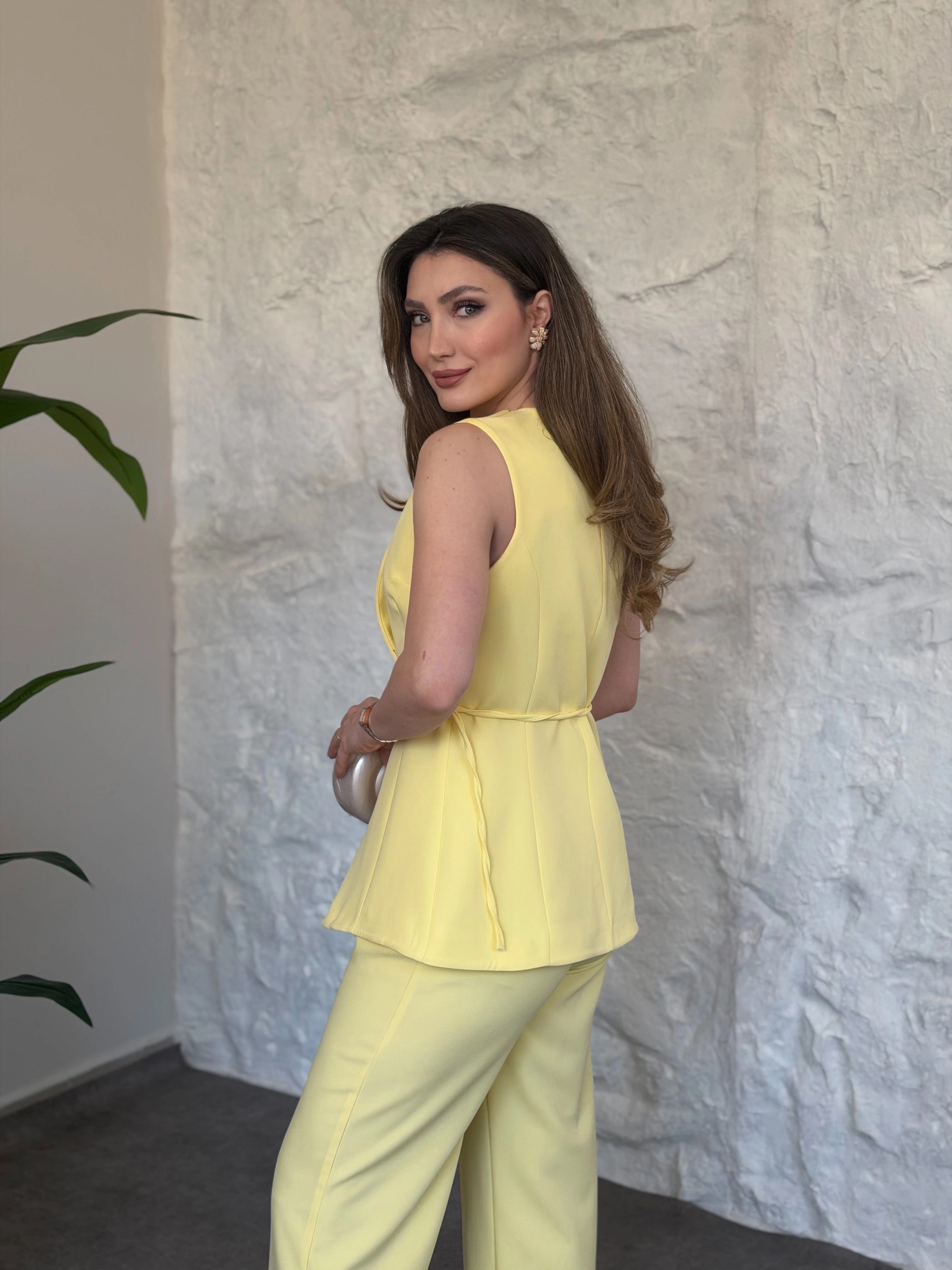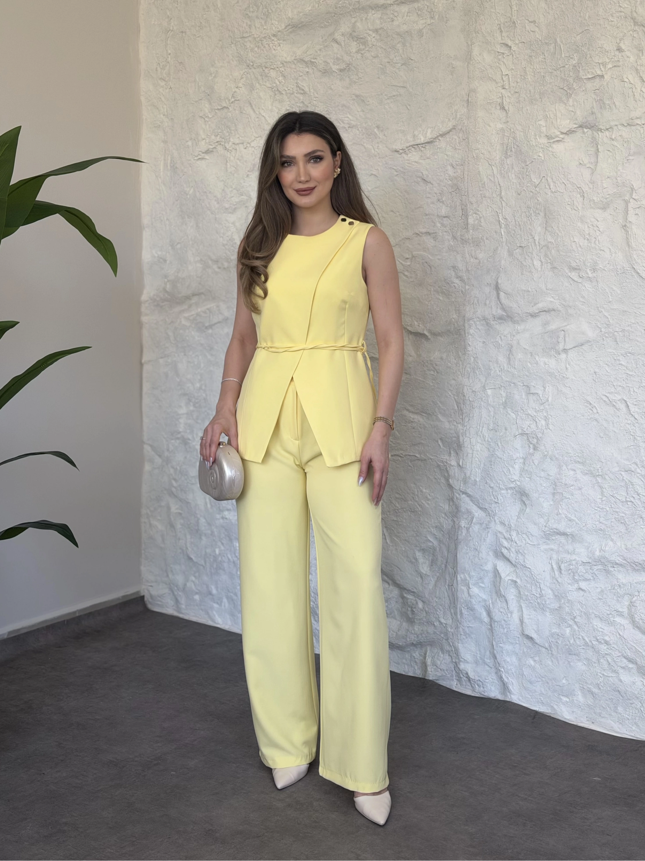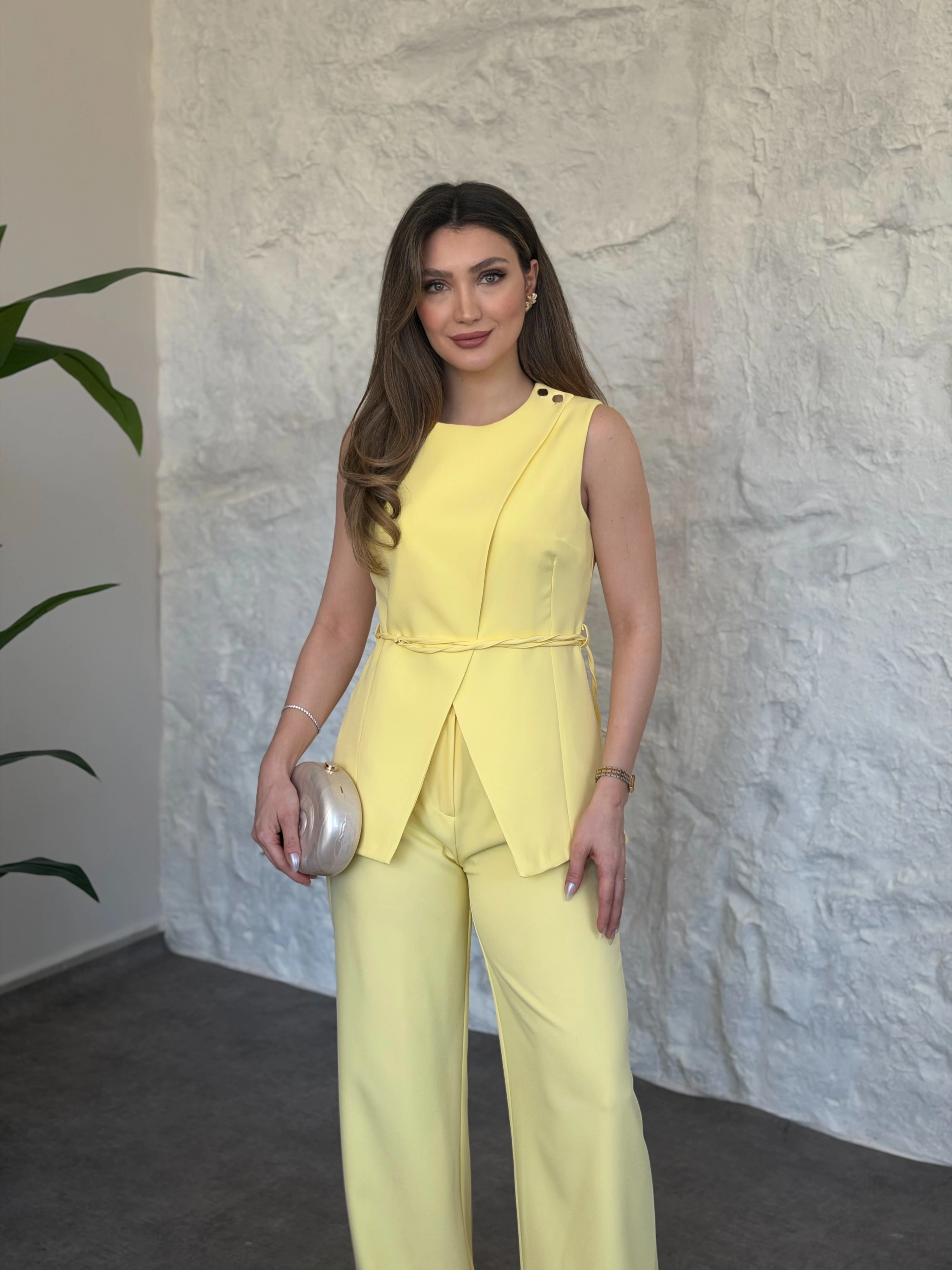 Omuz düğmeli önü üçgen kesim takım Sarı