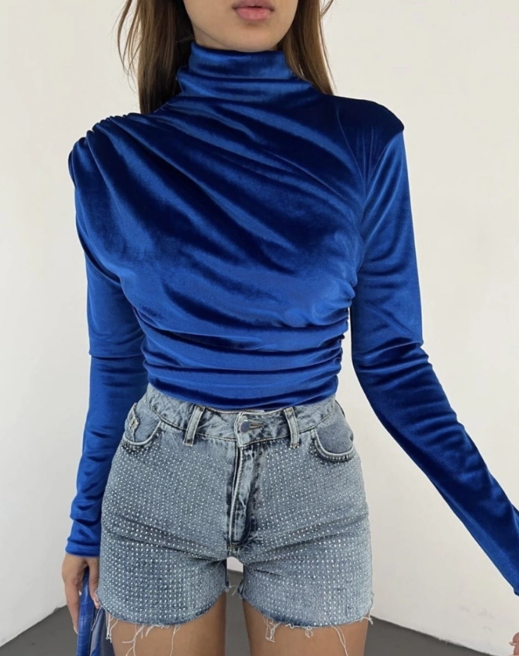 omuz ve beli büzgülü dik yaka kadife bluz saks mavisi
