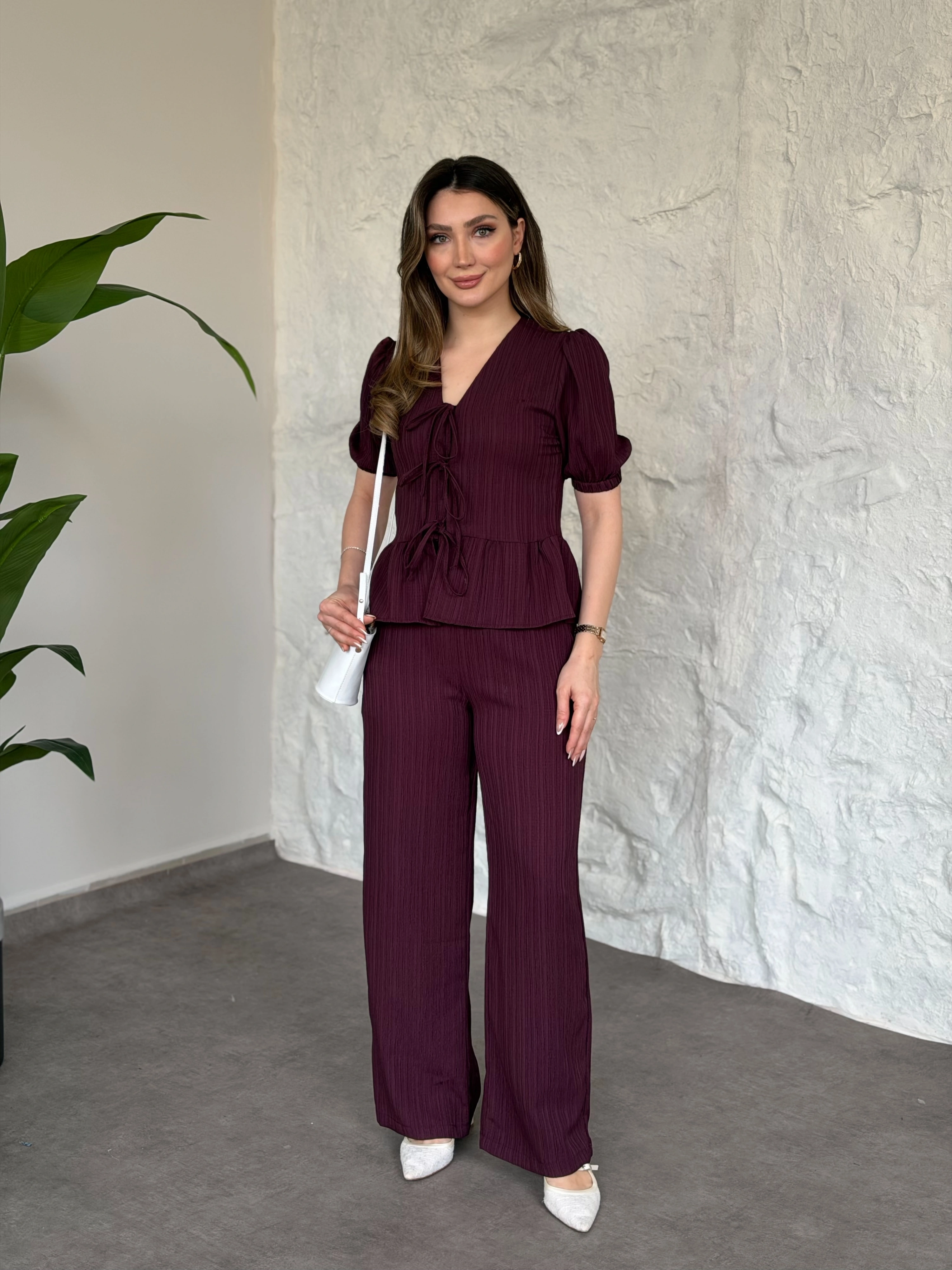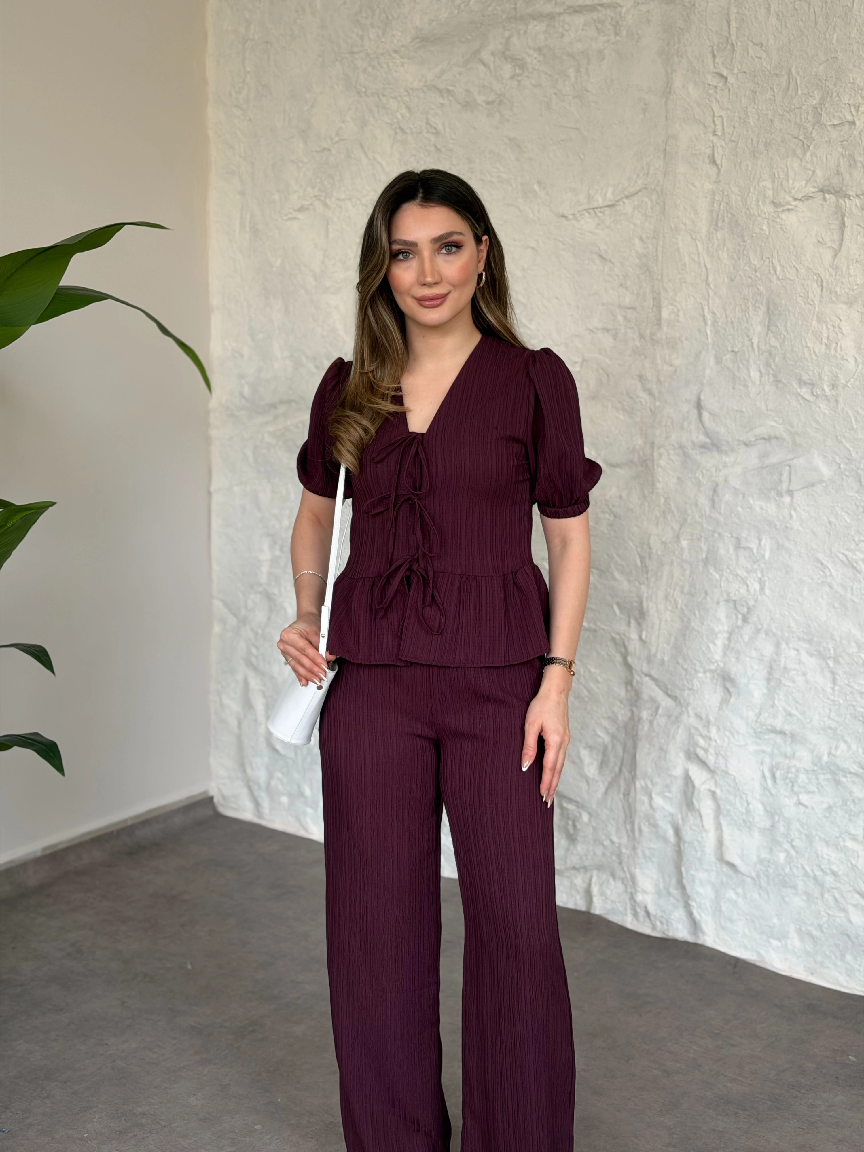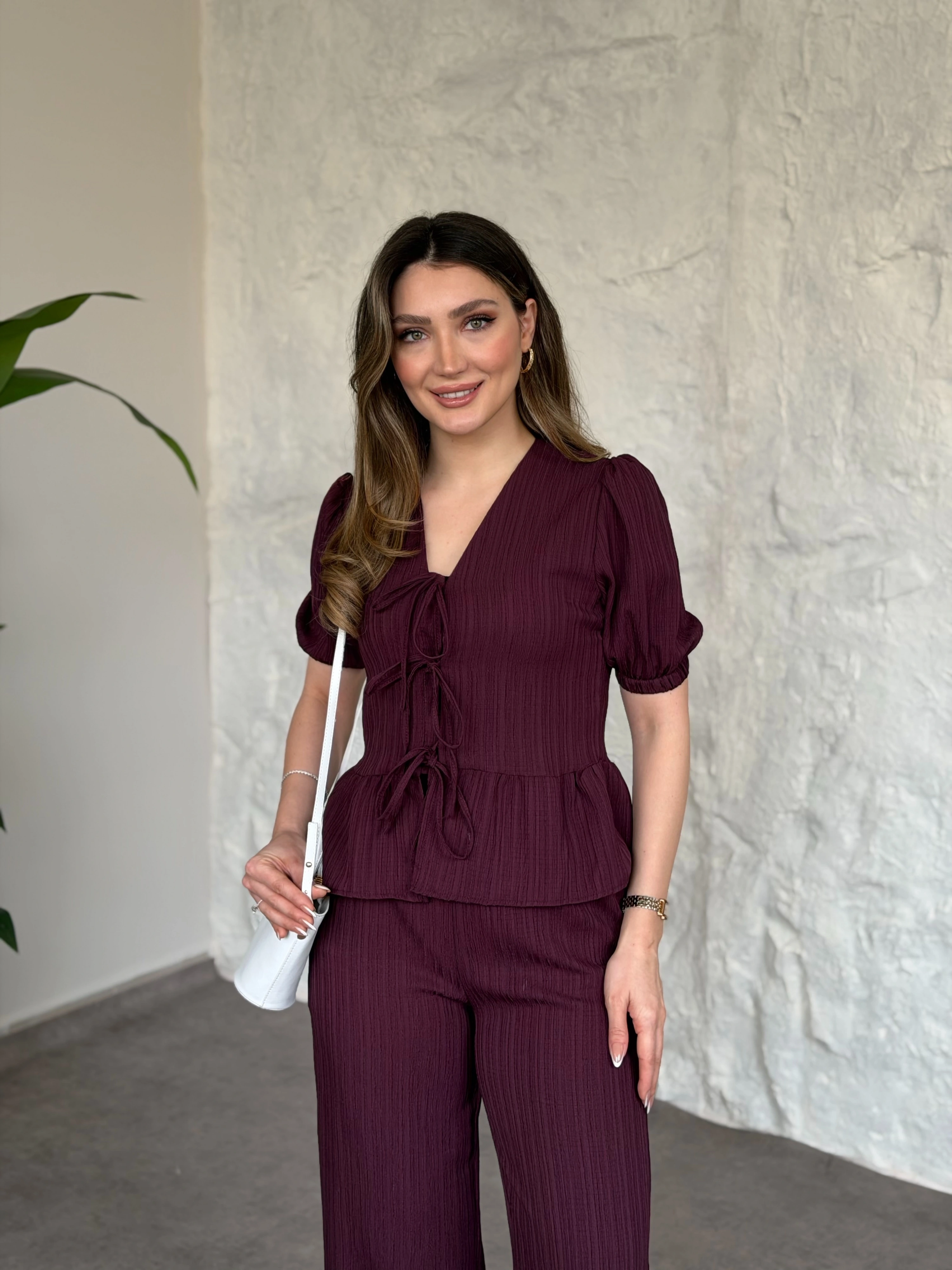 Önden bağlama detaylı gofre kumaş takım bordo