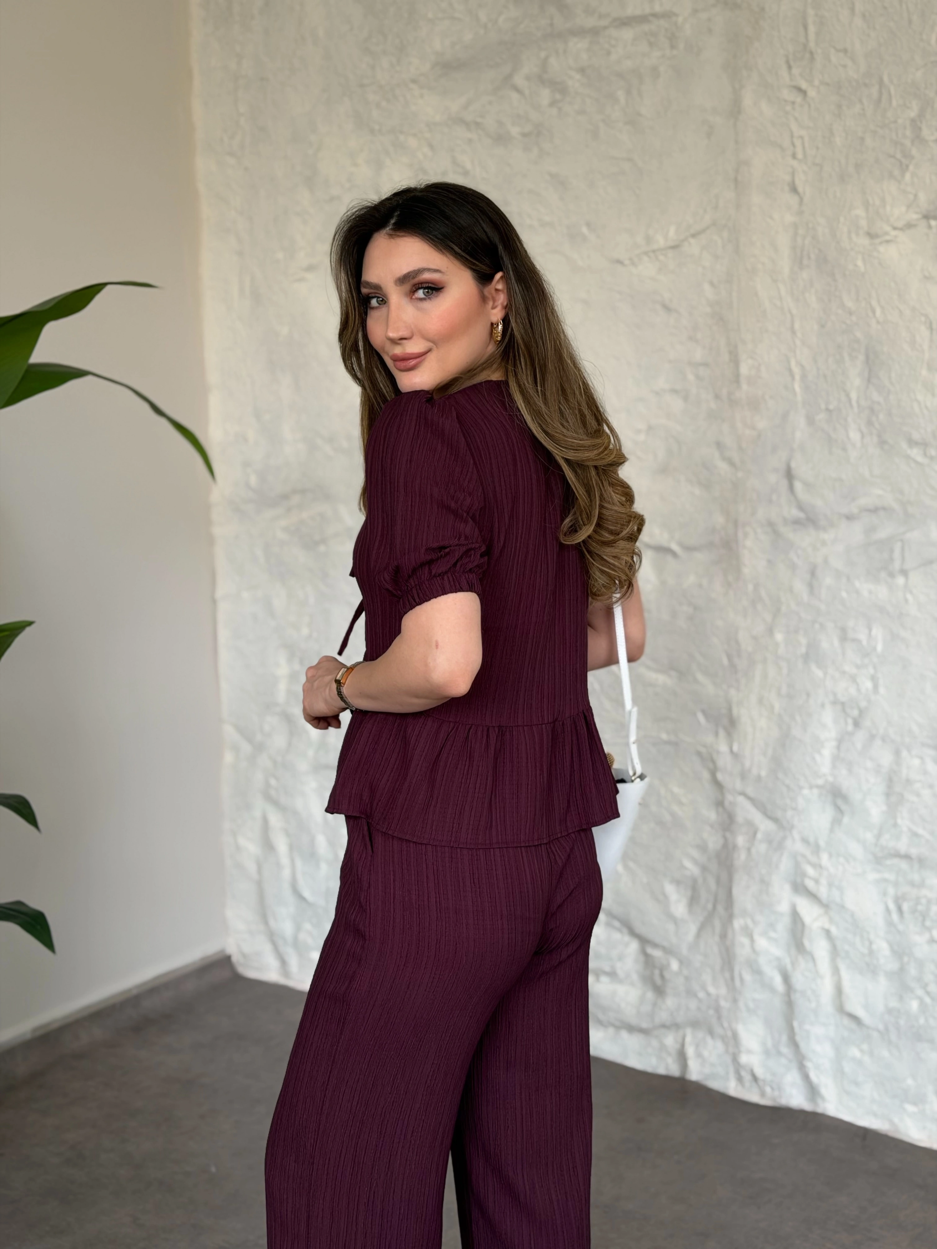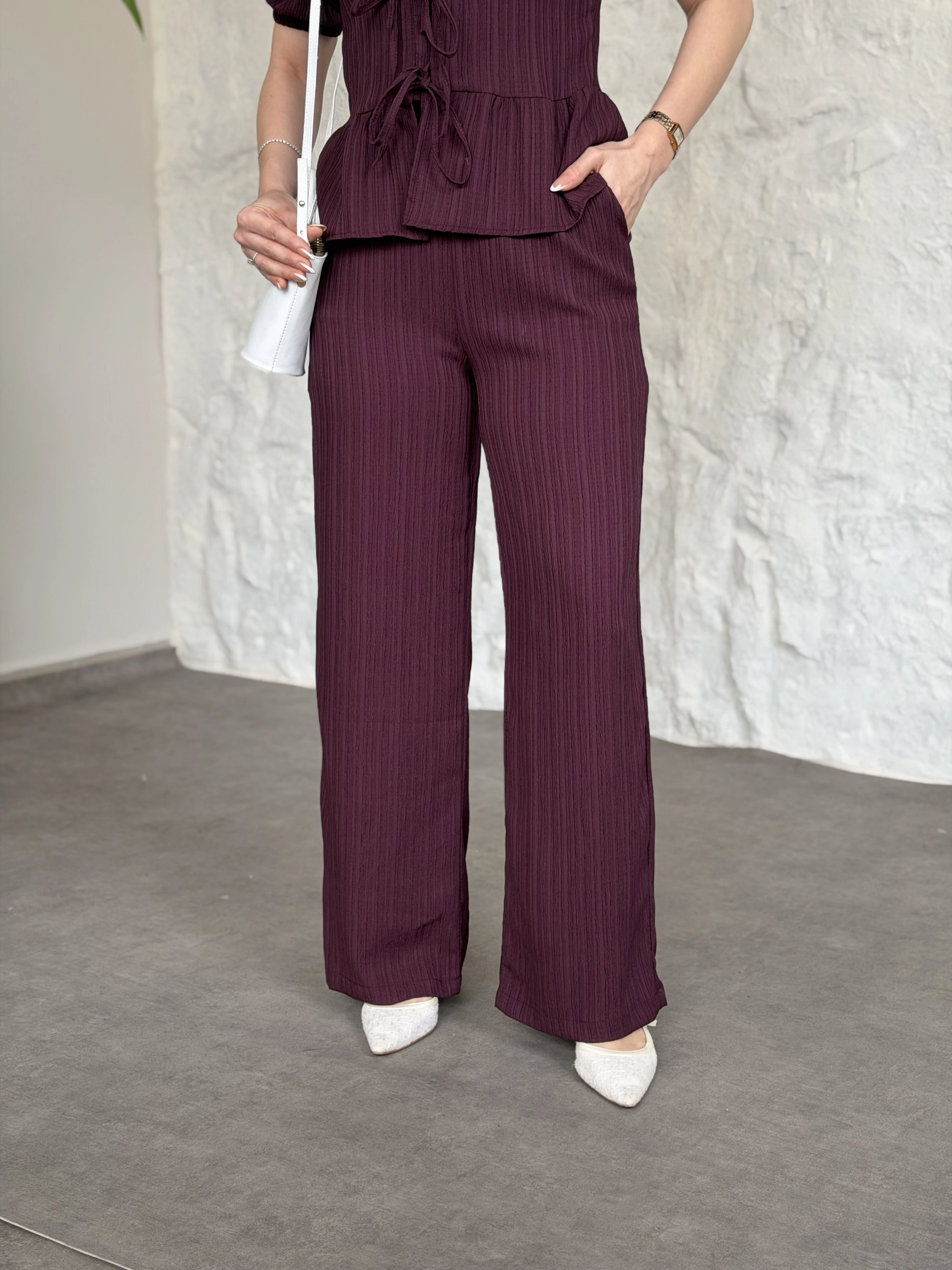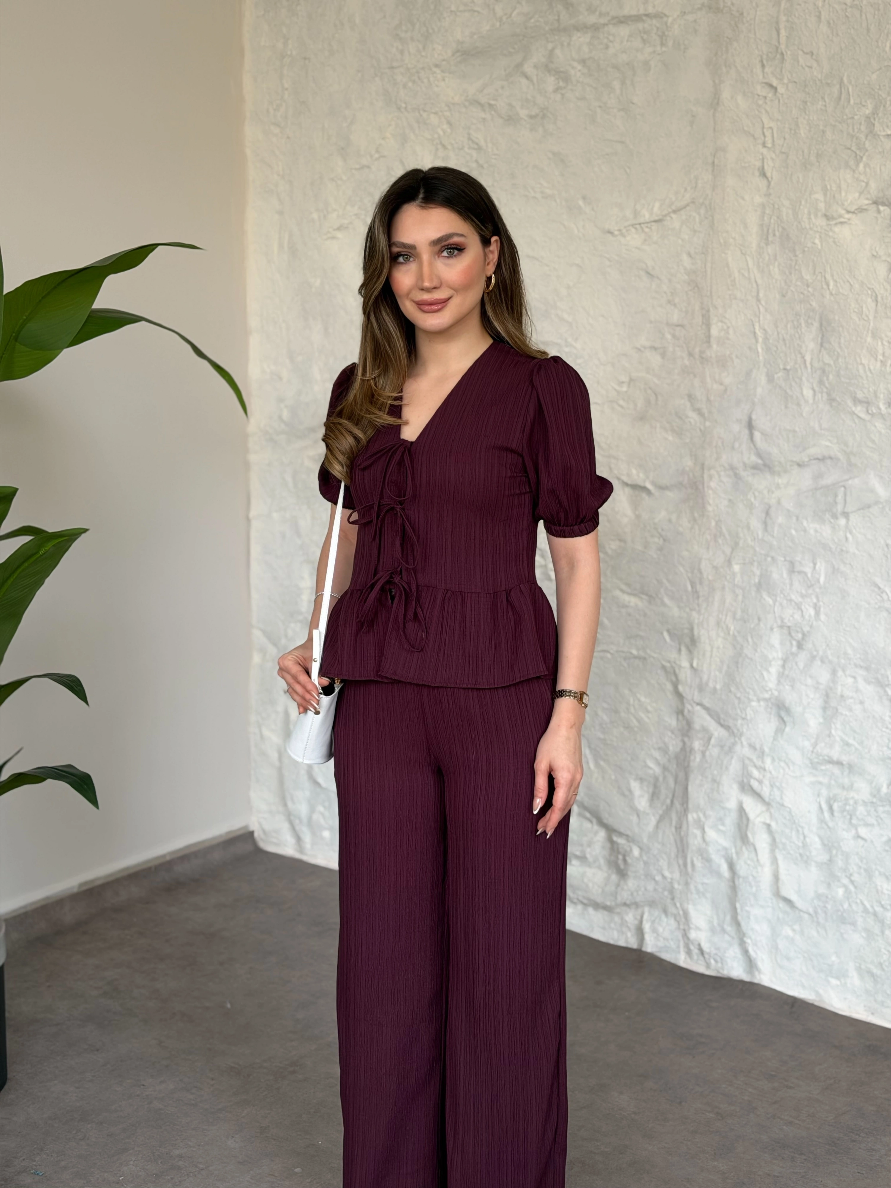 Önden bağlama detaylı gofre kumaş takım bordo