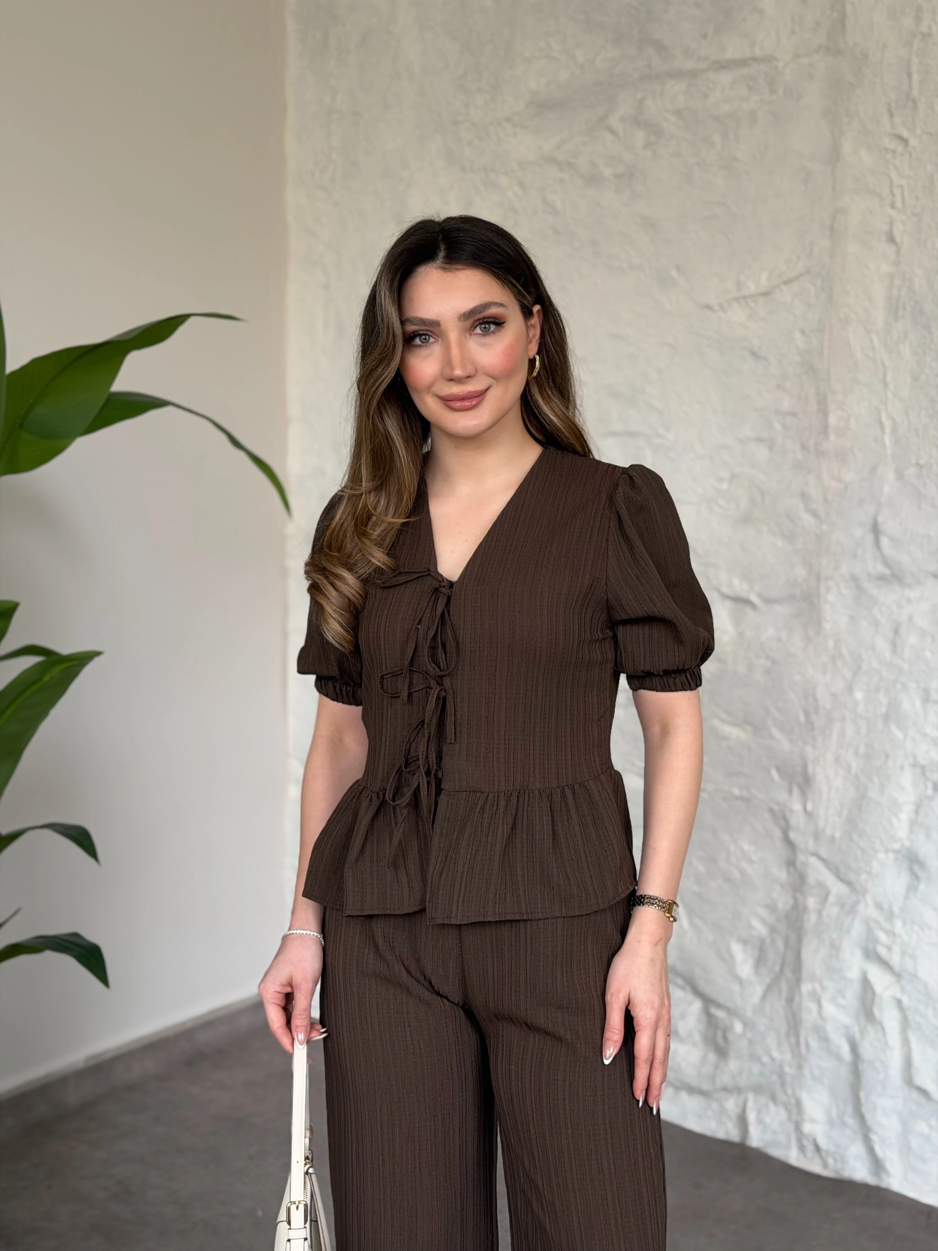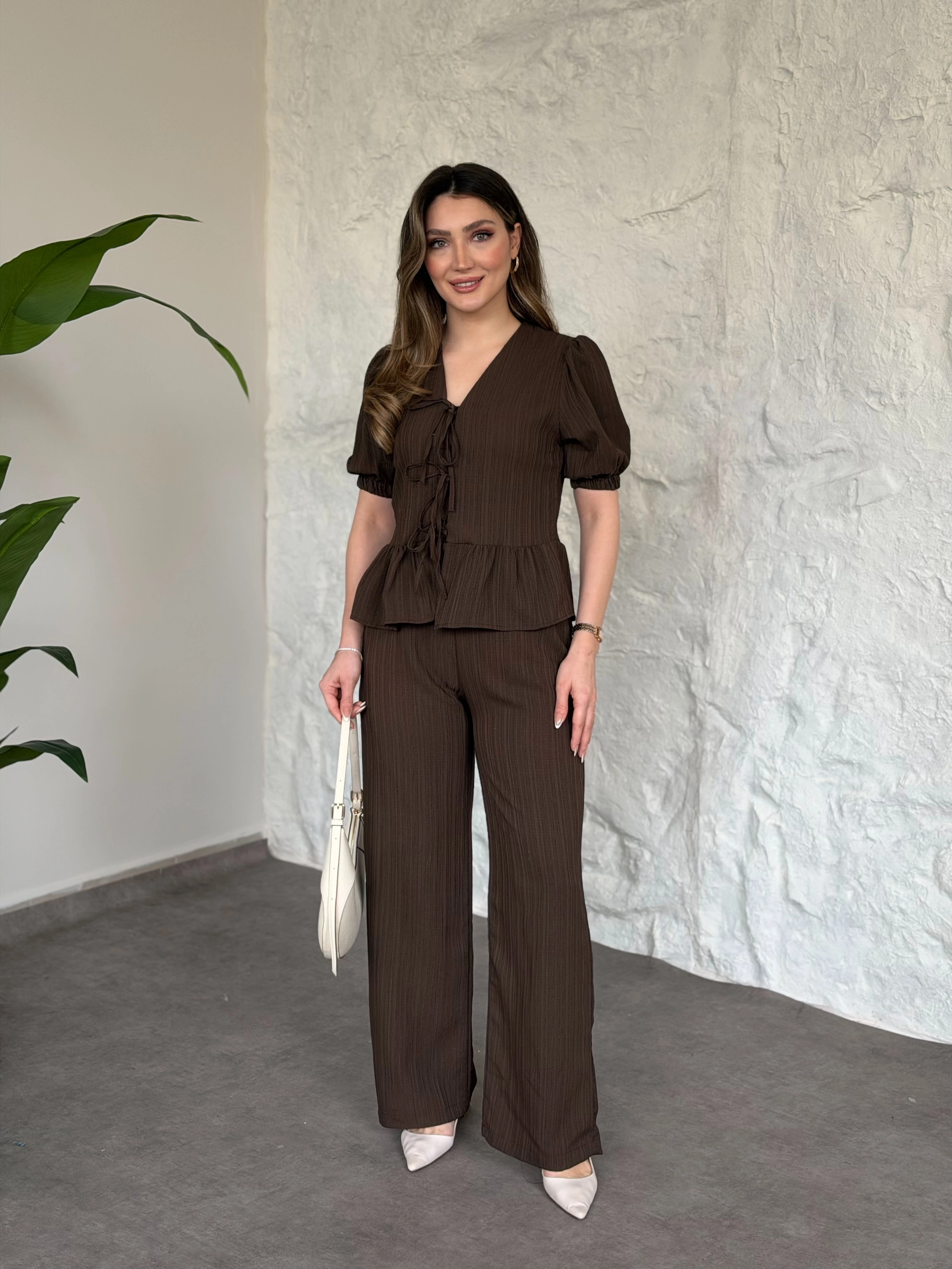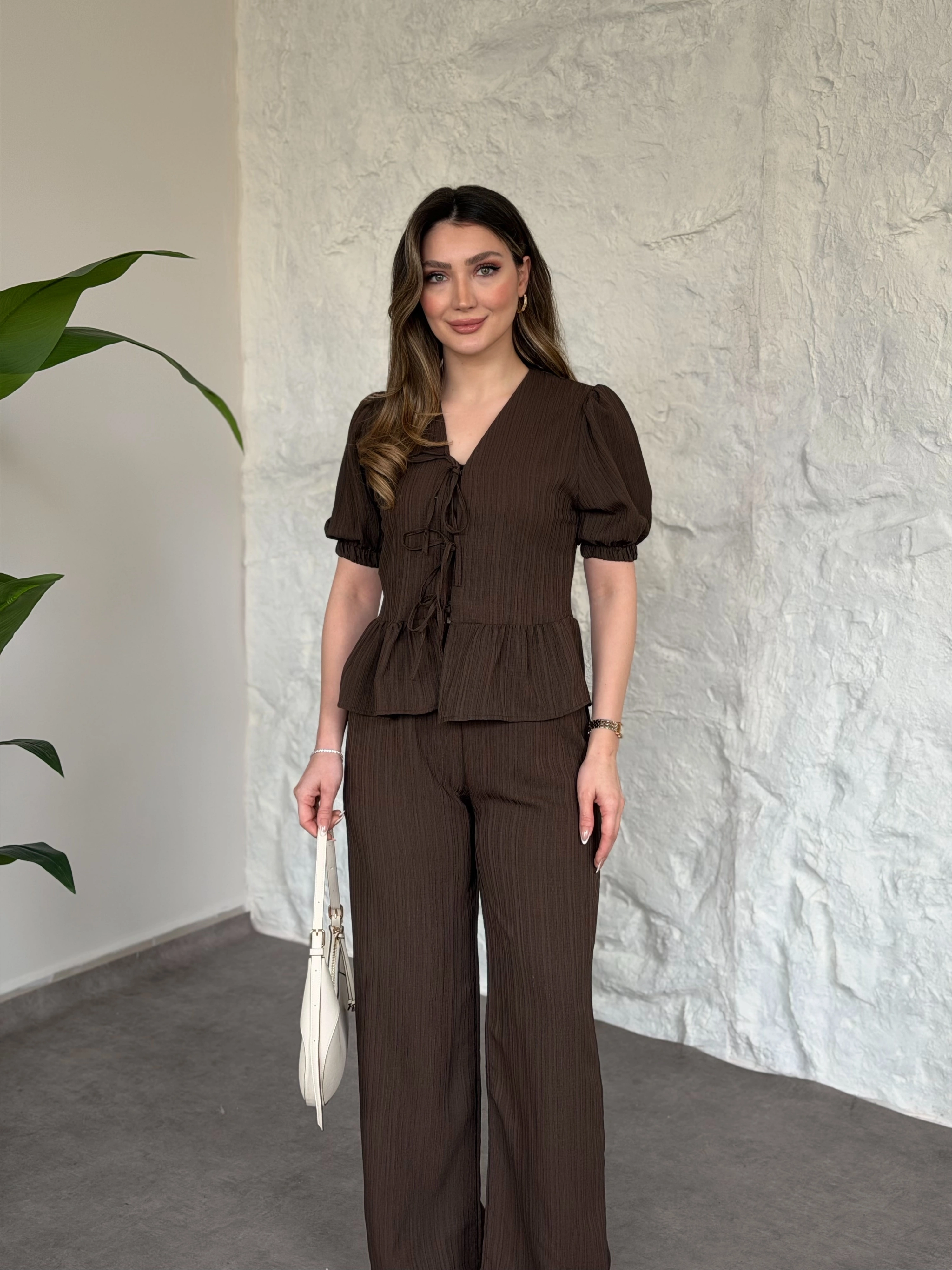 Önden bağlama detaylı gofre kumaş takım kahve