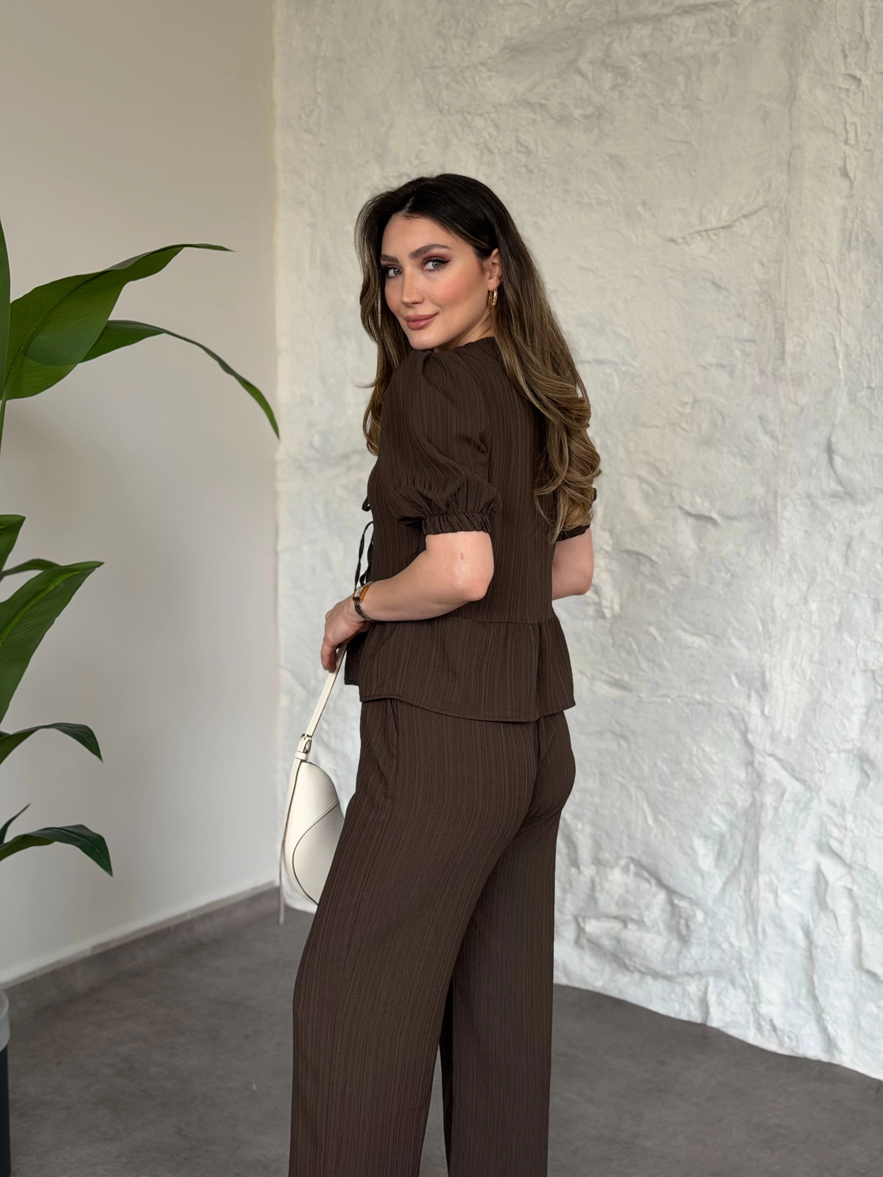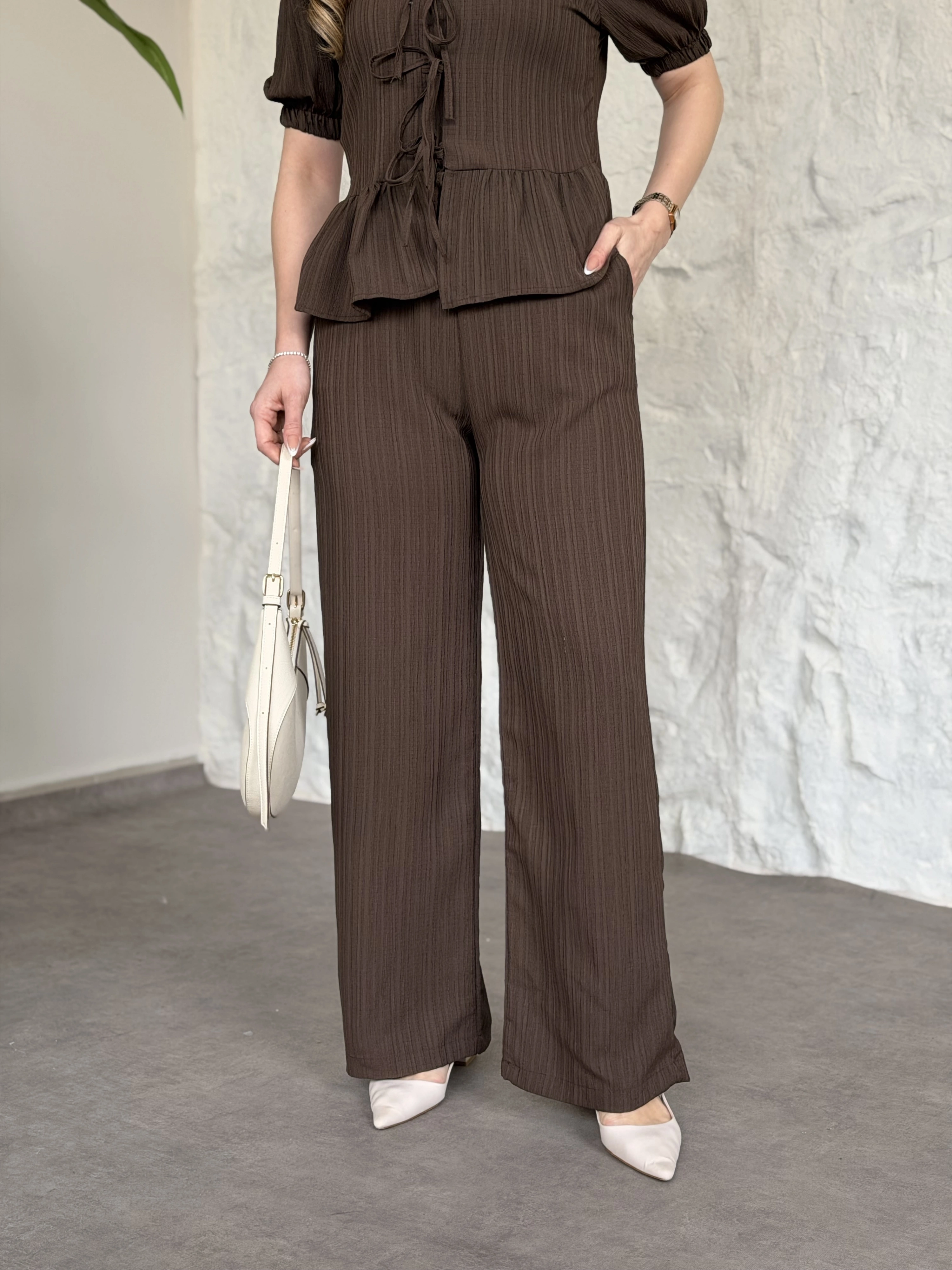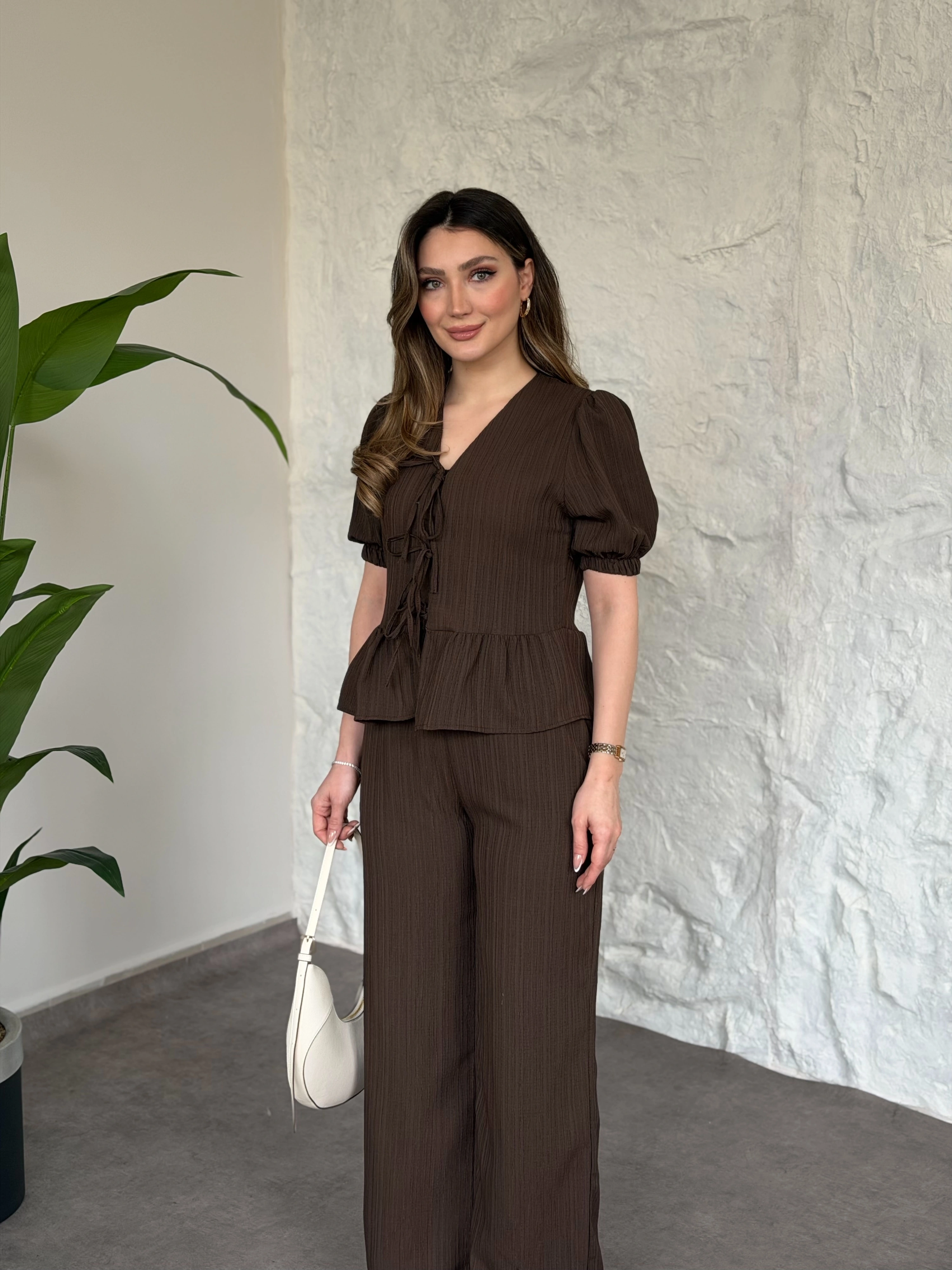 Önden bağlama detaylı gofre kumaş takım kahve
