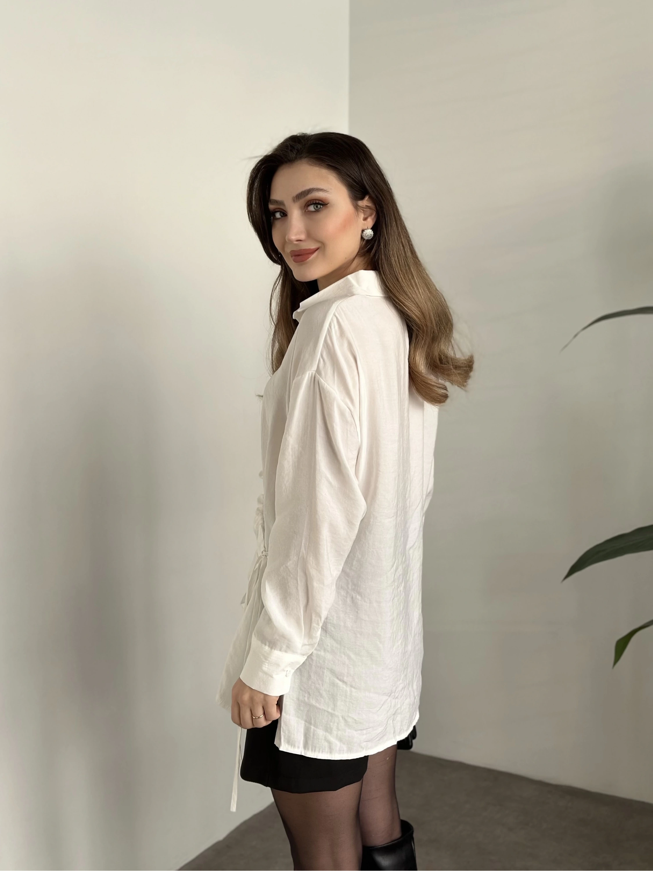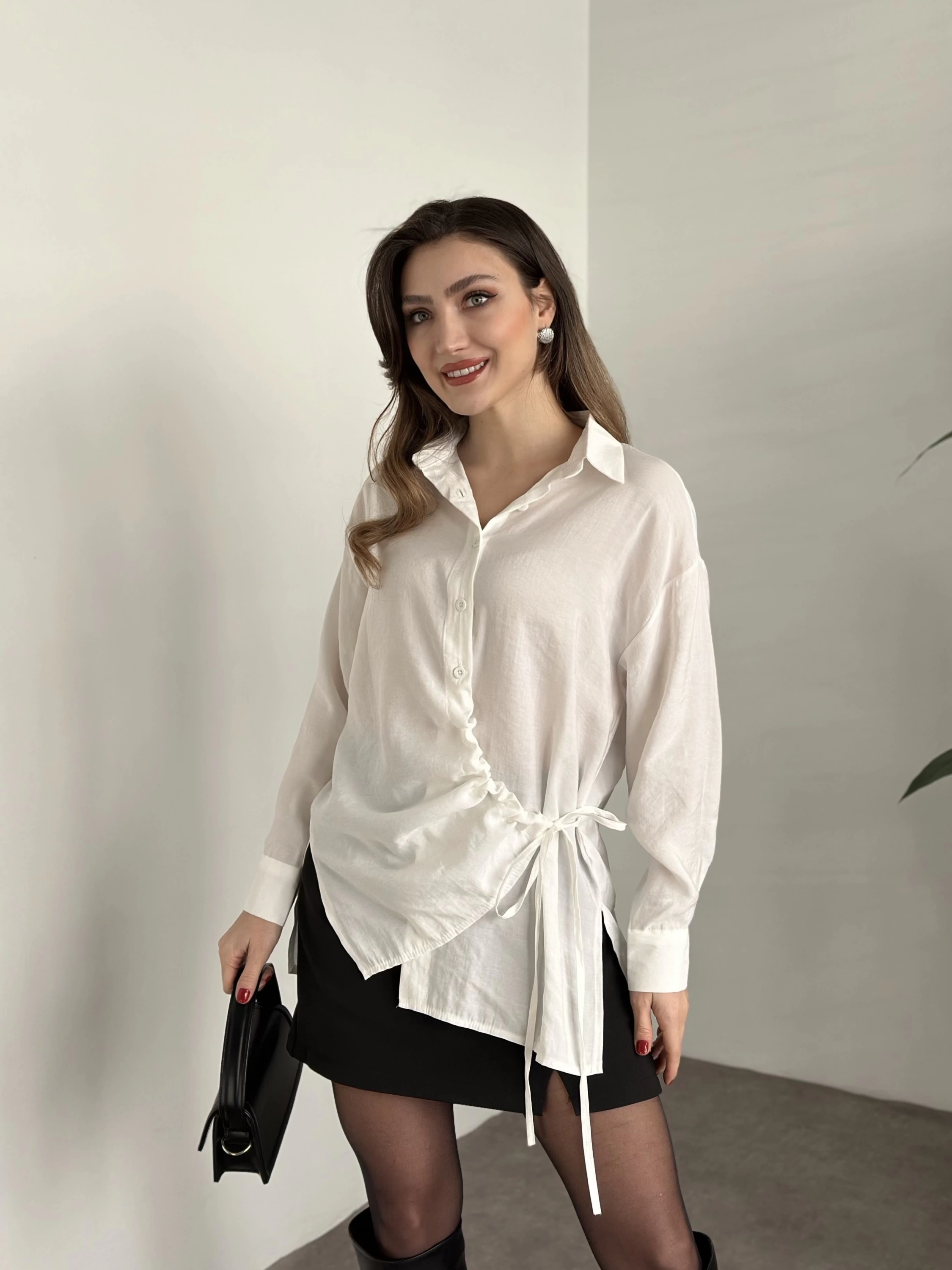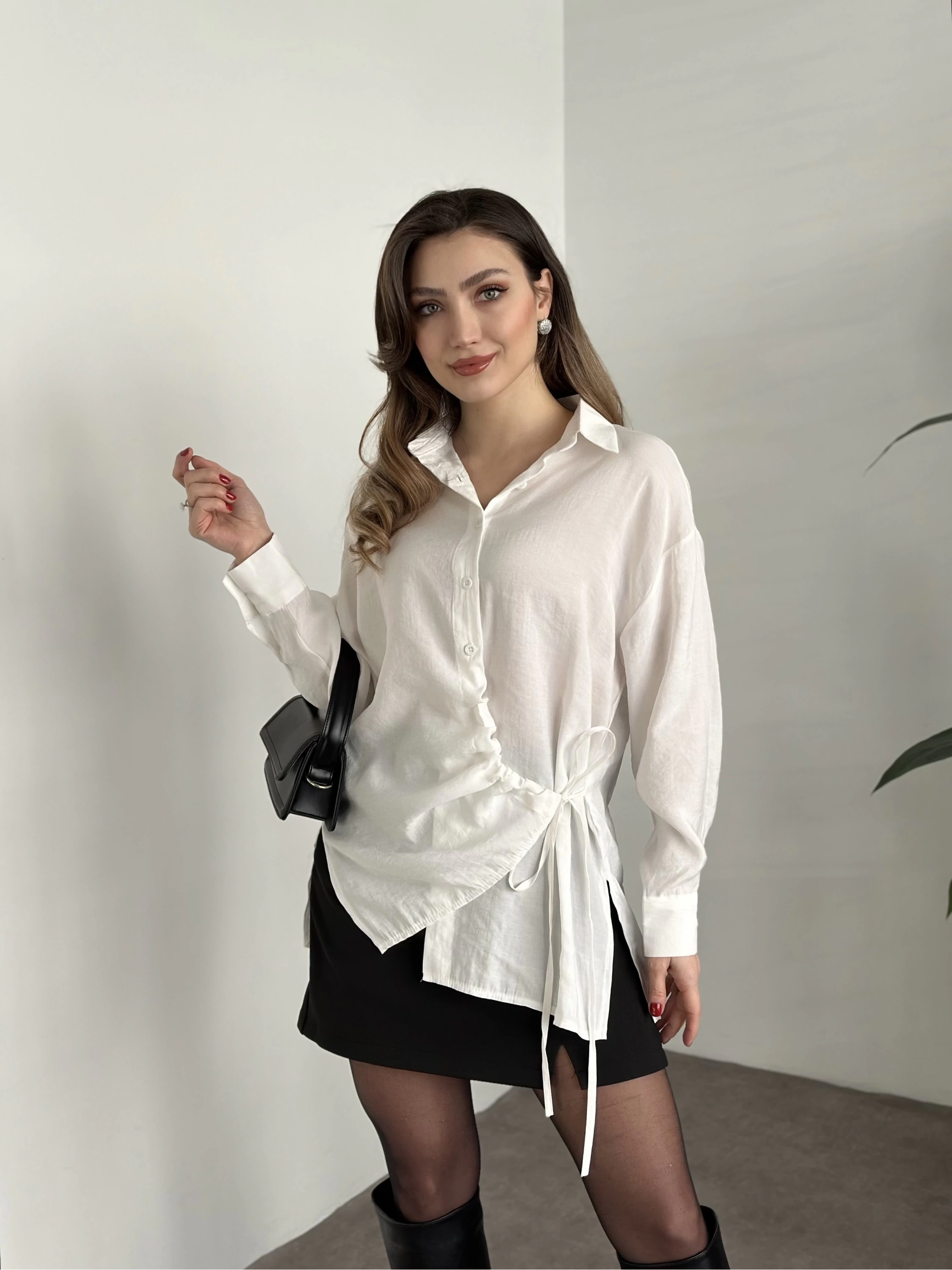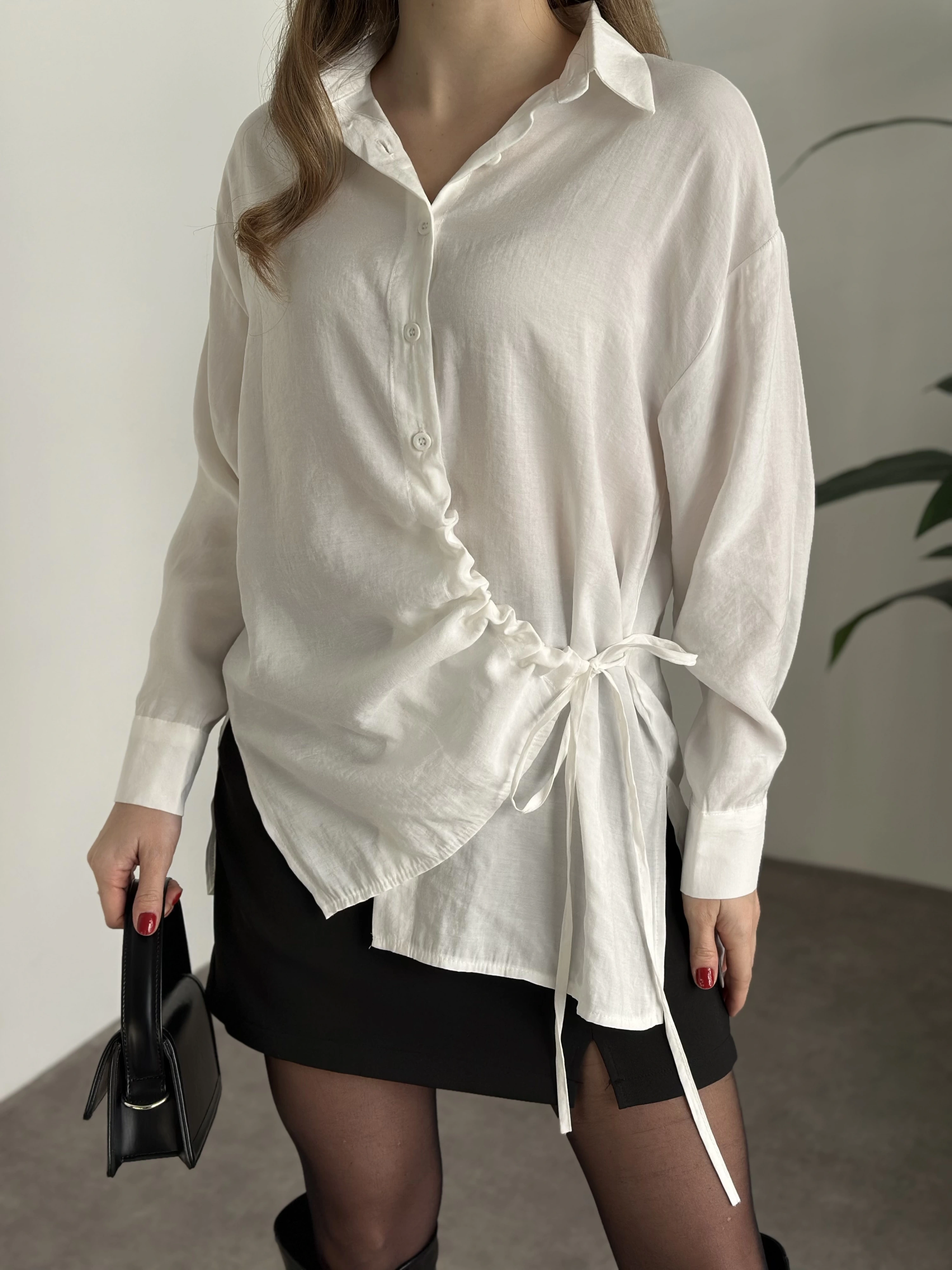 Önden büzgülü ithal kumaş gömlek beyaz