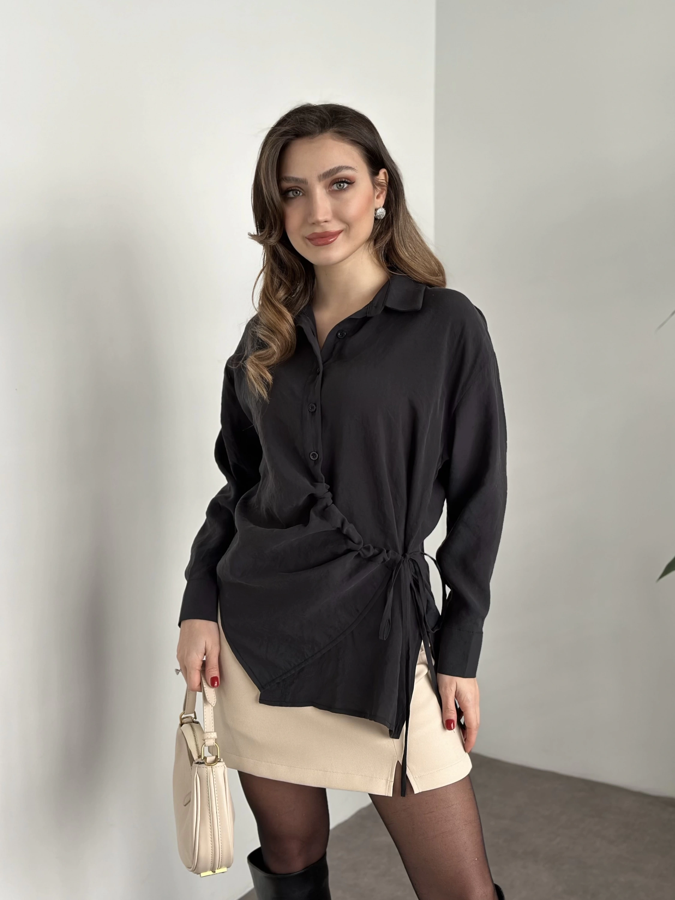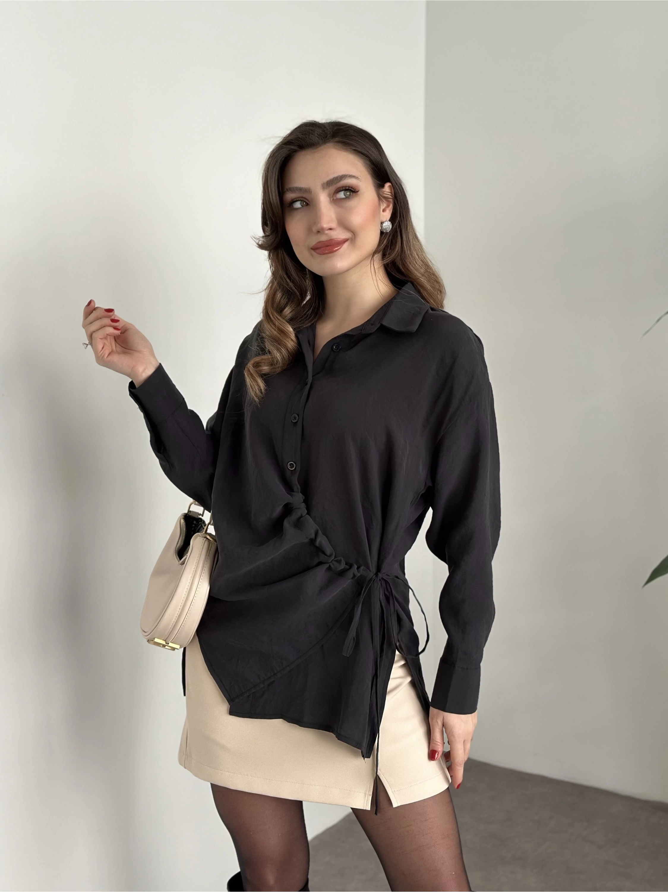 Boyundan bağlamalı asimetrik kesim gofre kumaş elbise siyah