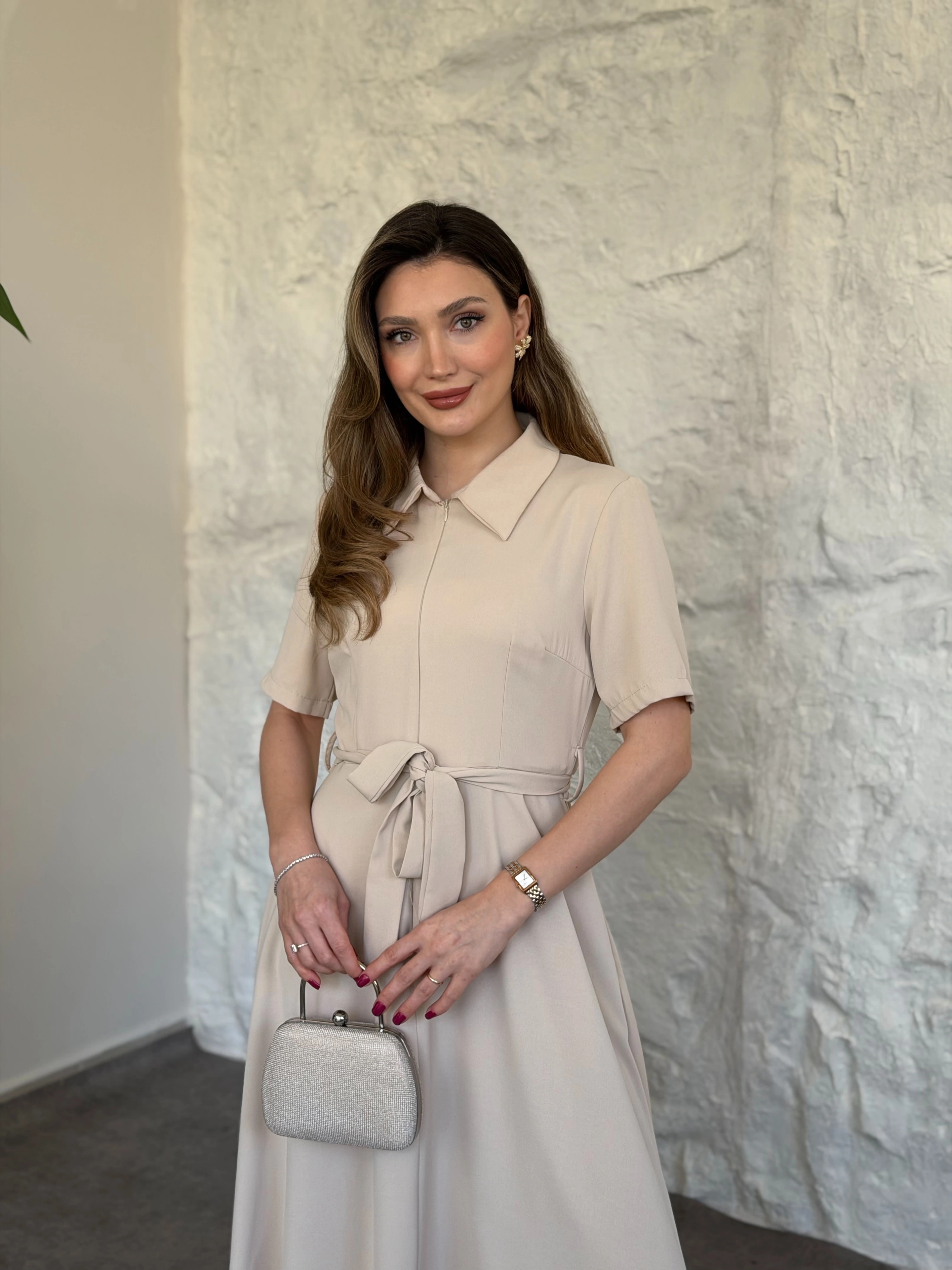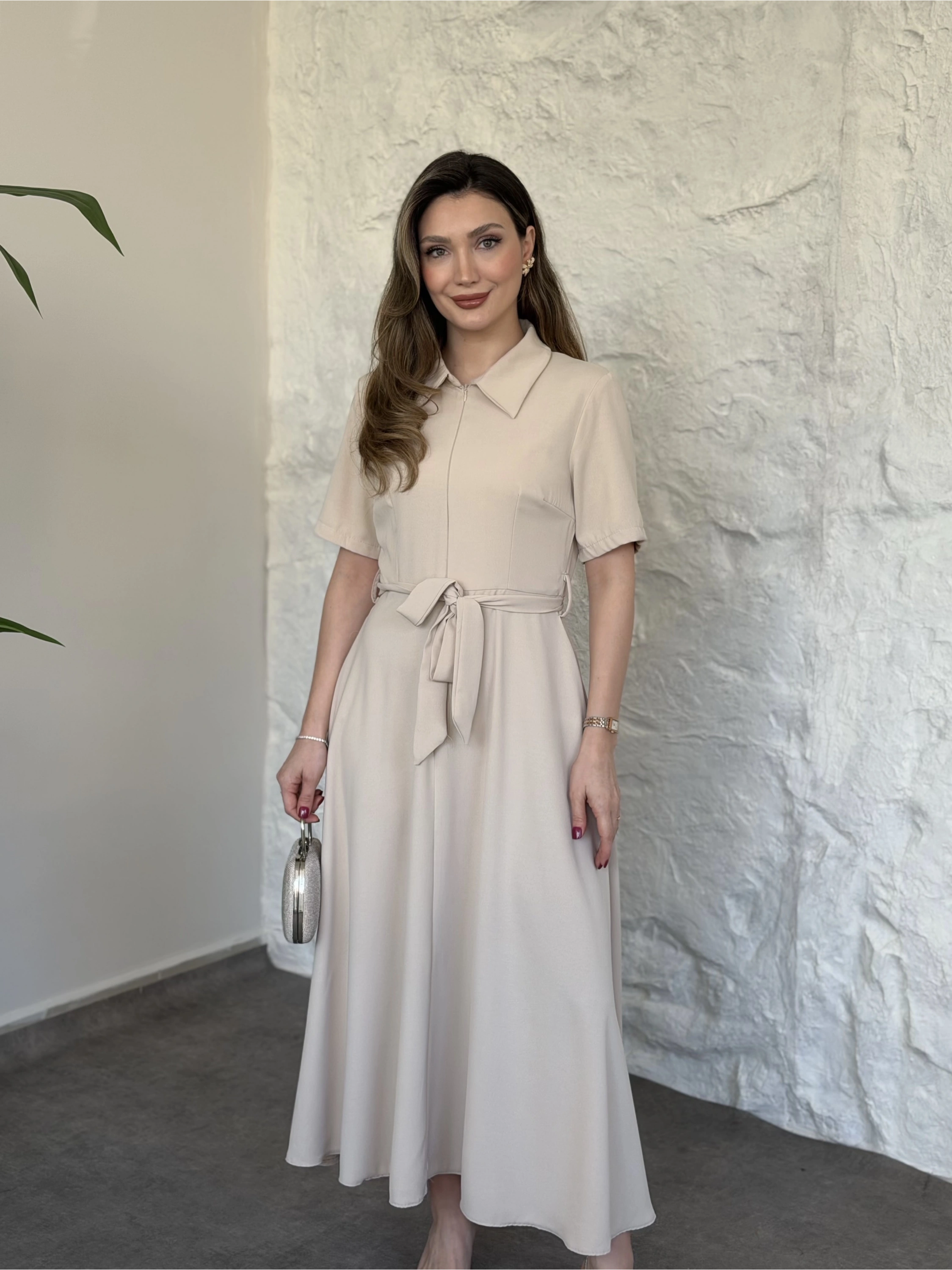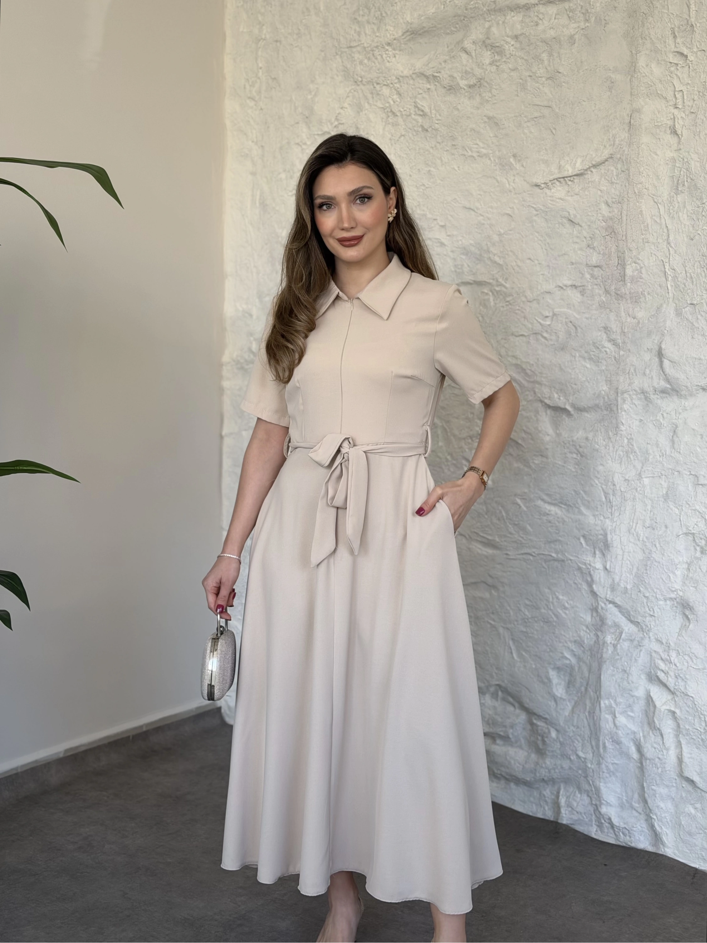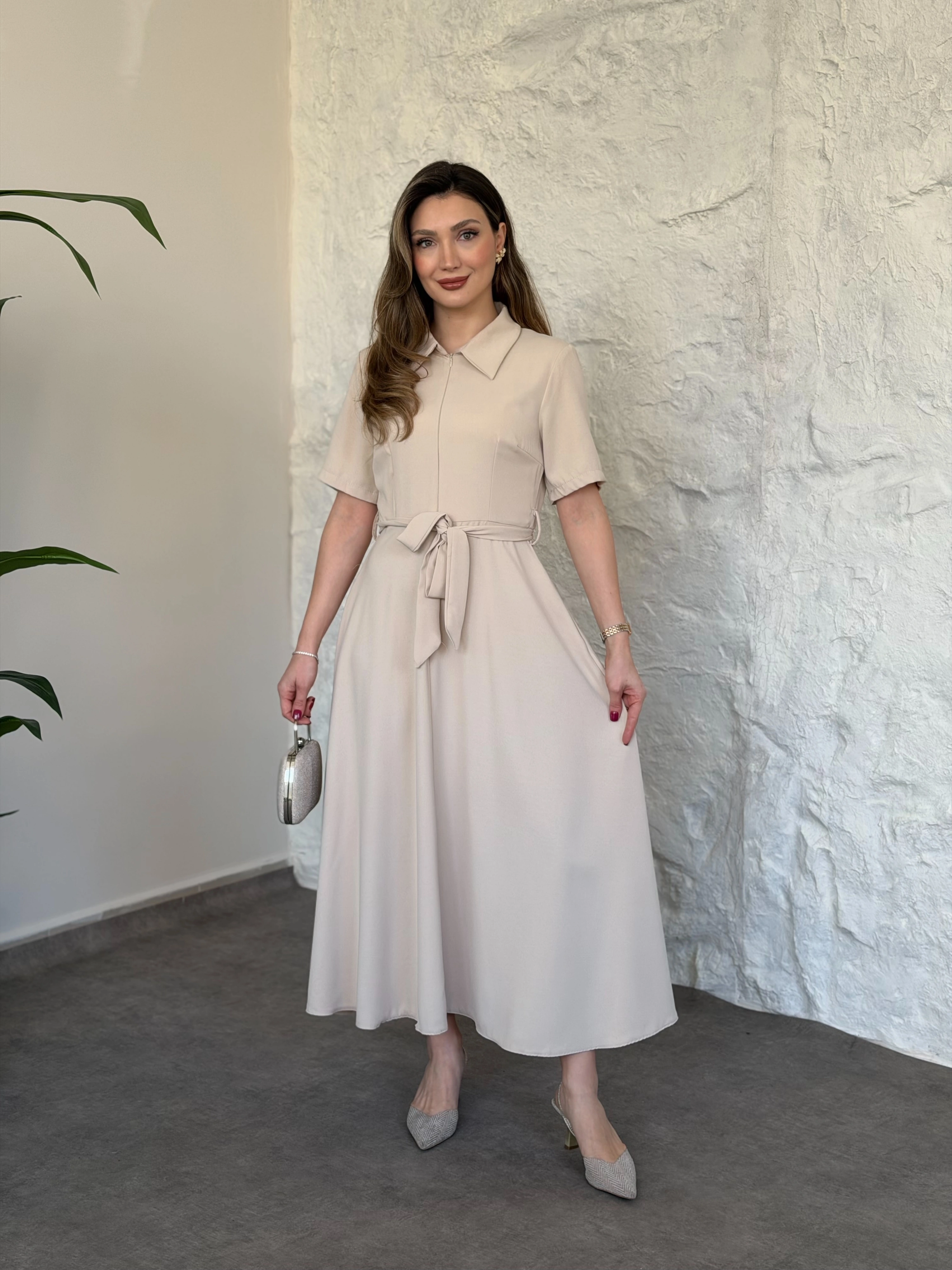 Önden fermuarlı belinden kuşaklı midi elbise krem