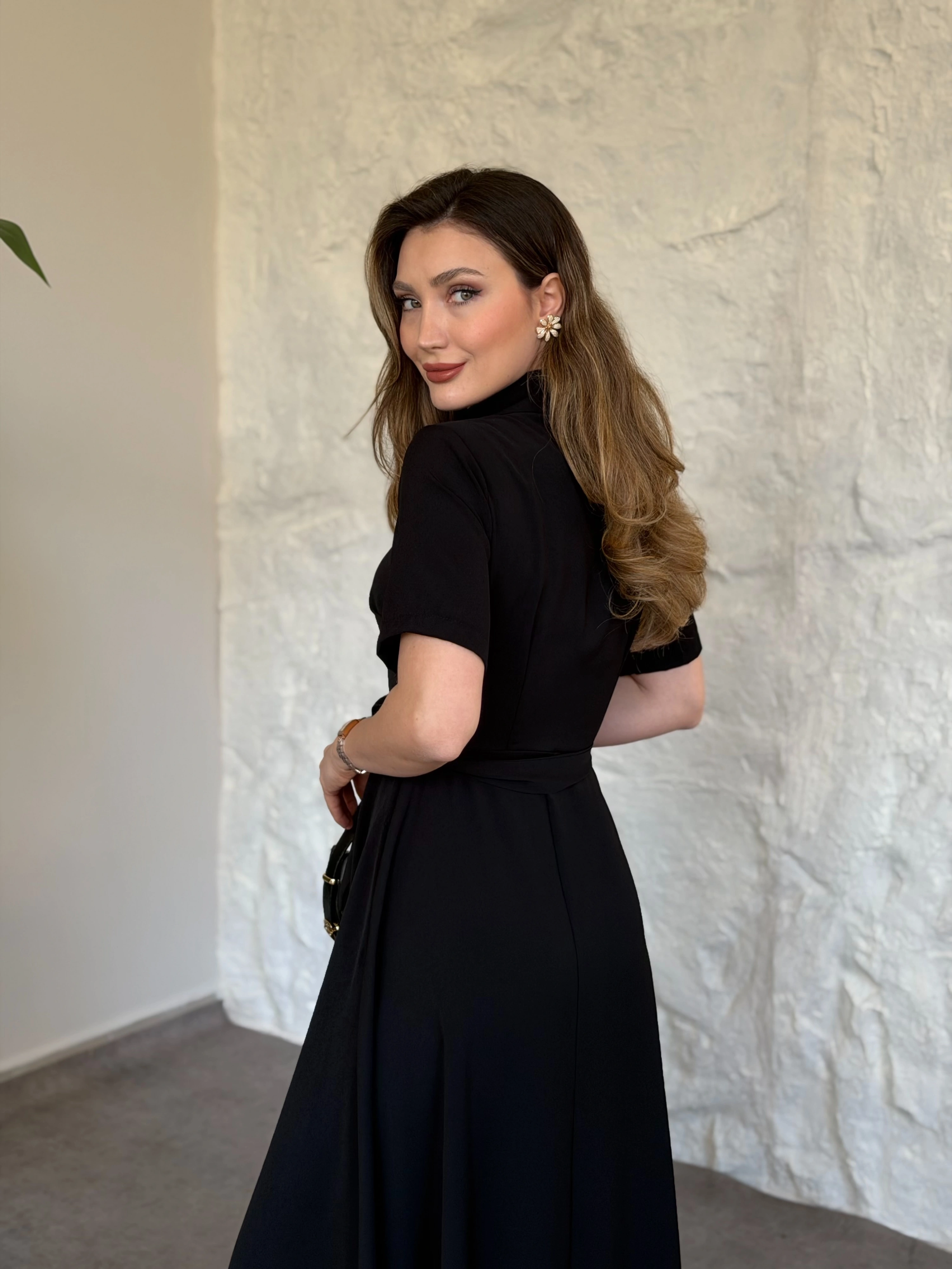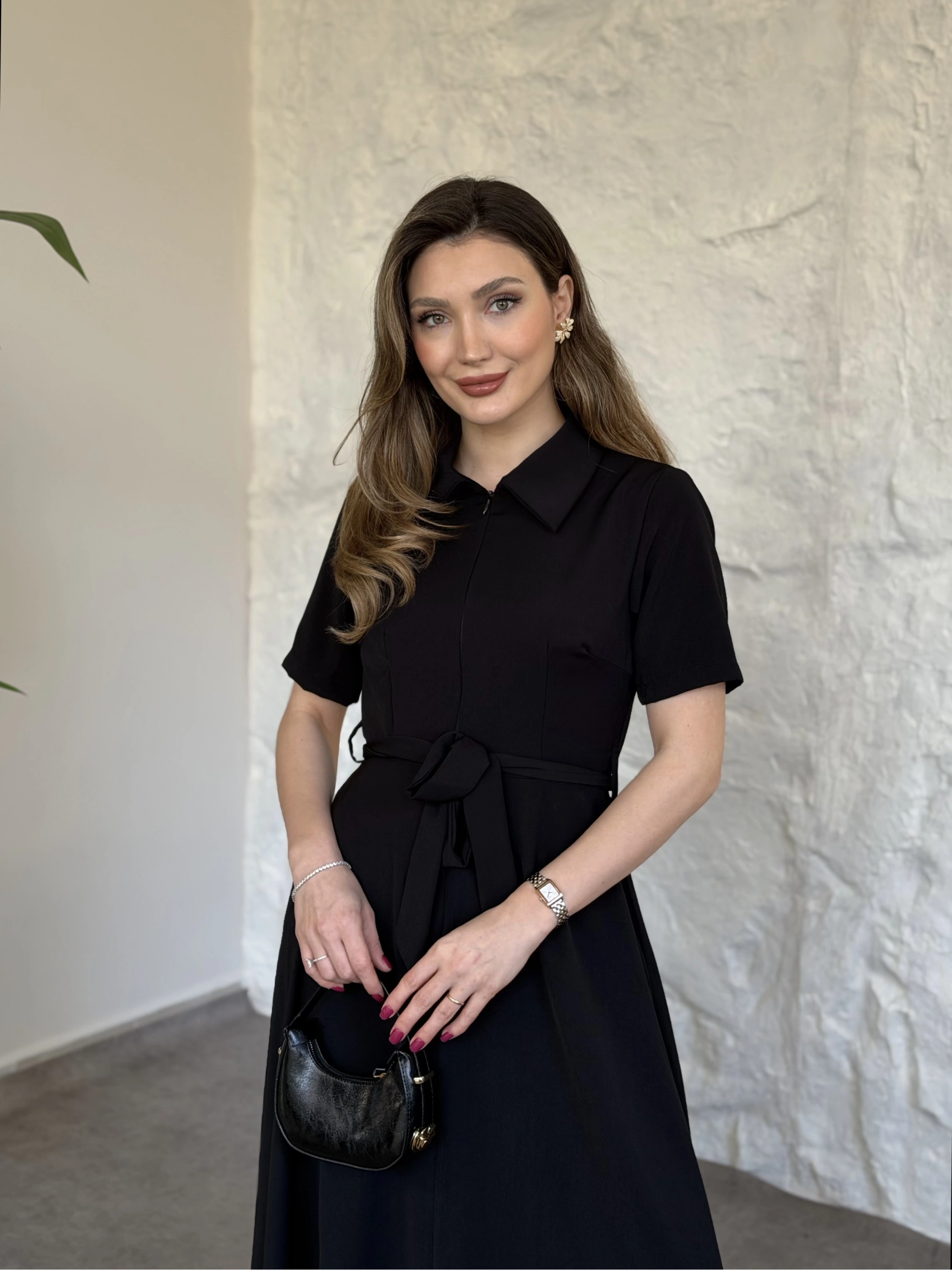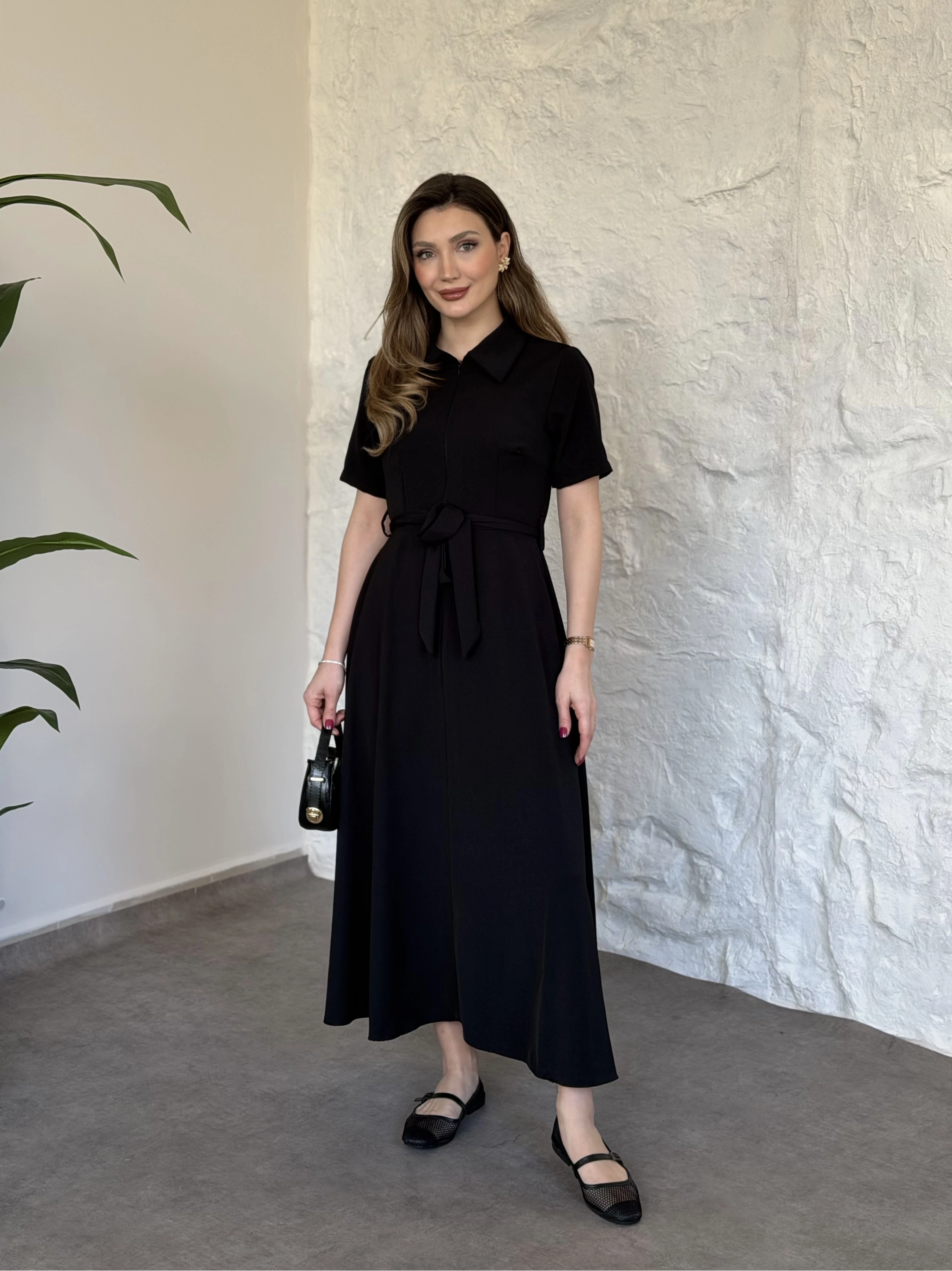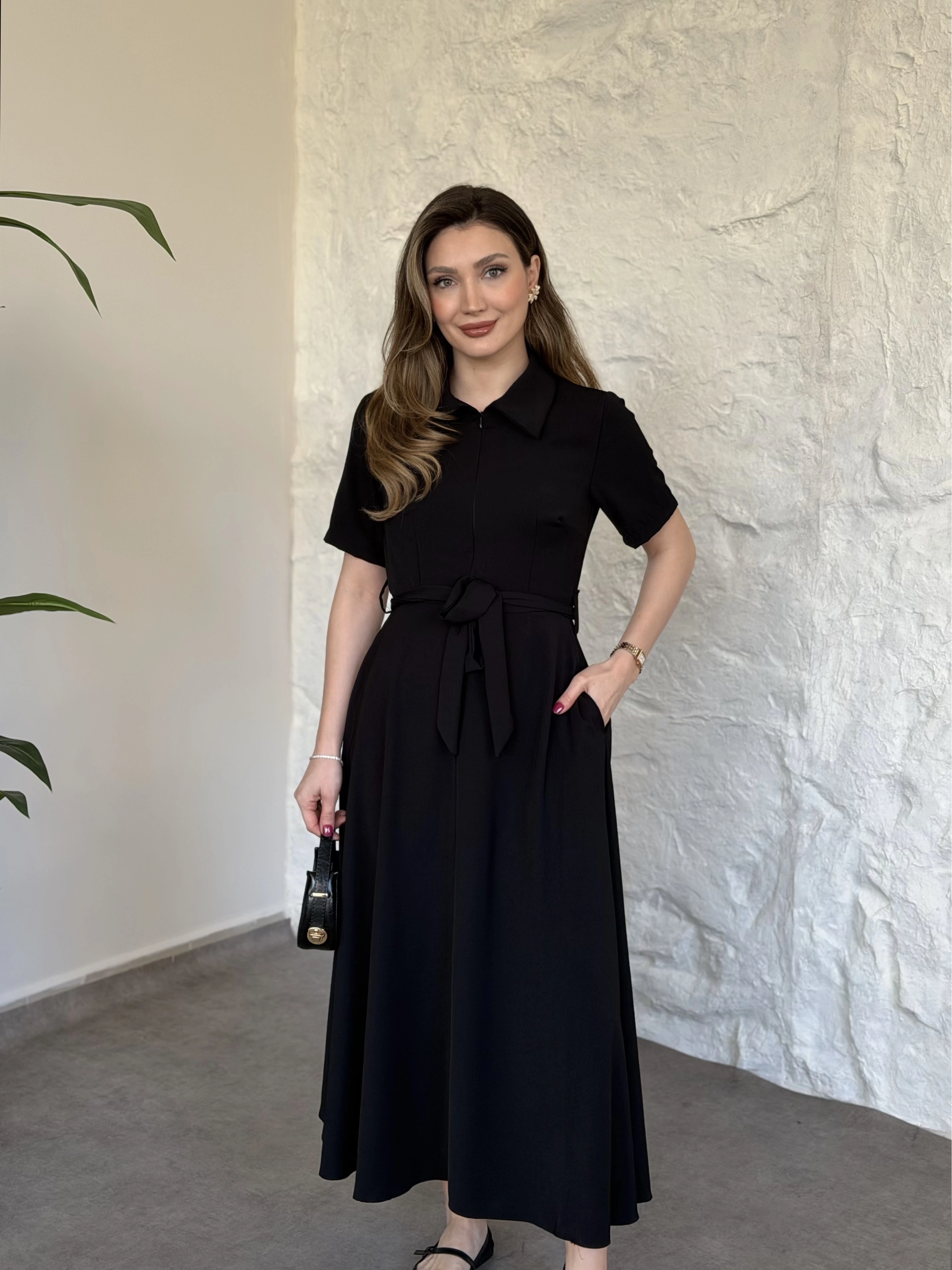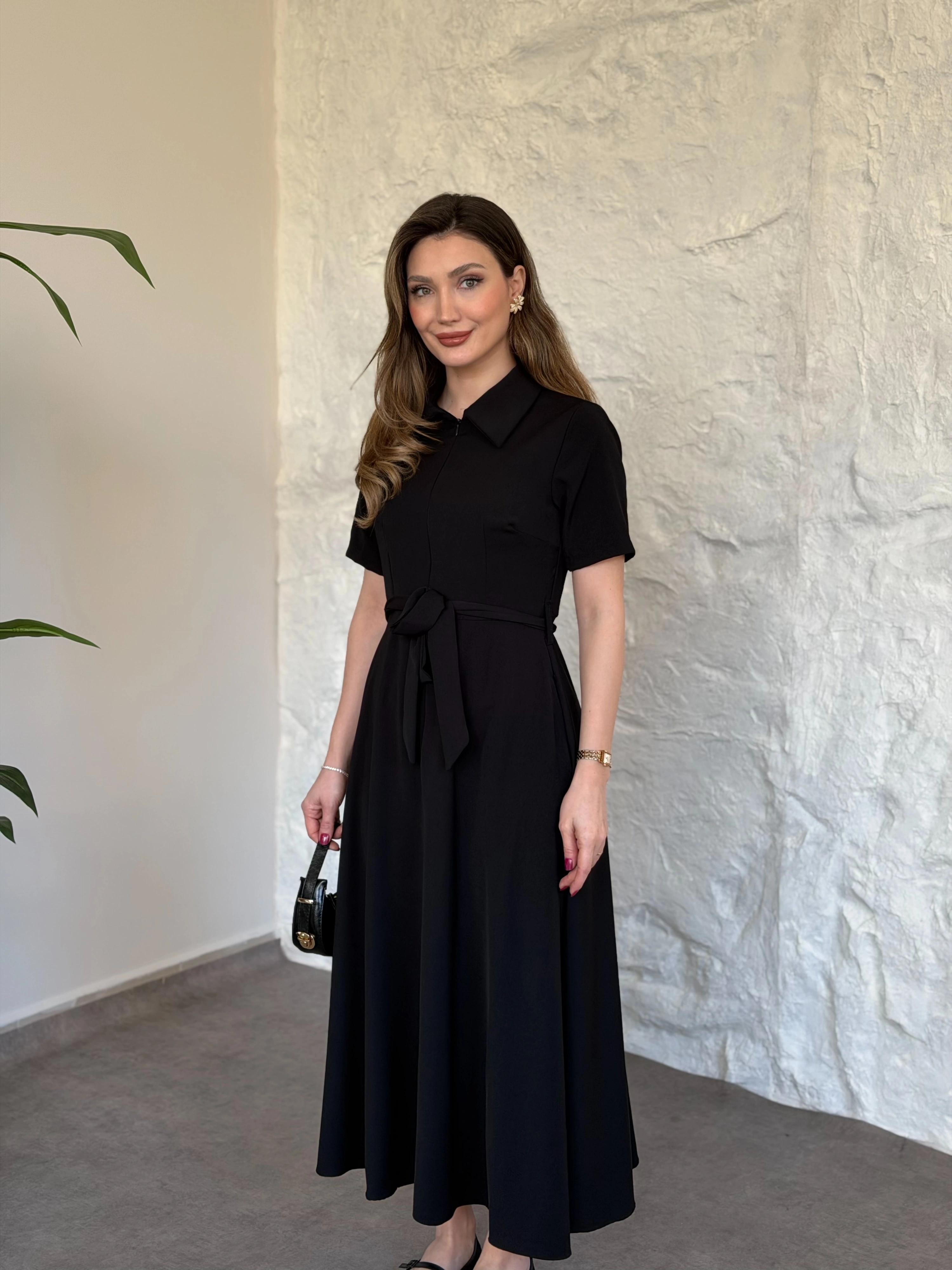 Önden fermuarlı belinden kuşaklı midi elbise siyah