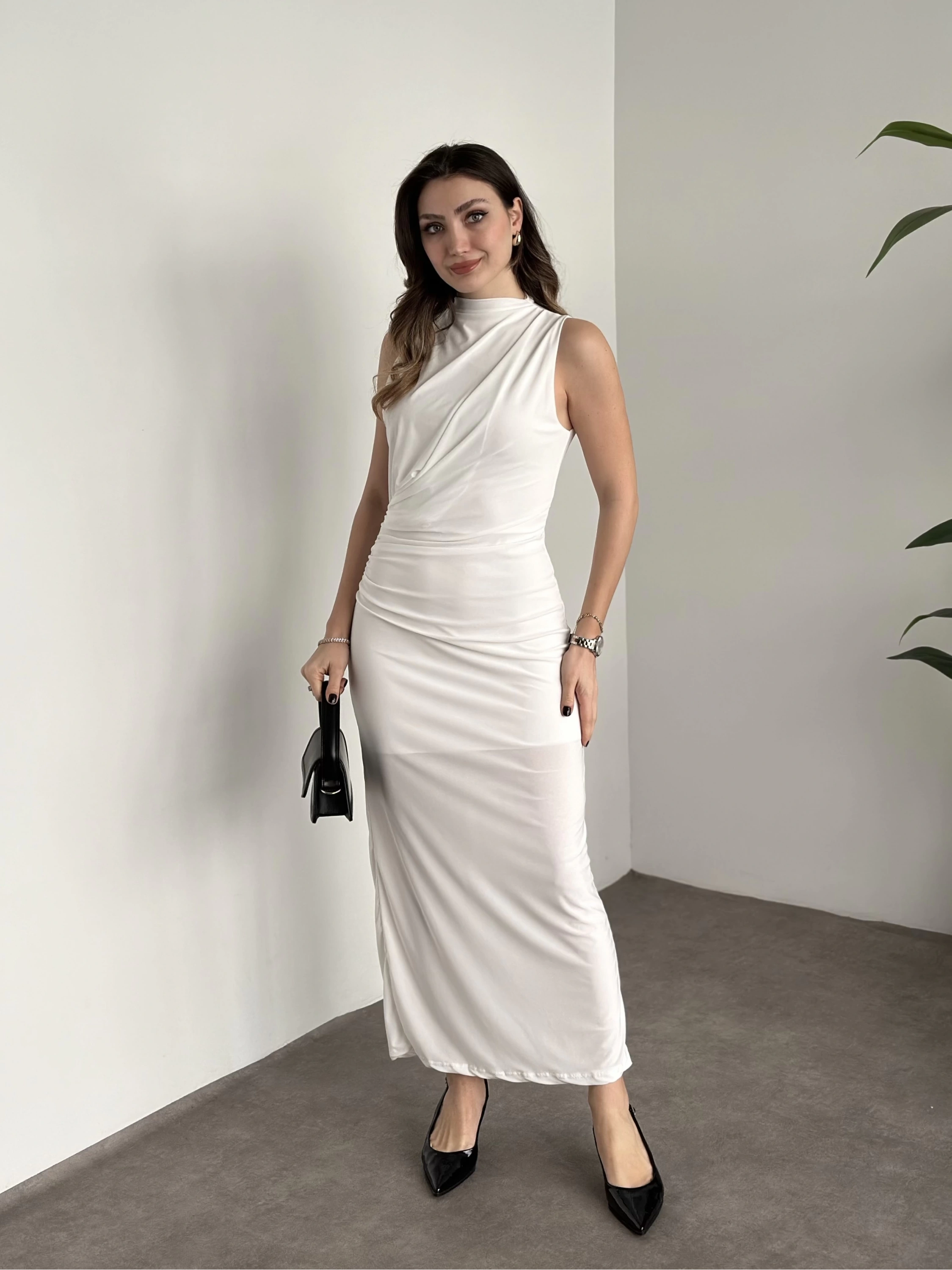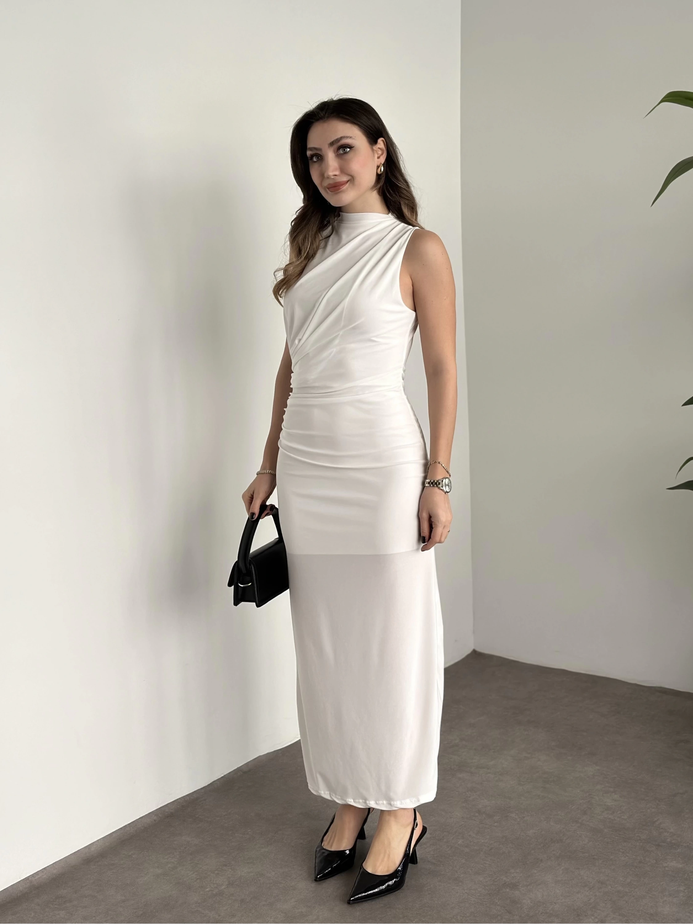Önü büzgülü astarlı ithal sandy kumaş elbise beyaz