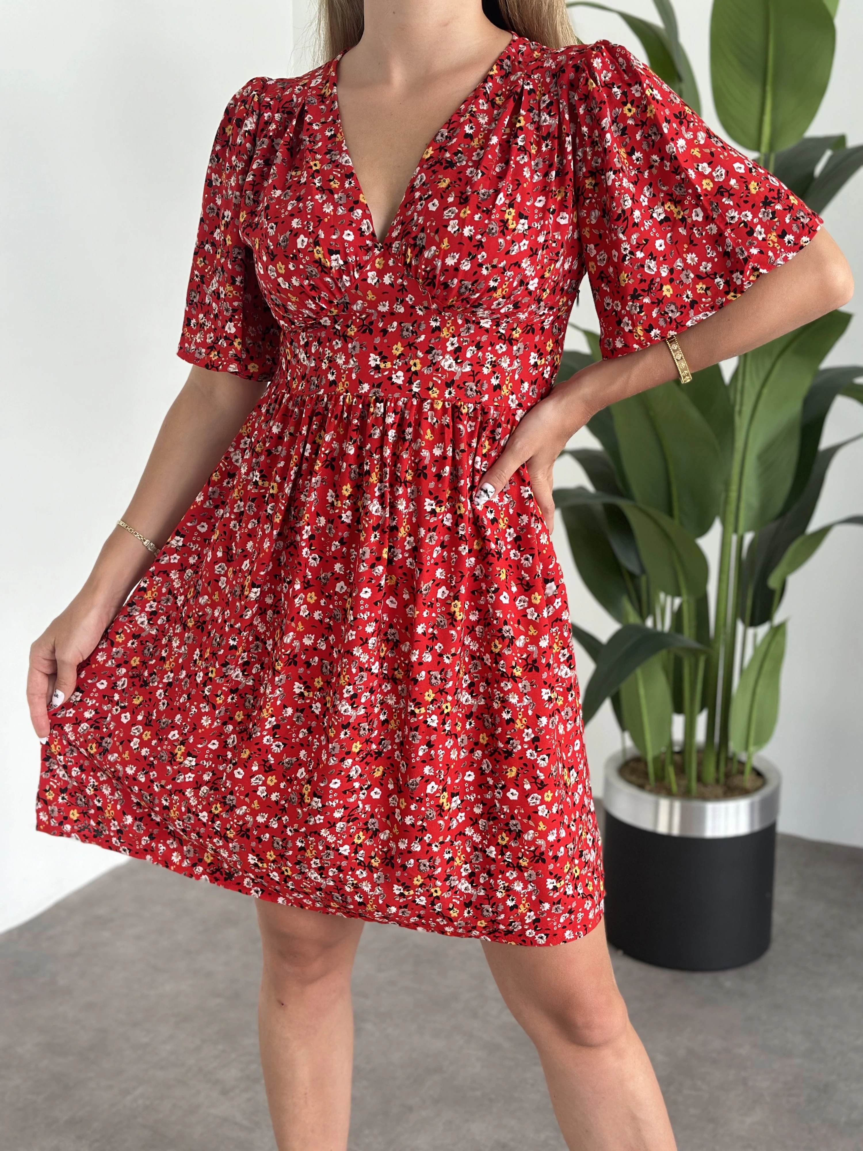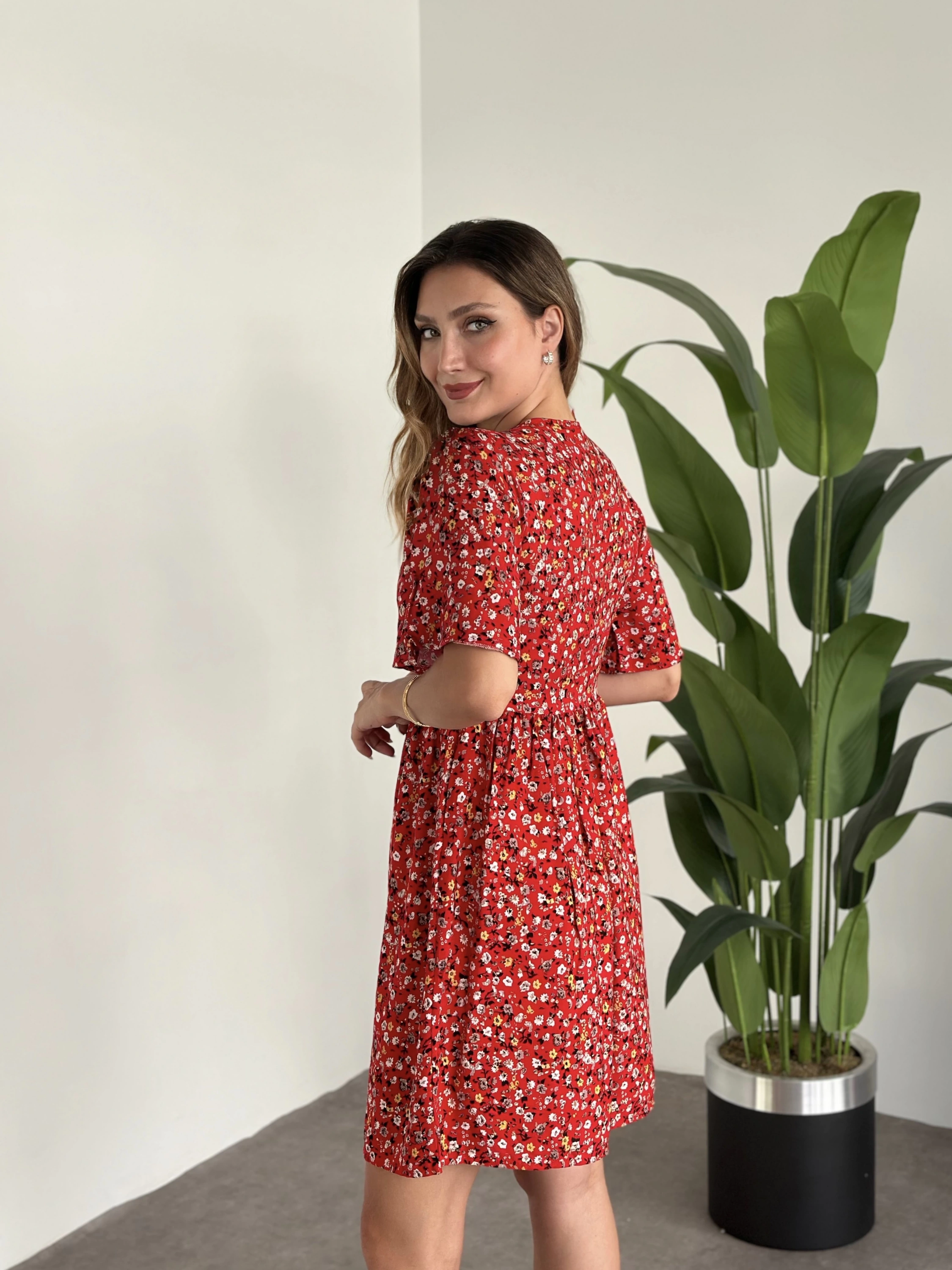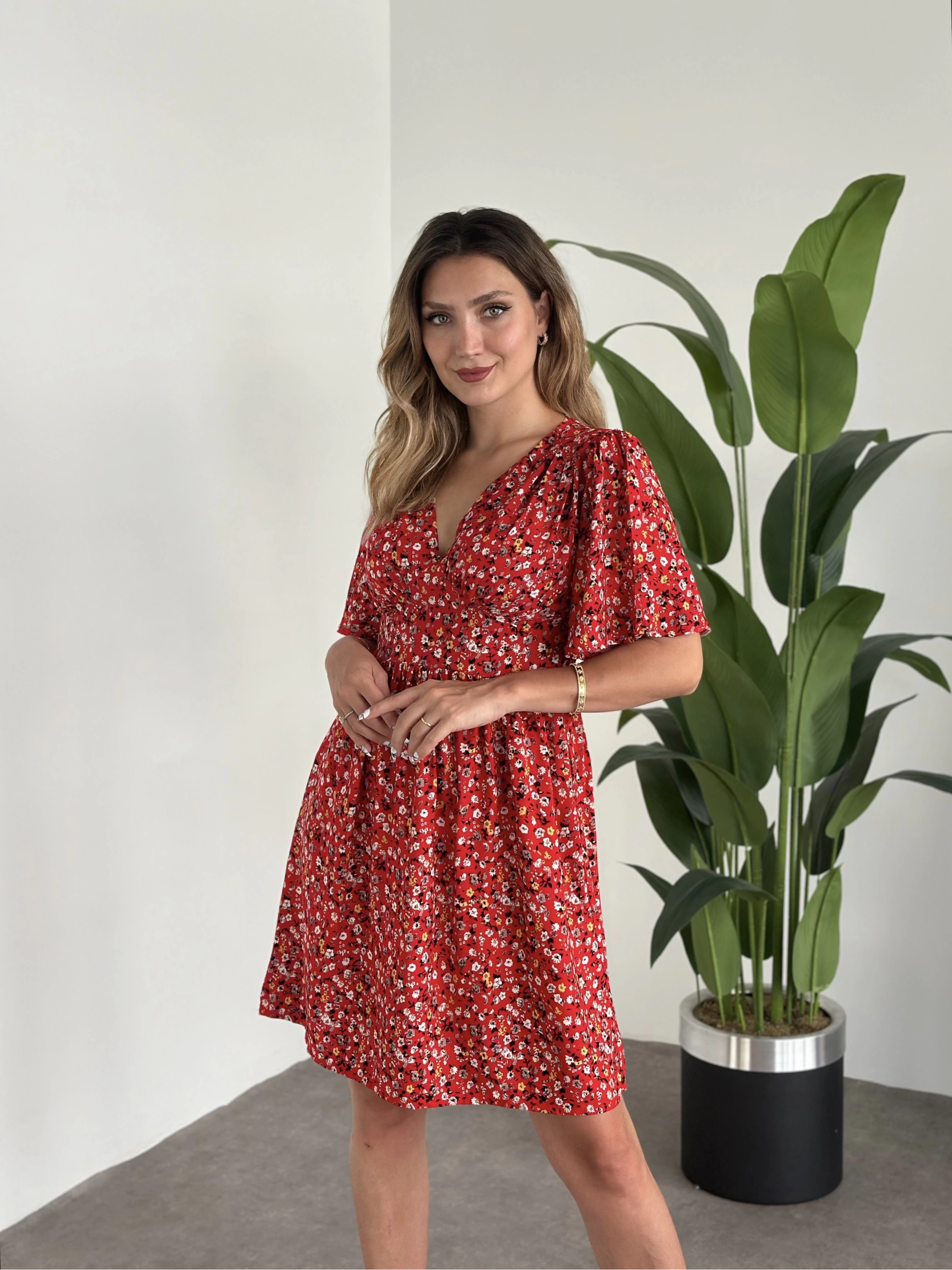 Önü Drapeli Kolları Volanli Pamuklu Viskon Kumaş Elbise Kırmızı Çiçekli