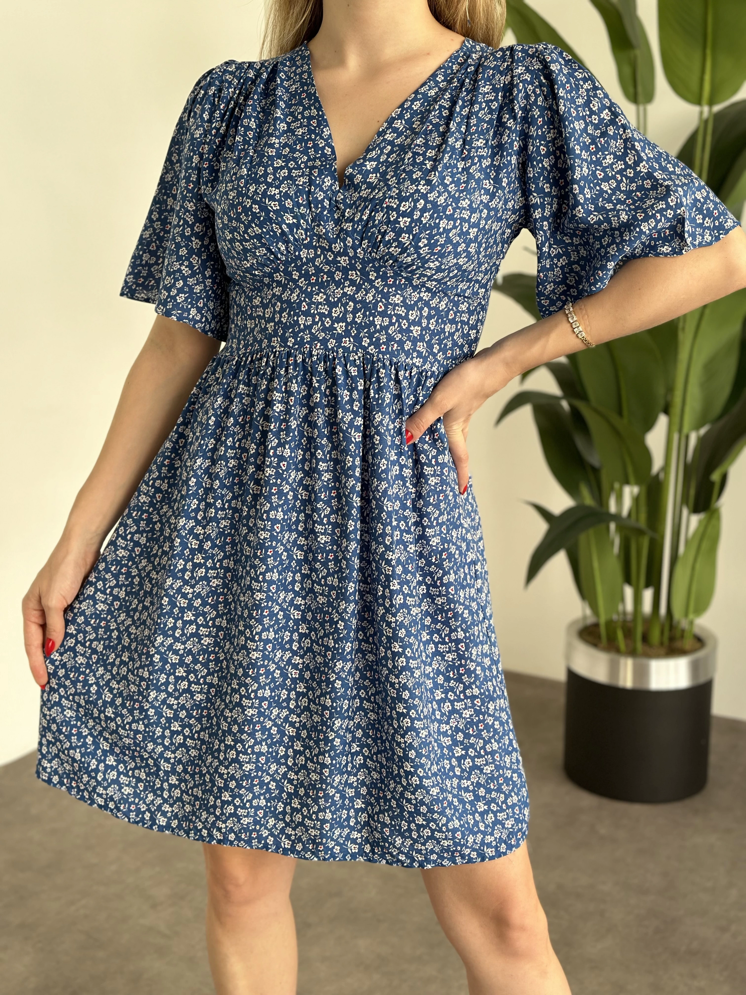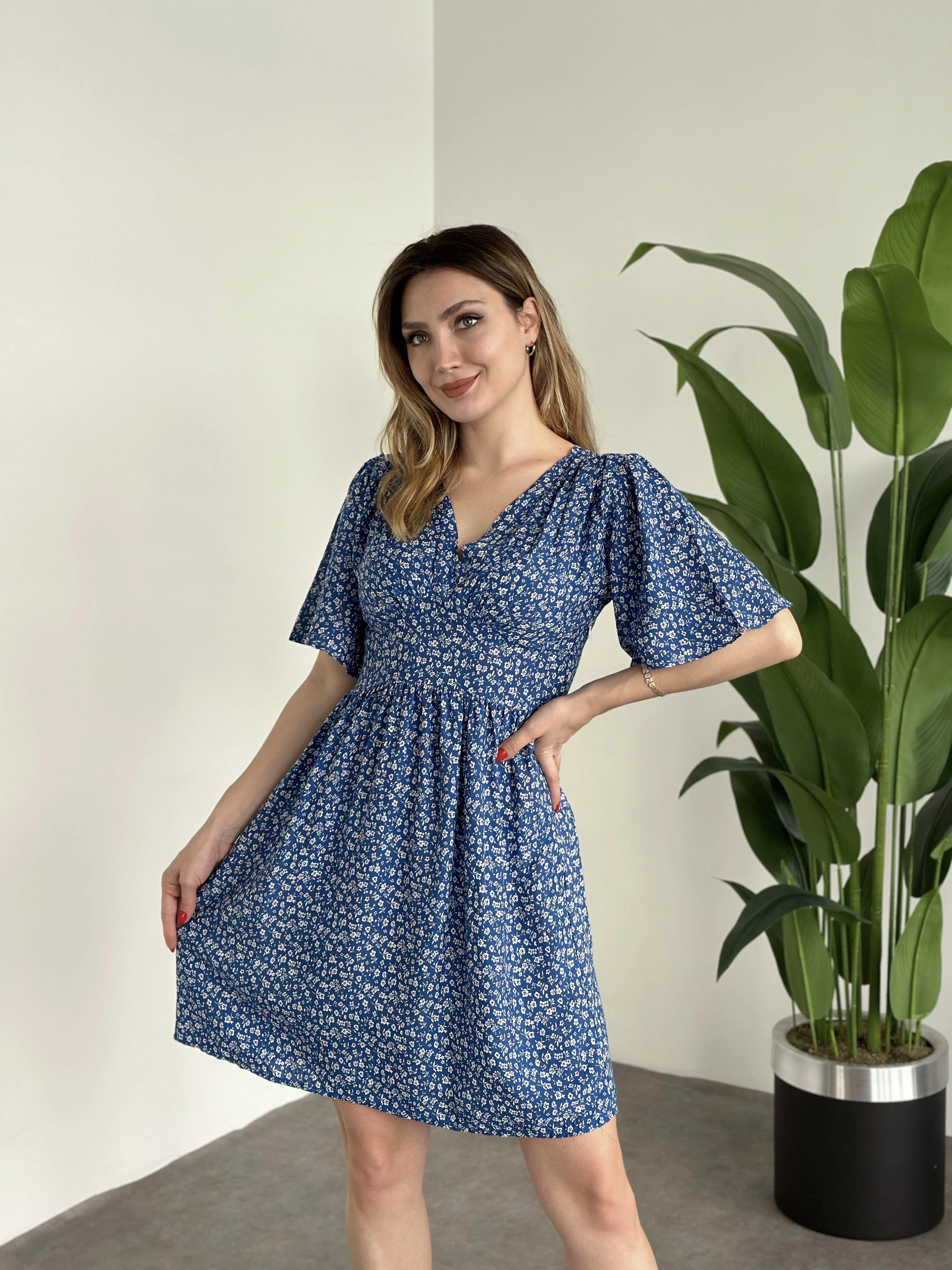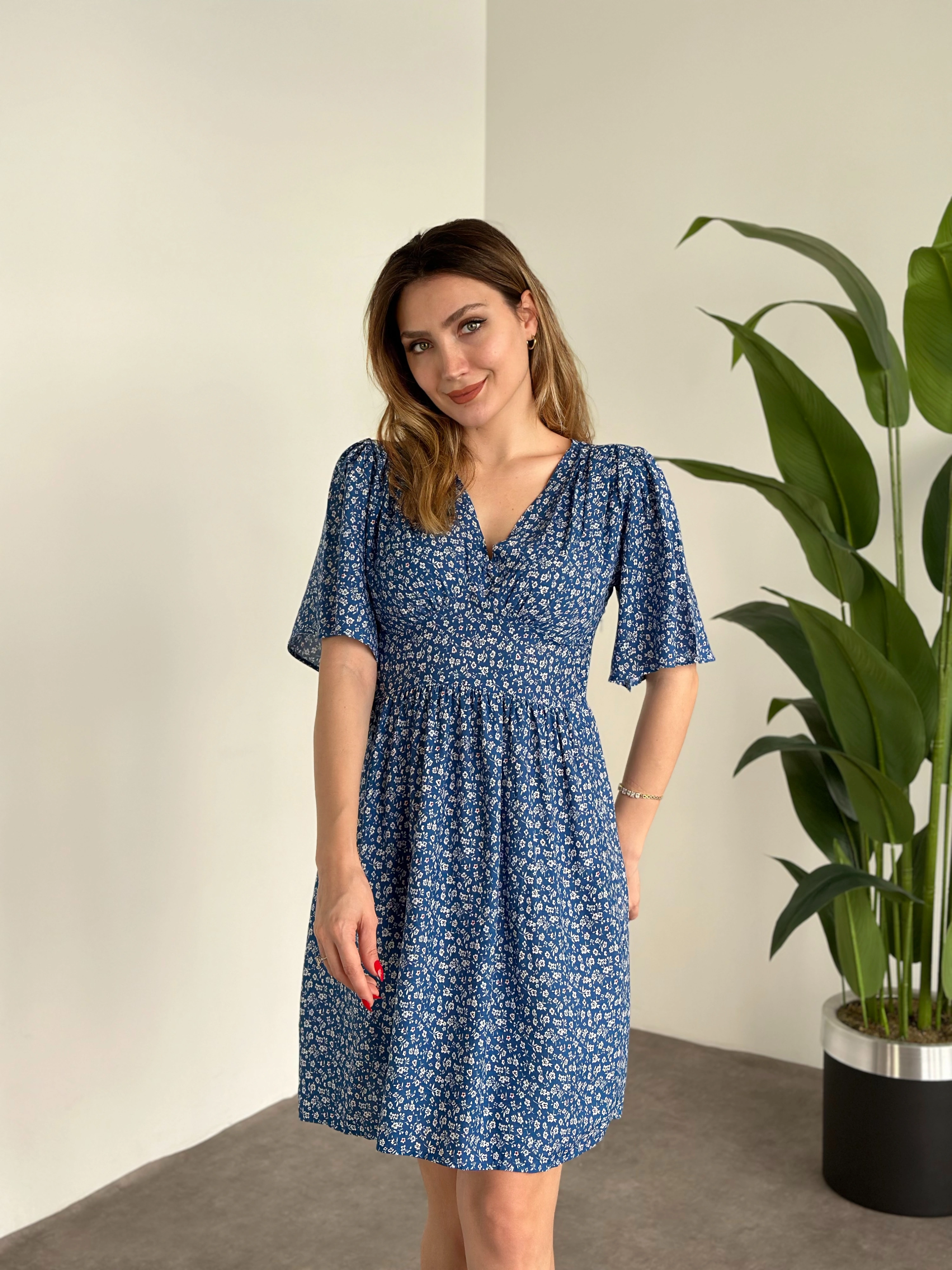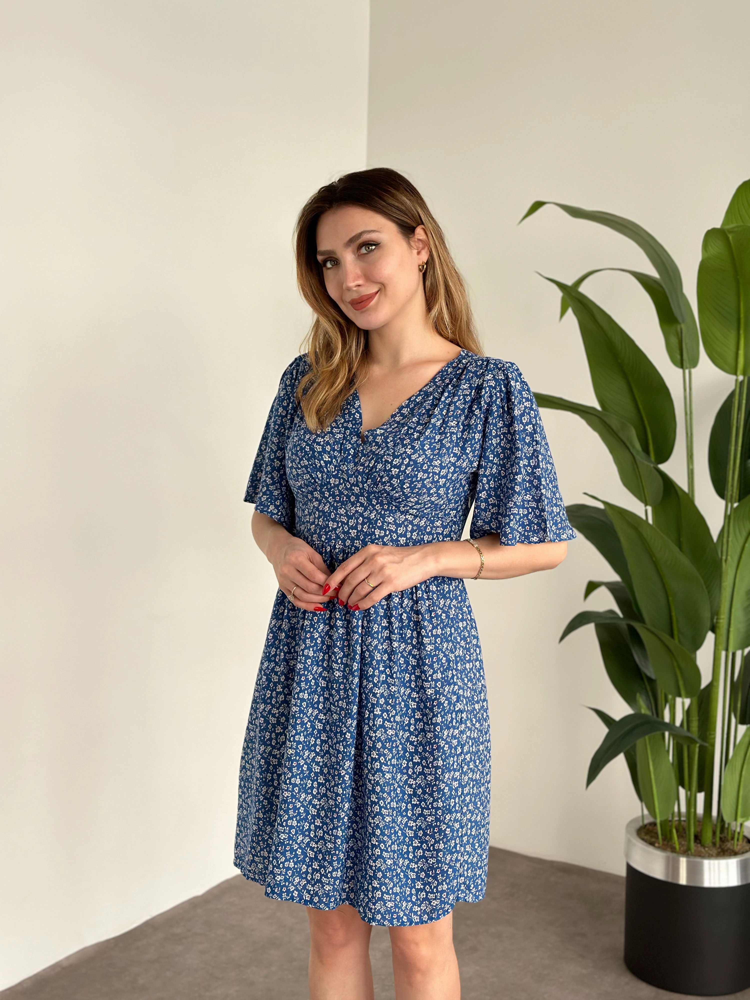 Önü Drapeli Kolları Volanli Pamuklu Viskon Kumaş Elbise Mavi Küçük Çiçek