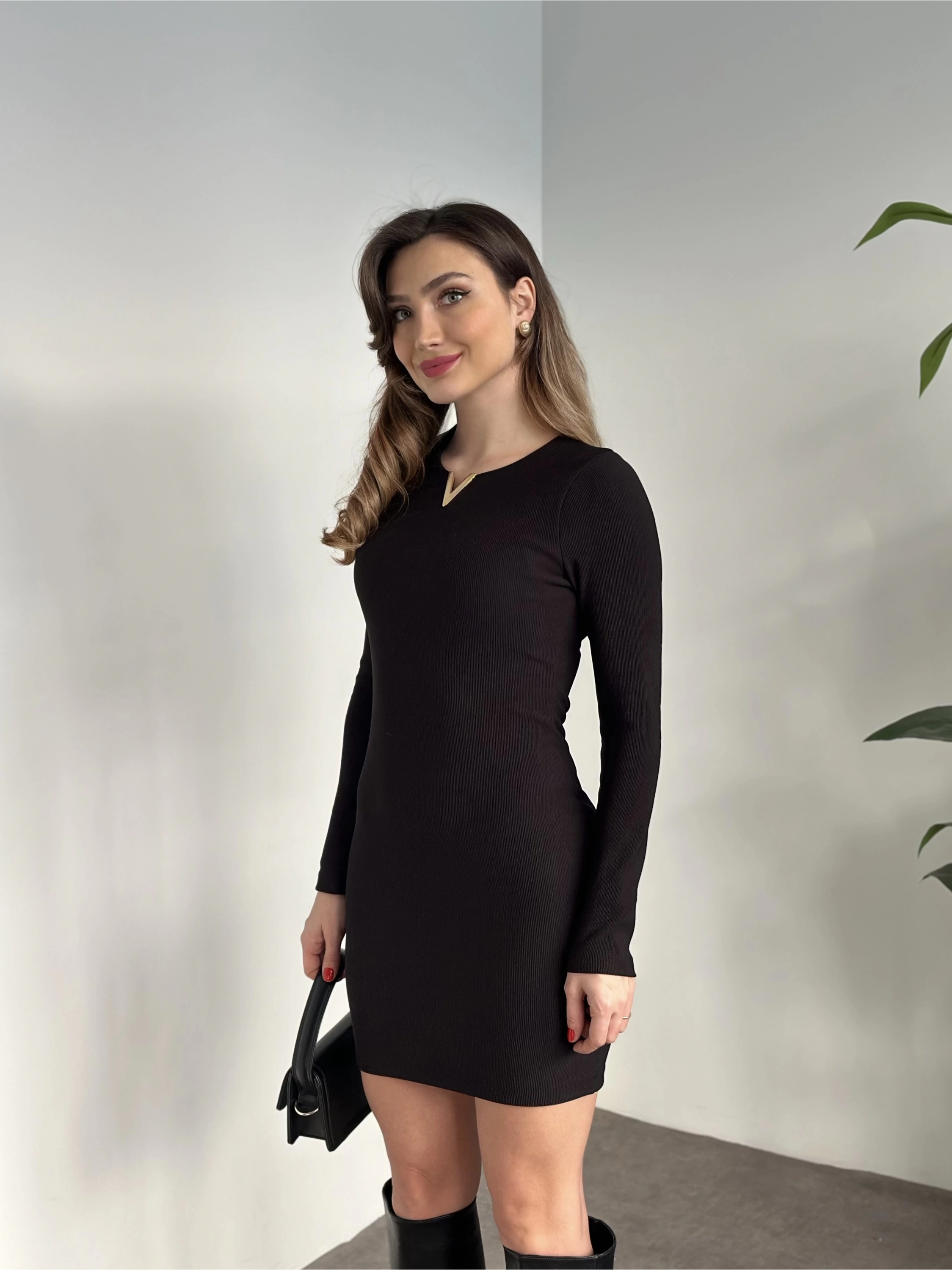 Ottoman kumaş yaka detaylı elbise siyah