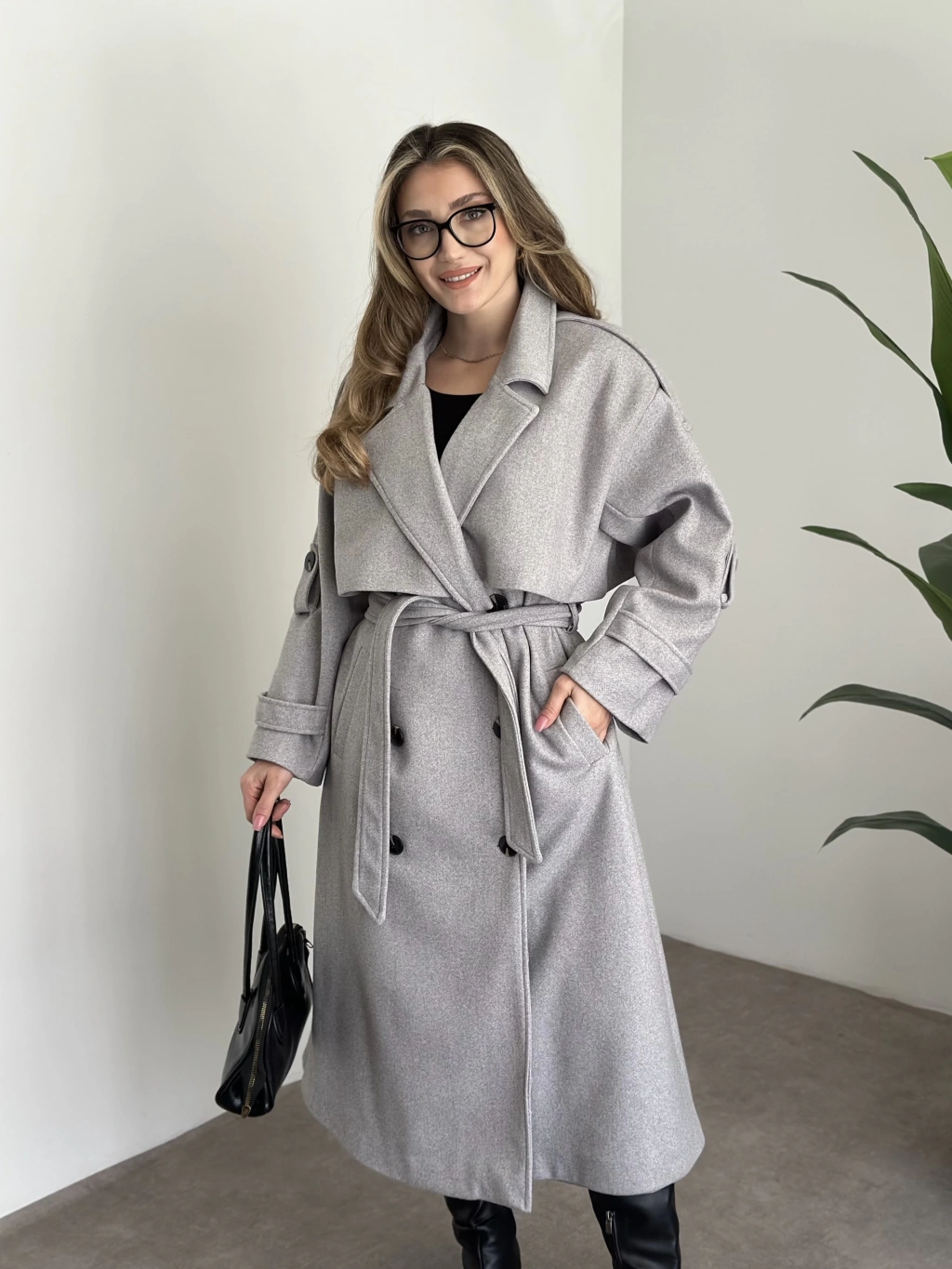 Oversize düğmeli astarlı bağlamalı kaşe kaban gri