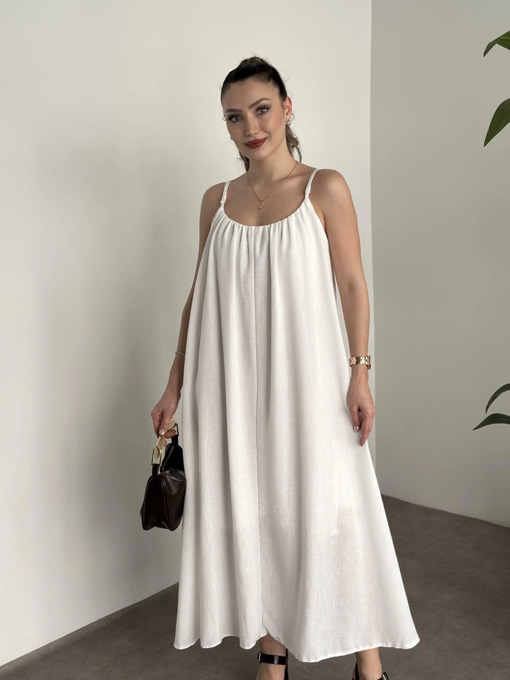 Sırt dekolteli askılı keten elbise yağ yeşili