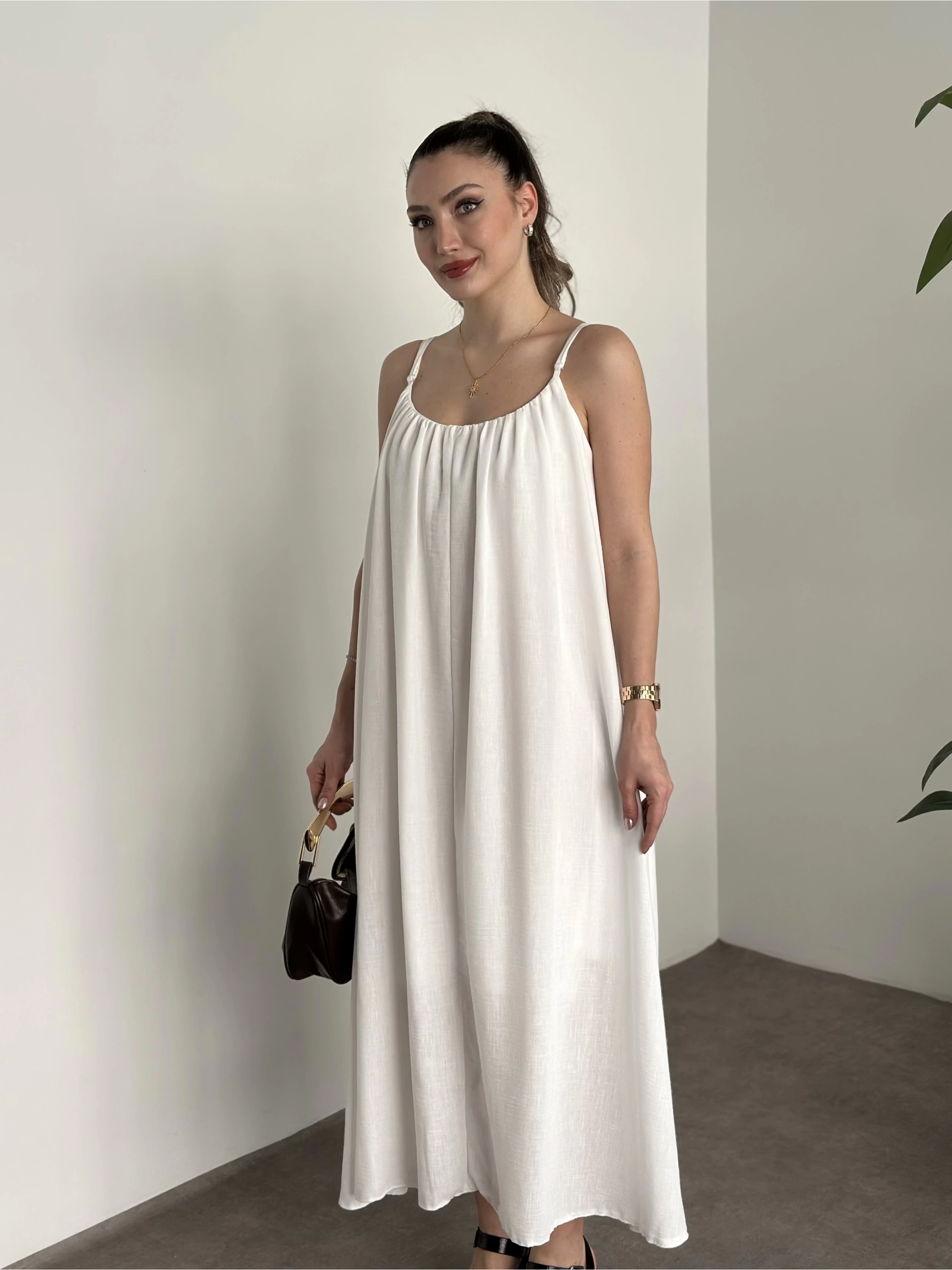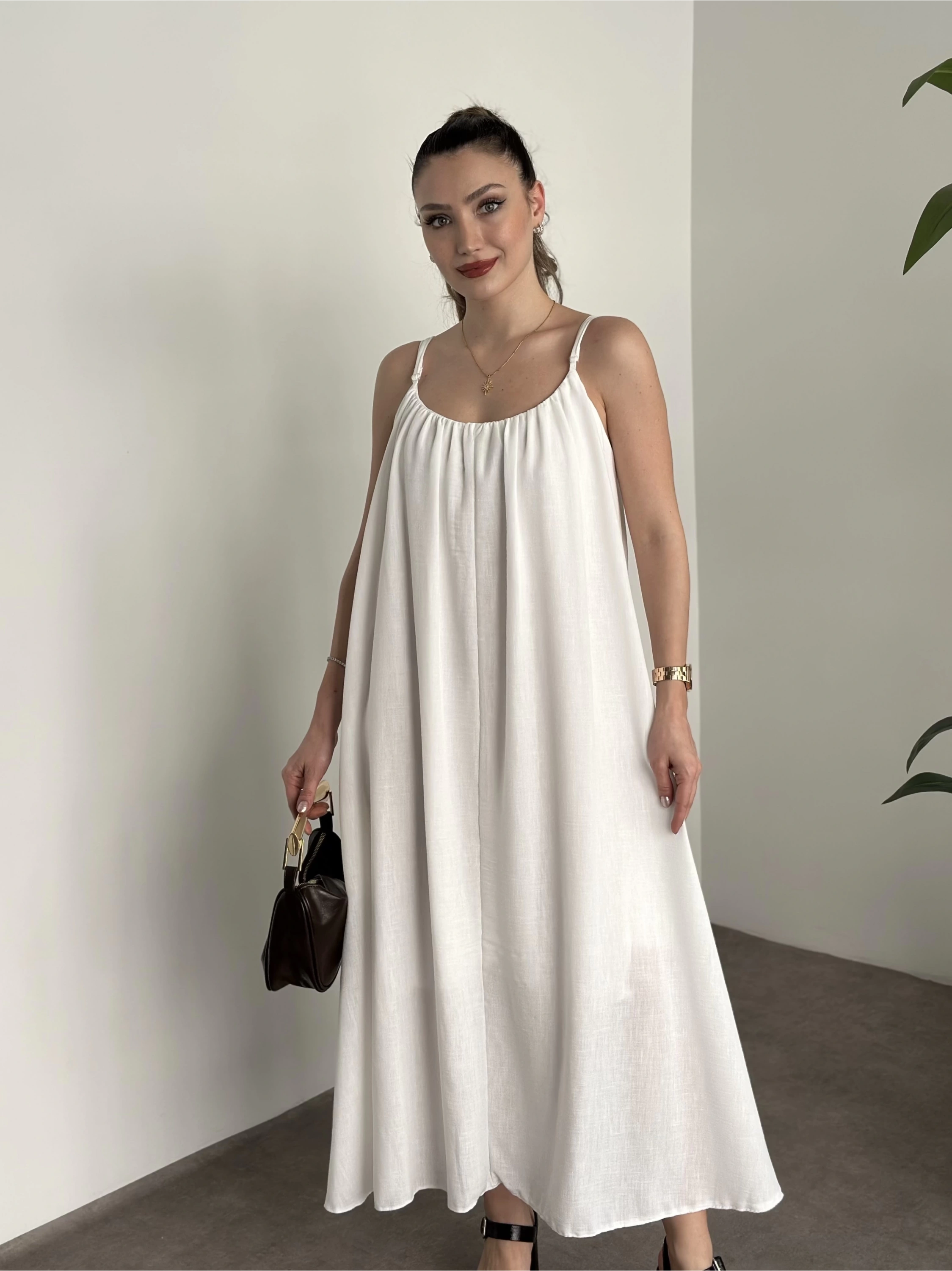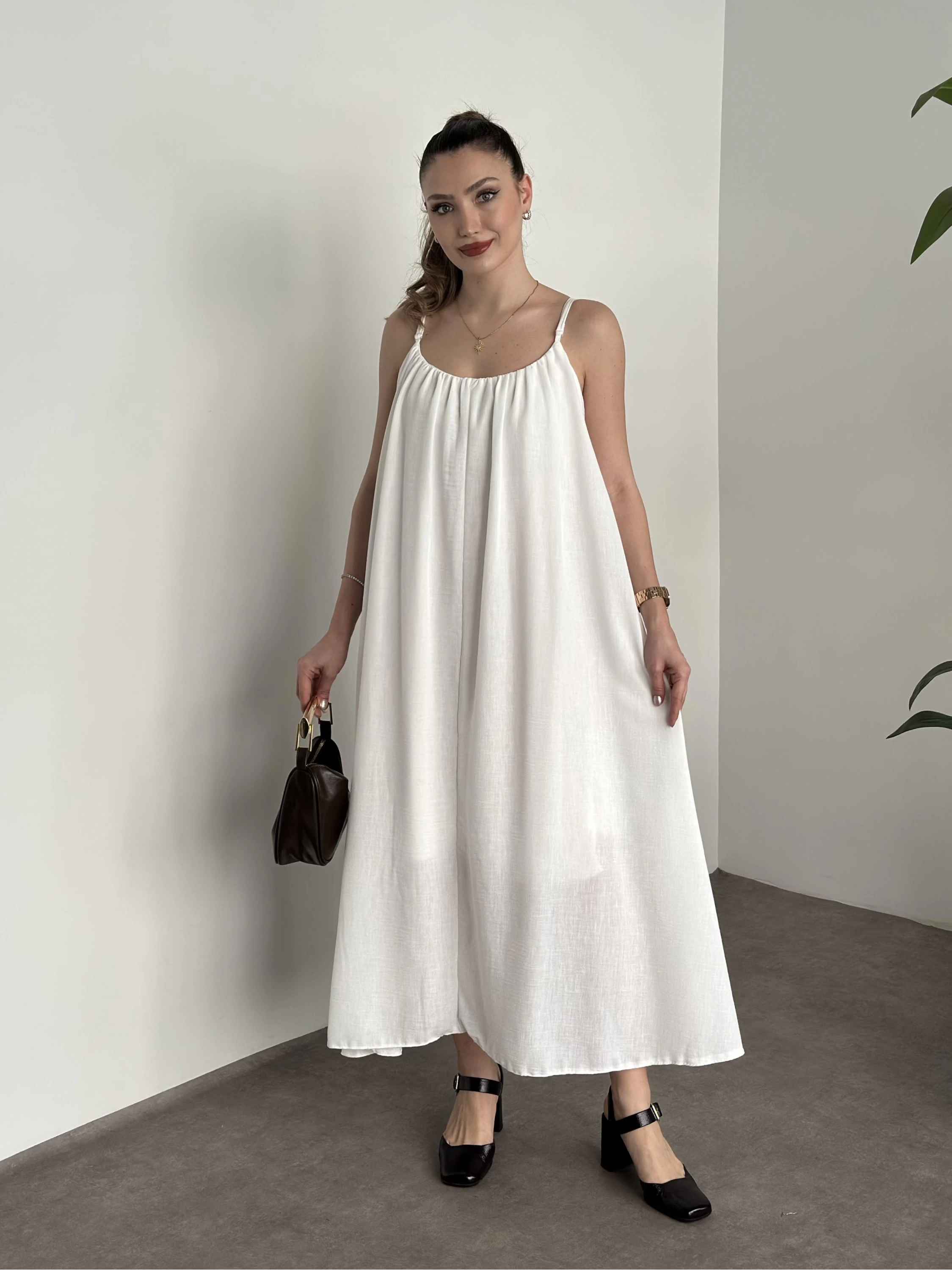 Oversize salaş askılı keten elbise beyaz