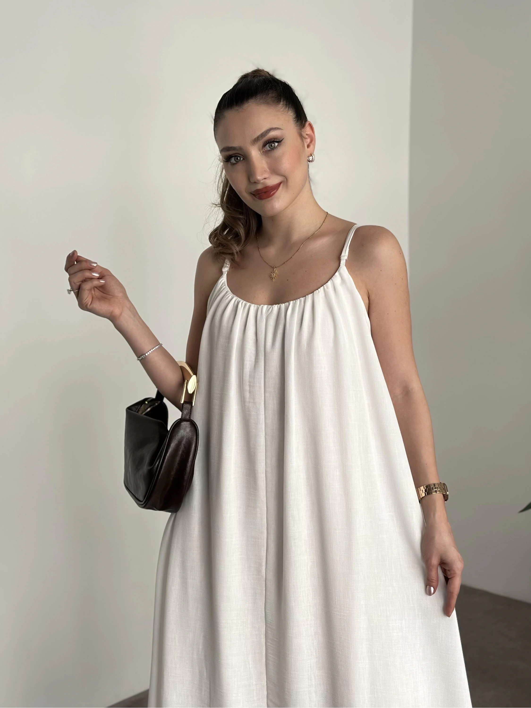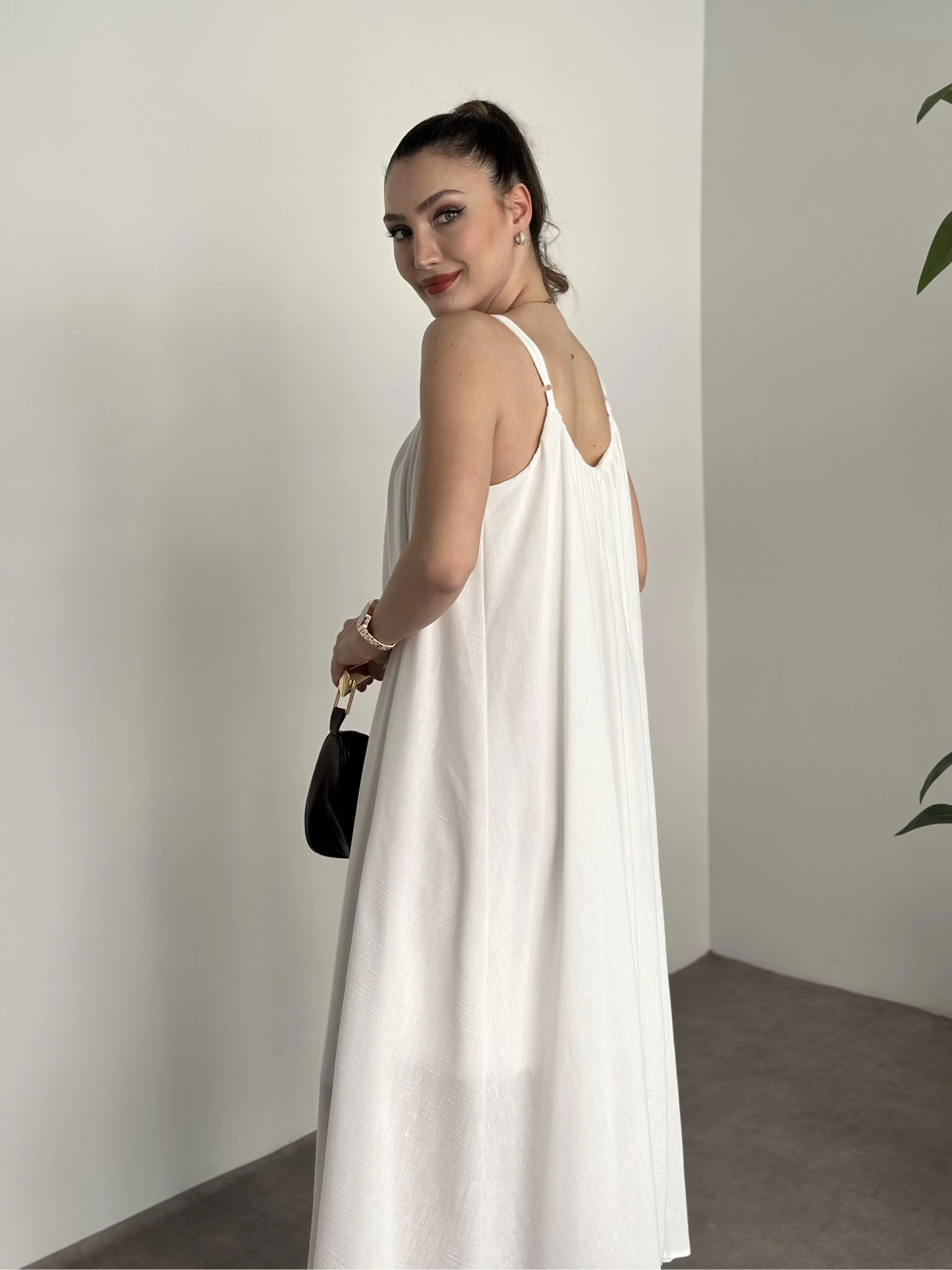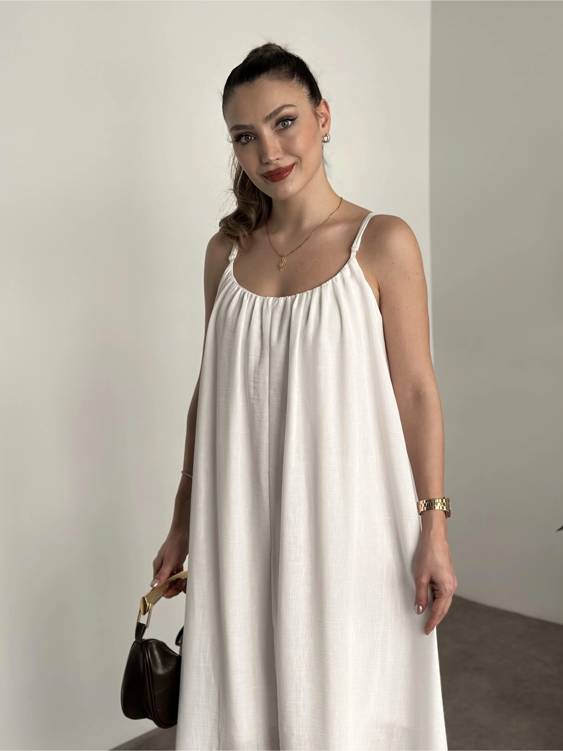 Oversize salaş askılı keten elbise beyaz
