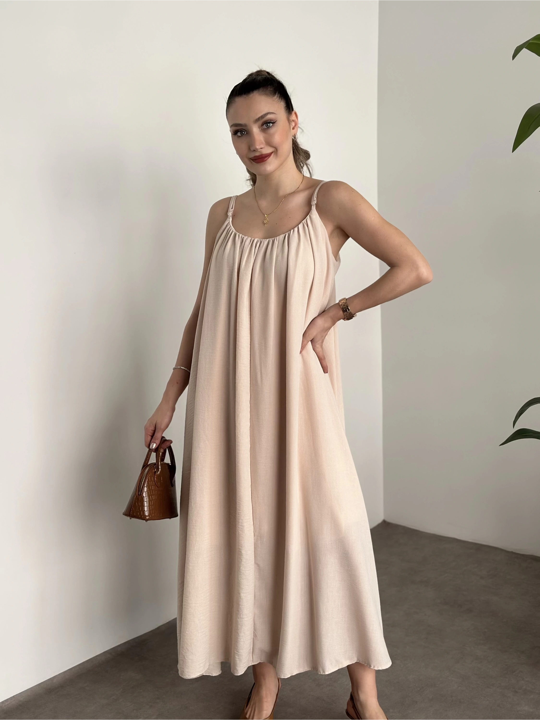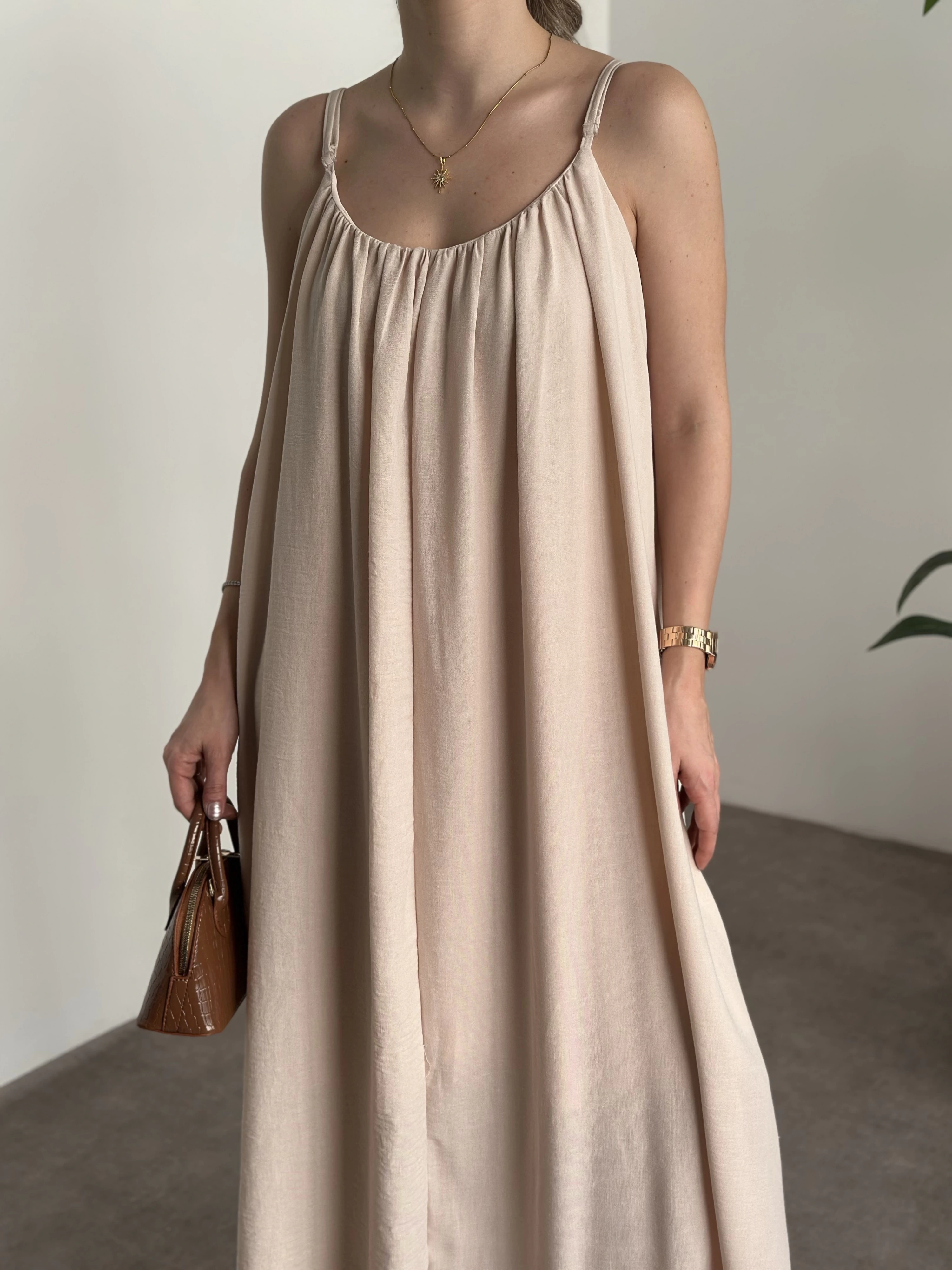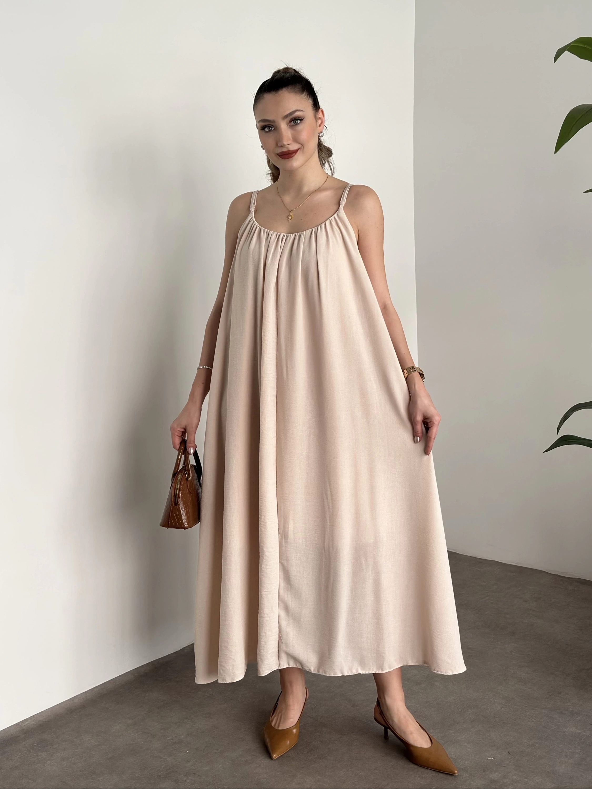 Oversize salaş askılı keten elbise krem