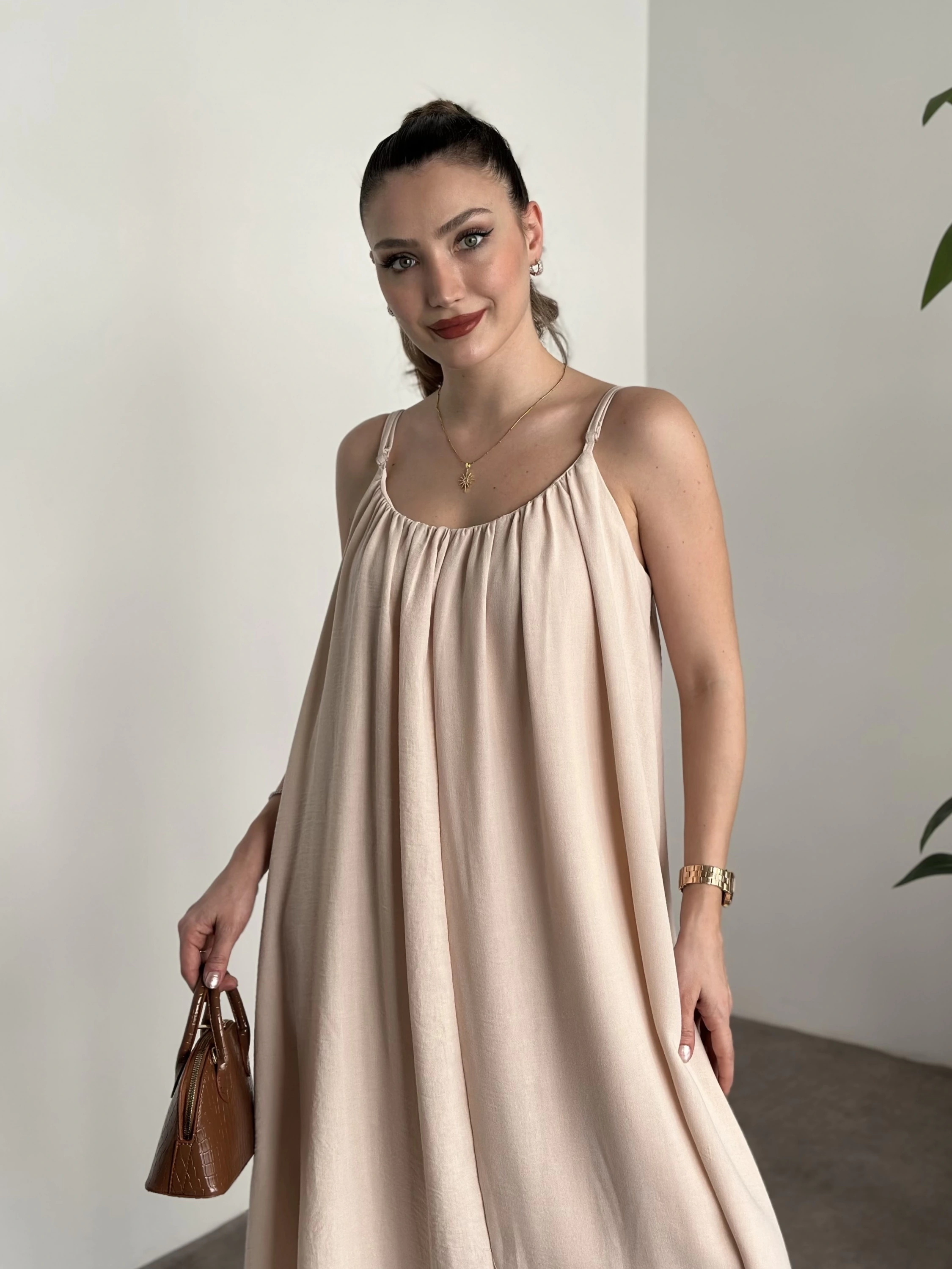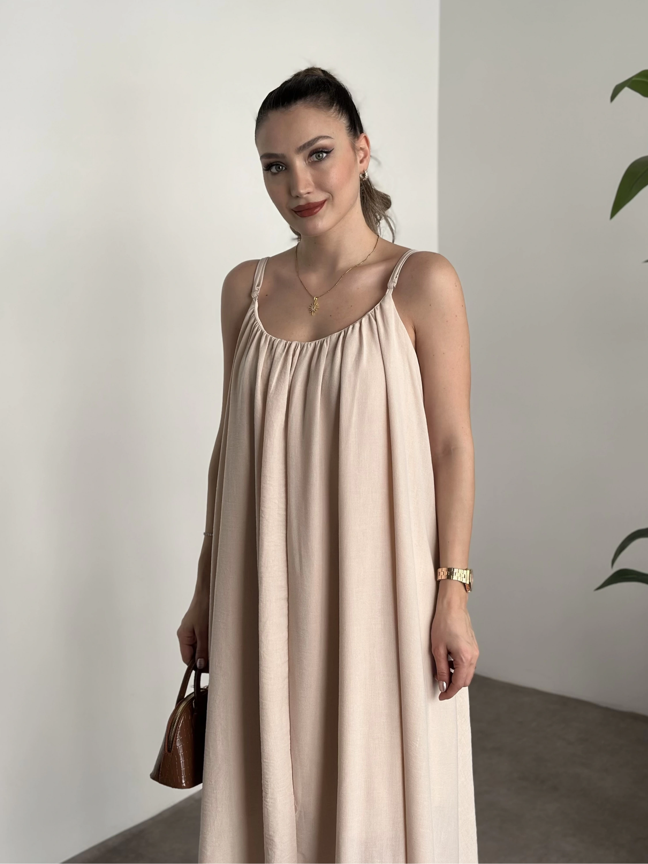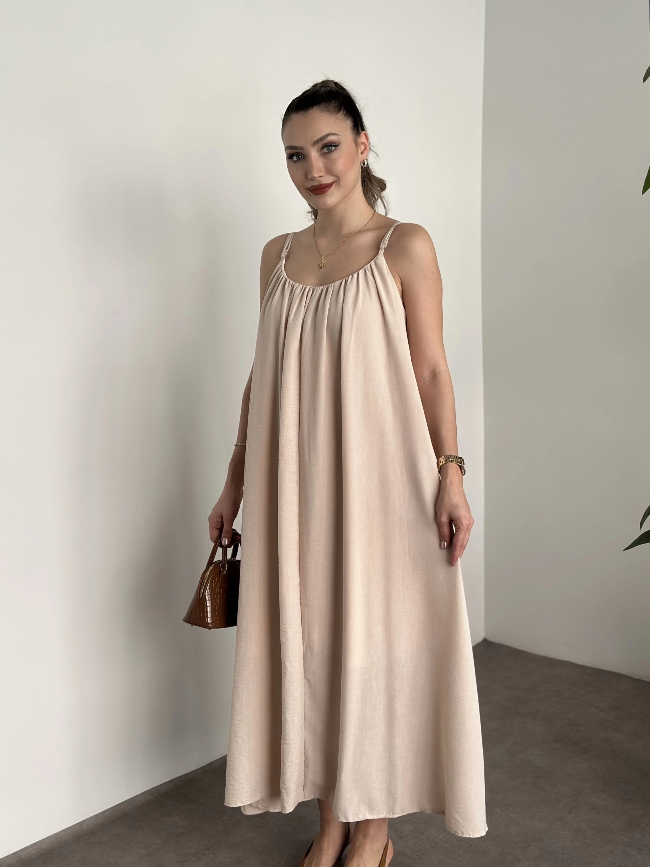Oversize salaş askılı keten elbise krem