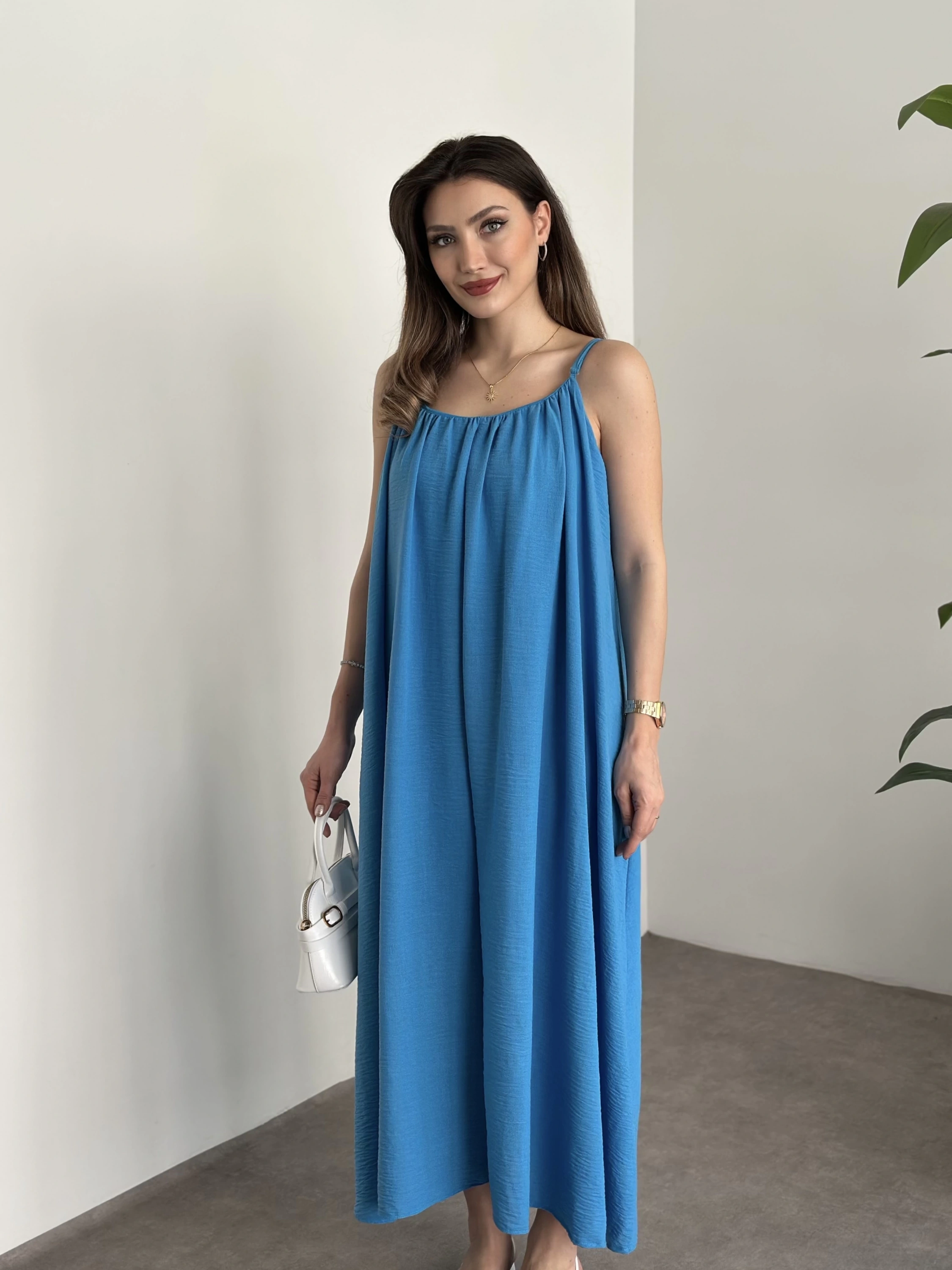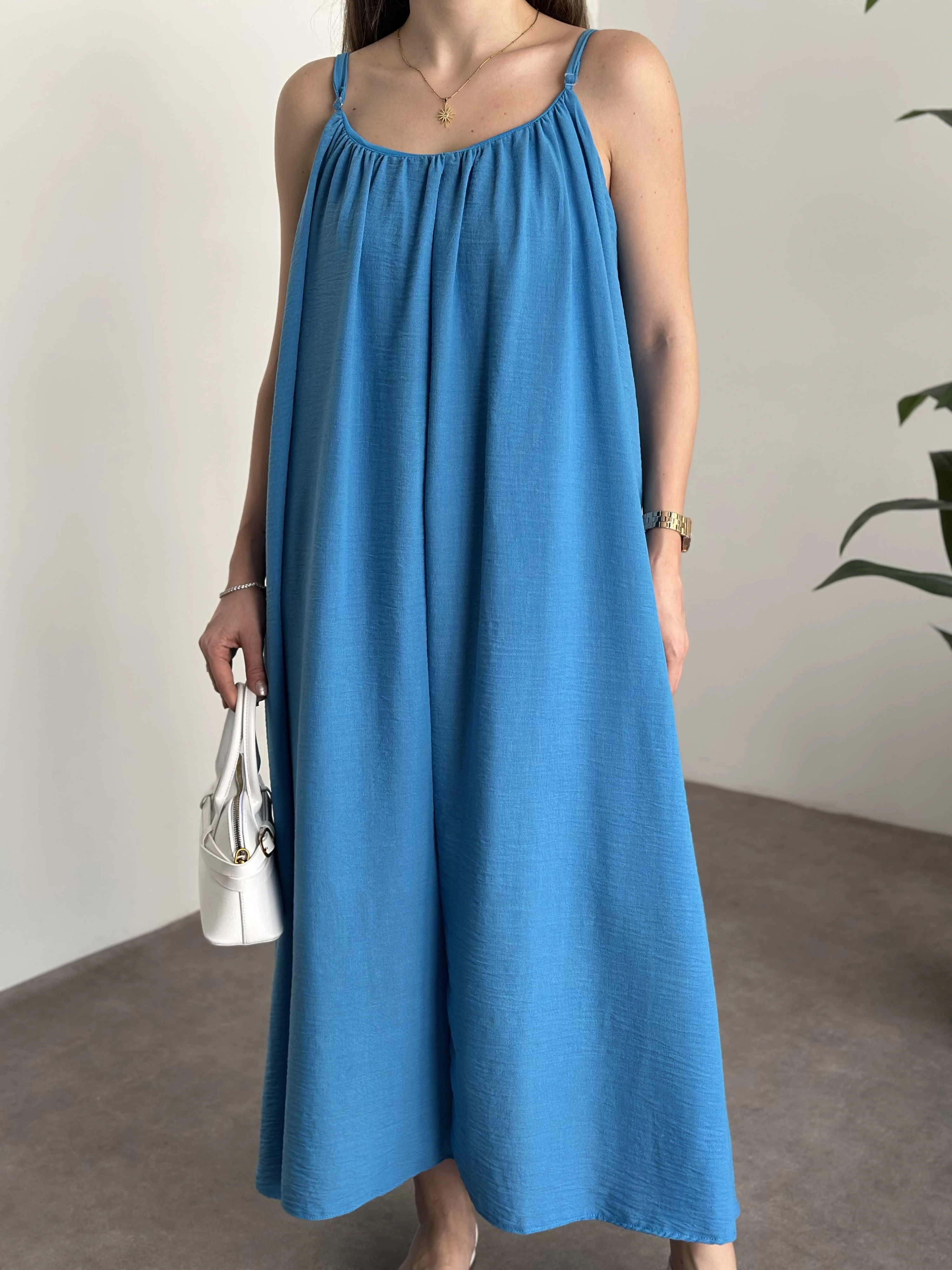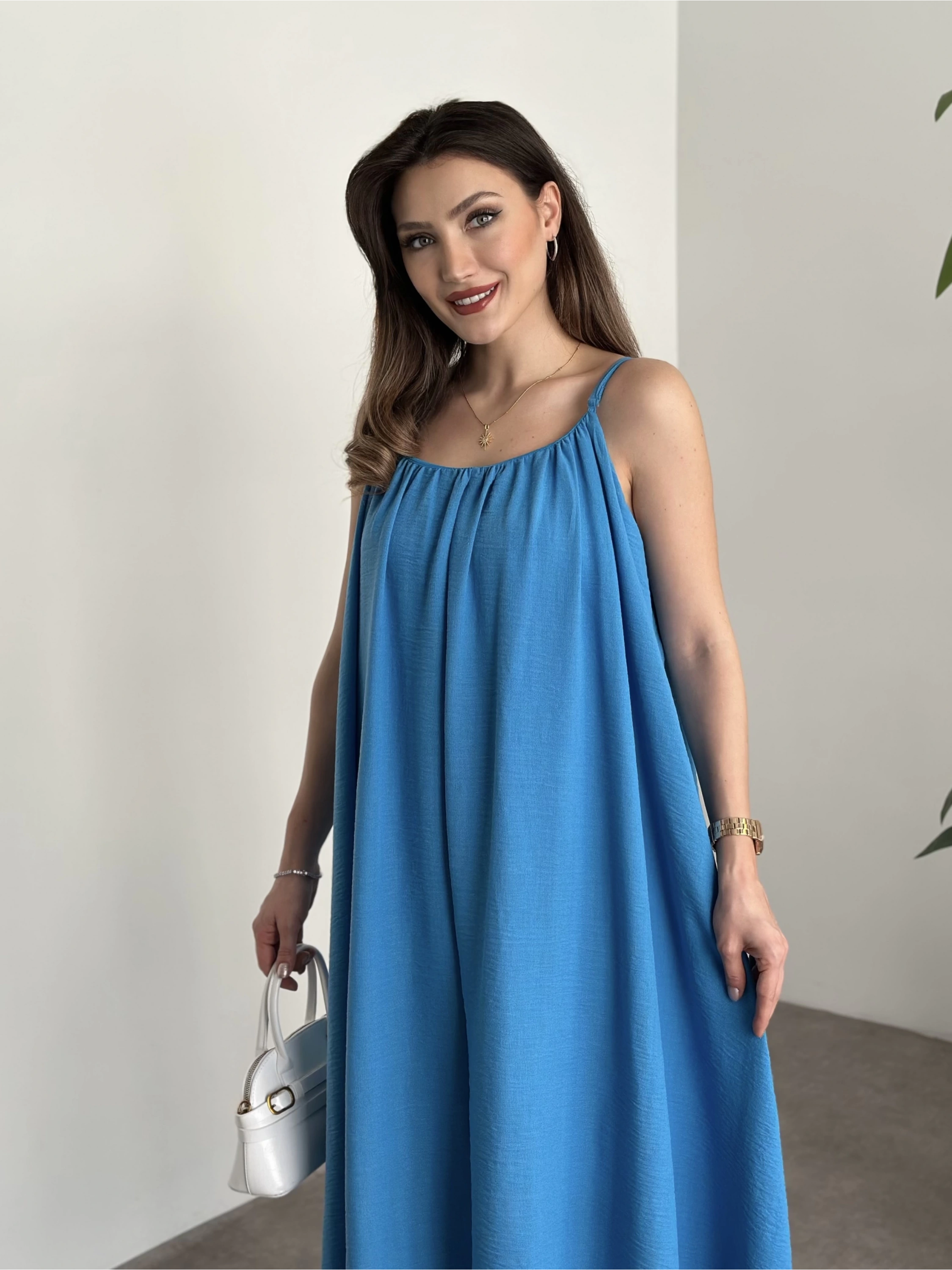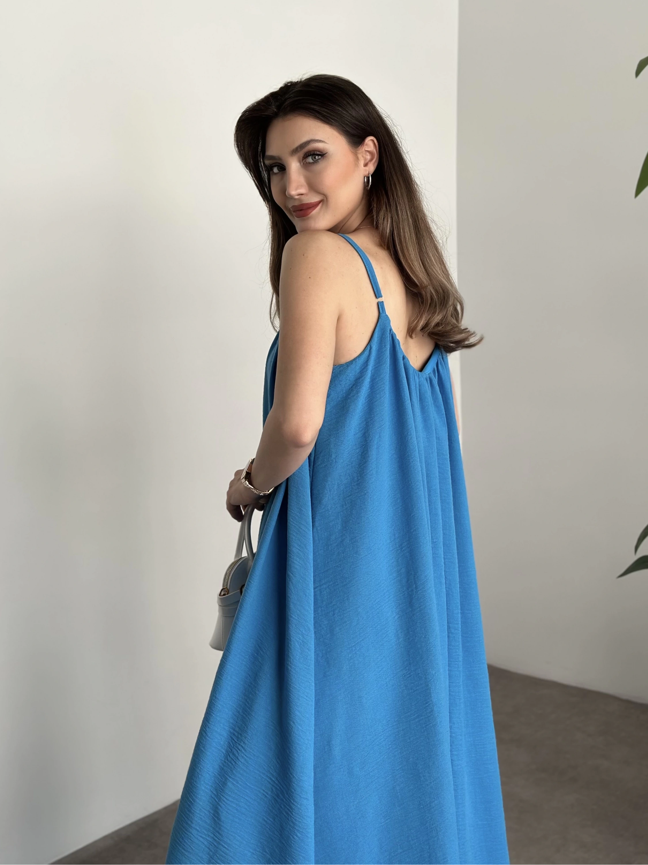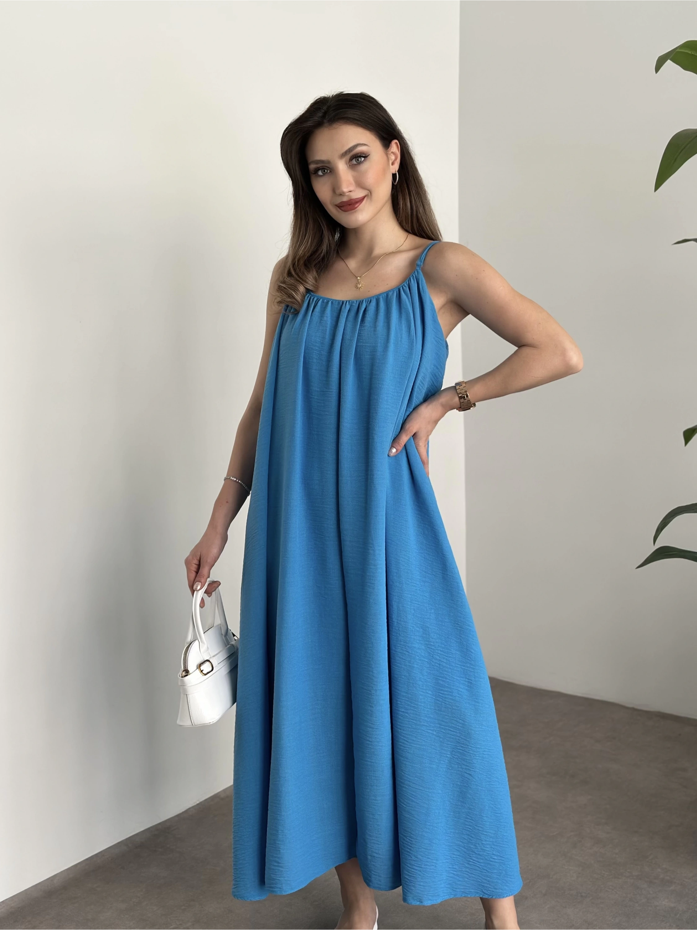 Sırt dekolteli askılı keten elbise bebek mavisi