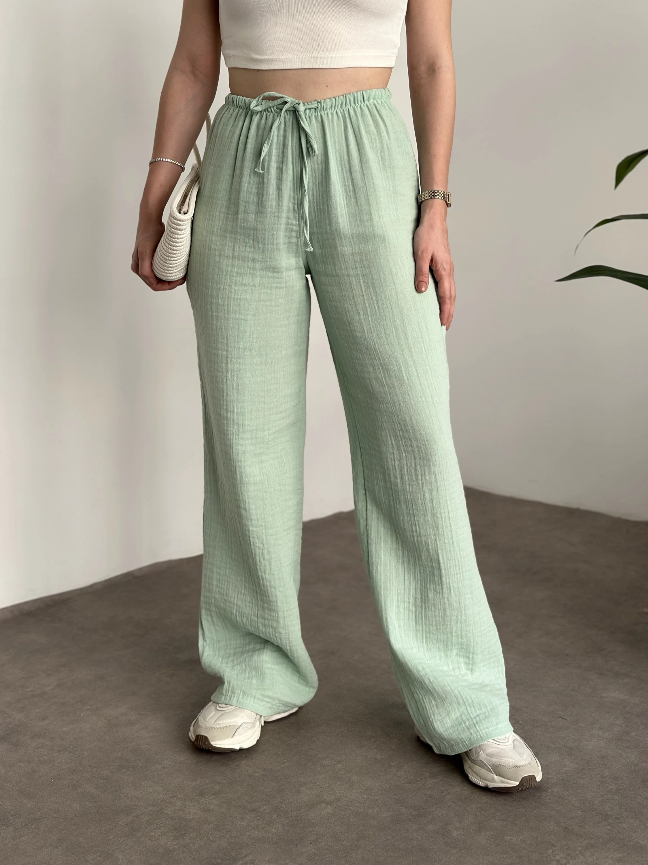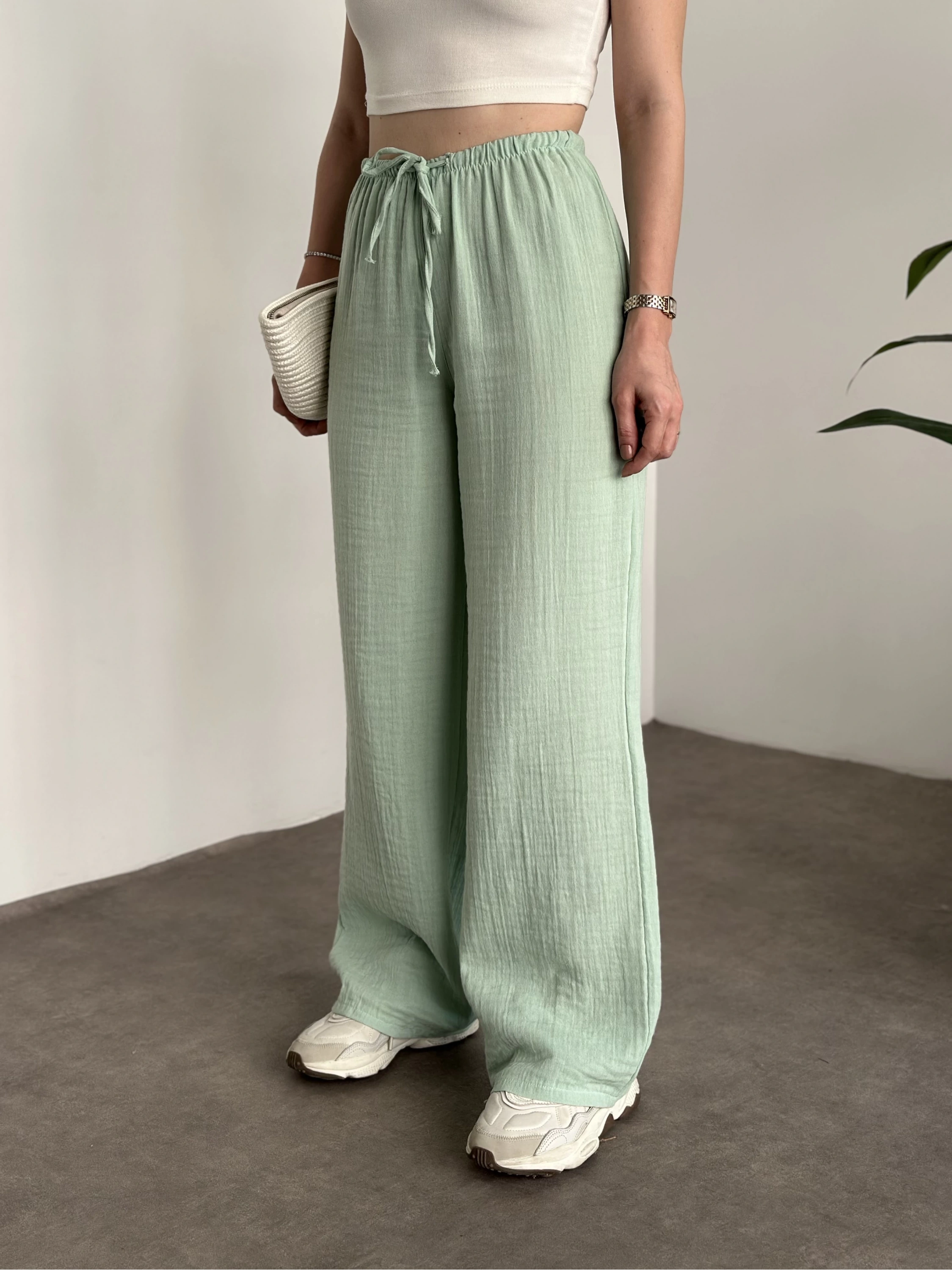 Pamuklu keten şalvar pantolon yeşil