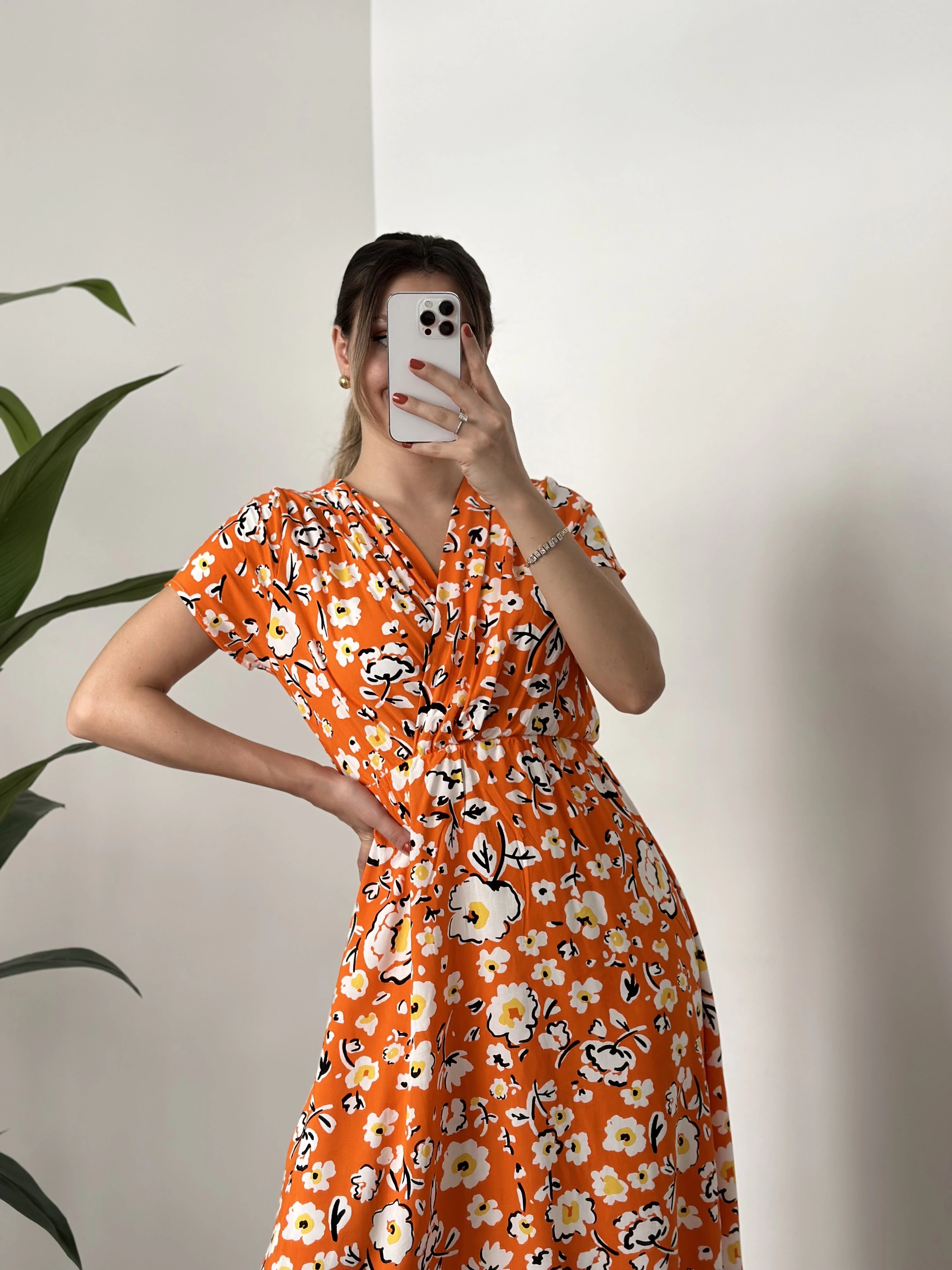 Sırt dekolteli askılı keten elbise yağ yeşili