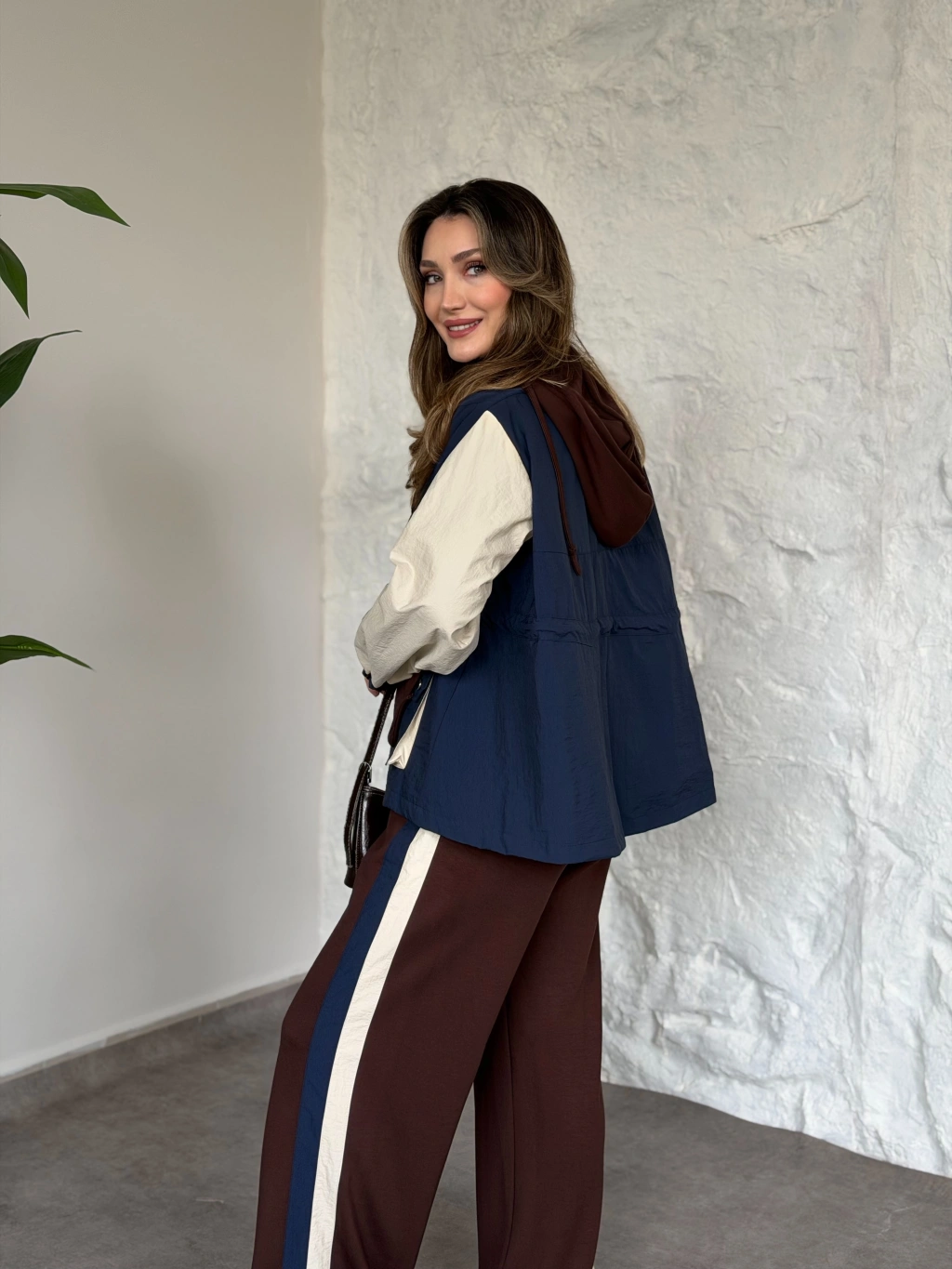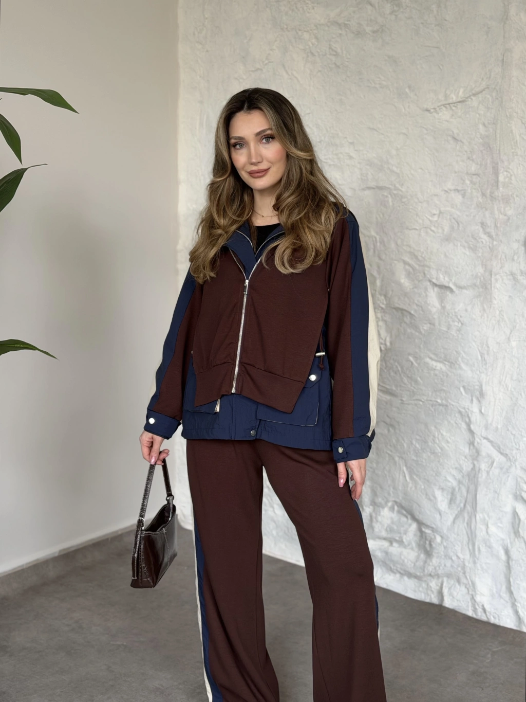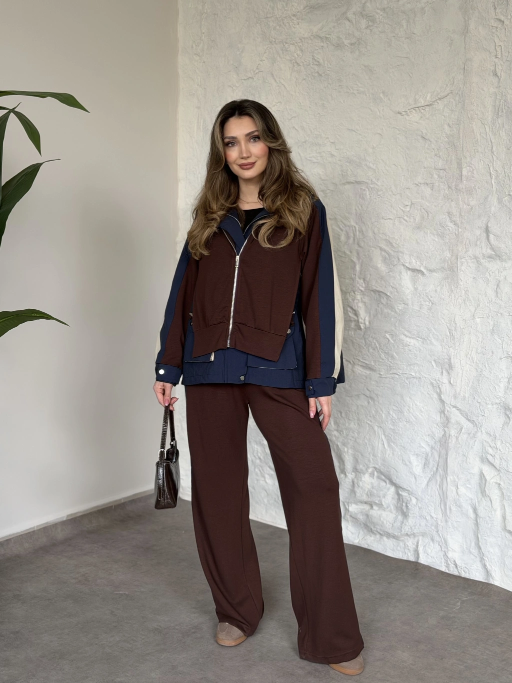 Asimetrik kesim scuba crep kumaş takım kahve