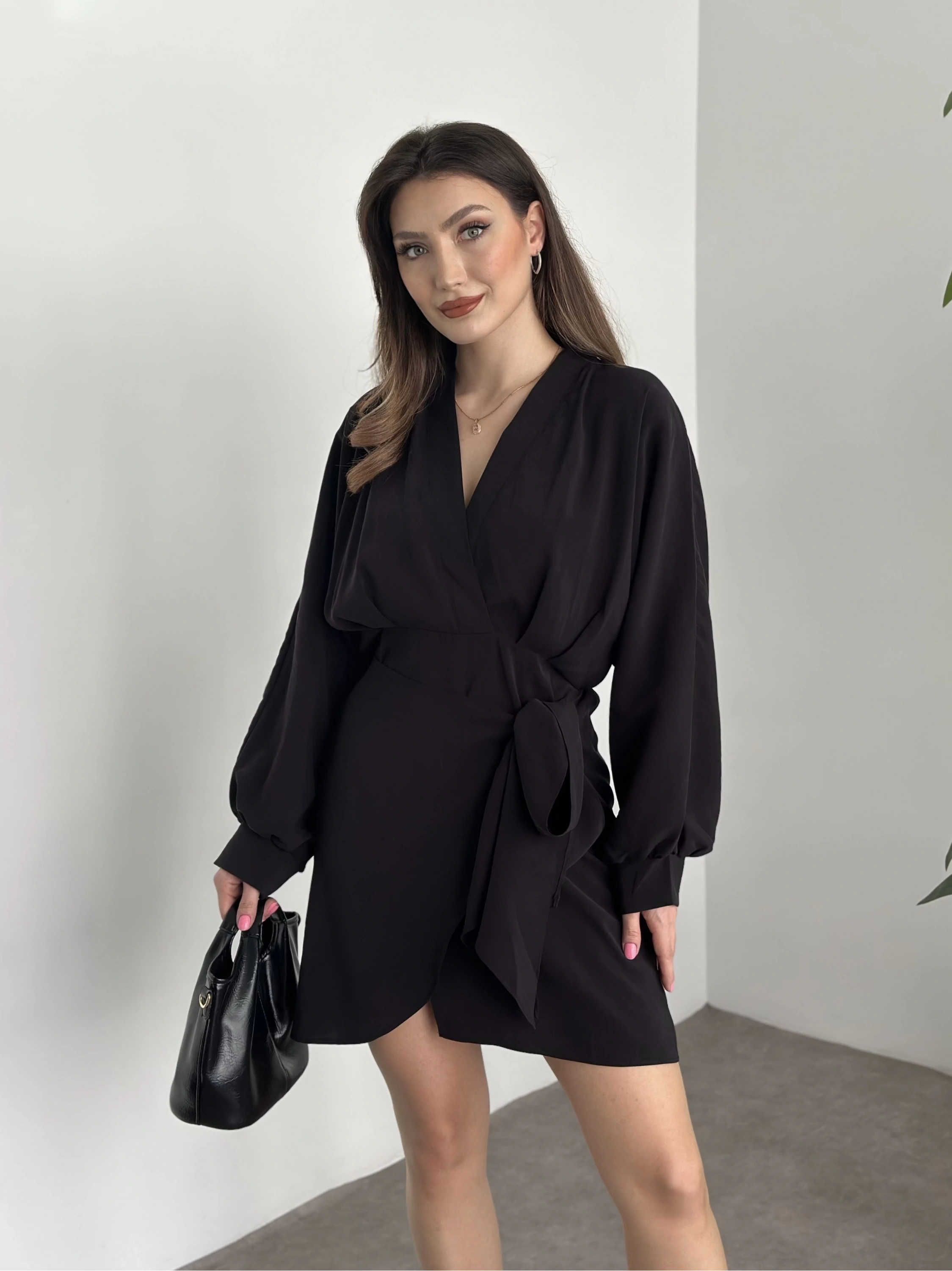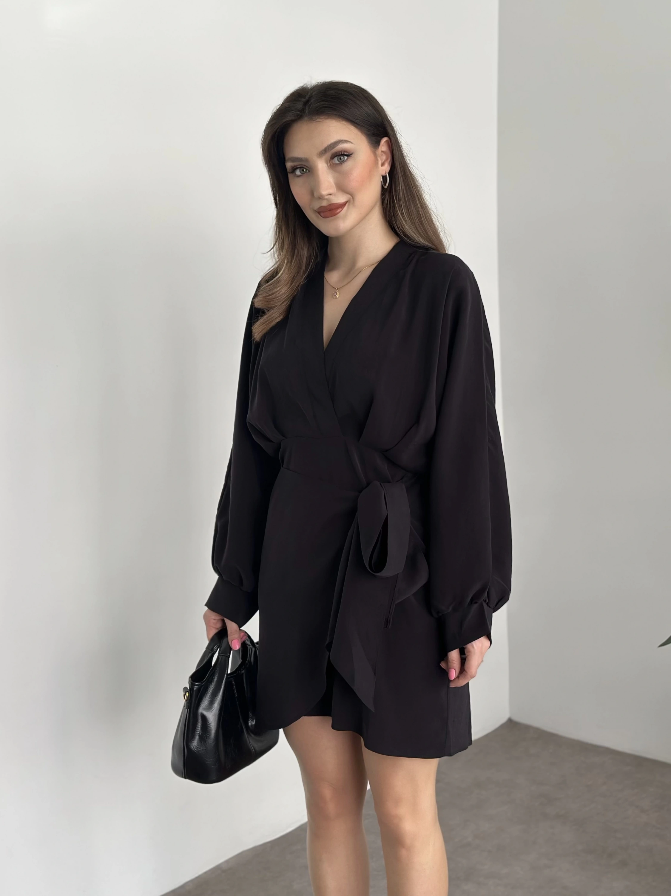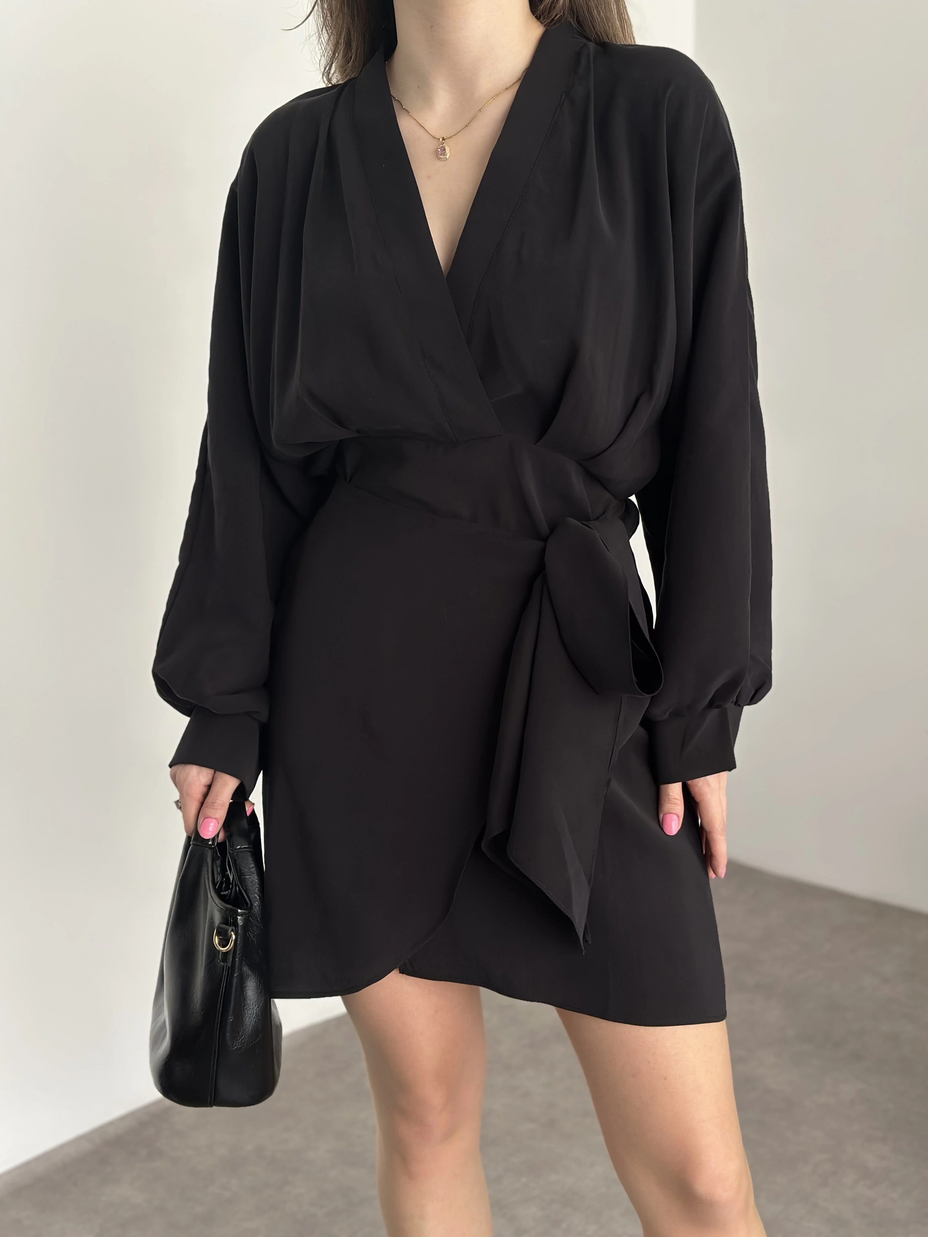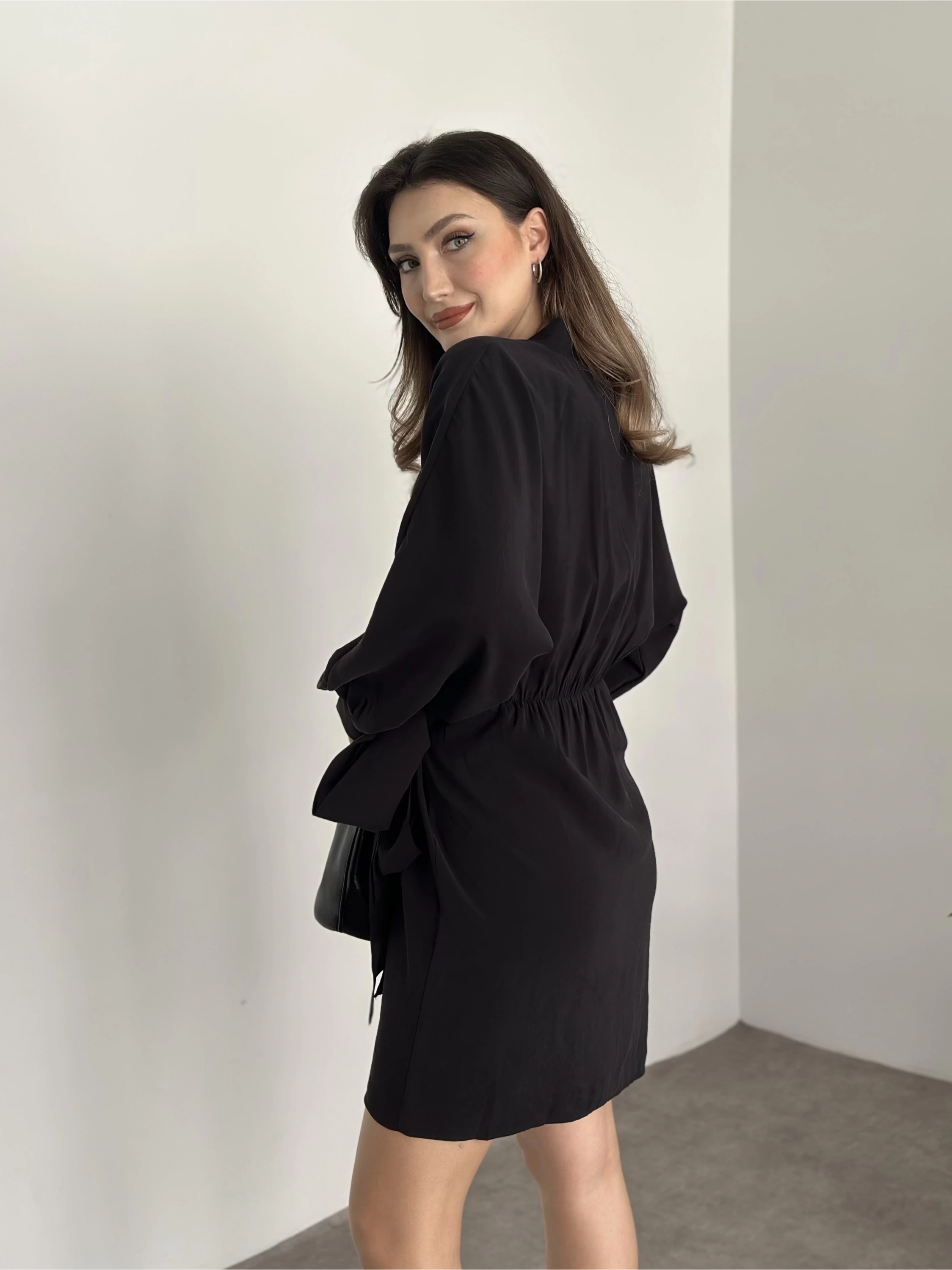 Premium kalite tensel kumaş balon kol bağlamalı elbise siyah