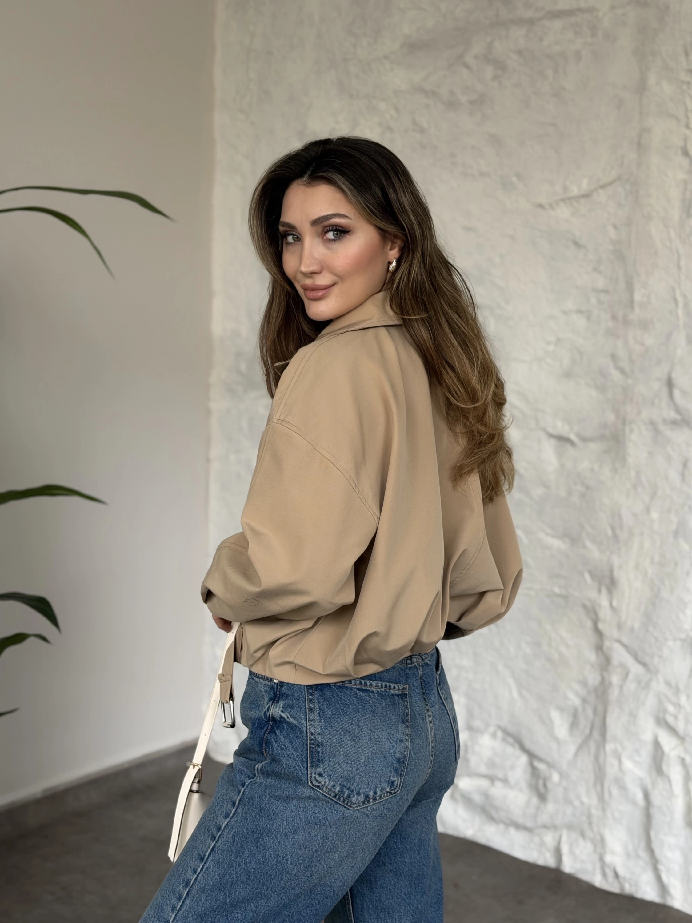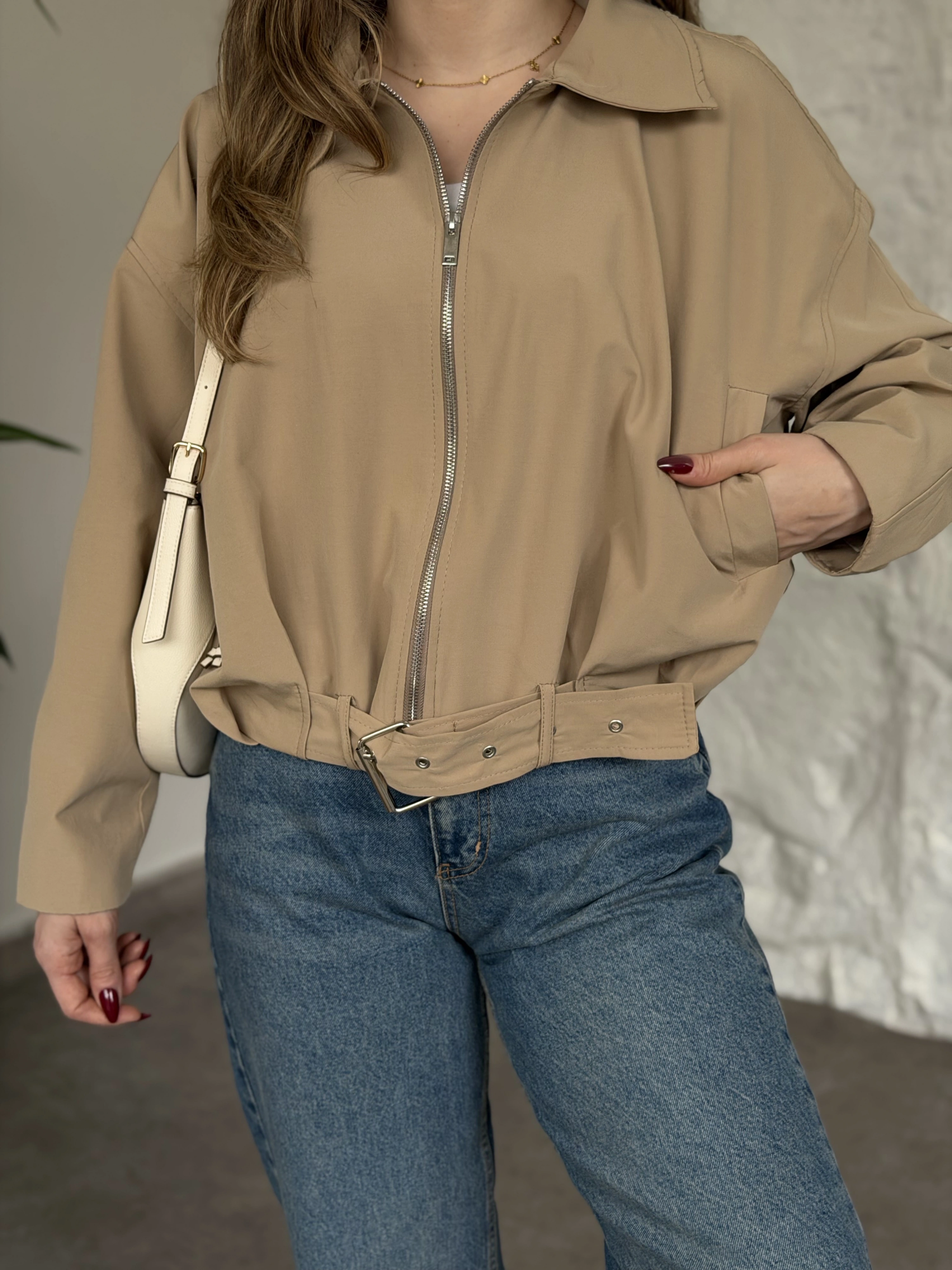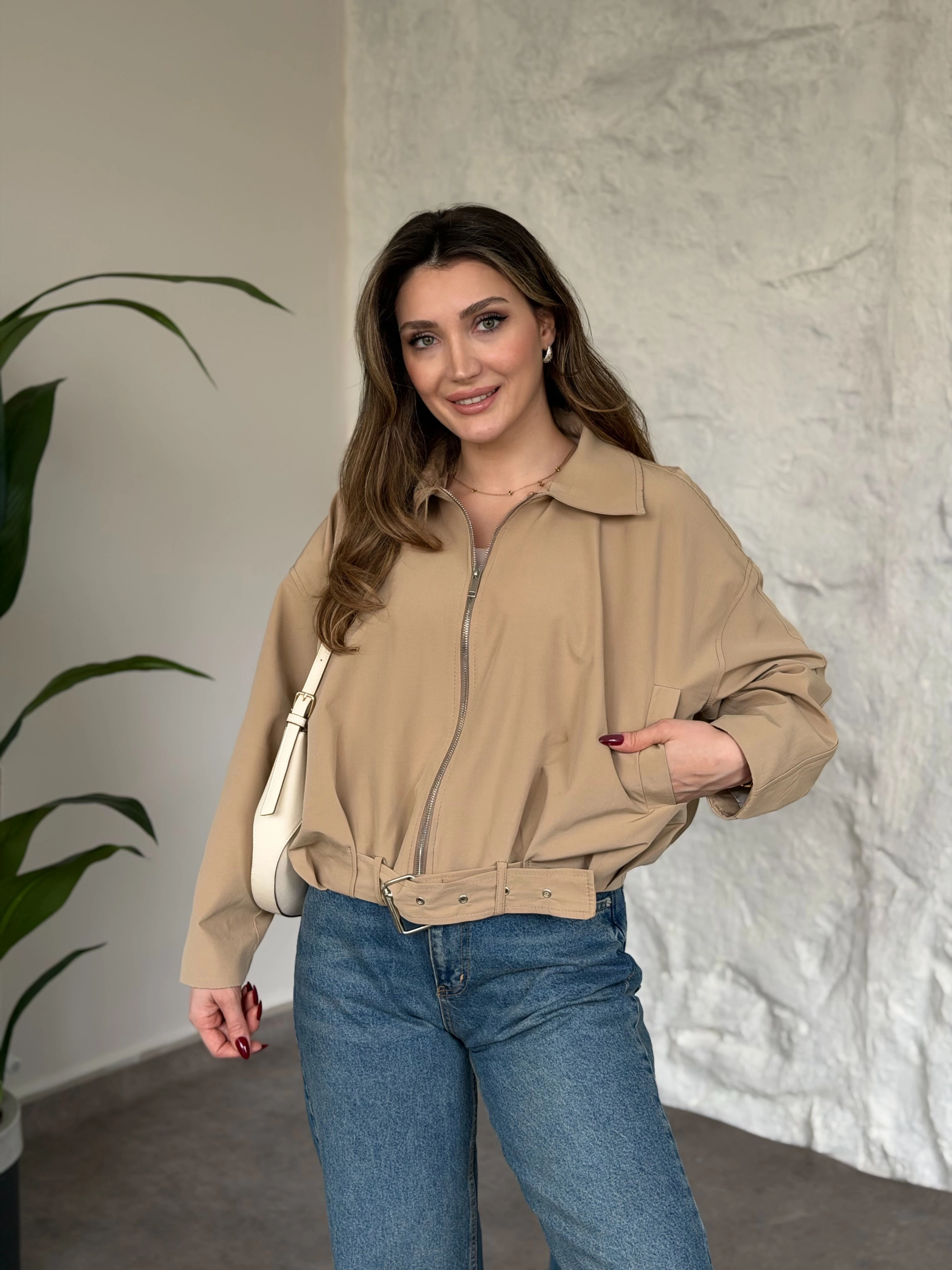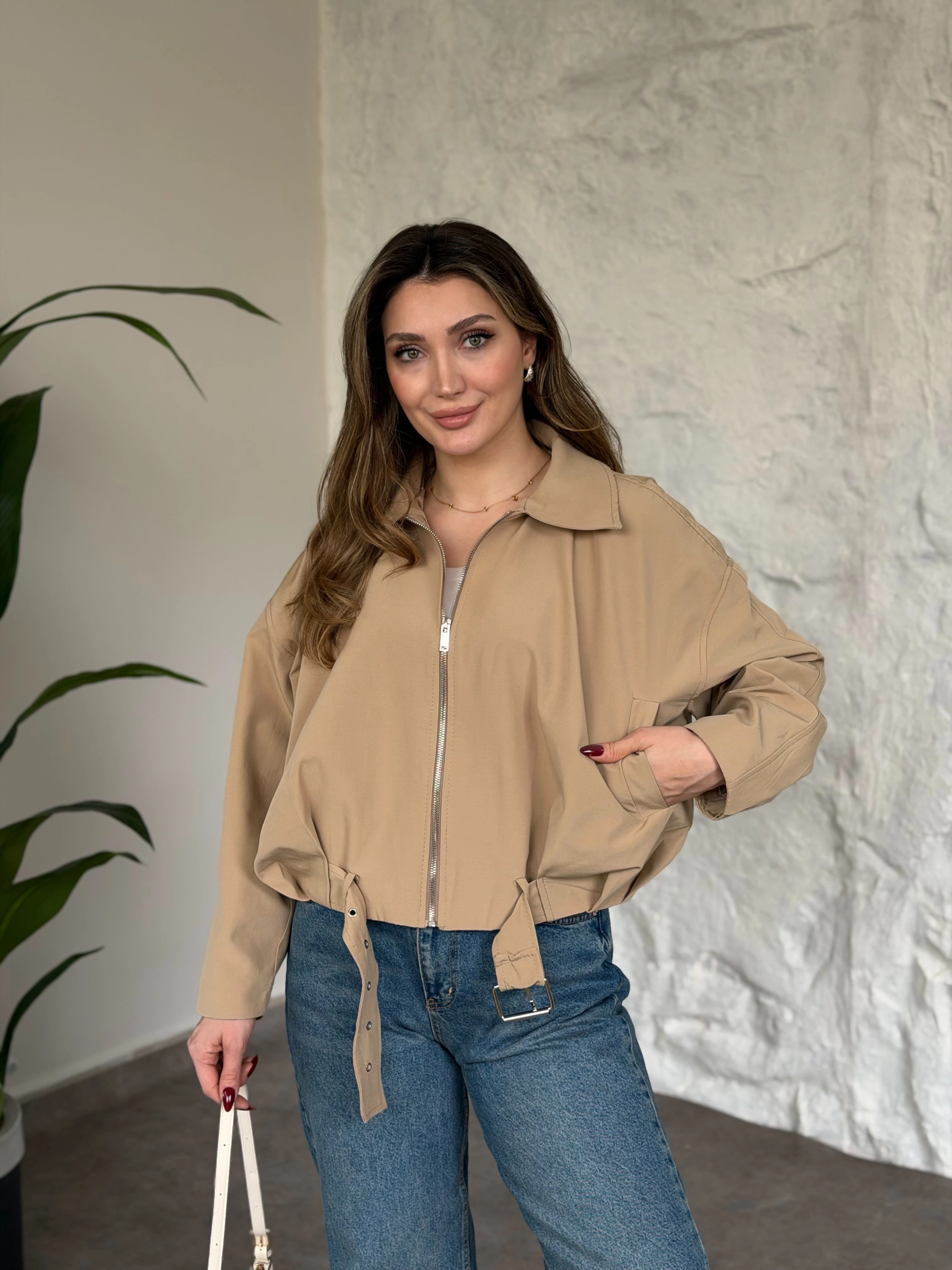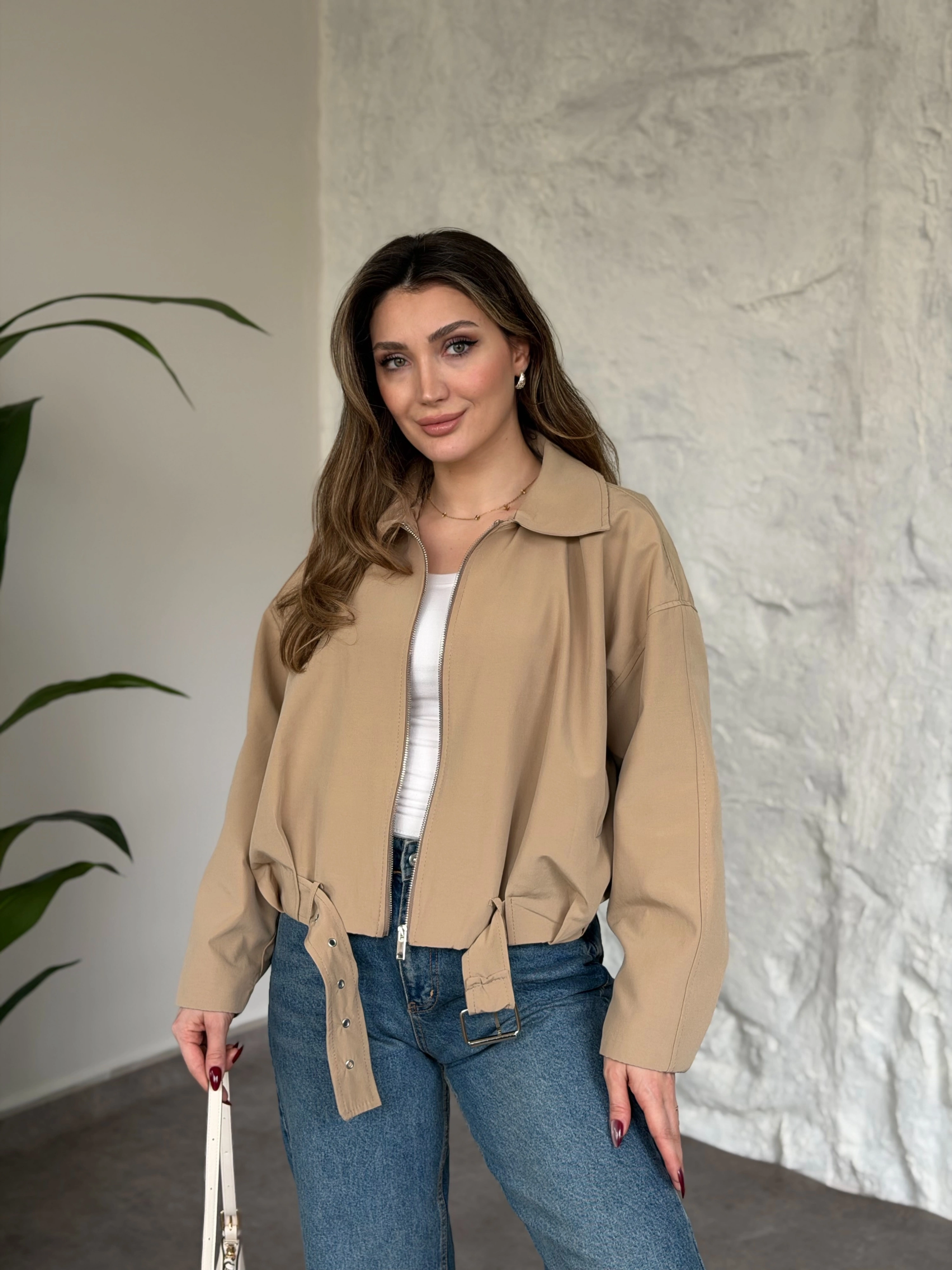 Torino kumaş beli lastikli fermuarlı ceket bej